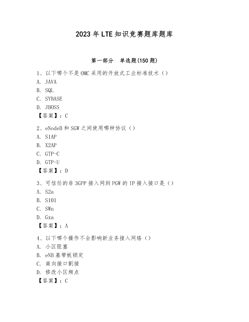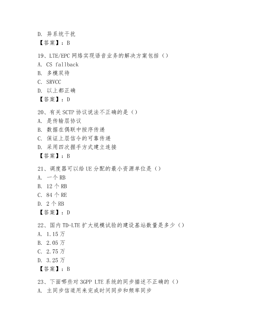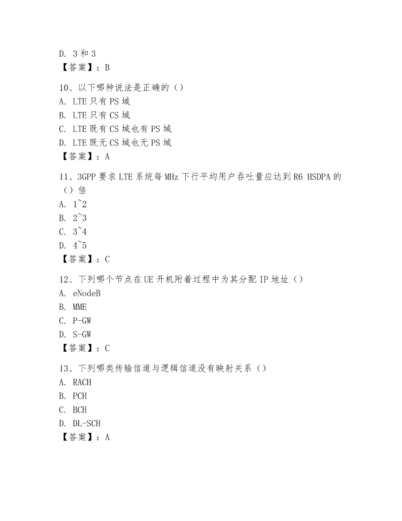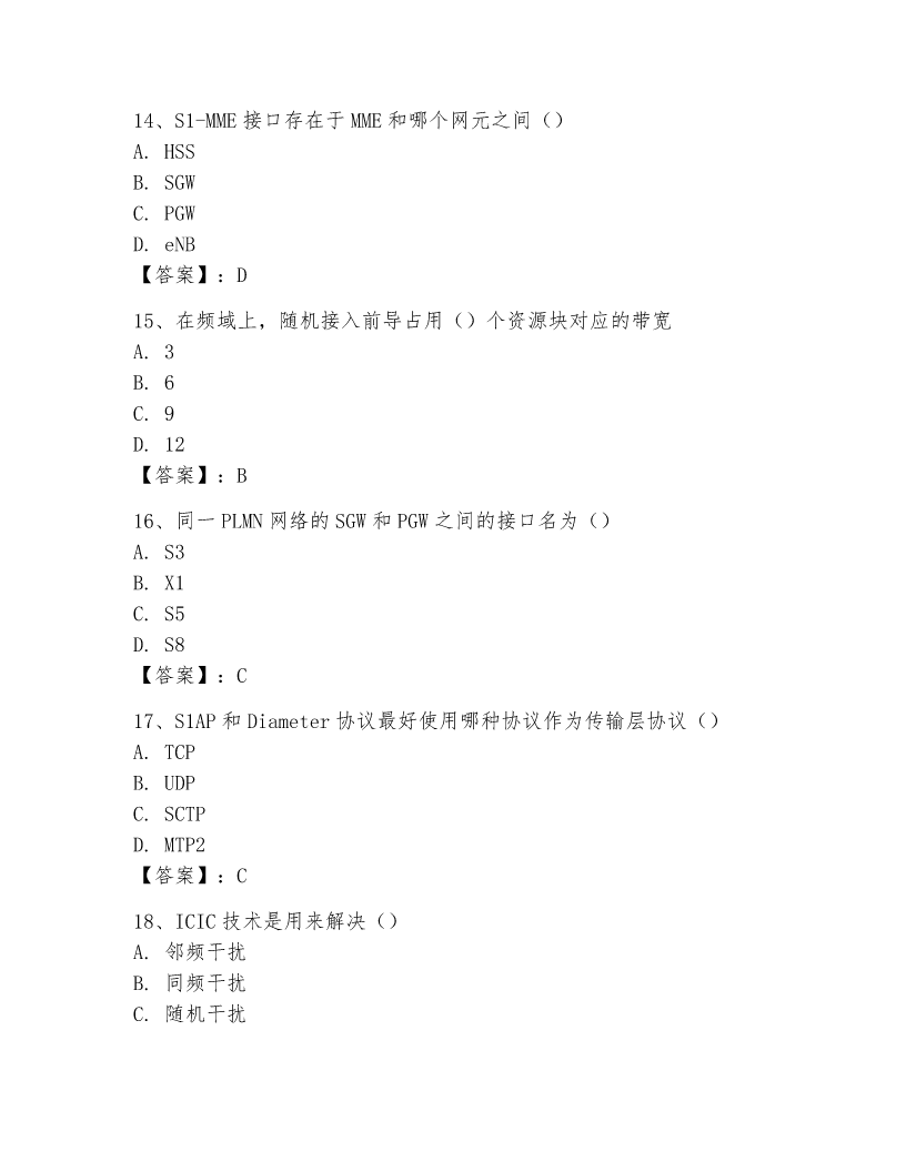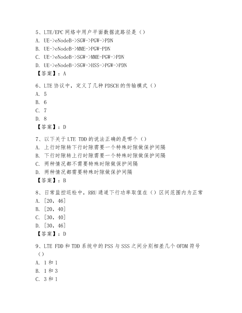 2023年LTE知识竞赛题库题库 第一部分单选题(150题) 1、以下哪个不是OMC采用的开放式工业标准技术() A.JAVA B.SQL C.SYBASE D.JBOSS 【答案】:C 2、eNodeB和SGW之间使用哪种协议() A.S1AP B.X2AP C.GTP-C D.GTP-U 【答案】:D 3、可信任的非3GPP接入网到PGW的IP接入接口是() A.S2a B.S101 C.SWn D.Gxa 【答案】:A 4、以下哪个操作不会影响新业务接入网络() A.小区阻塞 B.eNB基带板锁定 C.南向接口割接 D.修改小区频点 【答案】:C 5、LTE/EPC网络中用户平面数据流路径是() A.UE->eNodeB->SGW->PGW->PDN B.UE->eNodeB->MME->PGW-PDN C.UE->eNodeB->SGW->MME-PGW->PDN D.UE->eNodeB->SGW->HSS->PGW->PDN 【答案】:A 6、LTE协议中,定义了几种PDSCH的传输模式() A.5 B.6 C.7 D.8 【答案】:D 7、以下关于LTETDD的说法正确的是哪个() A.上行时隙转下行时隙需要一个特殊时隙做保护间隔 B.下行时隙转上行时隙需要一个特殊时隙做保护间隔 C.两种情况都不需要特殊时隙做保护间隔 D.两种情况都需要特殊时隙做保护间隔 【答案】:B 8、日常监控巡检中,RRU通道下行功率取值在()区间范围内为正常 A.[20,46] B.[20,40] C.[30,40] D.[30,46] 【答案】:D 9、LTEFDD和TDD系统中的PSS与SSS之间分别相差几个OFDM符号 () A.1和1 B.1和3 C.3和1 D.3和3 【答案】:B 10、以下哪种说法是正确的() A.LTE只有PS域 B.LTE只有CS域 C.LTE既有CS域也有PS域 D.LTE既无CS域也无PS域 【答案】:A 11、3GPP要求LTE系统每MHz下行平均用户吞吐量应达到R6HSDPA的 ()倍 A.1~2 B.2~3 C.3~4 D.4~5 【答案】:C 12、下列哪个节点在UE开机附着过程中为其分配IP地址() A.eNodeB B.MME C.P-GW D.S-GW 【答案】:C 13、下列哪类传输信道与逻辑信道没有映射关系() A.RACH B.PCH C.BCH D.DL-SCH 【答案】:A 14、S1-MME接口存在于MME和哪个网元之间() A.HSS B.SGW C.PGW D.eNB 【答案】:D 15、在频域上,随机接入前导占用()个资源块对应的带宽 A.3 B.6 C.9 D.12 【答案】:B 16、同一PLMN网络的SGW和PGW之间的接口名为() A.S3 B.X1 C.S5 D.S8 【答案】:C 17、S1AP和Diameter协议最好使用哪种协议作为传输层协议() A.TCP B.UDP C.SCTP D.MTP2 【答案】:C 18、ICIC技术是用来解决() A.邻频干扰 B.同频干扰 C.随机干扰 D.异系统干扰 【答案】:B 19、LTE/EPC网络实现语音业务的解决方案包括() A.CSfallback B.多模双待 C.SRVCC D.以上都正确 【答案】:D 20、有关SCTP协议说法不正确的是() A.是传输层协议 B.数据在偶联中按序传递 C.保证上层信令的可靠传递 D.采用四次握手方式建立连接 【答案】:B 21、调度器可以给UE分配的最小资源单位是() A.一个RB B.12个RB C.84个RE D.2个RB 【答案】:D 22、国内TD-LTE扩大规模试验的建设基站数量是多少() A.1.15万 B.2.05万 C.2.75万 D.3.25万 【答案】:B 23、下面哪些对3GPPLTE系统的同步描述不正确的() A.主同步信道用来完成时间同步和频率同步 B.辅同步信道用来完成帧同步和小区搜索 C.公共导频可以用来做精同步 D.3GPPLTE系统可以纠正任意大小的频率偏移 【答案】:D 24、下面哪种网元不会产生CDR话单() A.MME B.PGW C.SGW D.GGSN 【答案】:A 25、Nanocell与Smallcell的区别是() A.Nanocell用于广覆盖,SmallCell用于热点地区 B.Nanocell仅用于LTE C.融合WIFI的smallcell D.Nanocell与Smallcell无区别 【答案】:C 26、在LTE下,EPC主要由()和PDNGW,ServingGW,HSS组成 A.PDSN B.SGSN C.GGSN D.MME 【答案】:D