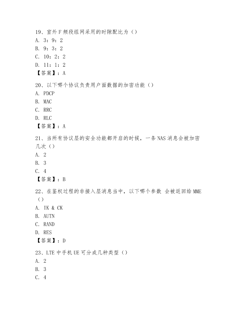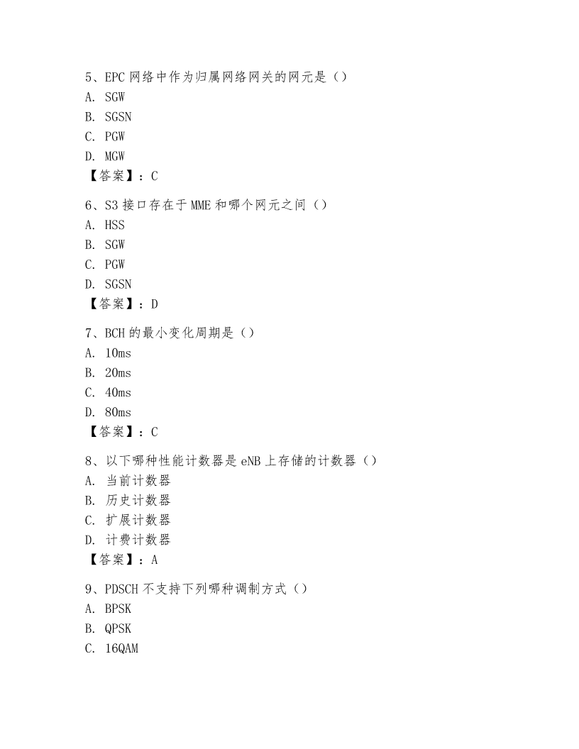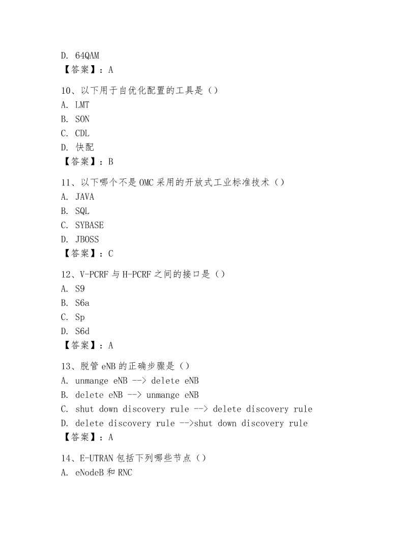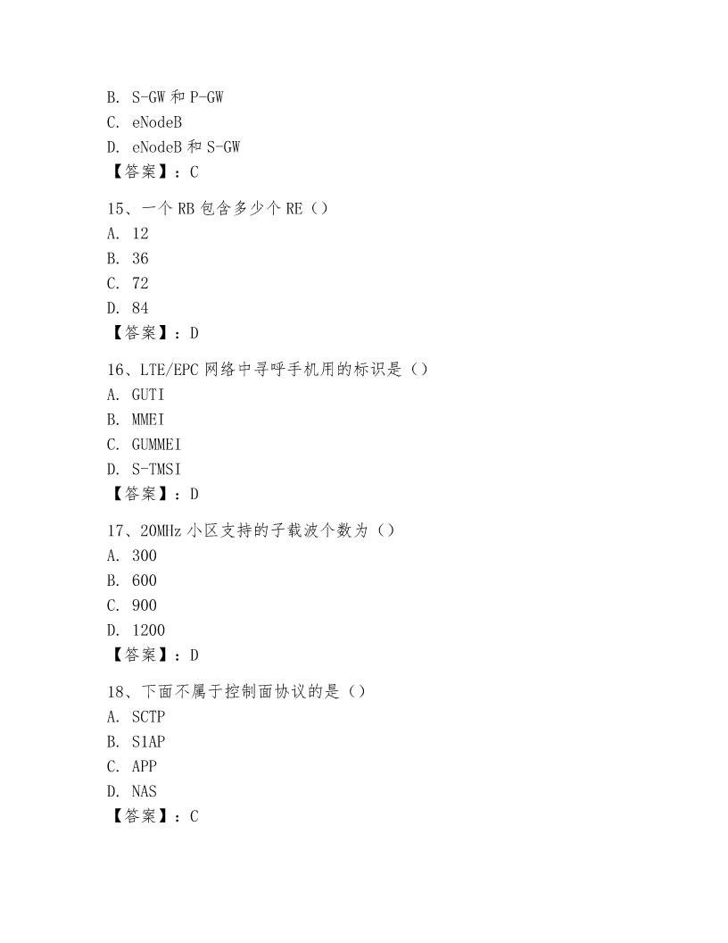 2023年LTE知识竞赛题库题库 第一部分单选题(150题) 1、在LTE系统协议中,RLC层对数据进行() A.压缩加密 B.分段 C.映射 D.调制 【答案】:B 2、LTE下,用户通过()方式进行认证 A.AKA B.EAP-SIM C.CHAP D.EAP-AKA 【答案】:D 3、国内TD-LTE规模技术试验开始于哪一年() A.2010 B.2011 C.2012 D.2013 【答案】:B 4、北美目前最大的LTE运营商是() A.AT&T B.Verizon C.Sprint D.Metro-PCS 【答案】:B 5、EPC网络中作为归属网络网关的网元是() A.SGW B.SGSN C.PGW D.MGW 【答案】:C 6、S3接口存在于MME和哪个网元之间() A.HSS B.SGW C.PGW D.SGSN 【答案】:D 7、BCH的最小变化周期是() A.10ms B.20ms C.40ms D.80ms 【答案】:C 8、以下哪种性能计数器是eNB上存储的计数器() A.当前计数器 B.历史计数器 C.扩展计数器 D.计费计数器 【答案】:A 9、PDSCH不支持下列哪种调制方式() A.BPSK B.QPSK C.16QAM D.64QAM 【答案】:A 10、以下用于自优化配置的工具是() A.LMT B.SON C.CDL D.快配 【答案】:B 11、以下哪个不是OMC采用的开放式工业标准技术() A.JAVA B.SQL C.SYBASE D.JBOSS 【答案】:C 12、V-PCRF与H-PCRF之间的接口是() A.S9 B.S6a C.Sp D.S6d 【答案】:A 13、脱管eNB的正确步骤是() A.unmangeeNB-->deleteeNB B.deleteeNB-->unmangeeNB C.shutdowndiscoveryrule-->deletediscoveryrule D.deletediscoveryrule-->shutdowndiscoveryrule 【答案】:A 14、E-UTRAN包括下列哪些节点() A.eNodeB和RNC B.S-GW和P-GW C.eNodeB D.eNodeB和S-GW 【答案】:C 15、一个RB包含多少个RE() A.12 B.36 C.72 D.84 【答案】:D 16、LTE/EPC网络中寻呼手机用的标识是() A.GUTI B.MMEI C.GUMMEI D.S-TMSI 【答案】:D 17、20MHz小区支持的子载波个数为() A.300 B.600 C.900 D.1200 【答案】:D 18、下面不属于控制面协议的是() A.SCTP B.S1AP C.APP D.NAS 【答案】:C 19、室外F频段组网采用的时隙配比为() A.3:9:2 B.9:3:2 C.10:2:2 D.11:1:2 【答案】:A 20、以下哪个协议负责用户面数据的加密功能() A.PDCP B.MAC C.RRC D.RLC 【答案】:A 21、当所有协议层的安全功能都开启的时候,一条NAS消息会被加密 几次() A.2 B.3 C.4 【答案】:B 22、在鉴权过程的非接入层消息当中,以下哪个参数会被返回给MME () A.IK&CK B.AUTN C.RAND D.RES 【答案】:D 23、LTE中手机UE可分成几种类型() A.2 B.3 C.4 D.5 【答案】:D 24、对于非3GPP(Non-3GPP)的接入网,负责鉴权和授权的网元是() A.DNS B.AAA C.SGSN-MME D.SGW 【答案】:B 25、以下操作中可能导致小区退服告警的是() A.修改小区切换算法参数 B.批量修改PCI C.打开小区负荷控制算法开关 D.将该小区添加为其他小区的邻小区 【答案】:B 26、什么情况下手机用户可能被分配一个新的GUTI() A.附着 B.跨MMETAupdate C.MME内的TAupdate D.以上都对 【答案】:D 27、下行SPS调度可以最多配置()进程 A.1 B.2 C.4 D.8 【答案】:D 28、LTE中无线接入网的名称是什么() A.EPC B.EPS C.UTRAN D.EUTRAN 【答案】:D 29、以下哪个功能不属于MME的功能() A.NAS信令处理 B.TAList管理 C.合法监听 D.漫游控制 【答案】:C 30、TDD上下行子帧配置为模式5时,下行最多有多少个HARQ进程 () A.7 B.9 C.12 D.15 【答案】:D 31、OMC客户端不能运行在以下哪个操作系统上() A.Windows9