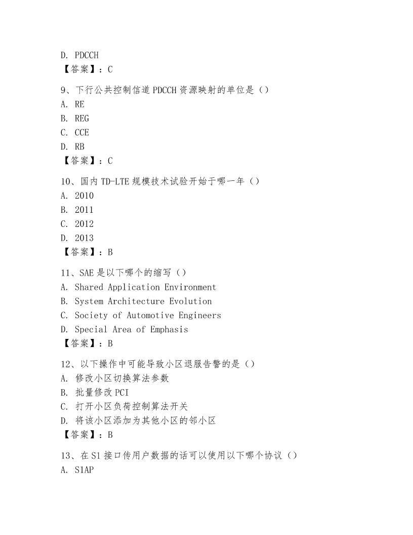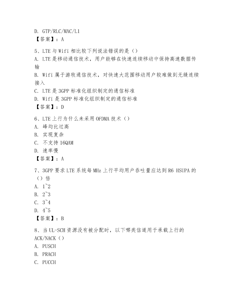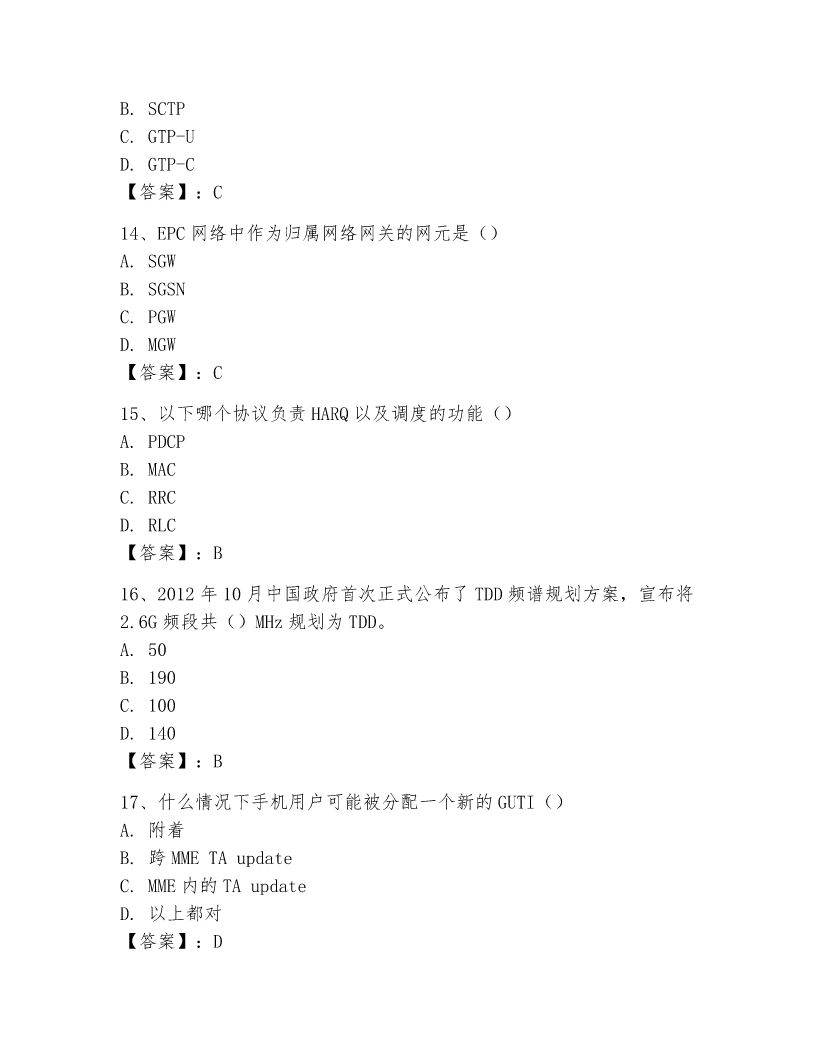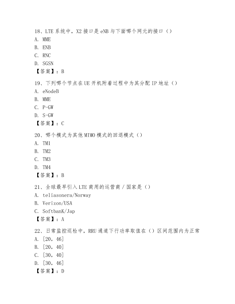 2023年LTE知识竞赛题库题库 第一部分单选题(150题) 1、TD-LTECPE拥有哪些无线路由器不具备的功能() A.可实现Internet连接共享 B.支持多种设备 C.可随时移动 D.覆盖范围可达上百米 【答案】:C 2、在E-UTRAN系统中,每个小区在20MHz带宽下期望最少支持的用户 数是() A.250 B.300 C.1200 D.400 【答案】:D 3、2013年启动的中国移动TD-LTE网络建设项目将覆盖全国多少个省 市自治区() A.31个 B.30个 C.29个 D.28个 【答案】:A 4、SGW和PGWS5/S8协议栈自上而下正确的顺序是() A.GTP/UDP/IP/L2/L1 B.GTP/TCP/IP/L2/L1 C.GTP/SCTP/IP/L2/L1 D.GTP/RLC/MAC/L1 【答案】:A 5、LTE与Wifi相比较下列说法错误的是() A.LTE是移动通信技术,用户能够在快速连续移动中保持高速数据传 输 B.Wifi属于游牧通信技术,对快速大范围移动用户较难做到无缝连续 接入 C.LTE是3GPP标准化组织制定的通信标准 D.Wifi是3GPP标准化组织制定的通信标准 【答案】:D 6、LTE上行为什么未采用OFDMA技术() A.峰均比过高 B.实现复杂 C.不支持16QAM D.速率慢 【答案】:A 7、3GPP要求LTE系统每MHz上行平均用户吞吐量应达到R6HSUPA的 ()倍 A.1~2 B.2~3 C.3~4 D.4~5 【答案】:B 8、当UL-SCH资源没有被分配时,以下哪类信道用于承载上行的 ACK/NACK() A.PUSCH B.PRACH C.PUCCH D.PDCCH 【答案】:C 9、下行公共控制信道PDCCH资源映射的单位是() A.RE B.REG C.CCE D.RB 【答案】:C 10、国内TD-LTE规模技术试验开始于哪一年() A.2010 B.2011 C.2012 D.2013 【答案】:B 11、SAE是以下哪个的缩写() A.SharedApplicationEnvironment B.SystemArchitectureEvolution C.SocietyofAutomotiveEngineers D.SpecialAreaofEmphasis 【答案】:B 12、以下操作中可能导致小区退服告警的是() A.修改小区切换算法参数 B.批量修改PCI C.打开小区负荷控制算法开关 D.将该小区添加为其他小区的邻小区 【答案】:B 13、在S1接口传用户数据的话可以使用以下哪个协议() A.S1AP B.SCTP C.GTP-U D.GTP-C 【答案】:C 14、EPC网络中作为归属网络网关的网元是() A.SGW B.SGSN C.PGW D.MGW 【答案】:C 15、以下哪个协议负责HARQ以及调度的功能() A.PDCP B.MAC C.RRC D.RLC 【答案】:B 16、2012年10月中国政府首次正式公布了TDD频谱规划方案,宣布将 2.6G频段共()MHz规划为TDD。 A.50 B.190 C.100 D.140 【答案】:B 17、什么情况下手机用户可能被分配一个新的GUTI() A.附着 B.跨MMETAupdate C.MME内的TAupdate D.以上都对 【答案】:D 18、LTE系统中,X2接口是eNB与下面哪个网元的接口() A.MME B.ENB C.RNC D.SGSN 【答案】:B 19、下列哪个节点在UE开机附着过程中为其分配IP地址() A.eNodeB B.MME C.P-GW D.S-GW 【答案】:C 20、哪个模式为其他MIMO模式的回退模式() A.TM1 B.TM2 C.TM3 D.TM4 【答案】:B 21、全球最早引入LTE商用的运营商/国家是() A.teliasonera/Norway B.Verizon/USA C.SoftbanK/Jap 【答案】:A 22、日常监控巡检中,RRU通道下行功率取值在()区间范围内为正常 A.[20,46] B.[20,40] C.[30,40] D.[30,46] 【答案】:D 23、下列协议中,哪个不归LTE的基站处理() A.RRC B.PDCP C.RLC D.RANAP 【答案】:D 24、以下哪个来自于核心网参数不是用来描述EPS承载的QoS的() A.QCI B.ARP C.BLER 【答案】:C 25、LTE载波聚合中的跨载波调度中的CIF具有几个比特() A.1 B.2 C.3 D.4 【答案】:C 26、LTE/EPC网络采用的鉴权参数是() A.