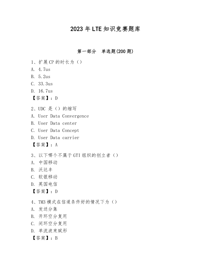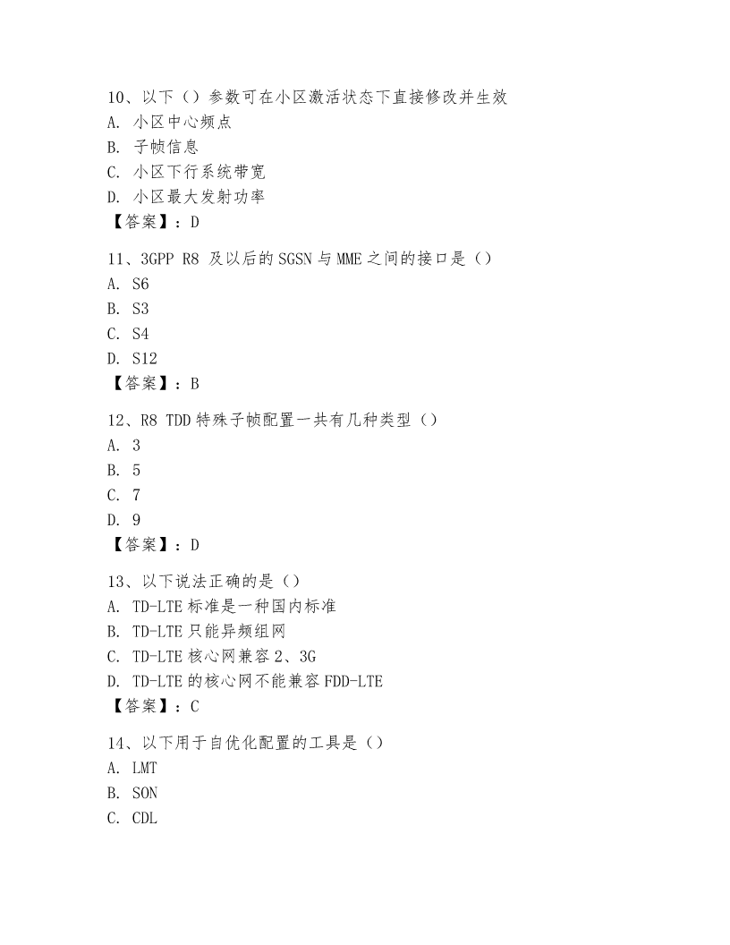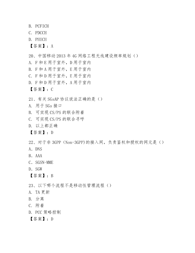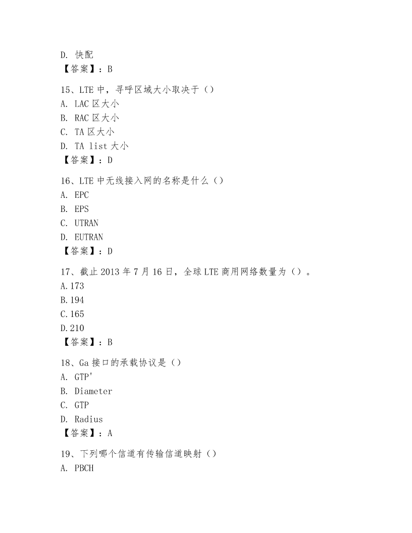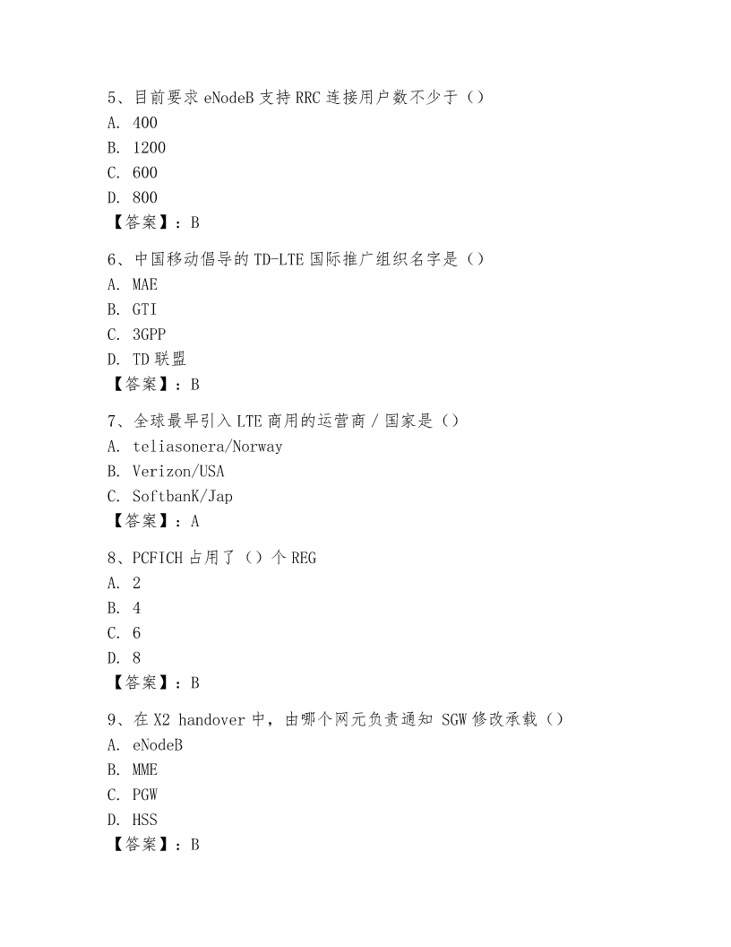 2023年LTE知识竞赛题库 第一部分单选题(200题) 1、扩展CP的时长为() A.4.7us B.5.2us C.33.3us D.16.7us 【答案】:D 2、UDC是()的缩写 A.UserDataConvergence B.UserDatacenter C.UserDataConcept D.UserDatacarrier 【答案】:A 3、以下哪个不属于GTI组织的创立者() A.中国移动 B.沃达丰 C.软银移动 D.英国电信 【答案】:D 4、TM3模式在信道条件好的情况下为() A.发送分集 B.开环空分复用 C.闭环空分复用 D.单流波束赋形 【答案】:B 5、目前要求eNodeB支持RRC连接用户数不少于() A.400 B.1200 C.600 D.800 【答案】:B 6、中国移动倡导的TD-LTE国际推广组织名字是() A.MAE B.GTI C.3GPP D.TD联盟 【答案】:B 7、全球最早引入LTE商用的运营商/国家是() A.teliasonera/Norway B.Verizon/USA C.SoftbanK/Jap 【答案】:A 8、PCFICH占用了()个REG A.2 B.4 C.6 D.8 【答案】:B 9、在X2handover中,由哪个网元负责通知SGW修改承载() A.eNodeB B.MME C.PGW D.HSS 【答案】:B 10、以下()参数可在小区激活状态下直接修改并生效 A.小区中心频点 B.子帧信息 C.小区下行系统带宽 D.小区最大发射功率 【答案】:D 11、3GPPR8及以后的SGSN与MME之间的接口是() A.S6 B.S3 C.S4 D.S12 【答案】:B 12、R8TDD特殊子帧配置一共有几种类型() A.3 B.5 C.7 D.9 【答案】:D 13、以下说法正确的是() A.TD-LTE标准是一种国内标准 B.TD-LTE只能异频组网 C.TD-LTE核心网兼容2、3G D.TD-LTE的核心网不能兼容FDD-LTE 【答案】:C 14、以下用于自优化配置的工具是() A.LMT B.SON C.CDL D.快配 【答案】:B 15、LTE中,寻呼区域大小取决于() A.LAC区大小 B.RAC区大小 C.TA区大小 D.TAlist大小 【答案】:D 16、LTE中无线接入网的名称是什么() A.EPC B.EPS C.UTRAN D.EUTRAN 【答案】:D 17、截止2013年7月16日,全球LTE商用网络数量为()。 A.173 B.194 C.165 D.210 【答案】:B 18、Ga接口的承载协议是() A.GTP' B.Diameter C.GTP D.Radius 【答案】:A 19、下列哪个信道有传输信道映射() A.PBCH B.PCFICH C.PDCCH D.PHICH 【答案】:A 20、中国移动2013年4G网络工程无线建设频率规划() A.F和E用于室外,D用于室内 B.F和A用于室外,E用于室内 C.F和D用于室外,E用于室内 D.F和D用于室外,A用于室内 【答案】:C 21、有关SGsAP协议说法正确的是() A.用于SGs接口 B.可实现CS/PS的联合附着 C.可实现CS/PS的联合寻呼 D.以上都正确 【答案】:D 22、对于非3GPP(Non-3GPP)的接入网,负责鉴权和授权的网元是() A.DNS B.AAA C.SGSN-MME D.SGW 【答案】:B 23、以下哪个流程不是移动性管理流程() A.TA更新 B.分离 C.附着 D.PCC策略控制 【答案】:D 24、以前在GGSN-MPG中板卡被称为C-PIC,而在EPG-S中它们被称为 () A.NMB B.CPB C.PPB D.SSC 【答案】:B 25、以下哪个3GPP版本第一次发布LTE标准() A.Rel5 B.Rel6 C.Rel7 D.Rel8 【答案】:D 26、波束赋形(TM7)使用的参考信号为() A.port0 B.port1 C.port5 D.port7 【答案】:C 27、preamble格式中,()可以支持100km的组网 A.format0 B.format1 C.format2 D.format3 【答案】:D 28、在LTE系统协议中,RLC层对数据进行() A.压缩加密 B.分段 C.映射 D.调制 【答案】:B 29、LTE系统中的PHICH承载的信息是() A.针对PUCCH的反馈信息 B.针对PUSCH的反馈信息 C.针对PDSCH的反馈信息 D.针对PDCCH的反馈信息 【答案】:B 30、TD-LTEBBU和RR