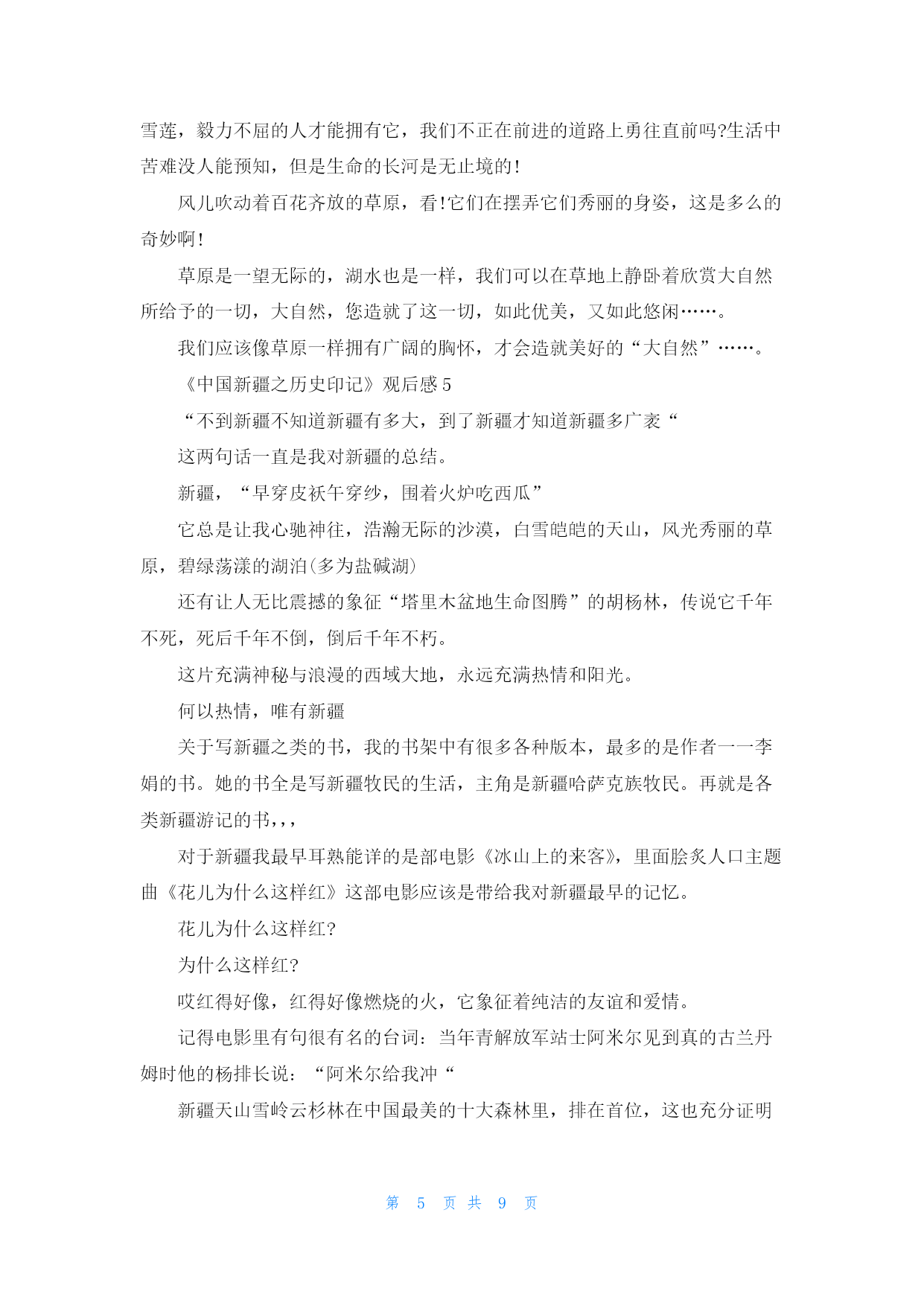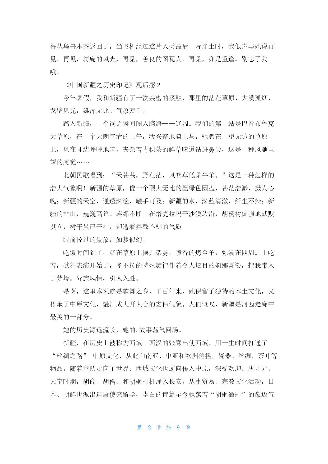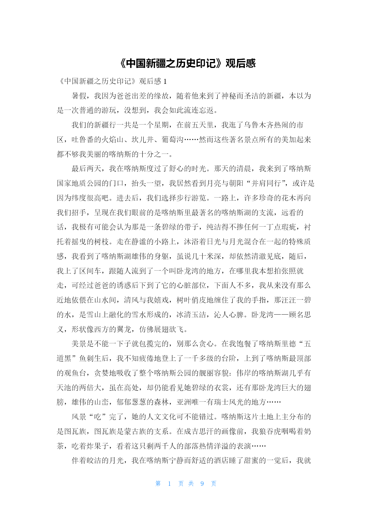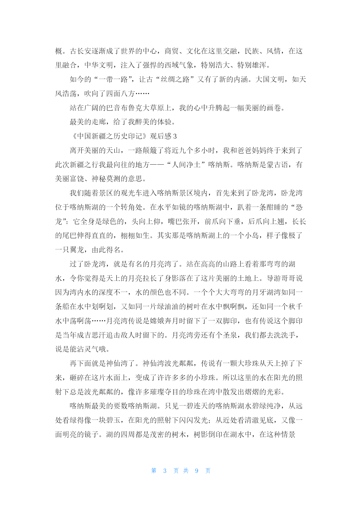 第页共NUMPAGES9页 《中国新疆之历史印记》观后感 《中国新疆之历史印记》观后感1暑假,我因为爸爸出差的缘故,随着他来到了神秘而圣洁的新疆,本以为是一次普通的游玩,没想到,我会如此流连忘返。我们的新疆行一共是一个星期,在前五天里,我逛了乌鲁木齐热闹的市区,吐鲁番的火焰山、坎儿井、葡萄沟……然而这些著名景点所有的美加起来都不够我美丽的喀纳斯的十分之一。最后两天,我在喀纳斯度过了舒心的时光。那天的清晨,我来到了喀纳斯国家地质公园的门口,抬头一望,我居然看到月亮与朝阳“并肩同行”,或许是因为纬度很高吧。进去后,我们选择步行游览。一路上,许多珍奇的花木再向我们招手,呈现在我们眼前的是喀纳斯里最著名的喀纳斯湖的支流,远看的话,我极有可能会认为那是一条碧绿的带子,纯洁得不掺任何一丁点瑕疵,衬托着摇曳的树枝。走在静谧的小路上,沐浴着日光与月光混合在一起的特殊质感,我看到了喀纳斯湖雄伟的身躯,虽说几十米深,却依然清澈见底,随后,我上了区间车,跟随人流到了一个叫卧龙湾的地方,在哪里我本想拍张照就走,可经过爸爸的诱惑后下到了它的心脏部位,下面人不多,我从来没有那么近地依偎在山水间,清风与我嬉戏,树叶俏皮地缠住了我的手指,那汪汪一碧的水,是雪山上融化的雪水形成的,冰清玉洁,沁人心脾。卧龙湾——顾名思义,形状像西方的翼龙,仿佛展翅欲飞。美景是不能一下子就包揽完的,别那么贪心。在我饱餐了喀纳斯里德“五道黑”鱼刺生后,我不知疲倦地登上了一千多级的台阶,上到了喀纳斯最顶部的观鱼台,贪婪地吸收了整个喀纳斯公园的靓丽容貌:伟岸的喀纳斯湖几乎有天池的两倍大,虽在高处,却仍能看见她碧绿的衣裳,还有那卧龙湾巨大的翅膀,雄伟的山峦,郁郁葱葱的森林,亚洲唯一有瑞士风光的地方……风景“吃”完了,她的人文文化可不能错过。喀纳斯这片土地上主分布的是图瓦族,图瓦族是蒙古族的支系。在成吉思汗的画像前,我狼吞虎咽喝着奶茶,吃着炸果子,看着这只剩两千人的部落热情洋溢的表演……伴着皎洁的月光,我在喀纳斯宁静而舒适的酒店睡了甜蜜的一觉后,我就得从乌鲁木齐返回了。当飞机经过这片人类最后一片净土时,我低声与她说再见。再见,旖旎的风光,再见,善良的图瓦人。再见,亦是重逢。别忘了我哦。《中国新疆之历史印记》观后感2今年暑假,我和新疆有了一次亲密的接触,那里的茫茫草原、大漠孤烟、戈壁风光,雄浑无比、气象万千。踏入新疆,一个词语瞬间闯入脑海——辽阔。我们的第一站是巴音布鲁克大草原,在一个天朗气清的上午,我兴奋地骑上马,驰骋在一望无边的草原上,风在耳边呼呼地响,夹杂着青稞茶的鲜草味道钻进鼻尖,这是一种风驰电掣的感觉……北朝民歌唱到:“天苍苍,野茫茫,风吹草低见牛羊。”这是一种怎样的浩大气象啊!新疆的草原,像一个硕大无比的墨绿色圆盘,苍茫浩渺,摄人心魄;新疆的天空,通透深邃、触手可及;新疆的水,深蓝清澈、纤尘不染;新疆的雪山,巍巍高耸、连绵不断。在塔克拉玛干沙漠边沿,胡杨树倔强地默默挺立,树干虽已干枯,却透着桀骜不驯的气质。眼前掠过的景象,如梦似幻。吃饭时间到了,就在草原上摆开架势,喷香的烤全羊,弥漫在四周。正吃着,歌舞表演开始了,冬不拉的特殊旋律伴着令人炫目的婀娜舞姿,把我带入了梦境。异族风情,引人入胜。是啊,这里本来就是歌舞之乡,千百年来,她保留了独特的本土文化,又传承了中原文化,融汇成大开大合的宏伟气象。人们慨叹,新疆是河西走廊中最美的一部分。她的历史源远流长,她的.故事荡气回肠。新疆,在历史上被称为西域。西汉的张骞出使西域,用一生时间打通了“丝绸之路”。中原文化,从此向南亚、中亚和欧洲传播,瓷器、丝绸、茶叶等物品,随着商队走向了世界;西域文化也逆向传入中原,深受欢迎。唐开元、天宝时期,胡商、胡僧、和胡姬相机涌入长安,从事贸易、宗教文化活动,日本、朝鲜也派出遣唐使来留学,李白的诗篇至今飘荡着“胡姬酒肆”的豪迈气概。古长安逐渐成了世界的中心,商贸、文化在这里交融,民族、风情,在这里融合,中华文明,注入了强悍的西域气象,特别浩大、特别雄浑。如今的“一带一路”,让古“丝绸之路”又有了新的内涵。大国文明,如天风浩荡,吹向了四面八方……站在广阔的巴音布鲁克大草原上,我的心中升腾起一幅美丽的画卷。最美的走廊,给了我醉美的体验。《中国新疆之历史印记》观后感3离开美丽的天山,一路颠簸了将近九个多小时,我和爸爸妈妈终于来到了此次新疆之行我最向往的地方——“人间净土”喀纳斯。喀纳斯是蒙古语,有美丽富饶、神秘莫测的意思。我们随着景区的观光车进入喀纳斯景区境内,首先来到了卧龙湾,卧龙湾位于喀纳斯湖的一个转角处。在水平如镜的喀纳斯湖中,趴着一条酣睡的“恐龙”:它全身是绿色的,头向上仰,嘴巴张开,前爪向下垂,后爪向上翘,长长的尾巴伸得直直的,栩栩如生。其实那是喀纳斯湖上的一个小岛,样子像极了一只