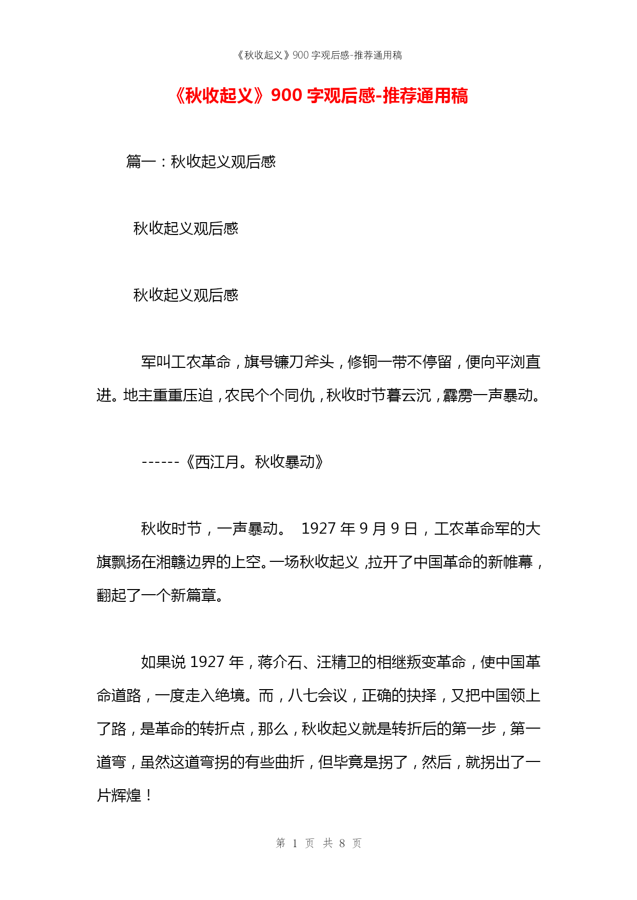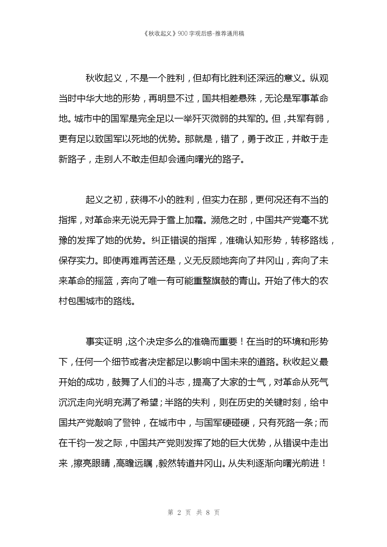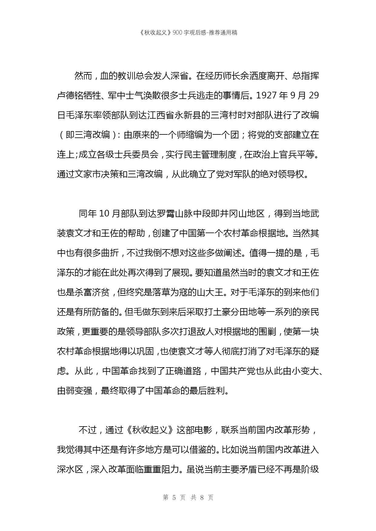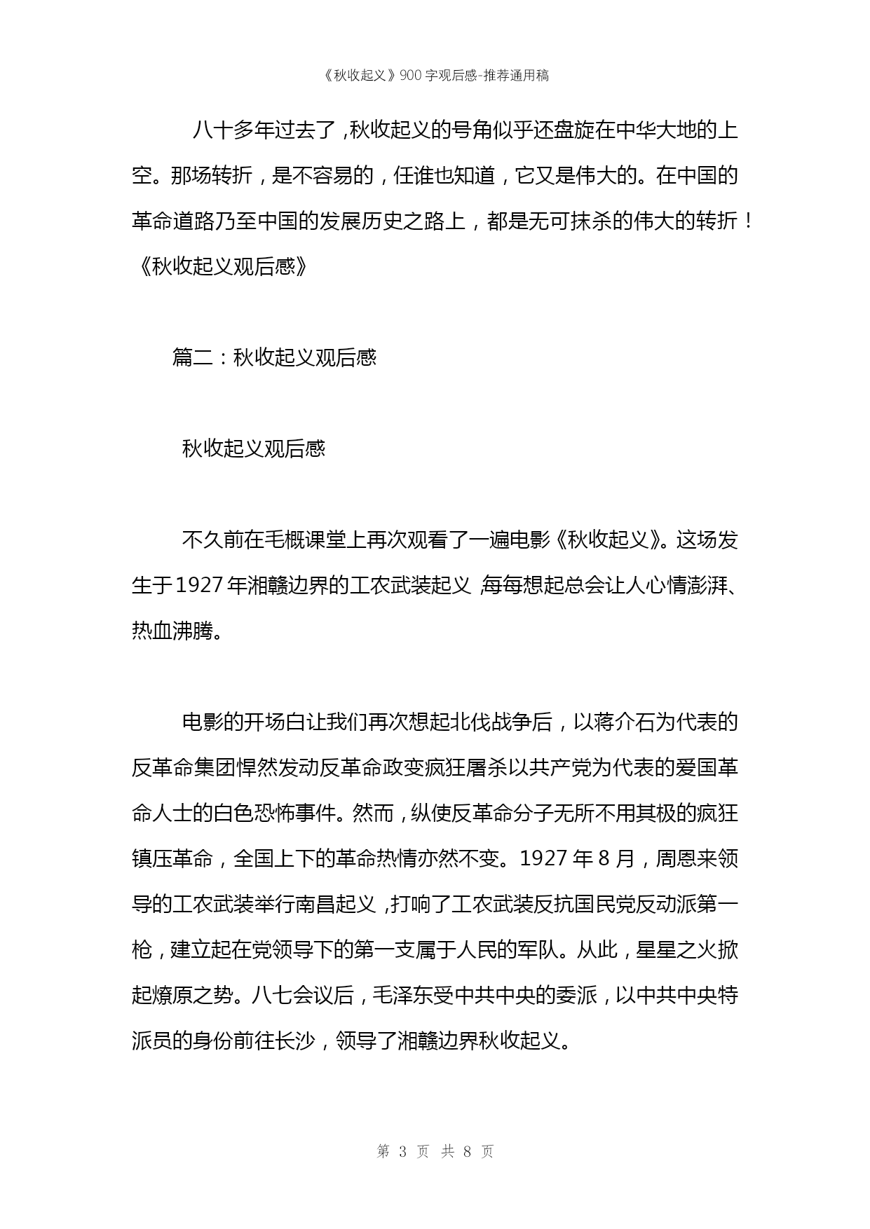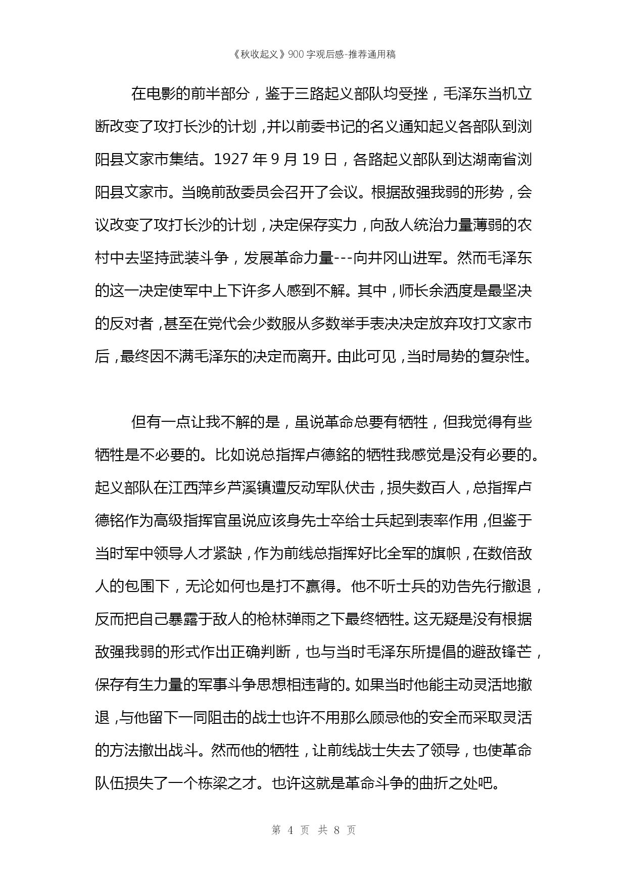《秋收起义》900字观后感-推荐通用稿 第PAGE\*MERGEFORMAT8页共NUMPAGES\*MERGEFORMAT8页 《秋收起义》900字观后感-推荐通用稿 篇一:秋收起义观后感秋收起义观后感秋收起义观后感军叫工农革命,旗号镰刀斧头,修铜一带不停留,便向平浏直进。地主重重压迫,农民个个同仇,秋收时节暮云沉,霹雳一声暴动。------《西江月。秋收暴动》秋收时节,一声暴动。1927年9月9日,工农革命军的大旗飘扬在湘赣边界的上空。一场秋收起义,拉开了中国革命的新帷幕,翻起了一个新篇章。如果说1927年,蒋介石、汪精卫的相继叛变革命,使中国革命道路,一度走入绝境。而,八七会议,正确的抉择,又把中国领上了路,是革命的转折点,那么,秋收起义就是转折后的第一步,第一道弯,虽然这道弯拐的有些曲折,但毕竟是拐了,然后,就拐出了一片辉煌!秋收起义,不是一个胜利,但却有比胜利还深远的意义。纵观当时中华大地的形势,再明显不过,国共相差悬殊,无论是军事革命地。城市中的国军是完全足以一举歼灭微弱的共军的。但,共军有弱,更有足以致国军以死地的优势。那就是,错了,勇于改正,并敢于走新路子,走别人不敢走但却会通向曙光的路子。起义之初,获得不小的胜利,但实力在那,更何况还有不当的指挥,对革命来无说无异于雪上加霜。濒危之时,中国共产党毫不犹豫的发挥了她的优势。纠正错误的指挥,准确认知形势,转移路线,保存实力。即使再难再苦还是,义无反顾地奔向了井冈山,奔向了未来革命的摇篮,奔向了唯一有可能重整旗鼓的青山。开始了伟大的农村包围城市的路线。事实证明,这个决定多么的准确而重要!在当时的环境和形势下,任何一个细节或者决定都足以影响中国未来的道路。秋收起义最开始的成功,鼓舞了人们的斗志,提高了大家的士气,对革命从死气沉沉走向光明充满了希望;半路的失利,则在历史的关键时刻,给中国共产党敲响了警钟,在城市中,与国军硬碰硬,只有死路一条;而在千钧一发之际,中国共产党则发挥了她的巨大优势,从错误中走出来,擦亮眼睛,高瞻远瞩,毅然转道井冈山。从失利逐渐向曙光前进!八十多年过去了,秋收起义的号角似乎还盘旋在中华大地的上空。那场转折,是不容易的,任谁也知道,它又是伟大的。在中国的革命道路乃至中国的发展历史之路上,都是无可抹杀的伟大的转折!《秋收起义观后感》篇二:秋收起义观后感秋收起义观后感不久前在毛概课堂上再次观看了一遍电影《秋收起义》。这场发生于1927年湘赣边界的工农武装起义,每每想起总会让人心情澎湃、热血沸腾。电影的开场白让我们再次想起北伐战争后,以蒋介石为代表的反革命集团悍然发动反革命政变疯狂屠杀以共产党为代表的爱国革命人士的白色恐怖事件。然而,纵使反革命分子无所不用其极的疯狂镇压革命,全国上下的革命热情亦然不变。1927年8月,周恩来领导的工农武装举行南昌起义,打响了工农武装反抗国民党反动派第一枪,建立起在党领导下的第一支属于人民的军队。从此,星星之火掀起燎原之势。八七会议后,毛泽东受中共中央的委派,以中共中央特派员的身份前往长沙,领导了湘赣边界秋收起义。在电影的前半部分,鉴于三路起义部队均受挫,毛泽东当机立断改变了攻打长沙的计划,并以前委书记的名义通知起义各部队到浏阳县文家市集结。1927年9月19日,各路起义部队到达湖南省浏阳县文家市。当晚前敌委员会召开了会议。根据敌强我弱的形势,会议改变了攻打长沙的计划,决定保存实力,向敌人统治力量薄弱的农村中去坚持武装斗争,发展革命力量---向井冈山进军。然而毛泽东的这一决定使军中上下许多人感到不解。其中,师长余洒度是最坚决的反对者,甚至在党代会少数服从多数举手表决决定放弃攻打文家市后,最终因不满毛泽东的决定而离开。由此可见,当时局势的复杂性。但有一点让我不解的是,虽说革命总要有牺牲,但我觉得有些牺牲是不必要的。比如说总指挥卢德銘的牺牲我感觉是没有必要的。起义部队在江西萍乡芦溪镇遭反动军队伏击,损失数百人,总指挥卢德铭作为高级指挥官虽说应该身先士卒给士兵起到表率作用,但鉴于当时军中领导人才紧缺,作为前线总指挥好比全军的旗帜,在数倍敌人的包围下,无论如何也是打不赢得。他不听士兵的劝告先行撤退,反而把自己暴露于敌人的枪林弹雨之下最终牺牲。这无疑是没有根据敌强我弱的形式作出正确判断,也与当时毛泽东所提倡的避敌锋芒,保存有生力量的军事斗争思想相违背的。如果当时他能主动灵活地撤退,与他留下一同阻击的战士也许不用那么顾忌他的安全而采取灵活的方法撤出战斗。然而他的牺牲,让前线战士失去了领导,也使革命队伍损失了一个栋梁之才。也许这就是革命斗争的曲折之处吧。然而,血的教训总会发人深省。在经历师长余洒度离开、总指挥卢德铭牺牲、军中士气涣散很多士兵逃走的事情后。1927年9月29日毛泽东率领部队到达江西省永新县的三湾村时对
