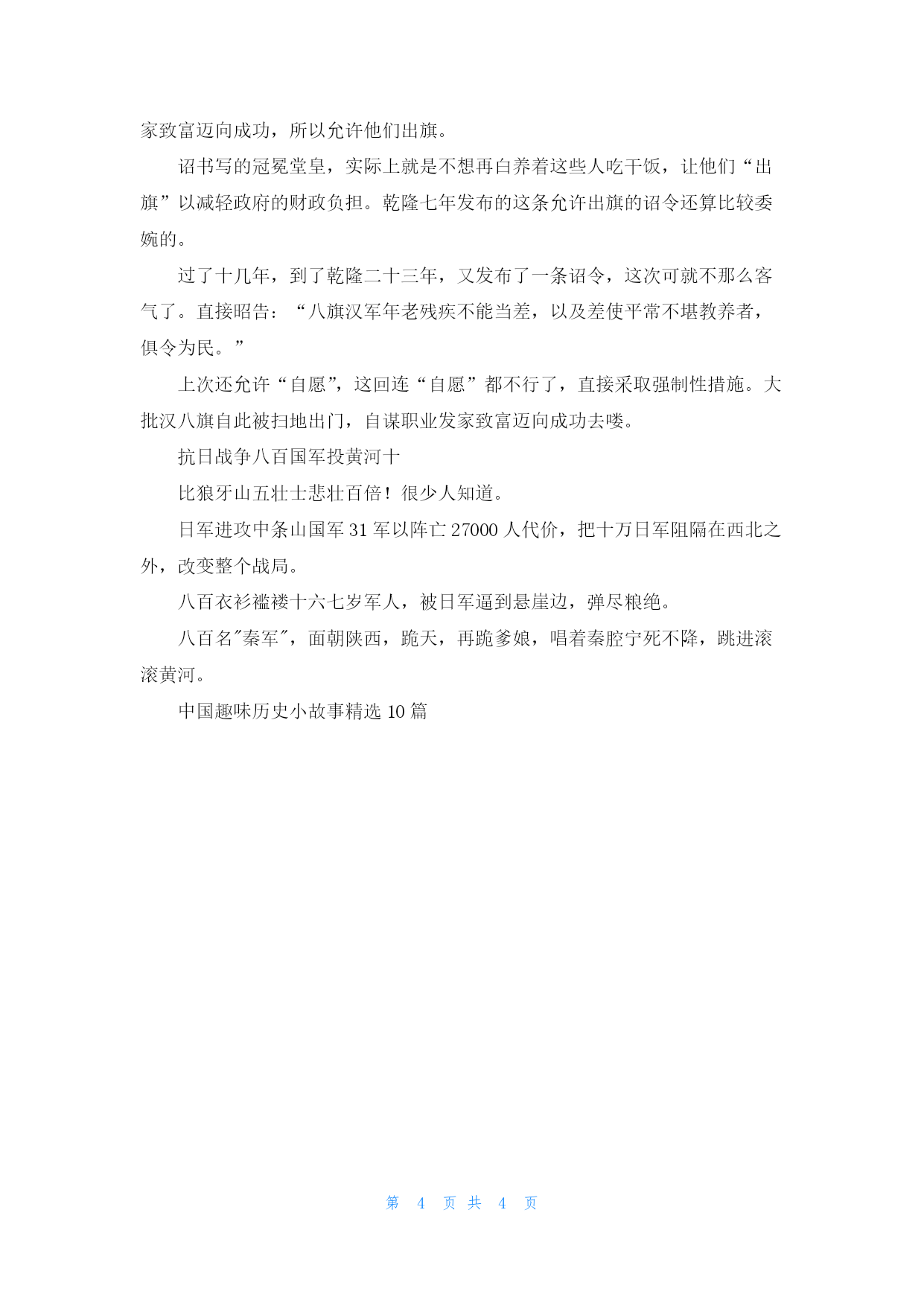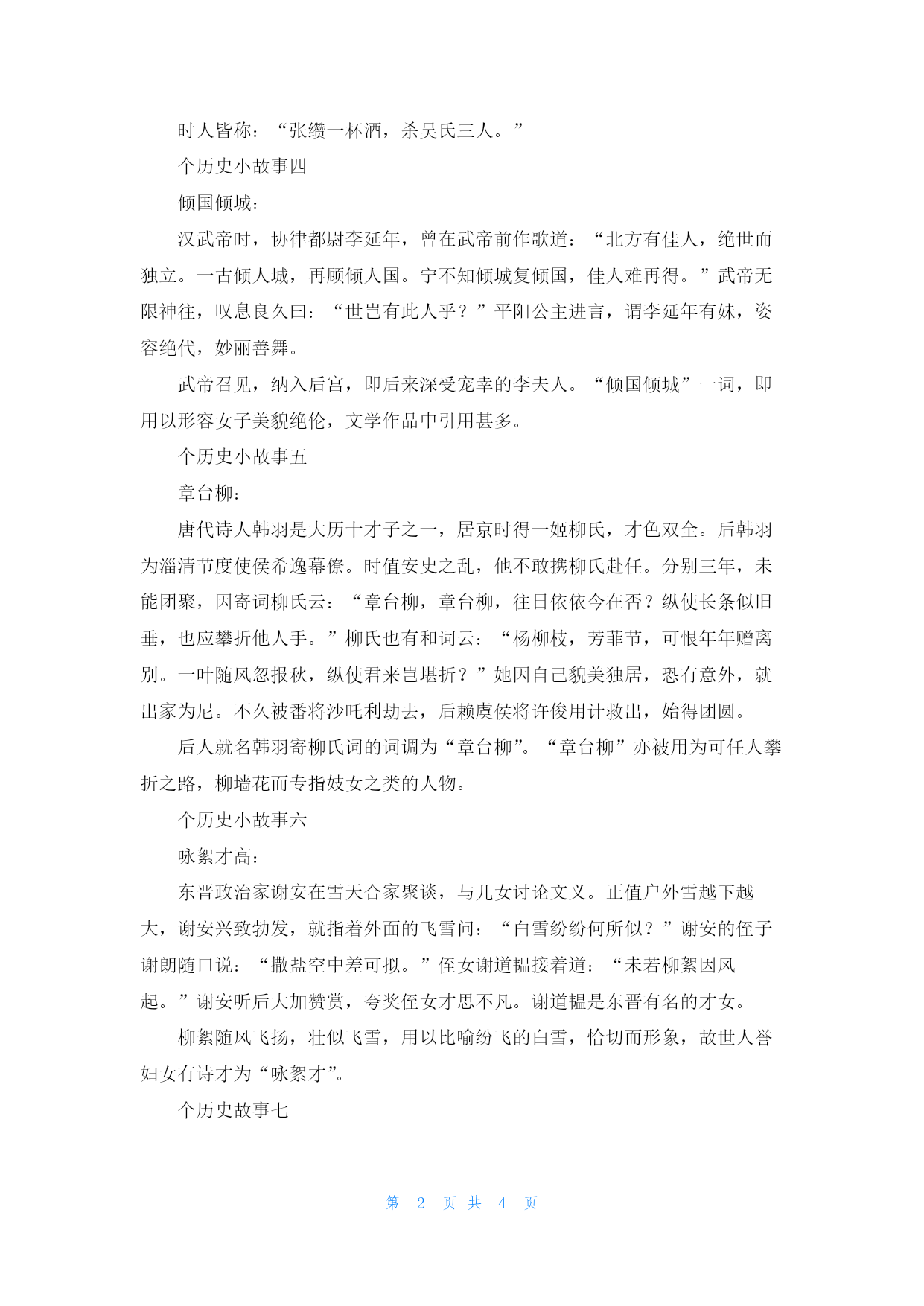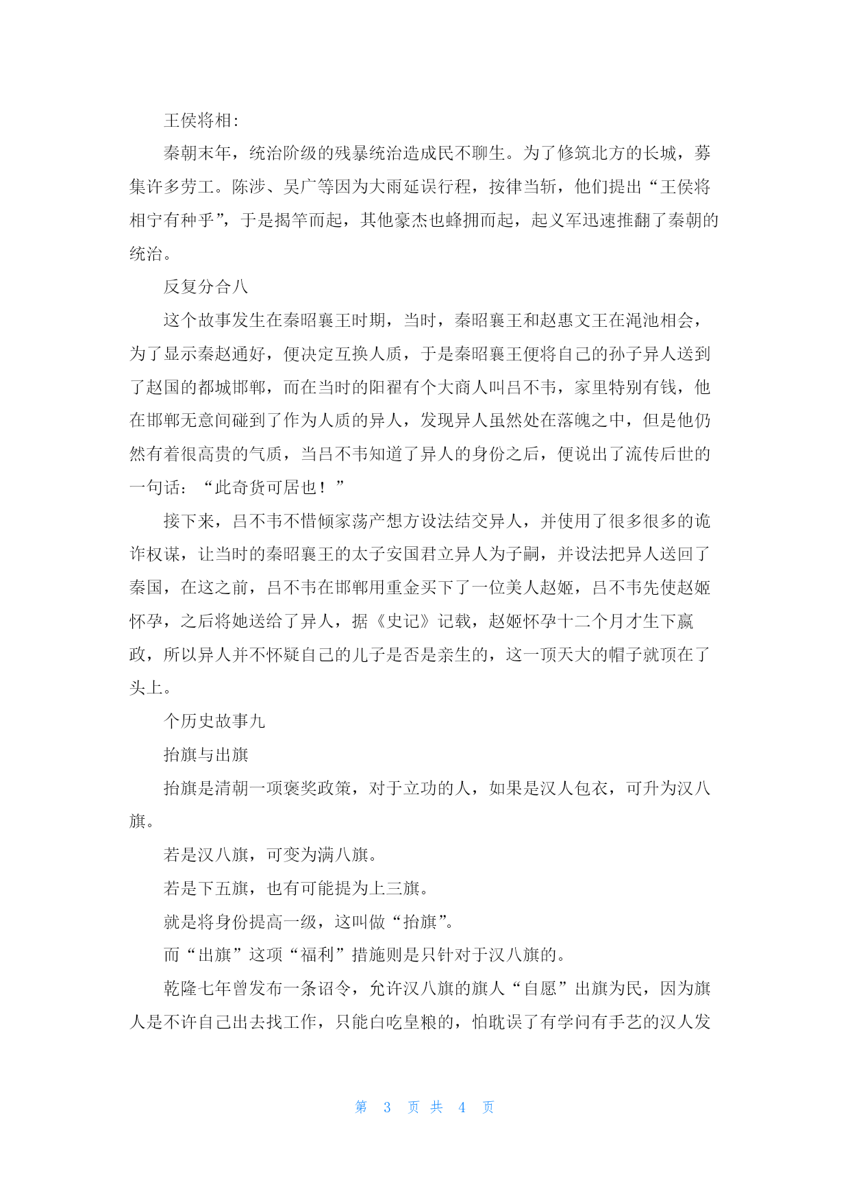 第页共NUMPAGES4页 中国趣味历史小故事精选10篇 ,5000支票一日军在张作霖的地盘杀死了一名中国士兵,张亲自同日本领事馆交涉,日本领事随手写了一张5000元的关东券支票交给他。张作霖回来后,立即下令全军放假,遇到日本人就杀。那时正是半夜,士兵杀了两个日本人。日本领事馆凌晨找到张作霖,他随即交还了日本领事给的支票,另外又写了一张5000元的支票。15个历史小故事二破镜重圆:南朝陈代子舍人徐德言,其妻为陈后主的妹妹乐昌公主。因见天下大乱,国亡无日。恐一旦亡国,离乱之际,夫妻失散,遂破铜镜为二,夫妻各执一半,相约他年正月十五日卖镜都市以谋晤合。未几,陈果为隋所灭。公主被隋朝重臣越国公杨素所获,极受恩宠。德言流离至京城,遇一仆在街头叫卖破镜,正与自己藏的半边契合。就题诗道:“镜与人俱去,镜归人不归。无复嫦娥影,空留明月辉。”公主见诗,悲泣不食。杨素知情后,大为感动,终于让他们夫妇团聚。后因以“破镜重圆”喻夫妻离散后重新团圆。个历史故事三杯酒杀三人南朝梁人张缵,有才学且颇为自负。某次邵陵王萧纶请他喝酒,当时萧纶手下有个名士叫吴规,在当地也是小有名气的人物。这张缵不知道怎么了,就看吴规不顺眼,看见酒席上吴规也在座就不服。举杯就说:“吴规,这杯酒敬你,祝贺你也够资格在今天这宴上喝酒。”把吴规气的够呛,吴规的儿子吴翁孺看父亲被人这么奚落更生气,当晚就气死了。吴规又恨张缵讽刺自己又心疼儿子的死,悲愤交加,也死了。吴规的老婆看老公和儿子相继去世,也悲伤过度,跟着就去了。时人皆称:“张缵一杯酒,杀吴氏三人。”个历史小故事四倾国倾城:汉武帝时,协律都尉李延年,曾在武帝前作歌道:“北方有佳人,绝世而独立。一古倾人城,再顾倾人国。宁不知倾城复倾国,佳人难再得。”武帝无限神往,叹息良久曰:“世岂有此人乎?”平阳公主进言,谓李延年有妹,姿容绝代,妙丽善舞。武帝召见,纳入后宫,即后来深受宠幸的李夫人。“倾国倾城”一词,即用以形容女子美貌绝伦,文学作品中引用甚多。个历史小故事五章台柳:唐代诗人韩羽是大历十才子之一,居京时得一姬柳氏,才色双全。后韩羽为淄清节度使侯希逸幕僚。时值安史之乱,他不敢携柳氏赴任。分别三年,未能团聚,因寄词柳氏云:“章台柳,章台柳,往日依依今在否?纵使长条似旧垂,也应攀折他人手。”柳氏也有和词云:“杨柳枝,芳菲节,可恨年年赠离别。一叶随风忽报秋,纵使君来岂堪折?”她因自己貌美独居,恐有意外,就出家为尼。不久被番将沙吒利劫去,后赖虞侯将许俊用计救出,始得团圆。后人就名韩羽寄柳氏词的词调为“章台柳”。“章台柳”亦被用为可任人攀折之路,柳墙花而专指妓女之类的人物。个历史小故事六咏絮才高:东晋政治家谢安在雪天合家聚谈,与儿女讨论文义。正值户外雪越下越大,谢安兴致勃发,就指着外面的飞雪问:“白雪纷纷何所似?”谢安的侄子谢朗随口说:“撒盐空中差可拟。”侄女谢道韫接着道:“未若柳絮因风起。”谢安听后大加赞赏,夸奖侄女才思不凡。谢道韫是东晋有名的才女。柳絮随风飞扬,壮似飞雪,用以比喻纷飞的白雪,恰切而形象,故世人誉妇女有诗才为“咏絮才”。个历史故事七王侯将相:秦朝末年,统治阶级的残暴统治造成民不聊生。为了修筑北方的长城,募集许多劳工。陈涉、吴广等因为大雨延误行程,按律当斩,他们提出“王侯将相宁有种乎”,于是揭竿而起,其他豪杰也蜂拥而起,起义军迅速推翻了秦朝的统治。反复分合八这个故事发生在秦昭襄王时期,当时,秦昭襄王和赵惠文王在渑池相会,为了显示秦赵通好,便决定互换人质,于是秦昭襄王便将自己的孙子异人送到了赵国的都城邯郸,而在当时的阳翟有个大商人叫吕不韦,家里特别有钱,他在邯郸无意间碰到了作为人质的异人,发现异人虽然处在落魄之中,但是他仍然有着很高贵的气质,当吕不韦知道了异人的身份之后,便说出了流传后世的一句话:“此奇货可居也!”接下来,吕不韦不惜倾家荡产想方设法结交异人,并使用了很多很多的诡诈权谋,让当时的秦昭襄王的太子安国君立异人为子嗣,并设法把异人送回了秦国,在这之前,吕不韦在邯郸用重金买下了一位美人赵姬,吕不韦先使赵姬怀孕,之后将她送给了异人,据《史记》记载,赵姬怀孕十二个月才生下嬴政,所以异人并不怀疑自己的儿子是否是亲生的,这一顶天大的帽子就顶在了头上。个历史故事九抬旗与出旗抬旗是清朝一项褒奖政策,对于立功的人,如果是汉人包衣,可升为汉八旗。若是汉八旗,可变为满八旗。若是下五旗,也有可能提为上三旗。就是将身份提高一级,这叫做“抬旗”。而“出旗”这项“福利”措施则是只针对于汉八旗的。乾隆七年曾发布一条诏令,允许汉八旗的旗人“自愿”出旗为民,因为旗人是不许自己出去找工作,只能白吃皇粮的,怕耽误了有学问有手艺的汉人发家致富迈向成功,所以允许他们出旗。诏书写的冠冕堂皇,实际上就是不想再白养着这些人吃干饭,让他们“出旗”以减