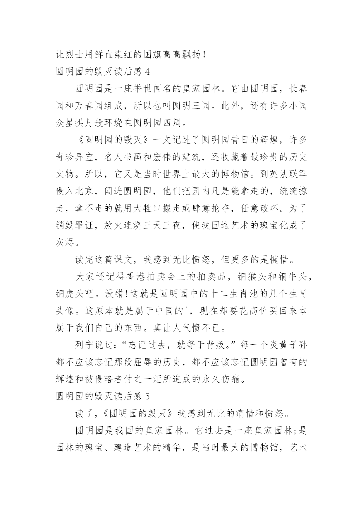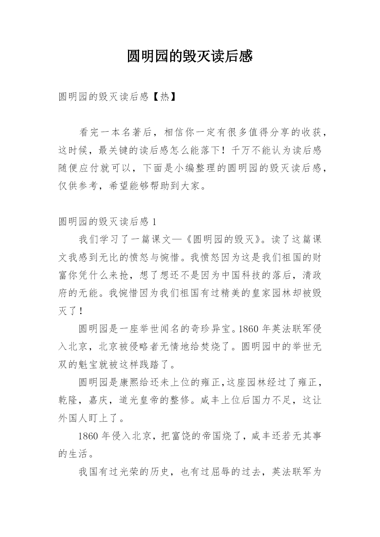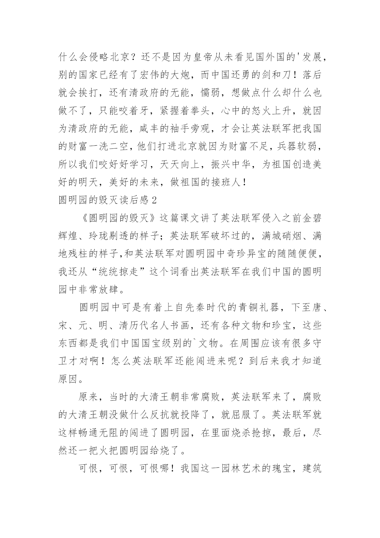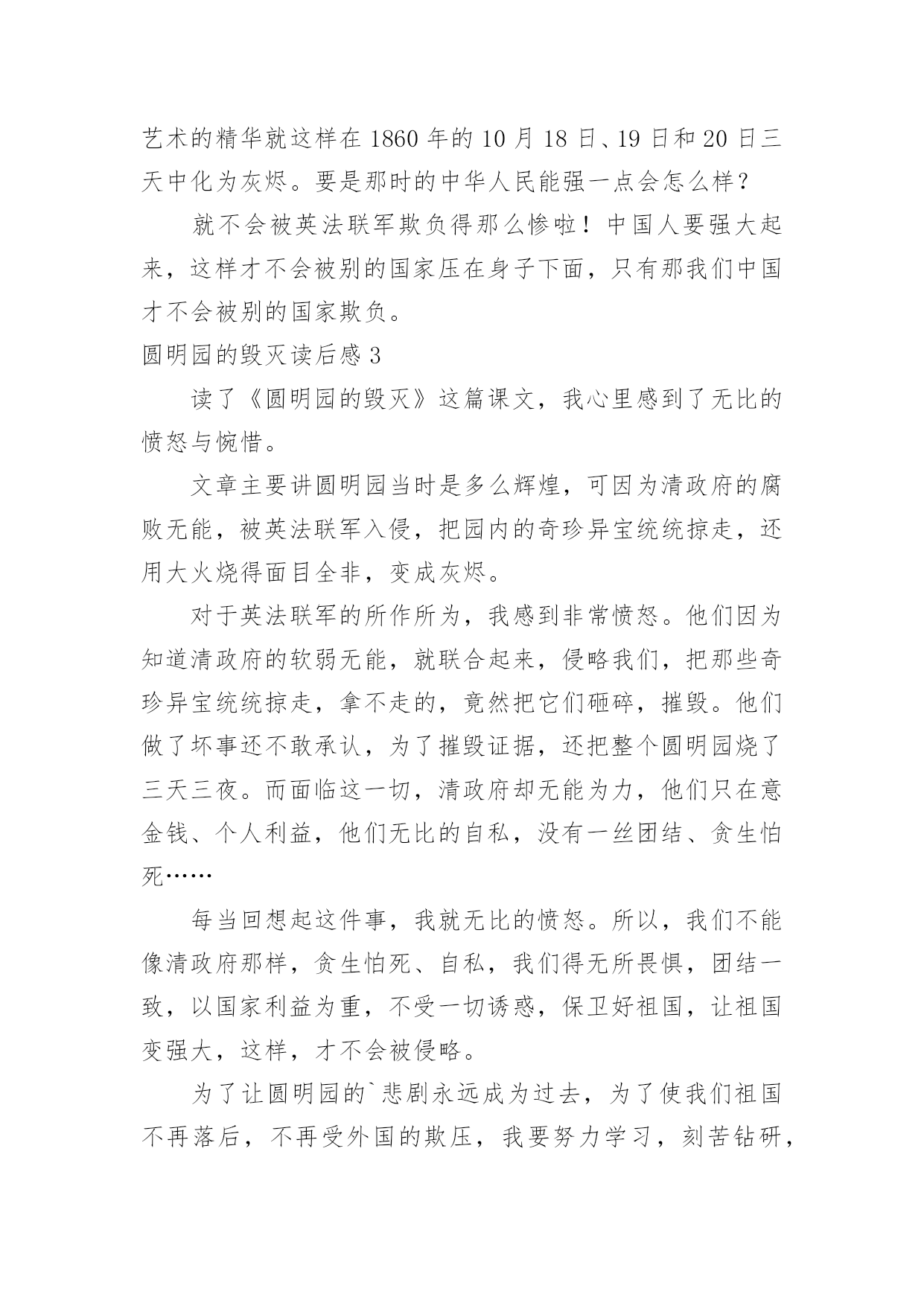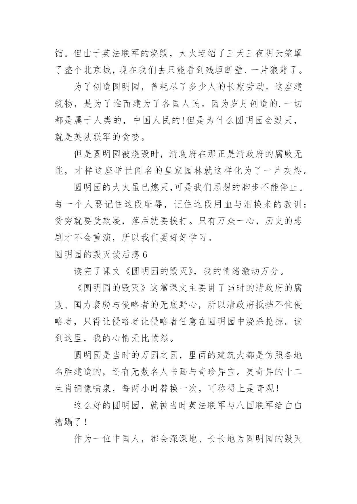 圆明园的毁灭读后感 圆明园的毁灭读后感【热】看完一本名著后,相信你一定有很多值得分享的收获,这时候,最关键的读后感怎么能落下!千万不能认为读后感随便应付就可以,下面是小编整理的圆明园的毁灭读后感,仅供参考,希望能够帮助到大家。圆明园的毁灭读后感1我们学习了一篇课文—《圆明园的毁灭》。读了这篇课文我感到无比的愤怒与惋惜。我愤怒因为这是我们祖国的财富你凭什么来抢,想了想还不是因为中国科技的落后,清政府的无能。我惋惜因为我们祖国有过精美的皇家园林却被毁灭了!圆明园是一座举世闻名的奇珍异宝。1860年英法联军侵入北京,北京被侵略者无情地给焚烧了。圆明园中的举世无双的魁宝就被这样践踏了。圆明园是康熙给还未上位的雍正,这座园林经过了雍正,乾隆,嘉庆,道光皇帝的整修。咸丰上位后国力不足,这让外国人盯上了。1860年侵入北京,把富饶的帝国烧了,咸丰还若无其事的生活。我国有过光荣的历史,也有过屈辱的过去,英法联军为什么会侵略北京?还不是因为皇帝从未看见国外国的'发展,别的国家已经有了宏伟的大炮,而中国还勇的剑和刀!落后就会挨打,还有清政府的无能,懦弱,想做点什么却什么也做不了,只能咬着牙,紧握着拳头,心中的怒火上升,就因为清政府的无能,咸丰的袖手旁观,才会让英法联军把我国的财富一洗二空,他们打进北京就因为财富不足,兵器软弱,所以我们咬好好学习,天天向上,振兴中华,为祖国创造美好的明天,美好的未来,做祖国的接班人!圆明园的毁灭读后感2《圆明园的毁灭》这篇课文讲了英法联军侵入之前金碧辉煌、玲珑剔透的样子;英法联军破坏过的,满城硝烟、满地残柱的样子,和英法联军对圆明园中奇珍异宝的随随便便,我还从“统统掠走”这个词看出英法联军在我们中国的圆明园中非常放肆。圆明园中可是有着上自先秦时代的青铜礼器,下至唐、宋、元、明、清历代名人书画,还有各种文物和珍宝,这些东西都是我们中国国宝级别的`文物。在周围应该有很多守卫才对啊!怎么英法联军还能闯进来呢?到后来我才知道原因。原来,当时的大清王朝非常腐败,英法联军来了,腐败的大清王朝没做什么反抗就投降了,就屈服了。英法联军就这样畅通无阻的闯进了圆明园,在里面烧杀抢掠,最后,尽然还一把火把圆明园给烧了。可恨,可恨,可恨哪!我国这一园林艺术的瑰宝,建筑艺术的精华就这样在1860年的10月18日、19日和20日三天中化为灰烬。要是那时的中华人民能强一点会怎么样?就不会被英法联军欺负得那么惨啦!中国人要强大起来,这样才不会被别的国家压在身子下面,只有那我们中国才不会被别的国家欺负。圆明园的毁灭读后感3读了《圆明园的毁灭》这篇课文,我心里感到了无比的愤怒与惋惜。文章主要讲圆明园当时是多么辉煌,可因为清政府的腐败无能,被英法联军入侵,把园内的奇珍异宝统统掠走,还用大火烧得面目全非,变成灰烬。对于英法联军的所作所为,我感到非常愤怒。他们因为知道清政府的软弱无能,就联合起来,侵略我们,把那些奇珍异宝统统掠走,拿不走的,竟然把它们砸碎,摧毁。他们做了坏事还不敢承认,为了摧毁证据,还把整个圆明园烧了三天三夜。而面临这一切,清政府却无能为力,他们只在意金钱、个人利益,他们无比的自私,没有一丝团结、贪生怕死……每当回想起这件事,我就无比的愤怒。所以,我们不能像清政府那样,贪生怕死、自私,我们得无所畏惧,团结一致,以国家利益为重,不受一切诱惑,保卫好祖国,让祖国变强大,这样,才不会被侵略。为了让圆明园的`悲剧永远成为过去,为了使我们祖国不再落后,不再受外国的欺压,我要努力学习,刻苦钻研,让烈士用鲜血染红的国旗高高飘扬!圆明园的毁灭读后感4圆明园是一座举世闻名的皇家园林。它由圆明园,长春园和万春园组成,所以也叫圆明三园。此外,还有许多小园众星拱月般环绕在圆明园四周。《圆明园的毁灭》一文记述了圆明园昔日的辉煌,许多奇珍异宝,名人书画和宏伟的建筑,还收藏着最珍贵的历史文物。所以,它又是当时世界上最大的博物馆。到英法联军侵入北京,闯进圆明园,他们把园内凡是能拿走的,统统掠走,拿不走的就用大牲口搬走或肆意抡夺,任意破坏。为了销毁罪证,放火连烧三天三夜,使我国这艺术的瑰宝化成了灰烬。读完这篇课文,我感到无比愤怒,但更多的是惋惜。大家还记得香港拍卖会上的拍卖品,铜猴头和铜牛头,铜虎头吧。没错!这就是圆明园中的十二生肖池的几个生肖头像。这原本就是属于中国的',现在却要花高价买回来本属于我们自己的东西。真让人气愤不已。列宁说过:“忘记过去,就等于背叛。”每一个炎黄子孙都不应该忘记那段屈辱的历史,都不应该忘记圆明园曾有的辉煌和被侵略者付之一炬所造成的永久伤痛。圆明园的毁灭读后感5读了,《圆明园的毁灭》我感到无比的痛惜和愤怒。圆明园是我国的皇家园林。它过去是一座皇家园林;是园林的瑰宝、建造艺术的精华,是当时最大的博物馆,艺术馆。但由于英法联军的烧毁,大火连绍了三天