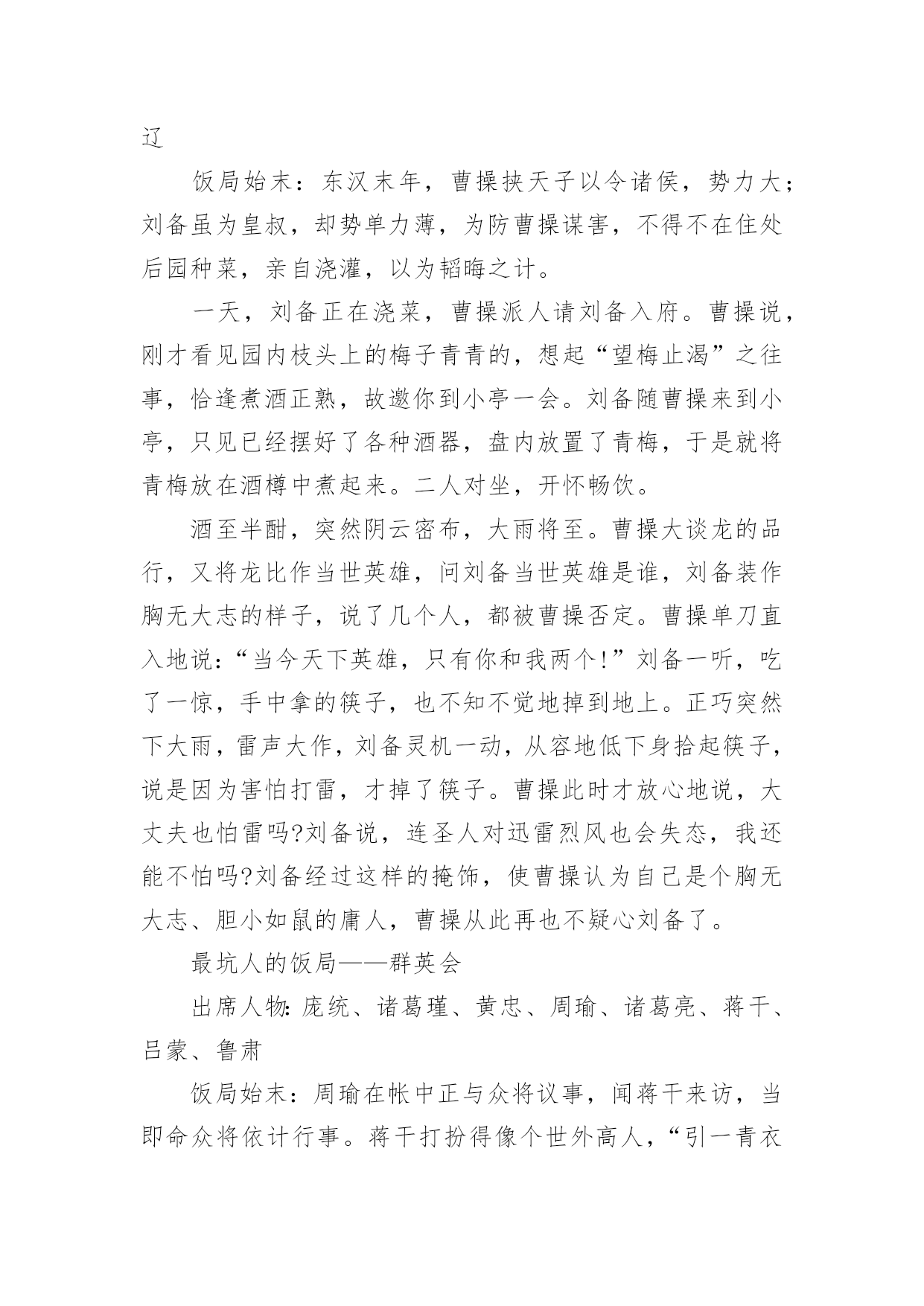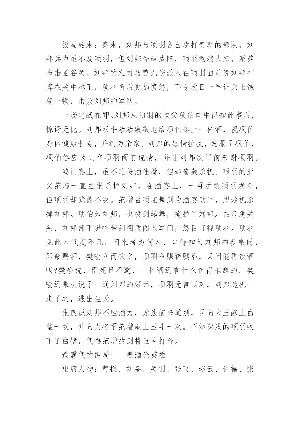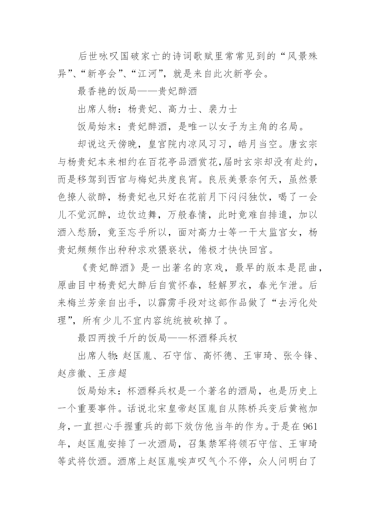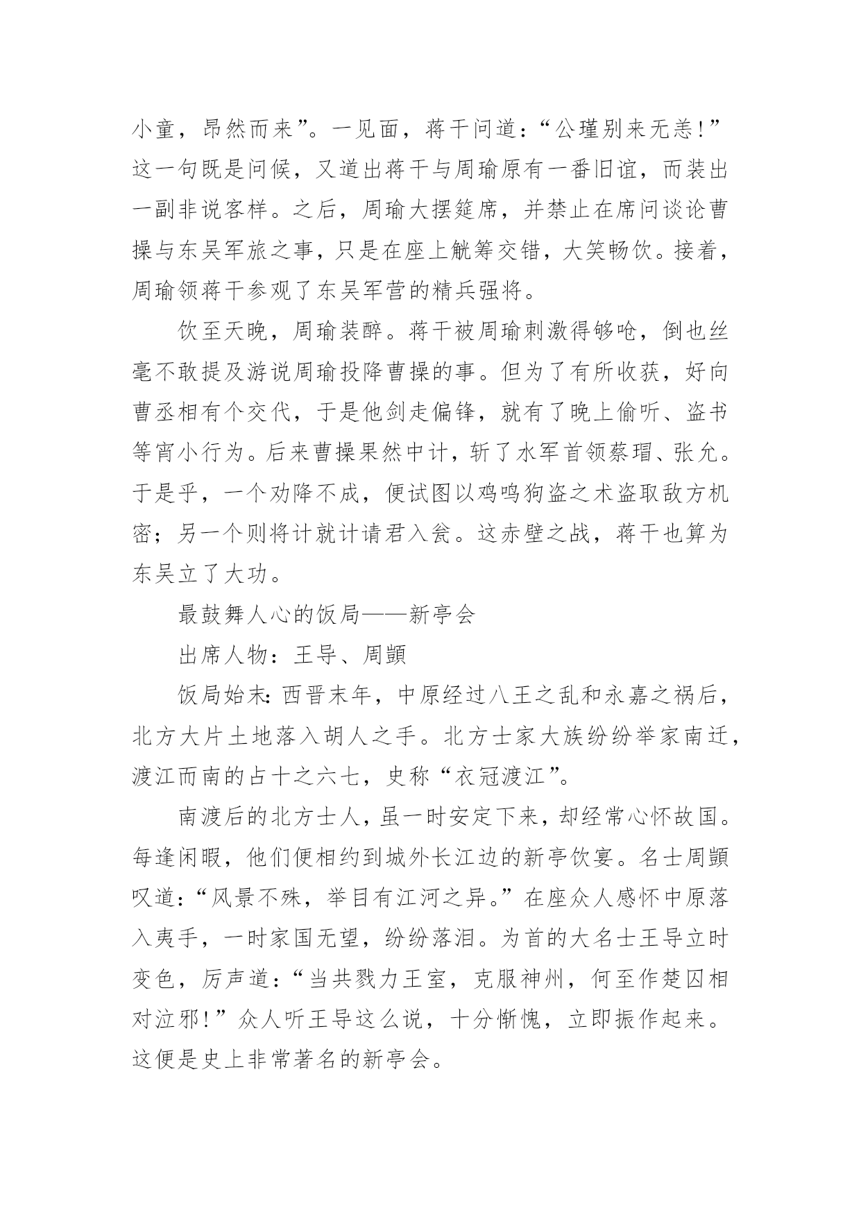 中国历史上最有名的八大饭局|古代的千金是什么意思 在中国历史上,饭局与政治永远保持着若即若离的关系。每一个饭局,其实都是人与人之间的较量。饭桌可以改变历史,筷子也可以涂改史书。盘点中国历史上几个足以扭转乾坤的饭局,以飨读者。最不辱使命的饭局——渑池会出席人物:秦襄王、赵文王、蔺相如饭局始末:赵国得到和氏璧,秦襄王得此消息,派人送信给赵文王,愿意拿十五个城池换这块璧。蔺相如毅然承担出使秦国的重任并“完璧归赵”。不久,秦国攻打赵国,杀死赵国兵士两万多人。秦王派使者告诉赵王,约赵王在渑池会谈。赵王害怕上当,又不敢不去。蔺相如为了祖国荣誉,不怕牺牲,决定亲自陪同赵王前往渑池。在宴会上,他与秦国君臣进行了针锋相对的斗争。在赵王被迫鼓瑟的情况下,他为了使赵国取得对等的地位,据理力争,使秦王不得不击缶。后来,秦国群臣向赵国要十五座城,蔺相如寸步不让,提出用秦国的国都咸阳作为交换条件,使秦王理屈词穷,毫无所得。蔺相如机智地保护了赵王的安全并且不被羞辱。回国后,他被任命为上卿。最杀机四伏的饭局——鸿门宴出席人物:刘邦、张良、樊哙、项羽、范增、项庄、项伯饭局始末:秦末,刘邦与项羽各自攻打秦朝的部队,刘邦兵力虽不及项羽,但刘邦先破成阳,项羽勃然大怒,派英布击函谷关。刘邦的左司马曹无伤派入在项羽面前说刘邦打算在关中称王,项羽听后更加愤怒,下令次日一早让兵士饱餐一顿,击败刘邦的军队。一场恶战在即。刘邦从项羽的叔父项伯口中得知此事后,惊讶无比。刘邦双手恭恭敬敬地给项伯捧上一杯酒,祝项伯身体健康长寿,并约为亲家。刘邦的感情拉拢,说服了项伯,项伯答应为之在项羽面前说情,并让刘邦次日前来谢项羽。鸿门宴上,虽不乏美酒佳肴,但却暗藏杀机。项羽的亚父范增一直主张杀掉刘邦,在酒宴上,一再示意项羽发令,但项羽却犹豫不决。范增召项庄舞剑为酒宴助兴,想趁机杀掉刘邦。项伯为刘邦,也拔剑起舞,掩护了刘邦。在危急关头,刘邦部下樊哙带剑拥盾闯入军门,怒目直视项羽。项羽见此人气度不凡,问来者为何人,当得知为刘邦的参乘时,即命赐酒,樊哙立而饮之,项羽命赐猪腿后,又问能再饮酒吗?樊哙说,臣死且不避,一杯酒还有什么值得推辞的。樊哙还乘机说了一通刘邦的好话,项羽无言以对,刘邦趁机一走了之,逃出生天。张良说刘邦不胜酒力,无法前来道别,现向大王献上白璧一双,并向大将军范增献上玉斗一双。不知深浅的项羽收下了白璧,气得范增拔剑将玉斗打碎。最霸气的饭局——煮酒论英雄出席人物:曹操、刘备、关羽、张飞、赵云、许褚、张辽饭局始末:东汉末年,曹操挟天子以令诸侯,势力大;刘备虽为皇叔,却势单力薄,为防曹操谋害,不得不在住处后园种菜,亲自浇灌,以为韬晦之计。一天,刘备正在浇菜,曹操派人请刘备入府。曹操说,刚才看见园内枝头上的梅子青青的,想起“望梅止渴”之往事,恰逢煮酒正熟,故邀你到小亭一会。刘备随曹操来到小亭,只见已经摆好了各种酒器,盘内放置了青梅,于是就将青梅放在酒樽中煮起来。二人对坐,开怀畅饮。酒至半酣,突然阴云密布,大雨将至。曹操大谈龙的品行,又将龙比作当世英雄,问刘备当世英雄是谁,刘备装作胸无大志的样子,说了几个人,都被曹操否定。曹操单刀直入地说:“当今天下英雄,只有你和我两个!”刘备一听,吃了一惊,手中拿的筷子,也不知不觉地掉到地上。正巧突然下大雨,雷声大作,刘备灵机一动,从容地低下身拾起筷子,说是因为害怕打雷,才掉了筷子。曹操此时才放心地说,大丈夫也怕雷吗?刘备说,连圣人对迅雷烈风也会失态,我还能不怕吗?刘备经过这样的掩饰,使曹操认为自己是个胸无大志、胆小如鼠的庸人,曹操从此再也不疑心刘备了。最坑人的饭局——群英会出席人物:庞统、诸葛瑾、黄忠、周瑜、诸葛亮、蒋干、吕蒙、鲁肃饭局始末:周瑜在帐中正与众将议事,闻蒋干来访,当即命众将依计行事。蒋干打扮得像个世外高人,“引一青衣小童,昂然而来”。一见面,蒋干问道:“公瑾别来无恙!”这一句既是问候,又道出蒋干与周瑜原有一番旧谊,而装出一副非说客样。之后,周瑜大摆筵席,并禁止在席问谈论曹操与东吴军旅之事,只是在座上觥筹交错,大笑畅饮。接着,周瑜领蒋干参观了东吴军营的精兵强将。饮至天晚,周瑜装醉。蒋干被周瑜刺激得够呛,倒也丝毫不敢提及游说周瑜投降曹操的事。但为了有所收获,好向曹丞相有个交代,于是他剑走偏锋,就有了晚上偷听、盗书等宵小行为。后来曹操果然中计,斩了水军首领蔡瑁、张允。于是乎,一个劝降不成,便试图以鸡鸣狗盗之术盗取敌方机密;另一个则将计就计请君入瓮。这赤壁之战,蒋干也算为东吴立了大功。最鼓舞人心的饭局——新亭会出席人物:王导、周顗饭局始末:西晋末年,中原经过八王之乱和永嘉之祸后,北方大片土地落入胡人之手。北方士家大族纷纷举家南迁,渡江而南的占十之六七,史称“衣冠渡江”。南渡后的北方士人,虽一时安定下来,却经常心怀故国。每逢闲暇,他们便相约到城外长江边