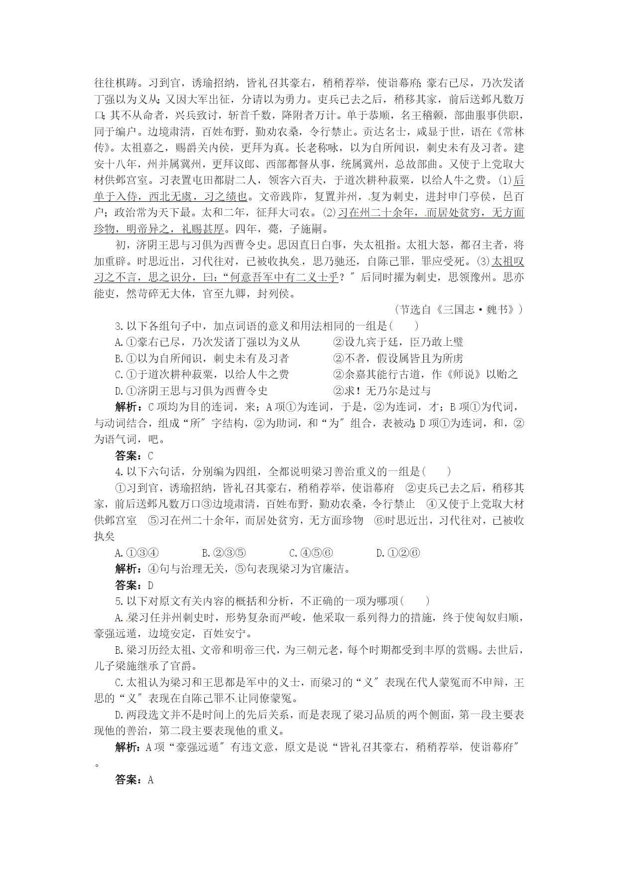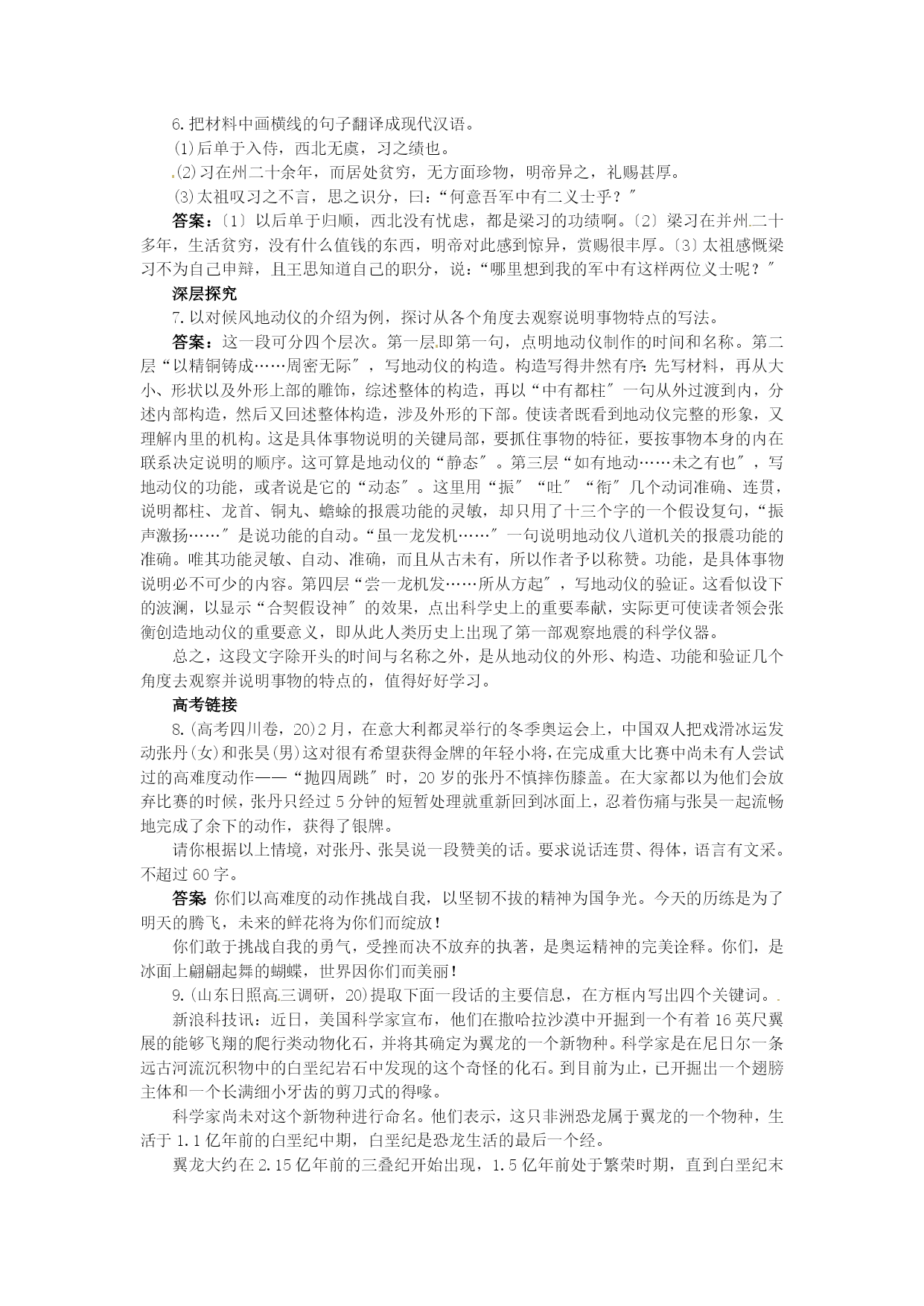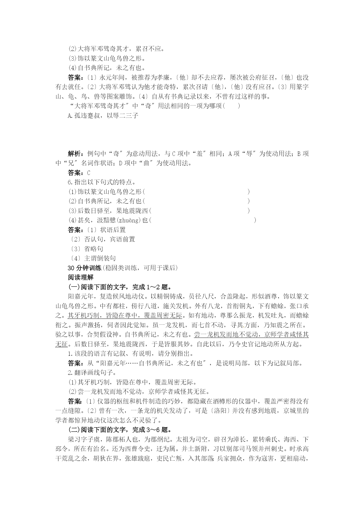 15张衡传 5分钟训练(预习类训练,可用于课前) 1.给以下加点的字注音。 属文()邓骘()逾侈()璇机() 驿站()河间相()骸骨()蟾蜍() 答案:zhǔzhìchǐxuányìxiàngháichánchú ___、____、____。 答案:沉着淡静不慕当世无骄尚之情 3.关于本文有关内容的表达,正确的一项为哪项() A.本文属评传,既记叙人物的事迹,又评介与探讨人物的思想状况、人物所处的时代背景、思想开展过程和对人类的奉献。 “善属文〞“通五经〞“贯六艺〞“才高于世〞“所居之官辄积年不徙〞,这些都反映他不尚虚浮而谦逊朴实的品德。 C.本文全面地记叙了张衡各个方面的成就,又重点突出他在科技方面的成就和奉献,所以作者在这方面不惜笔墨作了详细的记述。 “不好交接俗人〞,不满当时“王侯以下〞的“逾侈〞风气,经过十年苦思而写成《二京赋》以讽谏当世,并表白自己不与世俗同流合污的精神。 解析:B项中“所居之官辄积年不徙〞不能反映他不尚虚浮而谦逊朴实的品德;C项中在科技方面,略写浑天仪,详写地动仪;D项中“表白自己不与世俗同流合污的精神〞在课文中没有提及,属于无中生有。 答案:A 4.课文以____先后为顺序,介绍传主的生平事迹。全文包括六段,各段内容各有侧重,全文可分为三个局部:(1)____(第1段);(2)____(第2~4段);(3)____(第5~6段)。 答案:时间写张衡的品格和文才写张衡在科学技术上取得的成就写张衡的政治才干 10分钟训练(强化类训练,可用于课中) 1.文章中介绍候风地动仪的文字可以说是一段典范的科技说明文,其介绍的顺序是____、____、____、____、____、____、____、____、____、____。 答案:时间名称材料外形构造作用效果评价验证使用 “才〞高于世,表现在:一、____,作《二京赋》;二、____,作浑天仪、造候风地动仪;三、____,著《灵宪》《算罔论》;四、____,为政机智果断,不畏权贵,称为政理。 答案:善属文善机巧善术学善政事 3.课文语言质朴简练。如“____,____,____,____,____,____。〞短短二十三字,就写出了张衡的学历、水平和特长。“……不行,……不就,……不应。〞充分表现了张衡不慕名利的品德。“____,____,____,____,____。〞节奏感很强的语言,表现了张衡的态度果断,措施得力。 答案:衡少善属文游于三辅因入京师观太学遂通五经贯六艺衡下车治威严整法度阴知奸党名姓一时收禽 4.翻译以下各句。 (1)永元中,举孝廉不行,连辟公府不就。 (2)大将军邓骘奇其才,累召不应。 (3)饰以篆文山龟鸟兽之形。 (4)自书典所记,未之有也。 答案:〔1〕永元年间,被推荐为孝廉,〔他〕却不去应荐,屡次被公府征召,〔他〕也没有去就任。〔2〕大将军邓骘认为他才能奇特,累次召请〔他〕,〔他〕没有应召。〔3〕用篆字山、龟、鸟、兽等图案雕饰。〔4〕自从有书典记录以来,不曾有过这样的事。 “大将军邓骘奇其才〞中“奇〞用法相同的一项为哪项() A.孤违蹇叔,以辱二三子 解析:例句中“奇〞为意动用法,与C项中“羞〞相同;A项“辱〞为使动用法;B项中“兄〞名词作状语;D项中“曲〞为使动用法。 答案:C 6.指出以下句式的特点。 (1)饰以篆文山龟鸟兽之形() (2)自书典所记,未之有也() (3)后数日驿至,果地震陇西() (4)甚矣,汲黯戆(zhuàng)也() 答案:〔1〕状语后置 〔2〕否认句,宾语前置 〔3〕省略句 〔4〕主谓倒装句 30分钟训练(稳固类训练,可用于课后) 阅读理解 (一)阅读下面的文字,完成1~2题。 阳嘉元年,复造候风地动仪。以精铜铸成,员径八尺,合盖隆起,形似酒尊,饰以篆文山龟鸟兽之形。中有都柱,傍行八道,施关发机。外有八龙,首衔铜丸,下有蟾蜍,张口承之。其牙机巧制,皆隐在尊中,覆盖周密无际。如有地动,尊那么振龙,机发吐丸,而蟾蜍衔之。振声激扬,伺者因此觉知。虽一龙发机,而七首不动,寻其方面,乃知震之所在。验之以事,合契假设神。自书典所记,未之有也。尝一龙机发而地不觉动,京师学者咸怪其无征。后数日驿至,果地震陇西,于是皆服其妙。自此以后,乃令史官记地动所从方起。 1.该段的语言有记叙、有说明,请分别指出。 答案:从“阳嘉元年……自书典所记,未之有也〞,是说明局部,以下为记叙局部。 2.翻译画线句子。 (1)其牙机巧制,皆隐在尊中,覆盖周密无际。 (2)尝一龙机发而地不觉动,京师学者咸怪其无征。 答案:〔1〕仪器的枢纽和机件制造的巧妙,都隐藏在酒樽形的仪器中,覆盖严密得没有一点缝隙。〔2〕曾有一次,一条龙的机关发动了,可是〔洛阳〕并没有感到地震,京城里的学者都惊异地动仪这次怎么不灵验了。 (二)阅读下面的文