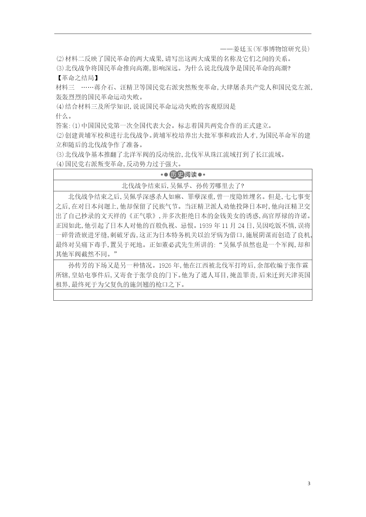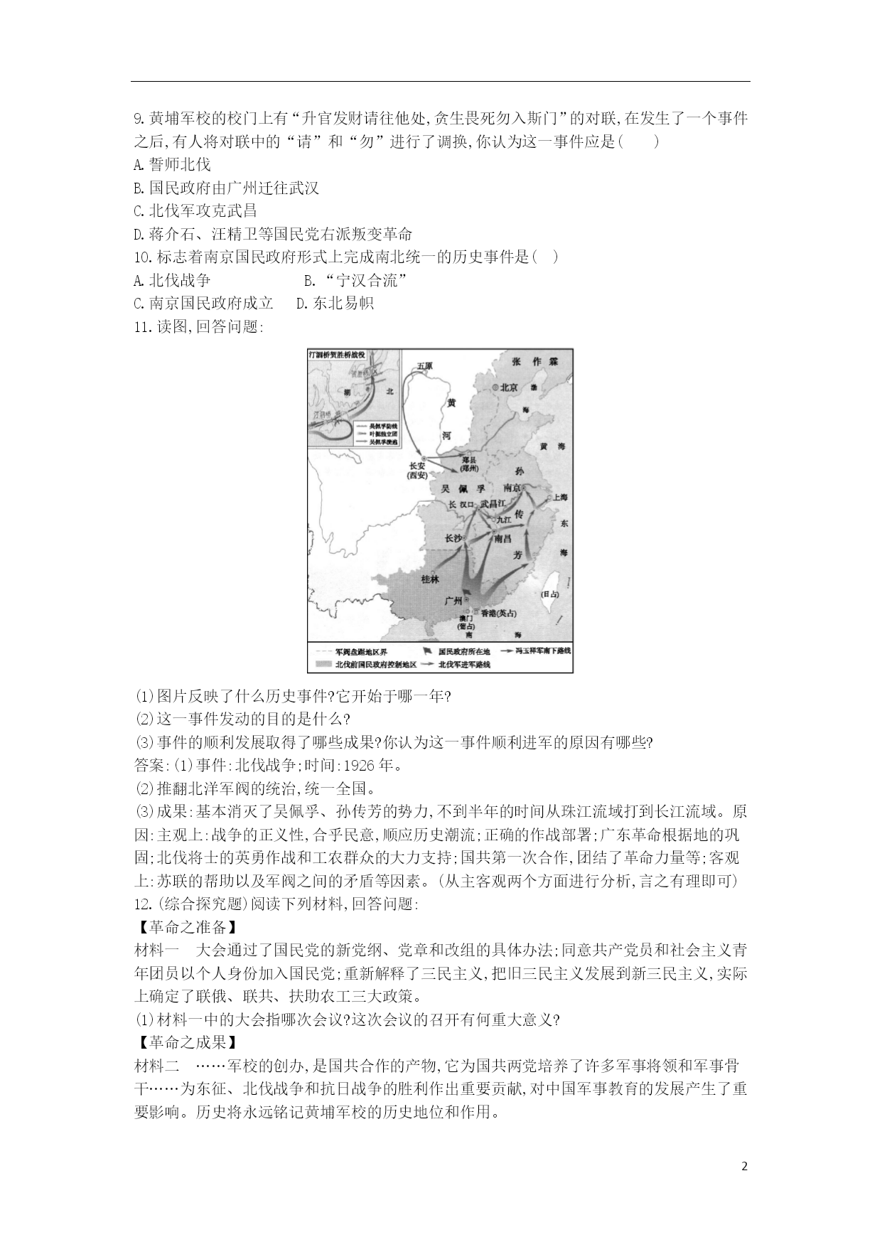 第五单元从国共合作到国共对峙 第15课北伐战争 1.下列对孙中山提出的三大政策的表述,正确的是() A.联苏、联共、扶助农工 B.联俄、联共、扶助工农 C.联俄、联共、扶助农工 D.联苏、联共、团结工农 2.中国历史上国共两党有过两次合作,第一次国共合作实现的标志是() A.中国共产党二大 B.中国共产党三大 C.中国国民党一大 D.黄埔军校的创办 3.(2018辽师大附中)孙中山接受中国共产党反帝反封建的主张,最主要体现在() A.同意改组国民党 B.同意以党内合作方式与中国共产党合作 C.召开国民党一大 D.重新解释三民主义 4.如图是周恩来在黄埔军校时的留影,当时他担任军校的() A.总理 B.校长 C.党代表 D.政治部主任 5.(2018泉州实验中学调研)黄埔军校为国共两党培养了一批著名的将领和军事人才。中国人民解放军“十大元帅”中有4人出自黄埔军校,他们分别是林彪、徐向前、聂荣臻和叶剑英。下列有关黄埔军校的叙述正确的是() A.黄埔军校是中国国民党独自建立的 B.周恩来兼任军校总理 C.黄埔军校建在南京 D.黄埔军校为北伐战争的胜利进行奠定了基础 6.毛泽东曾当面称他是“共产党第一任总司令,人民军队的战史要从你写起”,在北伐战争中,他曾领导第四军独立团连克汀泗桥和贺胜桥,被誉为“北伐名将”,第四军也因此被称为“铁军”。“他”是() A.朱德 B.叶挺 C.贺龙 D.刘伯承 7.“打倒列强!打倒列强!除军阀,除军阀!国民革命成功,国民革命成功!齐欢唱,齐欢唱!”这首军歌最早开始传唱于() A.1924年 B.1926年 C.1927年 D.1928年 8.战士们高喊“打倒列强,除军阀”的口号,奋勇杀敌,不到半年,革命的火焰就从珠江流域蔓延到长江流域。材料中“革命”是指() A.太平天国运动 B.义和团运动 C.北伐战争 D.抗日战争 9.黄埔军校的校门上有“升官发财请往他处,贪生畏死勿入斯门”的对联,在发生了一个事件之后,有人将对联中的“请”和“勿”进行了调换,你认为这一事件应是() A.誓师北伐 B.国民政府由广州迁往武汉 C.北伐军攻克武昌 D.蒋介石、汪精卫等国民党右派叛变革命 10.标志着南京国民政府形式上完成南北统一的历史事件是() A.北伐战争 B.“宁汉合流” C.南京国民政府成立 D.东北易帜 11.读图,回答问题: (1)图片反映了什么历史事件?它开始于哪一年? (2)这一事件发动的目的是什么? (3)事件的顺利发展取得了哪些成果?你认为这一事件顺利进军的原因有哪些? 答案:(1)事件:北伐战争;时间:1926年。 (2)推翻北洋军阀的统治,统一全国。 (3)成果:基本消灭了吴佩孚、孙传芳的势力,不到半年的时间从珠江流域打到长江流域。原因:主观上:战争的正义性,合乎民意,顺应历史潮流;正确的作战部署;广东革命根据地的巩固;北伐将士的英勇作战和工农群众的大力支持;国共第一次合作,团结了革命力量等;客观上:苏联的帮助以及军阀之间的矛盾等因素。(从主客观两个方面进行分析,言之有理即可) 12.(综合探究题)阅读下列材料,回答问题: 【革命之准备】 材料一大会通过了国民党的新党纲、党章和改组的具体办法;同意共产党员和社会主义青年团员以个人身份加入国民党;重新解释了三民主义,把旧三民主义发展到新三民主义,实际上确定了联俄、联共、扶助农工三大政策。 (1)材料一中的大会指哪次会议?这次会议的召开有何重大意义? 【革命之成果】 材料二……军校的创办,是国共合作的产物,它为国共两党培养了许多军事将领和军事骨干……为东征、北伐战争和抗日战争的胜利作出重要贡献,对中国军事教育的发展产生了重要影响。历史将永远铭记黄埔军校的历史地位和作用。 ——姜廷玉(军事博物馆研究员) (2)材料二反映了国民革命的两大成果,请写出这两大成果的名称及它们之间的关系。 (3)北伐战争将国民革命推向高潮,影响深远。为什么说北伐战争是国民革命的高潮? 【革命之结局】 材料三……蒋介石、汪精卫等国民党右派突然叛变革命,大肆屠杀共产党人和国民党左派,轰轰烈烈的国民革命运动失败。 (4)结合材料三及所学知识,说说国民革命运动失败的客观原因是 什么。 答案:(1)中国国民党第一次全国代表大会。标志着国共两党合作的正式建立。 (2)创建黄埔军校和进行北伐战争。黄埔军校培养出大批军事和政治人才,为国民革命军的建立和随后的北伐战争作了准备。 (3)北伐战争基本推翻了北洋军阀的反动统治,北伐军从珠江流域打到了长江流域。 (4)国民党右派叛变革命,反动势力过于强大。 北伐战争结束后,吴佩孚、孙传芳哪里去了? 北伐战争结束之后,吴佩孚深感杀人如麻、罪孽深重,曾一度隐姓埋名。但是,七七事变之后,在对日本问题上,他却保留了民族气节。当汪精卫