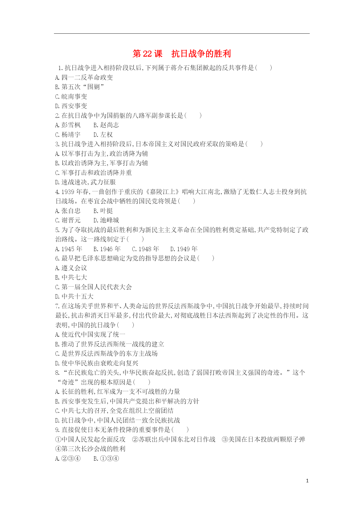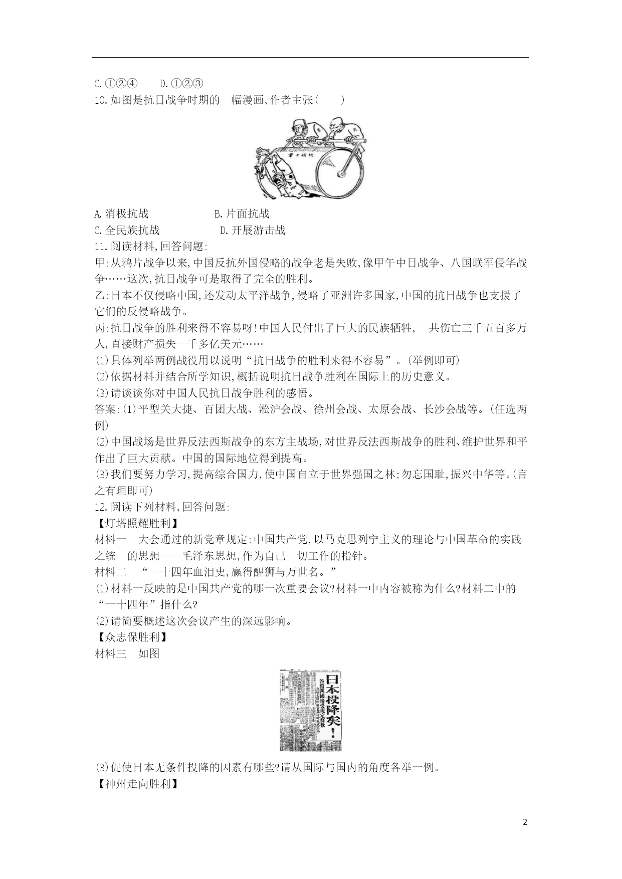 第22课抗日战争的胜利 1.抗日战争进入相持阶段以后,下列属于蒋介石集团掀起的反共事件是() A.四一二反革命政变 B.第五次“围剿” C.皖南事变 D.西安事变 2.在抗日战争中为国捐躯的八路军副参谋长是() A.彭雪枫 B.赵尚志 C.杨靖宇 D.左权 3.抗日战争进入相持阶段后,日本帝国主义对国民政府采取的策略是() A.以军事打击为主,政治诱降为辅 B.以政治诱降为主,军事打击为辅 C.军事打击和政治诱降并重 D.速战速决,武力征服 4.1939年春,一曲创作于重庆的《嘉陵江上》唱响大江南北,激励了无数仁人志士投身到抗日战场。在枣宜会战中牺牲的国民党将领是() A.张自忠 B.叶挺 C.谢晋元 D.池峰城 5.为了夺取抗战的最后胜利和为新民主主义革命在全国的胜利奠定基础,共产党特制定了政治路线。这一路线制定于() A.1945年 B.1946年 C.1948年 D.1949年 6.最早把毛泽东思想确定为党的指导思想的会议是() A.遵义会议 B.中共七大 C.第一届全国人民代表大会 D.中共十五大 7.在这场关乎世界和平、人类命运的世界反法西斯战争中,中国抗日战争开始最早,持续时间最长,抗击和消灭日军最多,付出代价最大,对彻底战胜日本法西斯起到了决定性的作用。这表明,中国的抗日战争() A.使近代中国实现了统一 B.推动了世界反法西斯统一战线的建立 C.是世界反法西斯战争的东方主战场 D.使中华民族由衰败走向复兴 8.“在民族危亡的关头,中华民族奋起反抗,创造了弱国打败帝国主义强国的奇迹。”这个“奇迹”出现的根本原因是() A.长征的胜利,红军成为一支不可战胜的力量 B.西安事变发生后,中国共产党提出和平解决的方针 C.中共七大的召开,全党在组织上空前团结 D.抗日战争中,中国人民团结一致全民族抗战 9.直接促使日本无条件投降的重要事件是() ①中国人民发起全面反攻②苏联出兵中国东北对日作战③美国在日本投放两颗原子弹④第三次长沙会战的胜利 A.②③④ B.①③④ C.①②④ D.①②③ 10.如图是抗日战争时期的一幅漫画,作者主张() A.消极抗战 B.片面抗战 C.全民族抗战 D.开展游击战 11.阅读材料,回答问题: 甲:从鸦片战争以来,中国反抗外国侵略的战争老是失败,像甲午中日战争、八国联军侵华战争……这次,抗日战争可是取得了完全的胜利。 乙:日本不仅侵略中国,还发动太平洋战争,侵略了亚洲许多国家,中国的抗日战争也支援了它们的反侵略战争。 丙:抗日战争的胜利来得不容易呀!中国人民付出了巨大的民族牺牲,一共伤亡三千五百多万人,直接财产损失一千多亿美元…… (1)具体列举两例战役用以说明“抗日战争的胜利来得不容易”。(举例即可) (2)依据材料并结合所学知识,概括说明抗日战争胜利在国际上的历史意义。 (3)请谈谈你对中国人民抗日战争胜利的感悟。 答案:(1)平型关大捷、百团大战、淞沪会战、徐州会战、太原会战、长沙会战等。(任选两例) (2)中国战场是世界反法西斯战争的东方主战场,对世界反法西斯战争的胜利、维护世界和平作出了巨大贡献。中国的国际地位得到提高。 (3)我们要努力学习,提高综合国力,使中国自立于世界强国之林;勿忘国耻,振兴中华等。(言之有理即可) 12.阅读下列材料,回答问题: 【灯塔照耀胜利】 材料一大会通过的新党章规定:中国共产党,以马克思列宁主义的理论与中国革命的实践之统一的思想——毛泽东思想,作为自己一切工作的指针。 材料二“一十四年血泪史,赢得醒狮与万世名。” (1)材料一反映的是中国共产党的哪一次重要会议?材料一中内容被称为什么?材料二中的“一十四年”指什么? (2)请简要概述这次会议产生的深远影响。 【众志保胜利】 材料三如图 (3)促使日本无条件投降的因素有哪些?请从国际与国内的角度各举一例。 【神州走向胜利】 材料四1945年8月21日,《新华日报》发表社论指出“半个世纪的愤怒,五十年的屈辱,在今天这一天宣泄清刷了……” (4)材料四中《新华日报》是在什么历史背景下发表这篇社论的? (5)曾被分离五十年又回到祖国怀抱的是哪一地区? 答案:(1)中共七大。内容:毛泽东思想是中国共产党的指导思想。“一十四年”:十四年抗日战争。 (2)中共七大为争取抗日战争的最后胜利准备了条件,并为中国共产党和中国人民指明了战后的奋斗方向。 (3)国际:美国向日本的广岛、长崎投下两枚原子弹;苏联政府对日本宣战,出兵中国东北,对日本关东军发起进攻。国内:毛泽东发表《对日寇的最后一战》声明,号召中国人民的一切抗日力量举行全国规模的反攻,彻底打败日本侵略者。 (4)抗日战争取得胜利(或日本宣布无条件投降)。 (5)台湾。