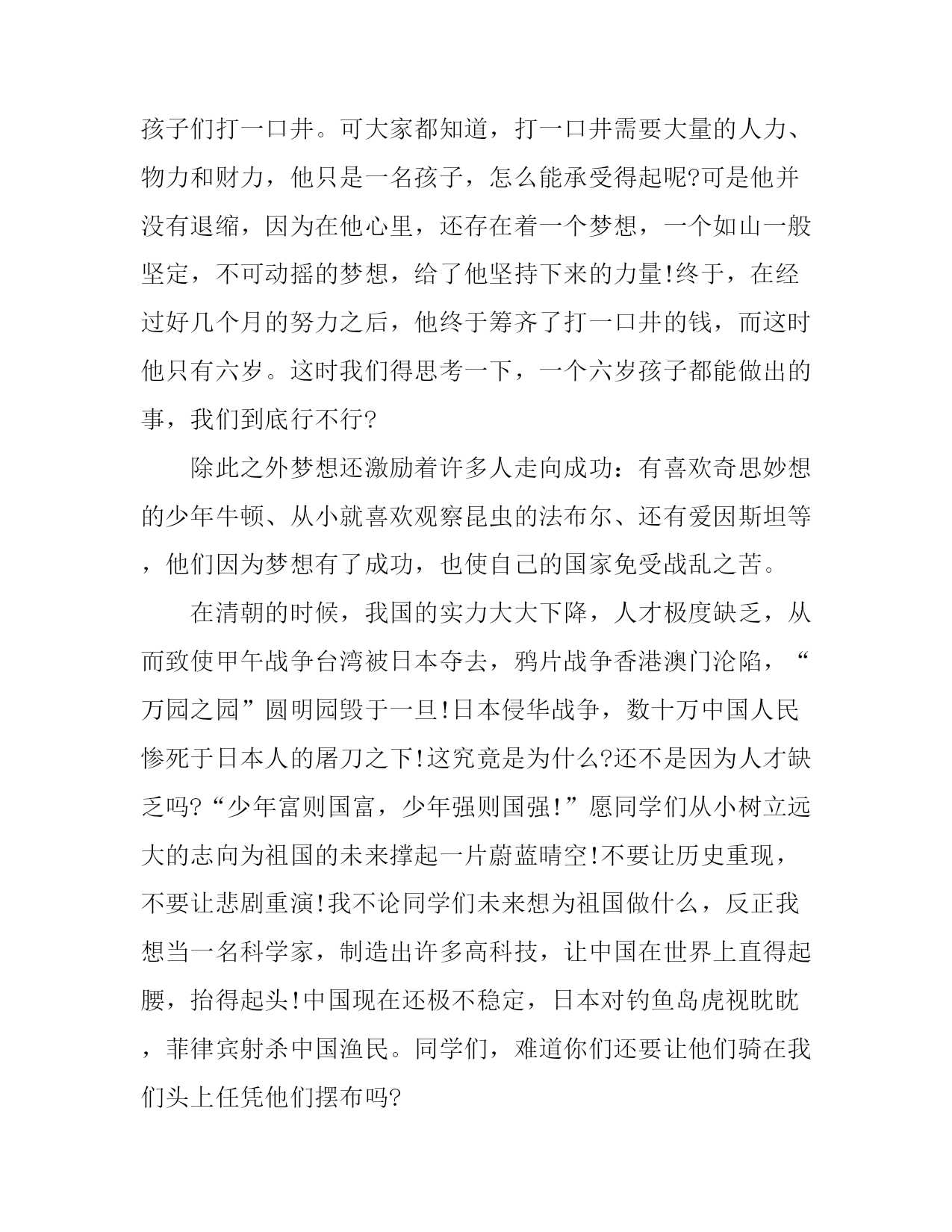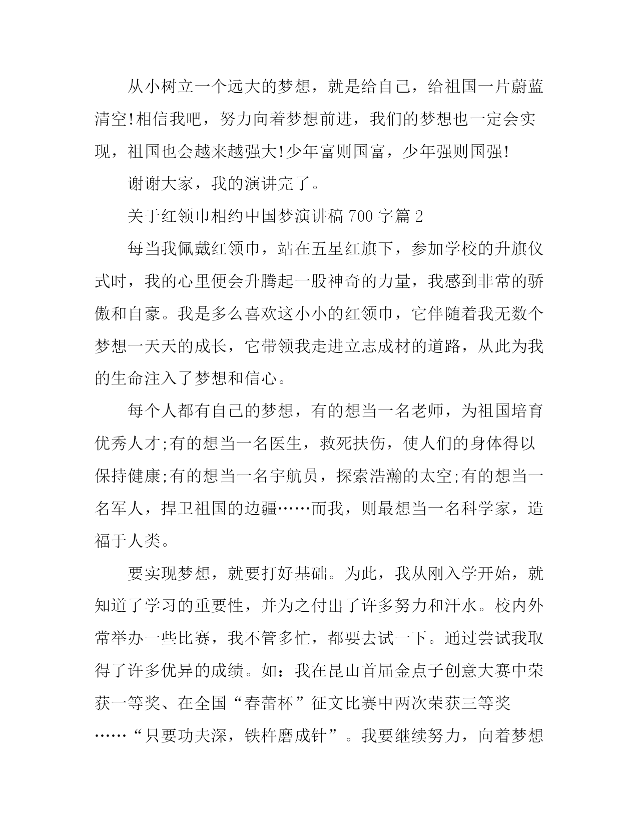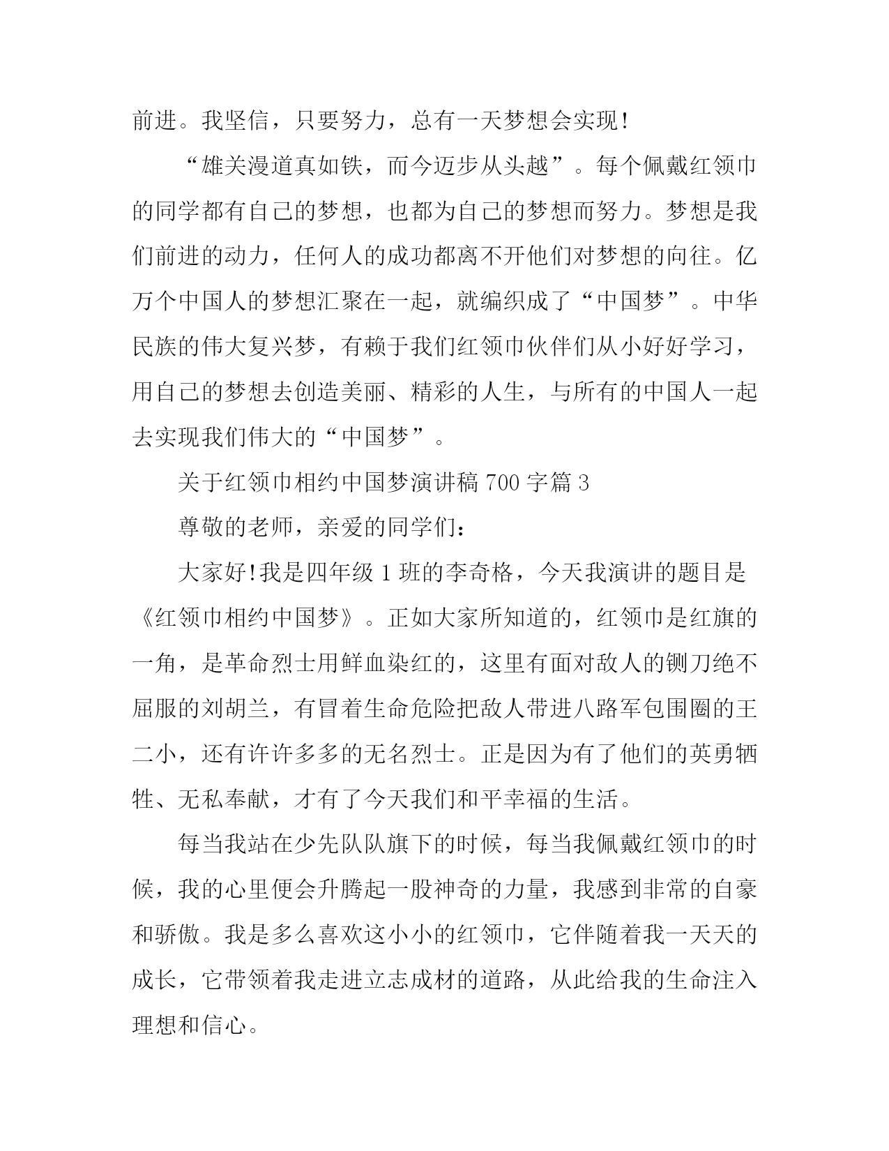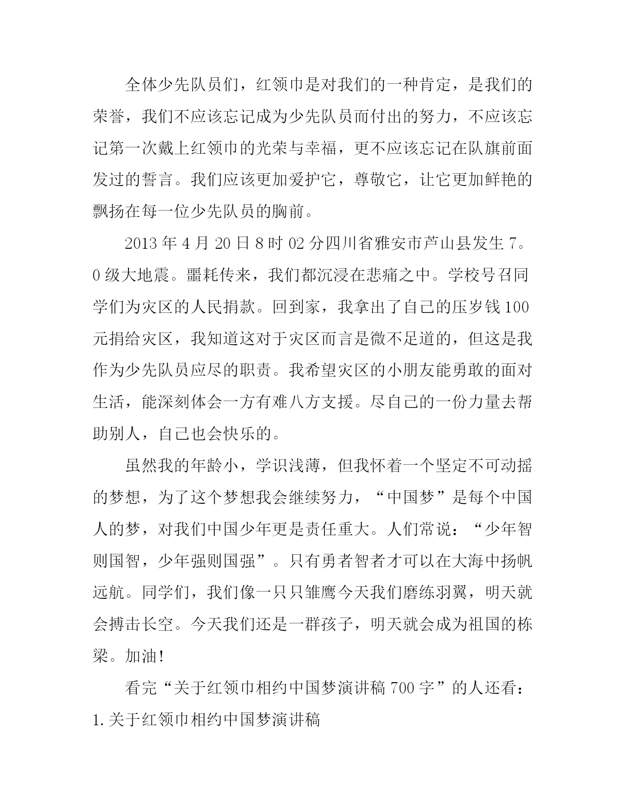 演讲稿是一种运用非常广泛的文体,无论在会议上,还是在演讲比赛上,都能够派的上用场。下面是小编为大家整理了关于红领巾相约中国梦演讲稿700字3篇,欢迎大家阅读。关于红领巾相约中国梦演讲稿700字篇1梦想是山,一座坚定而不可动摇的山;梦想是天,一片辽阔而雄伟的天;梦想是困境中坚持下来的力量,更能在迷茫中指给你努力奋斗的方向。早在战国时期,孟子就说下了这句话:“士贵立志,志不立则无成。”意思是:一个人要从小树立远大的志向,否则他就会一事无成。可见古人就已经对志向的树立非常重视。我国的历史源远流长,分为许多个朝代,宋朝就是一个较为繁荣的朝代。在宋朝,经济繁荣度可谓是前所未有:农业、印刷业、造纸业、丝织业、制瓷业均有重大发展。航海业、造船业成绩突出,海外贸易发达,和南太平洋、中东、非洲、欧洲等地区50多个国家通商,成为经济文化中心。而宋朝的安宁与稳定并不是与生俱来的,而是许许多多精忠报国的将士们用生命换来的,岳飞就是其中一个。岳飞自幼就在背上刻上了“精忠报国”四个大字,他自幼刻苦习文练武,后来投军报国成为一代抗金名将。在加拿大也有一名叫瑞恩的孩子,我想大家也非常熟悉。他有一个远大而看似有点荒唐的梦想,那就是:他要为非洲的孩子们打一口井。可大家都知道,打一口井需要大量的人力、物力和财力,他只是一名孩子,怎么能承受得起呢?可是他并没有退缩,因为在他心里,还存在着一个梦想,一个如山一般坚定,不可动摇的梦想,给了他坚持下来的力量!终于,在经过好几个月的努力之后,他终于筹齐了打一口井的钱,而这时他只有六岁。这时我们得思考一下,一个六岁孩子都能做出的事,我们到底行不行?除此之外梦想还激励着许多人走向成功:有喜欢奇思妙想的少年牛顿、从小就喜欢观察昆虫的法布尔、还有爱因斯坦等,他们因为梦想有了成功,也使自己的国家免受战乱之苦。在清朝的时候,我国的实力大大下降,人才极度缺乏,从而致使甲午战争台湾被日本夺去,鸦片战争香港澳门沦陷,“万园之园”圆明园毁于一旦!日本侵华战争,数十万中国人民惨死于日本人的屠刀之下!这究竟是为什么?还不是因为人才缺乏吗?“少年富则国富,少年强则国强!”愿同学们从小树立远大的志向为祖国的未来撑起一片蔚蓝晴空!不要让历史重现,不要让悲剧重演!我不论同学们未来想为祖国做什么,反正我想当一名科学家,制造出许多高科技,让中国在世界上直得起腰,抬得起头!中国现在还极不稳定,日本对钓鱼岛虎视眈眈,菲律宾射杀中国渔民。同学们,难道你们还要让他们骑在我们头上任凭他们摆布吗?从小树立一个远大的梦想,就是给自己,给祖国一片蔚蓝清空!相信我吧,努力向着梦想前进,我们的梦想也一定会实现,祖国也会越来越强大!少年富则国富,少年强则国强!谢谢大家,我的演讲完了。关于红领巾相约中国梦演讲稿700字篇2每当我佩戴红领巾,站在五星红旗下,参加学校的升旗仪式时,我的心里便会升腾起一股神奇的力量,我感到非常的骄傲和自豪。我是多么喜欢这小小的红领巾,它伴随着我无数个梦想一天天的成长,它带领我走进立志成材的道路,从此为我的生命注入了梦想和信心。每个人都有自己的梦想,有的想当一名老师,为祖国培育优秀人才;有的想当一名医生,救死扶伤,使人们的身体得以保持健康;有的想当一名宇航员,探索浩瀚的太空;有的想当一名军人,捍卫祖国的边疆……而我,则最想当一名科学家,造福于人类。要实现梦想,就要打好基础。为此,我从刚入学开始,就知道了学习的重要性,并为之付出了许多努力和汗水。校内外常举办一些比赛,我不管多忙,都要去试一下。通过尝试我取得了许多优异的成绩。如:我在昆山首届金点子创意大赛中荣获一等奖、在全国“春蕾杯”征文比赛中两次荣获三等奖……“只要功夫深,铁杵磨成针”。我要继续努力,向着梦想前进。我坚信,只要努力,总有一天梦想会实现!“雄关漫道真如铁,而今迈步从头越”。每个佩戴红领巾的同学都有自己的梦想,也都为自己的梦想而努力。梦想是我们前进的动力,任何人的成功都离不开他们对梦想的向往。亿万个中国人的梦想汇聚在一起,就编织成了“中国梦”。中华民族的伟大复兴梦,有赖于我们红领巾伙伴们从小好好学习,用自己的梦想去创造美丽、精彩的人生,与所有的中国人一起去实现我们伟大的“中国梦”。关于红领巾相约中国梦演讲稿700字篇3尊敬的老师,亲爱的同学们:大家好!我是四年级1班的李奇格,今天我演讲的题目是《红领巾相约中国梦》。正如大家所知道的,红领巾是红旗的一角,是革命烈士用鲜血染红的,这里有面对敌人的铡刀绝不屈服的刘胡兰,有冒着生命危险把敌人带进八路军包围圈的王二小,还有许许多多的无名烈士。正是因为有了他们的英勇牺牲、无私奉献,才有了今天我们和平幸福的生活。每当我站在少先队队旗下的时候,每当我佩戴红领巾的时候,我的心里便会升腾起一股神奇的力量,我感到非常的自豪和骄傲。我是多么喜欢这小小的红领巾,它伴随着我一