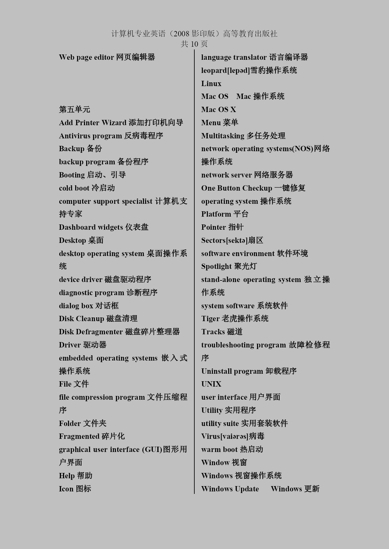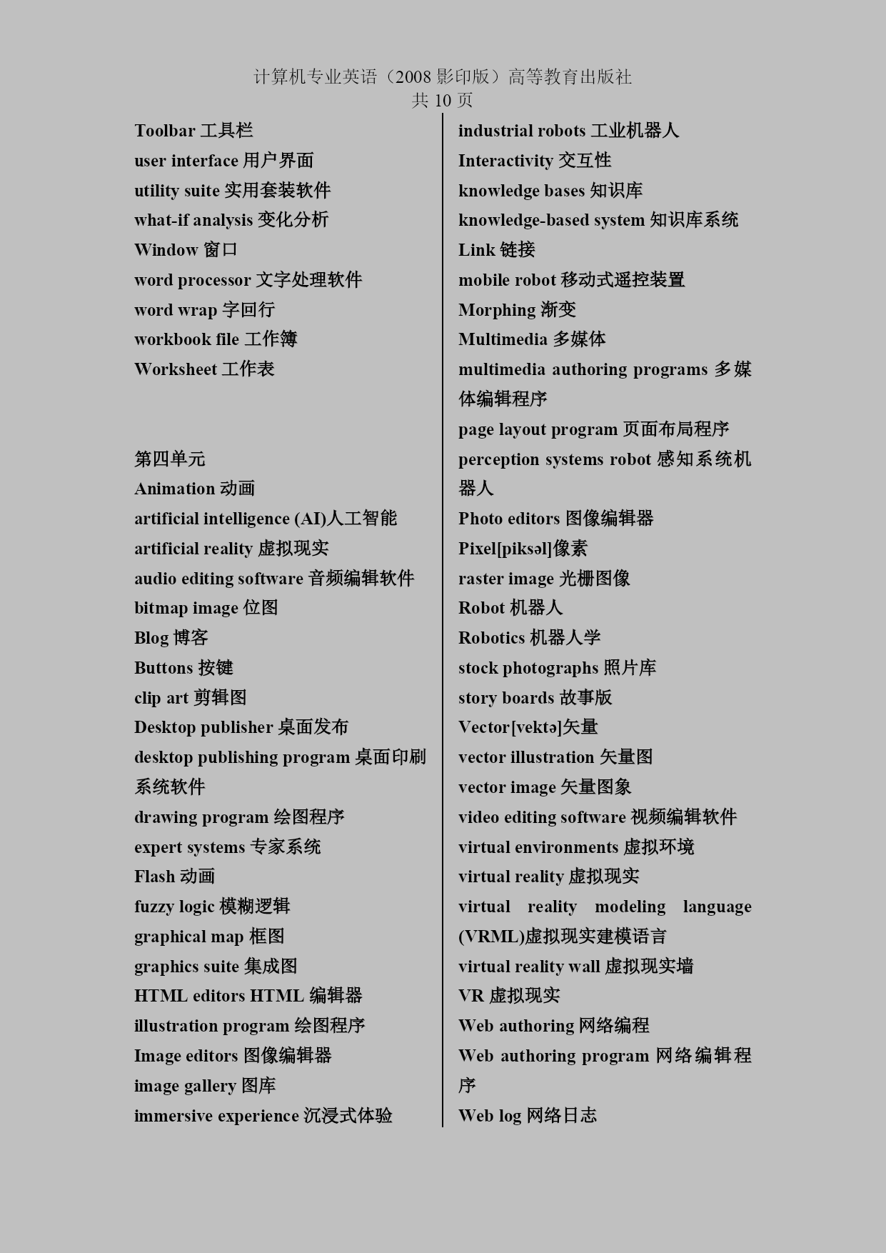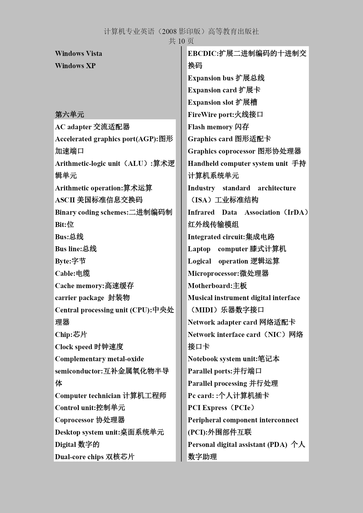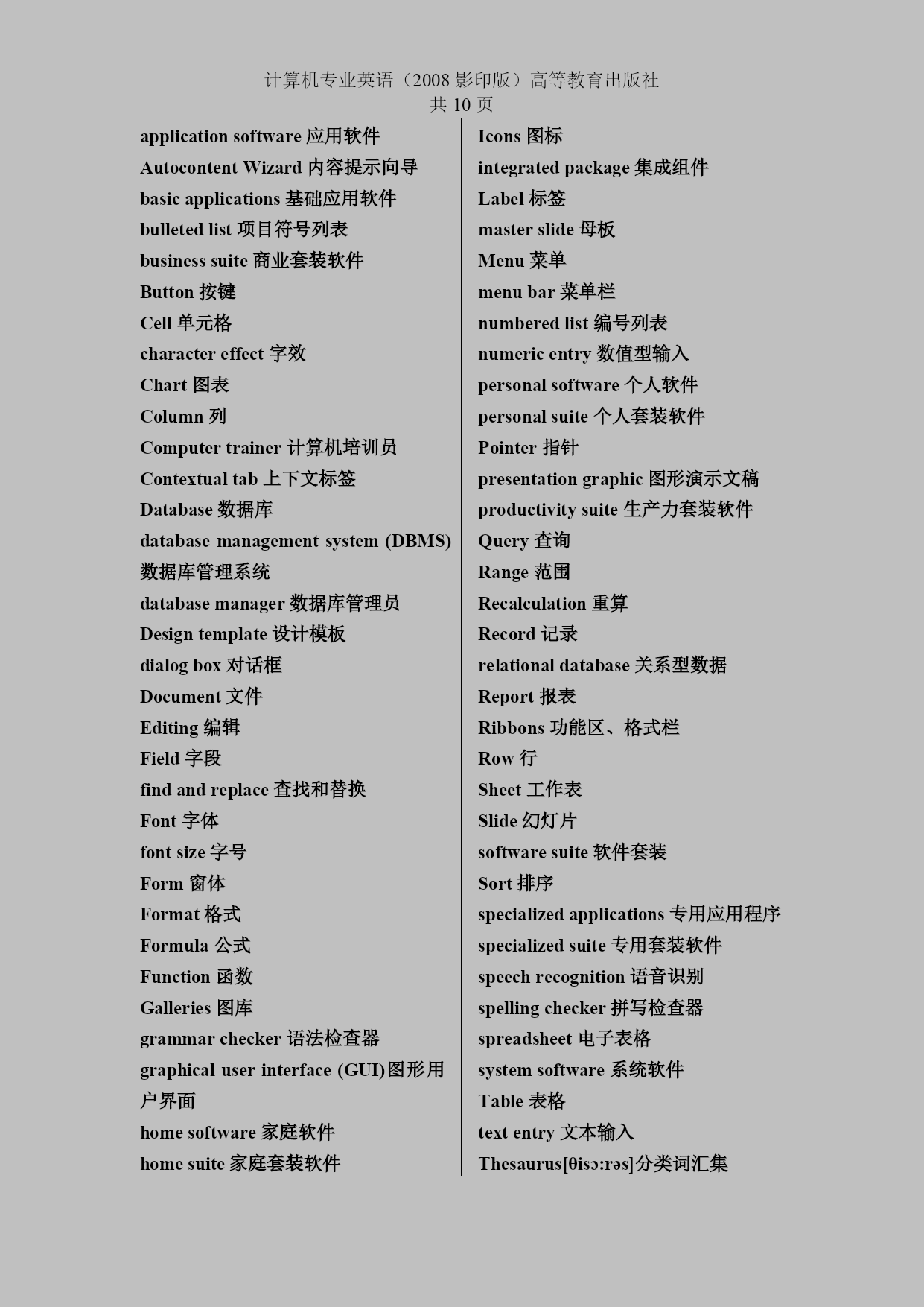 计算机专业英语(2008影印版)高等教育出版社 KEYTERMS 第一单元 applicationsoftware应用软件 basicapplication基本应用软件 communicationdevice通信设备 compactdisc(CD)光盘 computercompetency计算机能力 Connectivity连通性 Data数据 databasefile数据库文件 desktopcomputer台式计算机 devicedriver磁盘驱动程序 digitalversatiledisc(DVD)数字多用途光盘 digitalvideodisc(DVD)数字多用途光盘 documentfile文档文件 enduser终端用户 floppydisk软盘 handheldcomputer手持计算机 harddisk硬盘 Hardware硬件 Highdefinition高清 Information信息 informationsystem信息系统 informationtechnology信息技术 inputdevice输入设备 Internet因特网 Keyboard键盘 mainframecomputer大型机 Memory内存 Microcomputer微型机 Microprocessor微处理器 midrangecomputer中型机 Minicomputer小型计算机 Modem调制解调器 Monitor监视器 Mouse鼠标 Network网络 notebookcomputer笔记本电脑 operatingsystem操作系统 opticaldisk光盘 outputdevice输出设备 palmcomputer掌上电脑 People personaldigitalassistant(PDA)个人数字助理 presentationfile演示文稿 primarystorage主存 Printer打印机 Procedure规程 Program程序 randomaccessmemory随机存储器 secondarystoragedevice辅存 Software软件 specializedapplication专门应用软件 Supercomputer巨型机 systemsoftware系统软件 systemunit系统单元 tabletPC平板电脑 Utility实用程序 wirelessrevolution无线革命 worksheetfile工作表 第三单元 analyticalgraph分析图 applicationsoftware应用软件 AutocontentWizard内容提示向导 basicapplications基础应用软件 bulletedlist项目符号列表 businesssuite商业套装软件 Button按键 Cell单元格 charactereffect字效 Chart图表 Column列 Computertrainer计算机培训员 Contextualtab上下文标签 Database数据库 databasemanagementsystem(DBMS)数据库管理系统 databasemanager数据库管理员 Designtemplate设计模板 dialogbox对话框 Document文件 Editing编辑 Field字段 findandreplace查找和替换 Font字体 fontsize字号 Form窗体 Format格式 Formula公式 Function函数 Galleries图库 grammarchecker语法检查器 graphicaluserinterface(GUI)图形用户界面 homesoftware家庭软件 homesuite家庭套装软件 Icons图标 integratedpackage集成组件 Label标签 masterslide母板 Menu菜单 menubar菜单栏 numberedlist编号列表 numericentry数值型输入 personalsoftware个人软件 personalsuite个人套装软件 Pointer指针 presentationgraphic图形演示文稿 productivitysuite生产力套装软件 Query查询 Range范围 Recalculation重算 Record记录 relationaldatabase关系型数据 Report报表 Ribbons功能区、格式栏 Row行 Sheet工作表 Slide幻灯片 softwaresuite软件套装 Sort排序 specializedapplications专用应用程序 specializedsuite专用套装软件 speechrecognit