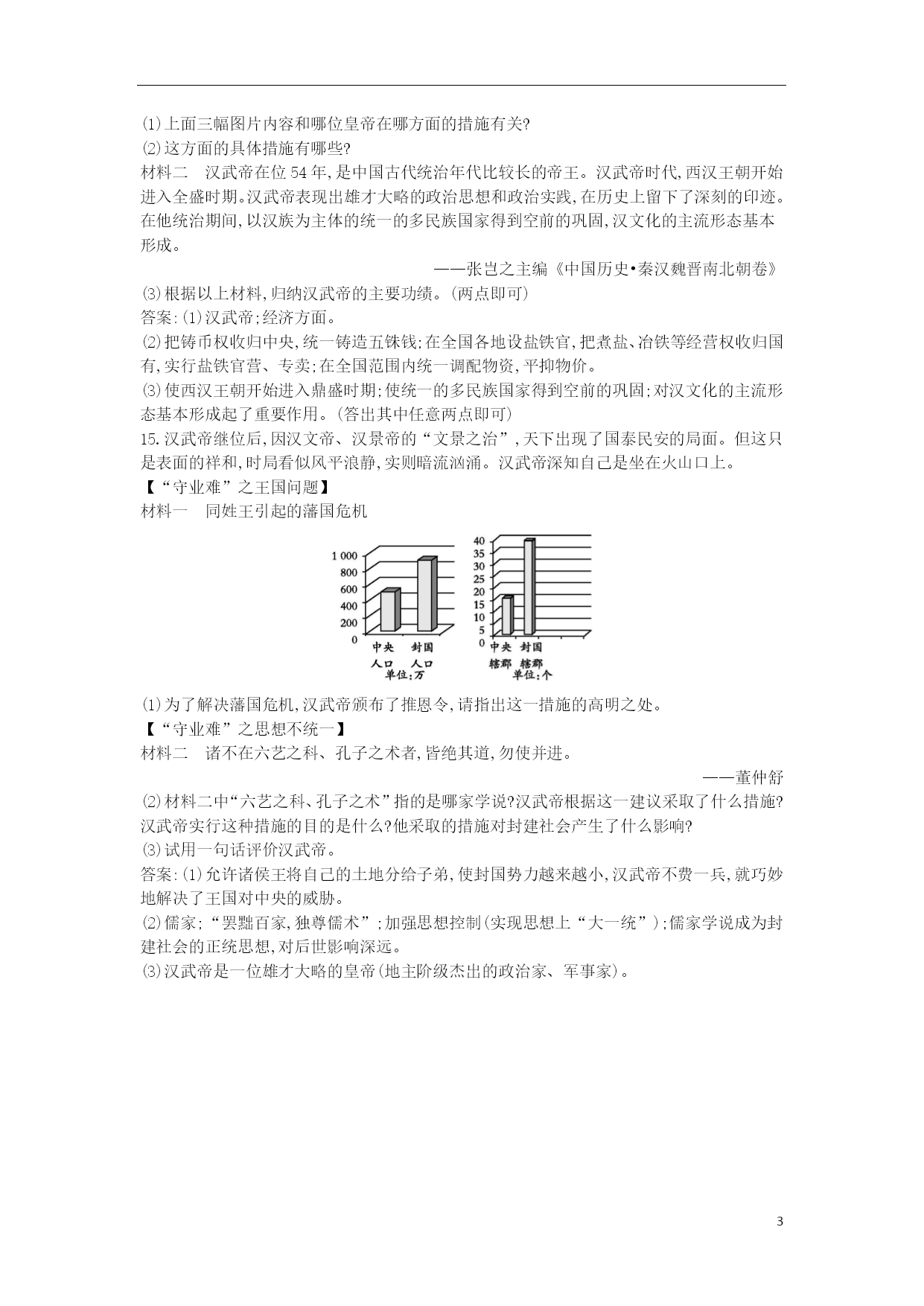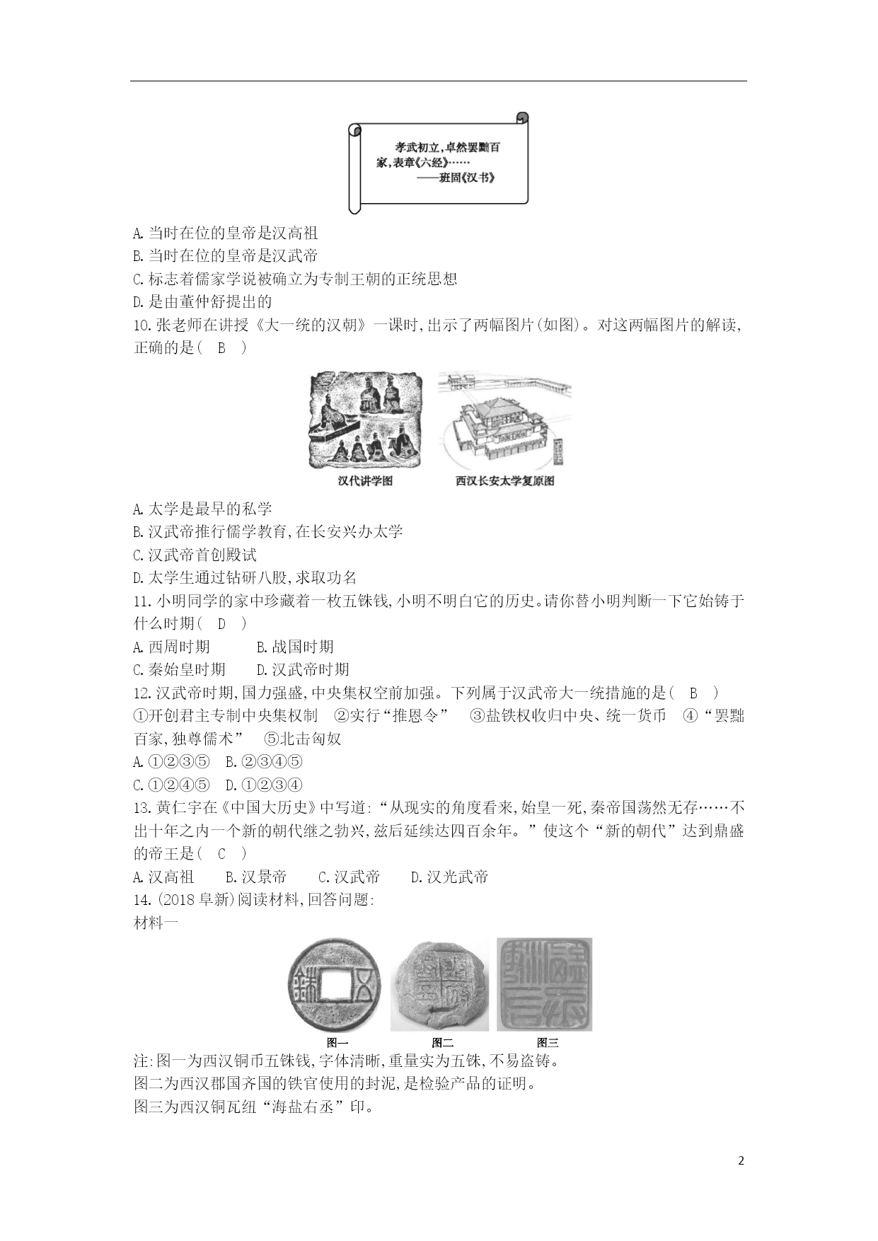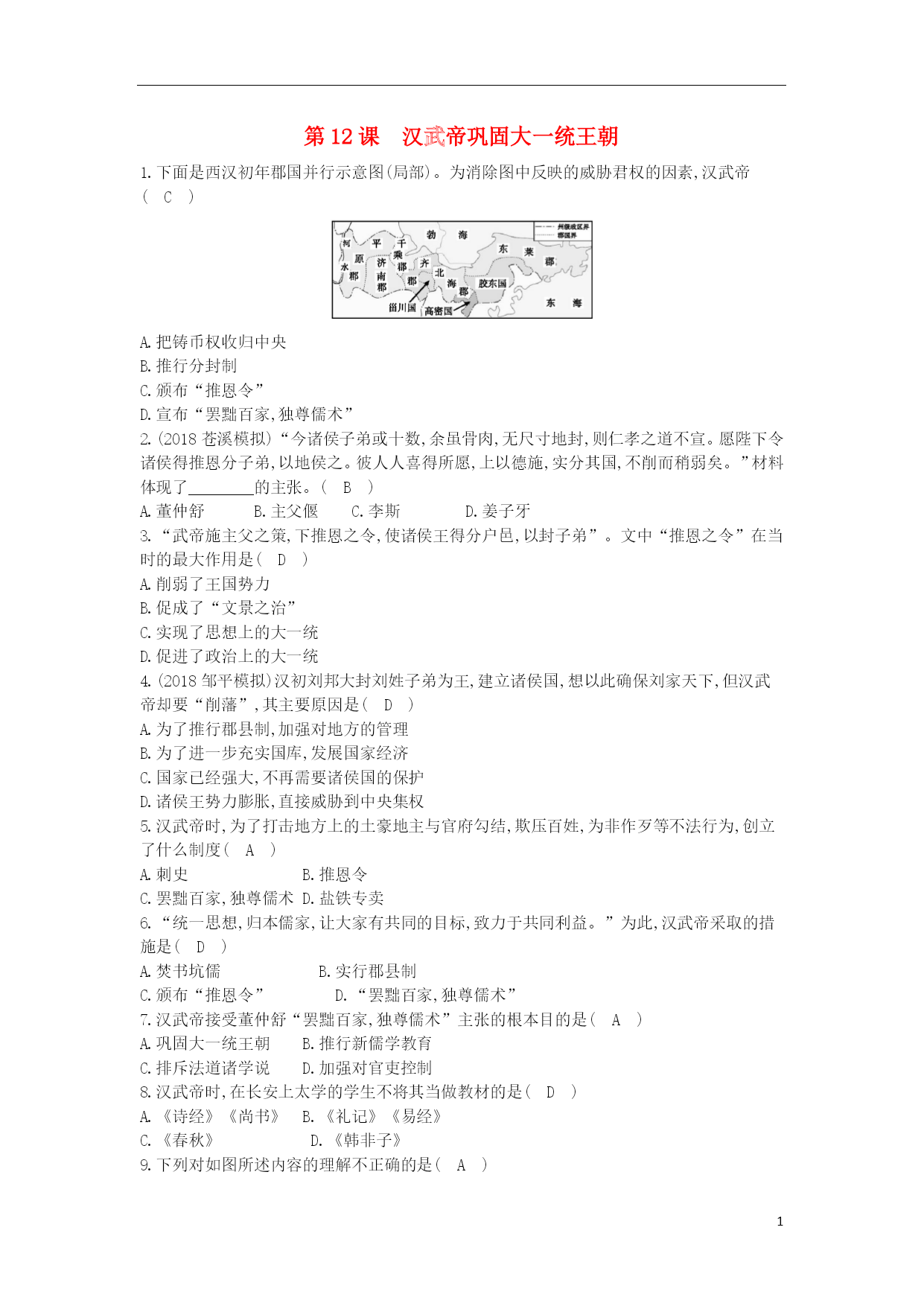 第12课汉武帝巩固大一统王朝 1.下面是西汉初年郡国并行示意图(局部)。为消除图中反映的威胁君权的因素,汉武帝(C) A.把铸币权收归中央 B.推行分封制 C.颁布“推恩令” D.宣布“罢黜百家,独尊儒术” 2.(2018苍溪模拟)“今诸侯子弟或十数,余虽骨肉,无尺寸地封,则仁孝之道不宣。愿陛下令诸侯得推恩分子弟,以地侯之。彼人人喜得所愿,上以德施,实分其国,不削而稍弱矣。”材料体现了的主张。(B) A.董仲舒 B.主父偃 C.李斯 D.姜子牙 3.“武帝施主父之策,下推恩之令,使诸侯王得分户邑,以封子弟”。文中“推恩之令”在当时的最大作用是(D) A.削弱了王国势力 B.促成了“文景之治” C.实现了思想上的大一统 D.促进了政治上的大一统 4.(2018邹平模拟)汉初刘邦大封刘姓子弟为王,建立诸侯国,想以此确保刘家天下,但汉武帝却要“削藩”,其主要原因是(D) A.为了推行郡县制,加强对地方的管理 B.为了进一步充实国库,发展国家经济 C.国家已经强大,不再需要诸侯国的保护 D.诸侯王势力膨胀,直接威胁到中央集权 5.汉武帝时,为了打击地方上的土豪地主与官府勾结,欺压百姓,为非作歹等不法行为,创立了什么制度(A) A.刺史 B.推恩令 C.罢黜百家,独尊儒术 D.盐铁专卖 6.“统一思想,归本儒家,让大家有共同的目标,致力于共同利益。”为此,汉武帝采取的措施是(D) A.焚书坑儒 B.实行郡县制 C.颁布“推恩令” D.“罢黜百家,独尊儒术” 7.汉武帝接受董仲舒“罢黜百家,独尊儒术”主张的根本目的是(A) A.巩固大一统王朝 B.推行新儒学教育 C.排斥法道诸学说 D.加强对官吏控制 8.汉武帝时,在长安上太学的学生不将其当做教材的是(D) A.《诗经》《尚书》 B.《礼记》《易经》 C.《春秋》 D.《韩非子》 9.下列对如图所述内容的理解不正确的是(A) A.当时在位的皇帝是汉高祖 B.当时在位的皇帝是汉武帝 C.标志着儒家学说被确立为专制王朝的正统思想 D.是由董仲舒提出的 10.张老师在讲授《大一统的汉朝》一课时,出示了两幅图片(如图)。对这两幅图片的解读,正确的是(B) A.太学是最早的私学 B.汉武帝推行儒学教育,在长安兴办太学 C.汉武帝首创殿试 D.太学生通过钻研八股,求取功名 11.小明同学的家中珍藏着一枚五铢钱,小明不明白它的历史。请你替小明判断一下它始铸于什么时期(D) A.西周时期 B.战国时期 C.秦始皇时期 D.汉武帝时期 12.汉武帝时期,国力强盛,中央集权空前加强。下列属于汉武帝大一统措施的是(B) ①开创君主专制中央集权制②实行“推恩令”③盐铁权收归中央、统一货币④“罢黜百家,独尊儒术”⑤北击匈奴 A.①②③⑤ B.②③④⑤ C.①②④⑤ D.①②③④ 13.黄仁宇在《中国大历史》中写道:“从现实的角度看来,始皇一死,秦帝国荡然无存……不出十年之内一个新的朝代继之勃兴,兹后延续达四百余年。”使这个“新的朝代”达到鼎盛的帝王是(C) A.汉高祖 B.汉景帝 C.汉武帝 D.汉光武帝 14.(2018阜新)阅读材料,回答问题: 材料一 注:图一为西汉铜币五铢钱,字体清晰,重量实为五铢,不易盗铸。 图二为西汉郡国齐国的铁官使用的封泥,是检验产品的证明。 图三为西汉铜瓦纽“海盐右丞”印。 (1)上面三幅图片内容和哪位皇帝在哪方面的措施有关? (2)这方面的具体措施有哪些? 材料二汉武帝在位54年,是中国古代统治年代比较长的帝王。汉武帝时代,西汉王朝开始进入全盛时期。汉武帝表现出雄才大略的政治思想和政治实践,在历史上留下了深刻的印迹。在他统治期间,以汉族为主体的统一的多民族国家得到空前的巩固,汉文化的主流形态基本形成。 ——张岂之主编《中国历史•秦汉魏晋南北朝卷》 (3)根据以上材料,归纳汉武帝的主要功绩。(两点即可) 答案:(1)汉武帝;经济方面。 (2)把铸币权收归中央,统一铸造五铢钱;在全国各地设盐铁官,把煮盐、冶铁等经营权收归国有,实行盐铁官营、专卖;在全国范围内统一调配物资,平抑物价。 (3)使西汉王朝开始进入鼎盛时期;使统一的多民族国家得到空前的巩固;对汉文化的主流形态基本形成起了重要作用。(答出其中任意两点即可) 15.汉武帝继位后,因汉文帝、汉景帝的“文景之治”,天下出现了国泰民安的局面。但这只是表面的祥和,时局看似风平浪静,实则暗流汹涌。汉武帝深知自己是坐在火山口上。 【“守业难”之王国问题】 材料一同姓王引起的藩国危机 (1)为了解决藩国危机,汉武帝颁布了推恩令,请指出这一措施的高明之处。 【“守业难”之思想不统一】 材料二诸不在六艺之科、孔子之术者,皆绝其道,勿使并进。 ——董仲舒 (2)材料二中“六艺之科、孔子之术”指的是哪家学说?汉武帝根