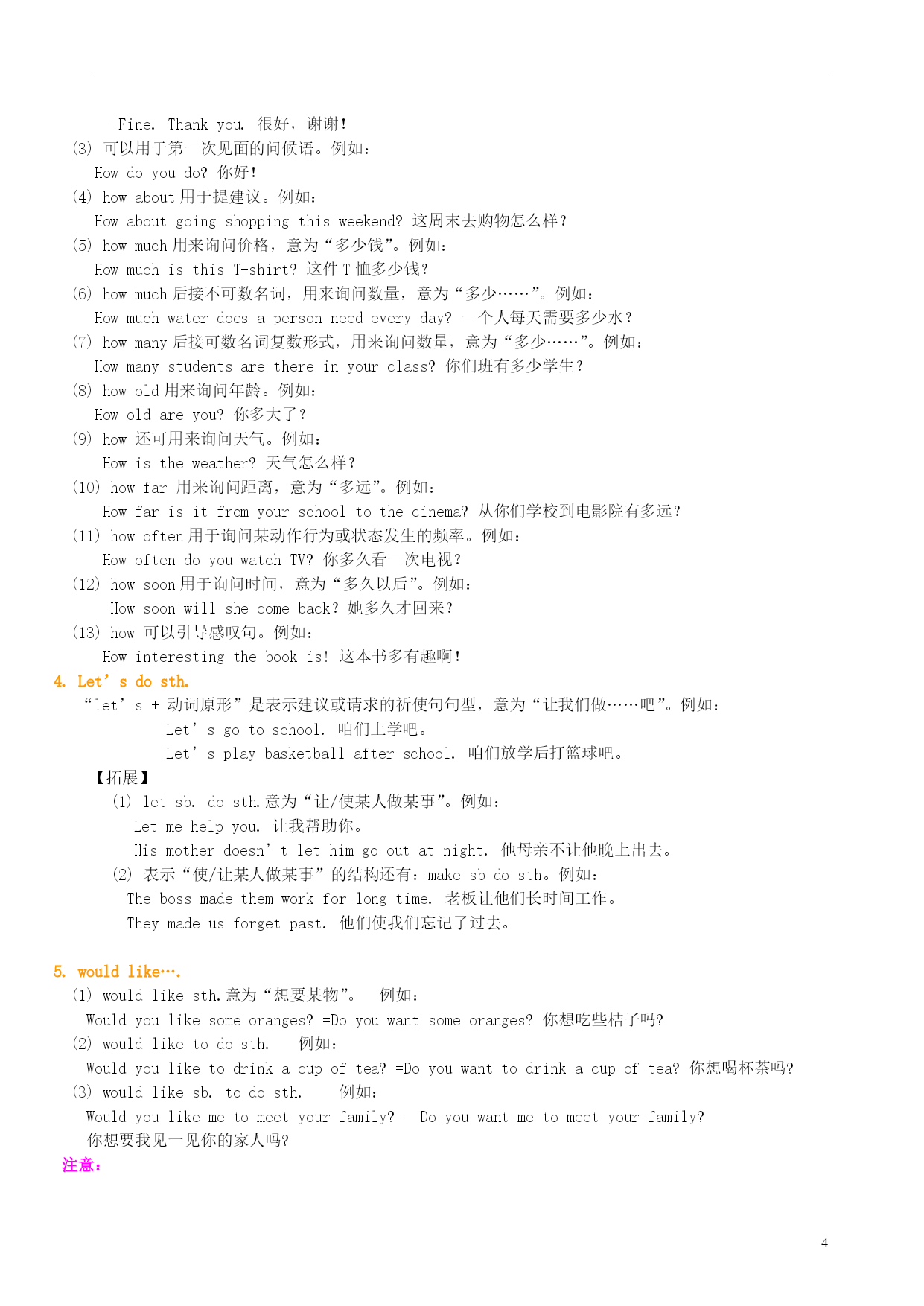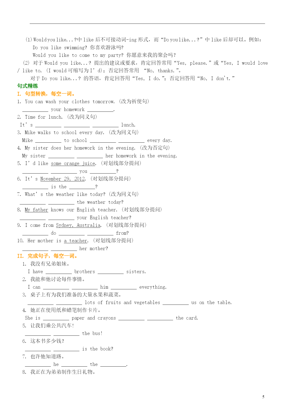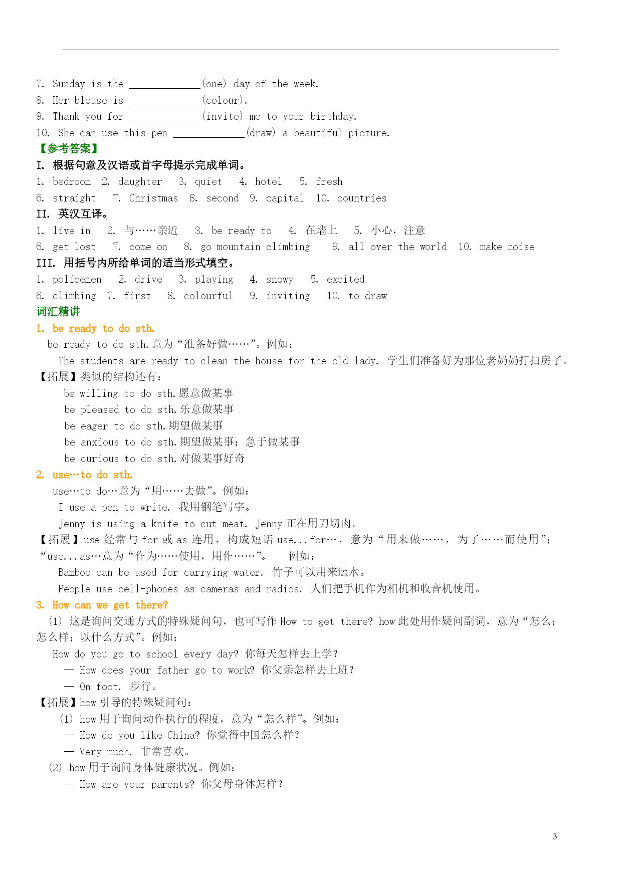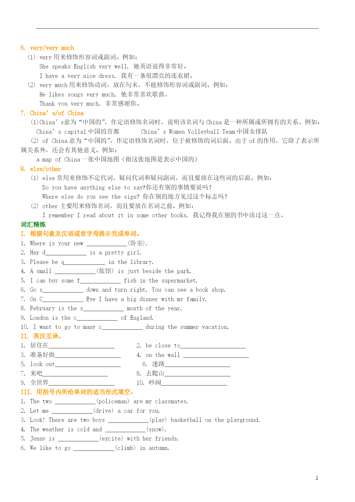 ReviewofUnits5-8 词句精讲精练 词汇精讲 1.family/home/house (1)family意为“家,家庭”,强调家庭或家庭中的每个成员,不包括房屋。例如: Ilovemyfamily.我爱我家。 ThewholefamilywillspendtheirholidayinHainan.这一家人将在海南度假。 (2)home意为“家,家乡”,强调家庭成员居住的环境或气氛,有时也可指出生的城市或国家,而不能指人。例如: Ihavetostayathomealonetonight.今晚我不得不一个人待在家里。 Mr.Li’shomeisinBeijing.李先生的家在北京。 (3)house意为“房子,房屋”,侧重指住所(即建筑物),表示地点。例如: Therearelotsoftreesinfrontofmyhouse.我家前面有许多树。 2.workhard/hardwork (1)workhard属于动词短语,意为“努力工作/学习”,在句中充当谓语,其中hard为副词。例如: Wemustworkhardatallourlessons.我们必须努力学习所有课程。 (2)hardwork是名词短语,意为“艰苦的工作”,在句中可作主语、宾语或表语等,hard为形容词。例如: It’sreallyhardworktoplanttreeonthemountain.在山上种树真是艰苦的工作。 3.onthewall/inthewall (1)onthewall指在墙的表面,如墙上的画、地图等。例如: Thereisamapoftheworldonthewall.墙上有一张世界地图。 Thebeautifulpictureisonthewall.那张漂亮的画在墙上。 (2)inthewall指某物在墙的内部,如窗户、洞等。例如: Therearetwowindowsinthewall.墙上有两扇窗户。 4.sound/noise/voice (1)sound可以指人或动物发出的声音,或物体碰撞的声音。这个词的使用范围很大。可以说,大自然的任何“声音”都可以用sound。例如: Lighttravelsmuchfasterthansound.光的传播速度比声音快得多。 (2)noise意为“噪音”、“喧闹声”,常指不悦耳、不和谐的嘈杂声。例如: Don’tmakeanynoise!别吵闹! Thenoisewakesmeup.噪音吵醒了我! (3)voice一般指人的声音,说话、唱歌、谈笑都可用voice。sound和noise不仅能指人的声音,还可以表示别的动物发出的声音,而voice除了有时可指鸟的声音外,很少表示其它动物的声音。例如: Thegirlhasabeautifulvoice.那女孩嗓音很美。 Theyaretalkinginlowvoices.他们正小声交谈。 Whentheteachercameintotheclassroom,ourmonitorspokeinaloudvoice,“Standup!” 老师走进教室时,班长大声喊:“起立!” 5.findout/find/lookfor 这一组词均有“寻找,找”的含义。find强调找的结果,表示“找到”;findout强调经过仔细调查、分析,表示“弄清楚,弄明白”;lookfor强调找的动作,表示“寻找”。例如: Timislookingforhislittledog.Tim正在找他的小狗。 Iwanttofindoutwhattimethetrainleaves.我想弄清楚火车几点钟出发。 Ifoundthedogthere.我发现那只狗在那里。 6.very/verymuch (1)very用来修饰形容词或副词。例如: ShespeaksEnglishverywell.她英语说得非常好。 Ihaveaverynicedress.我有一条很漂亮的连衣裙。 (2)verymuch用来修饰动词,放在句末,不能修饰形容词或副词。例如: Helikessongsverymuch.他非常喜欢歌曲。 Thankyouverymuch.非常感谢你。 7.China’s/ofChina (1)China’s意为“中国的”,作定语修饰名词时,说明该名词与China是一种所属或所拥有的关系。例如: China’scapital中国的首都China’sWomenVolleyballTeam中国女排队 (2)ofChina意为“中国的”,作定语修饰名词时,位于被修饰的词后面。由于of的作用,它除了表示所属关系外,还会有其他意义。例如: amapofChina一张中国地图(指这张地图是表示中国的) 8.else/other (1)else常用来修饰不定代