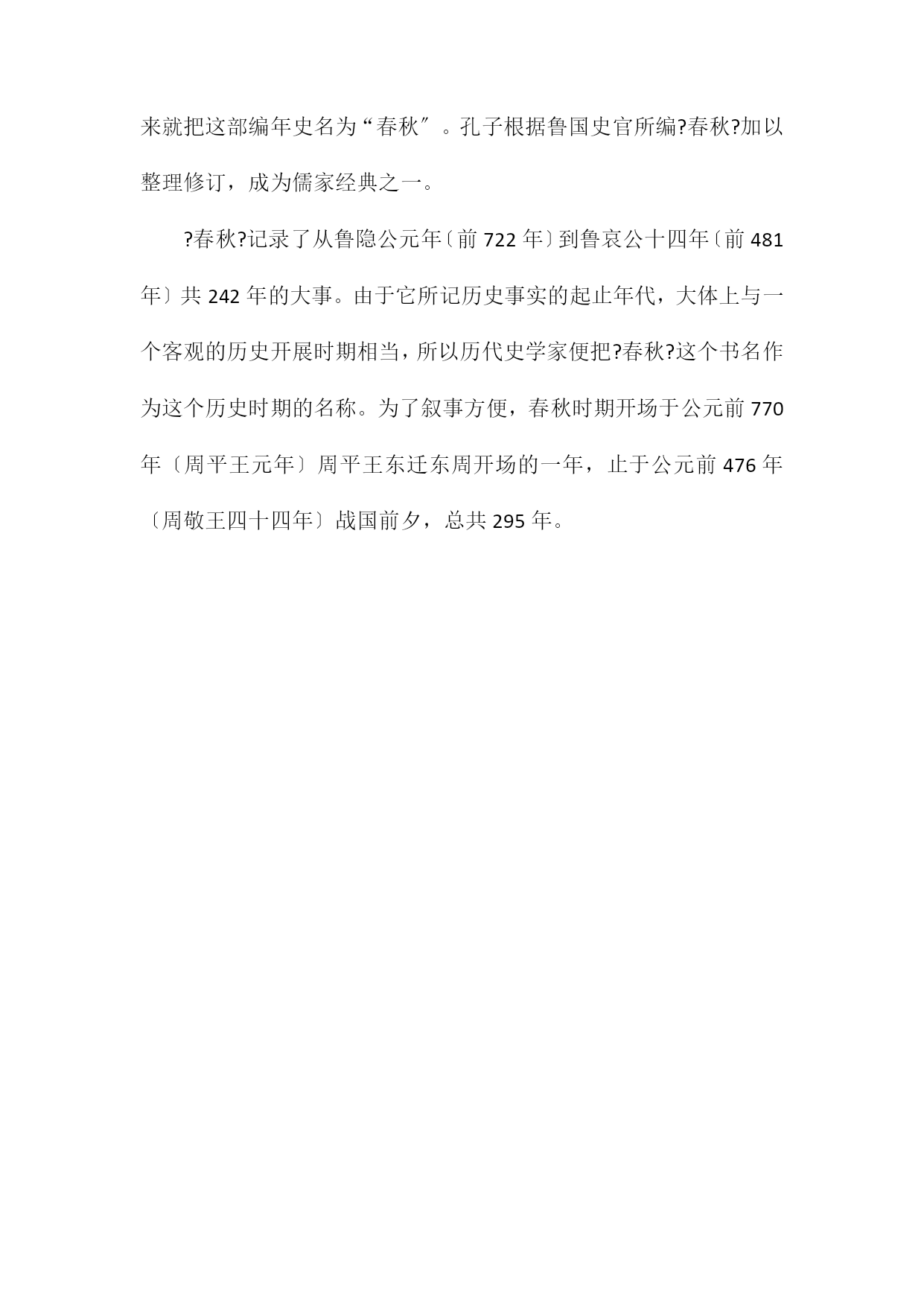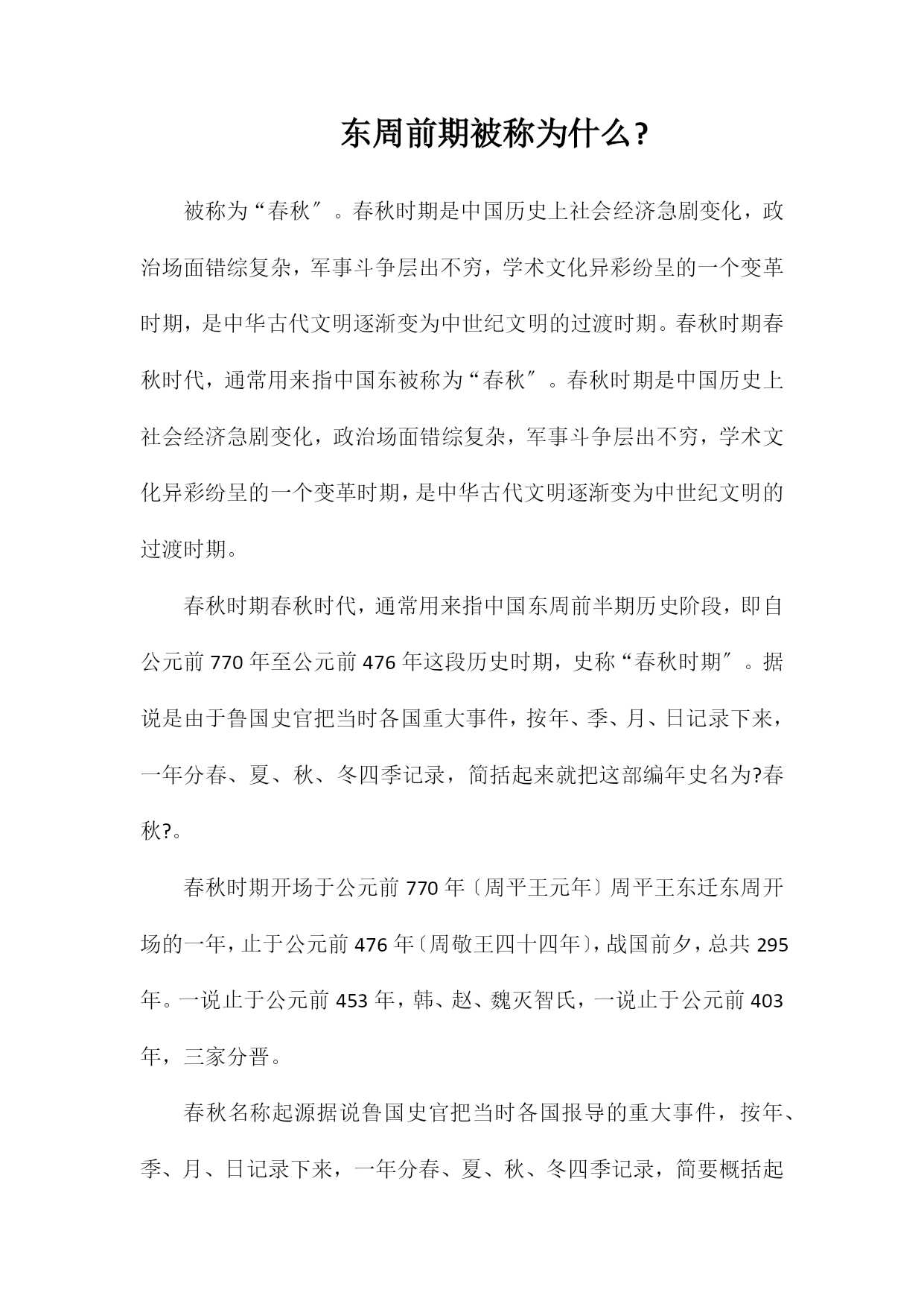 东周前期被称为什么? 被称为“春秋〞。春秋时期是中国历史上社会经济急剧变化,政治场面错综复杂,军事斗争层出不穷,学术文化异彩纷呈的一个变革时期,是中华古代文明逐渐变为中世纪文明的过渡时期。春秋时期春秋时代,通常用来指中国东被称为“春秋〞。春秋时期是中国历史上社会经济急剧变化,政治场面错综复杂,军事斗争层出不穷,学术文化异彩纷呈的一个变革时期,是中华古代文明逐渐变为中世纪文明的过渡时期。 春秋时期春秋时代,通常用来指中国东周前半期历史阶段,即自公元前770年至公元前476年这段历史时期,史称“春秋时期〞。据说是由于鲁国史官把当时各国重大事件,按年、季、月、日记录下来,一年分春、夏、秋、冬四季记录,简括起来就把这部编年史名为?春秋?。 春秋时期开场于公元前770年〔周平王元年〕周平王东迁东周开场的一年,止于公元前476年〔周敬王四十四年〕,战国前夕,总共295年。一说止于公元前453年,韩、赵、魏灭智氏,一说止于公元前403年,三家分晋。 春秋名称起源据说鲁国史官把当时各国报导的重大事件,按年、季、月、日记录下来,一年分春、夏、秋、冬四季记录,简要概括起来就把这部编年史名为“春秋〞。孔子根据鲁国史官所编?春秋?加以整理修订,成为儒家经典之一。 ?春秋?记录了从鲁隐公元年〔前722年〕到鲁哀公十四年〔前481年〕共242年的大事。由于它所记历史事实的起止年代,大体上与一个客观的历史开展时期相当,所以历代史学家便把?春秋?这个书名作为这个历史时期的名称。为了叙事方便,春秋时期开场于公元前770年〔周平王元年〕周平王东迁东周开场的一年,止于公元前476年〔周敬王四十四年〕战国前夕,总共295年。