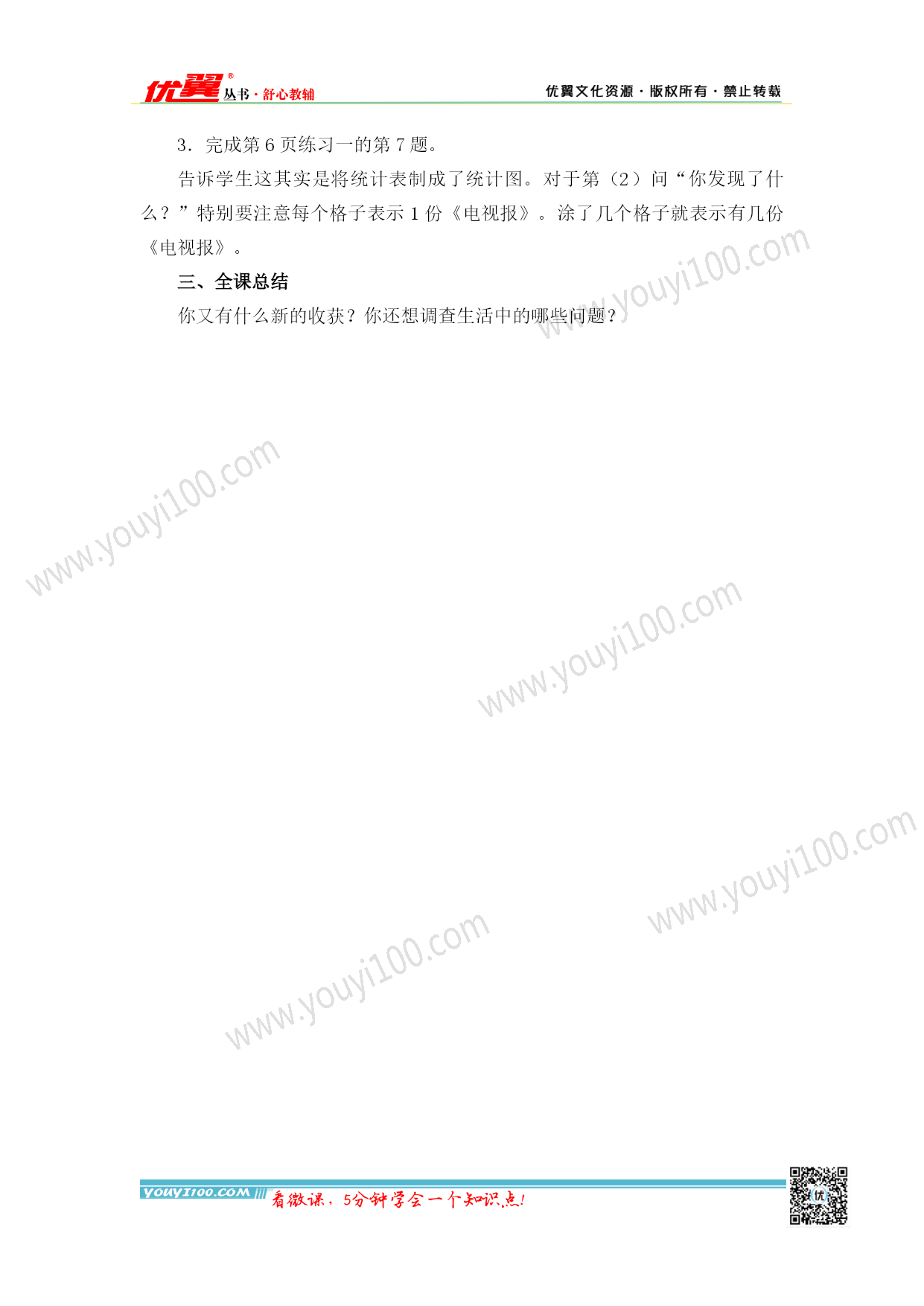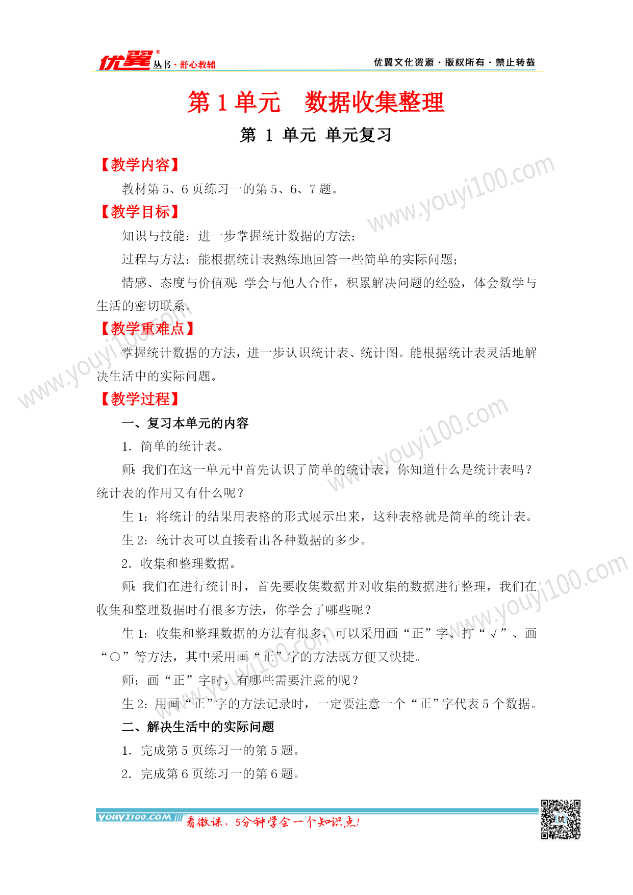第1单元数据收集整理 第1单元单元复习 【教学内容】 教材第5、6页练习一的第5、6、7题。 【教学目标】 知识与技能:进一步掌握统计数据的方法; 过程与方法:能根据统计表熟练地回答一些简单的实际问题; 情感、态度与价值观:学会与他人合作,积累解决问题的经验,体会数学与生活的密切联系。 【教学重难点】 掌握统计数据的方法,进一步认识统计表、统计图。能根据统计表灵活地解决生活中的实际问题。 【教学过程】 一、复习本单元的内容 1.简单的统计表。 师:我们在这一单元中首先认识了简单的统计表,你知道什么是统计表吗?统计表的作用又有什么呢? 生1:将统计的结果用表格的形式展示出来,这种表格就是简单的统计表。 生2:统计表可以直接看出各种数据的多少。 2.收集和整理数据。 师:我们在进行统计时,首先要收集数据并对收集的数据进行整理,我们在收集和整理数据时有很多方法,你学会了哪些呢? 生1:收集和整理数据的方法有很多,可以采用画“正”字、打“√”、画“○”等方法,其中采用画“正”字的方法既方便又快捷。 师:画“正”字时,有哪些需要注意的呢? 生2:用画“正”字的方法记录时,一定要注意一个“正”字代表5个数据。 二、解决生活中的实际问题 1.完成练习一的第5题。 2.完成练习一的第6题。 3.完成练习一的第7题。 告诉学生这其实是将统计表制成了统计图。对于第(2)问“你发现了什么?”特别要注意每个格子表示1份《电视报》。涂了几个格子就表示有几份《电视报》。 三、全课总结 你又有什么新的收获?你还想调查生活中的哪些问题?