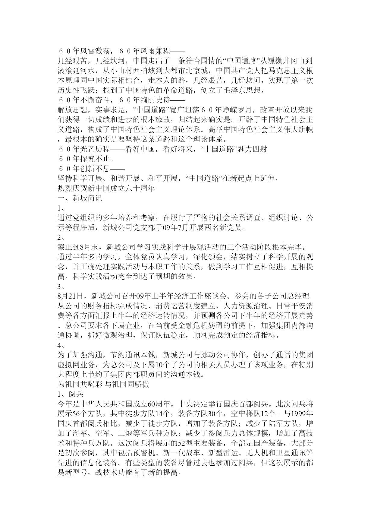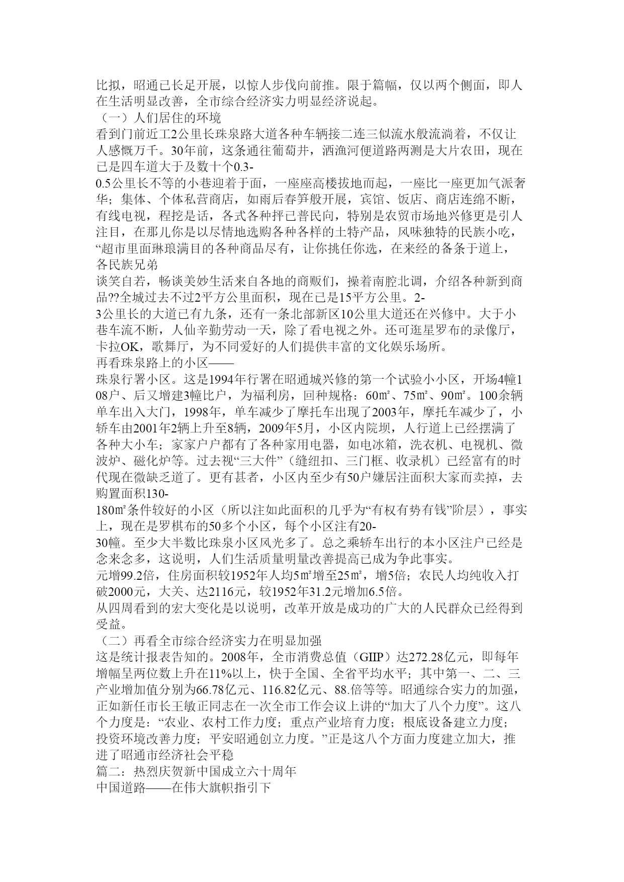 新中国成立六十周年 篇一:纪念中华人民共和国成立六十周年征文 纪念中华人民共和国成立六十周年征文 回忆通过历程展望美妙明天 ——纪念改革开放祖国腾飞三十年 高世清(昭通市老科协) 伟大的中华人民共和国,从1949年诞生到现在(2009年)已经走过了整整六十年历程。六十年在人类历史开展过程中,仅是短暂的瞬。但这六十年的历程,关于一个地点特别是个人,那是不平常的。不少人在风口浪尖上淌过来适者存,不适者被淘汰。 无数次的革命浪潮,推进着社会前进,真正地解放了一批又一批消费力,是1978年十二届三中全会改革开放三十年来昭通和全国一样经济社会开展步上正常的道路史管。所以每前进一步也是付出了一定代价的。 值此,建国60周年之际,为表达笔者激情,也参与可歌颂改革开放30年来,昭通市社会主义建立的伟大成就、经济、科技和社会开展的宏大变化。 一、历史的回忆 在中国的历史长河中,昭通曾有过几度辉煌。远在公元 三、四世纪,昭通已是国内外享有盛誉的白铜之乡(白铜冶炼技术早于西方各国,对世界科技作出突出奉献。最显耀的 是三个时期。一是秦开“五尺道”后,车汉置“朱提郡”以来,为中国“陵上南方系绸之路“必经之道”唐王朝遗史册封南诏路经昭通过程中,对沟通、传输中原文化至云南,至国外西南亚起过桥梁作用;二是西汉时期所消费的“朱提银”出名全国延至元、明、清。‘朱提’二字成为中国白银的代名词,清来气已重嘉庆年间,其白银产量居全国首位,可谓“银都”,当时的昭通城,商店林立,市面繁荣真是一派壮观的商业城市,全国绝大部分省区在此建立商号、行会、寺院、文庙、武馆、会馆如雨后春笋般蜂湧而出,比比皆足。人们比喻昭通府的西分走于类似于北京的“王府井”三是抗日战争时期,省城昆明与许多内地省会城市处于抗日前海,论区商人纷纷来昭经商,一时间,昭近城镇建立在云南各专川市县中处于领先地位,相当一段时间,昭通省“小品明”之称“兴旺之地”之誉。人文景欢之来富,可谓“热非凡之地”。所以,这与当时,湧现出好大批出色人才有关。如几届云南省省长龙云,卢汉等是昭近籍人分不开。历史上昭通是一块奇妙的土地,出人出宝的关系地点。新中国成立之后,川滇出路,滇黔公路、贵昆铁路,成昆铁路通车后,曾经足中原文化传入云南,(传入西南亚各国重要走廊地理位置的昭通,一度变为交通闭塞死,角地带,加之人口急剧膨胀,左思潮一浪高过一浪危害,使这里变成了全国贫困最大的市(所辖几县区中省10个县区列入全围重点扶贫攻 坚县区)。十一届三中全支之后,特别是改革开放30年来,位于川滇黔三省结合部,云南贵过远的寒昭通市也在发生了耕产覆地的变化。 二辉煌的成就 由于社会,历史和自然等缘故,昭通这块宝地至今还没有摆脱贫困落后的境地,2008年底全市560.5万人口中还有198.6万人贫困人口;在全省16个地川市中处于第14位;与田比邻7个地川市比处在末位,这是横向比拟的话。假设纵向比拟,昭通已长足开展,以惊人步伐向前推。限于篇幅,仅以两个侧面,即人在生活明显改善,全市综合经济实力明显经济说起。 (一)人们居住的环境 看到门前近工2公里长珠泉路大道各种车辆接二连三似流水般流淌着,不仅让人感慨万千。30年前,这条通往葡萄井,洒渔河便道路两测是大片农田,现在已是四车道大于及数十个0.3-0.5公里长不等的小巷迎着于面,一座座高楼拔地而起,一座比一座更加气派奢华;集体、个体私营商店,如雨后春笋般开展,宾馆、饭店、商店连绵不断,有线电视,程挖是话,各式各种抨已普民向,特别是农贸市场地兴修更是引人注目,在那儿你是以尽情地选购各种各样的土特产品,风味独特的民族小吃,“超市里面琳琅满目的各种商品尽有,让你挑任你选,在来经的备条于道上,各民族兄弟 谈笑自若,畅谈美妙生活来自各地的商贩们,操着南腔北调,介绍各种新到商品??全城过去不过2平方公里面积,现在已是15平方公里。2-3公里长的大道已有九条,还有一条北部新区10公里大道还在兴修中。大于小巷车流不断,人仙辛勤劳动一天,除了看电视之外。还可逛星罗布的录像厅,卡拉OK,歌舞厅,为不同爱好的人们提供丰富的文化娱乐场所。 再看珠泉路上的小区——珠泉行署小区。这是1994年行署在昭通城兴修的第一个试验小小区,开场4幢108户、后又增建3幢比户,为福利房,回种规格:60㎡、75㎡、90㎡。100余辆单车出入大门,1998年,单车减少了摩托车出现了2003年,摩托车减少了,小轿车由2001年2辆上升至8辆,2009年5月,小区内院坝,人行道上已经摆满了各种大小车;家家户户都有了各种家用电器,如电冰箱,洗衣机、电视机、微波炉、磁化炉等。过去视“三大件”(缝纽扣、三门框、收录机)已经富有的时代现在微缺乏道了。更有甚者,小区内至少有50户嫌居注面积大家而卖掉,去购置面积130-180㎡条件较好的小区(所以注如此面积的几乎为“
