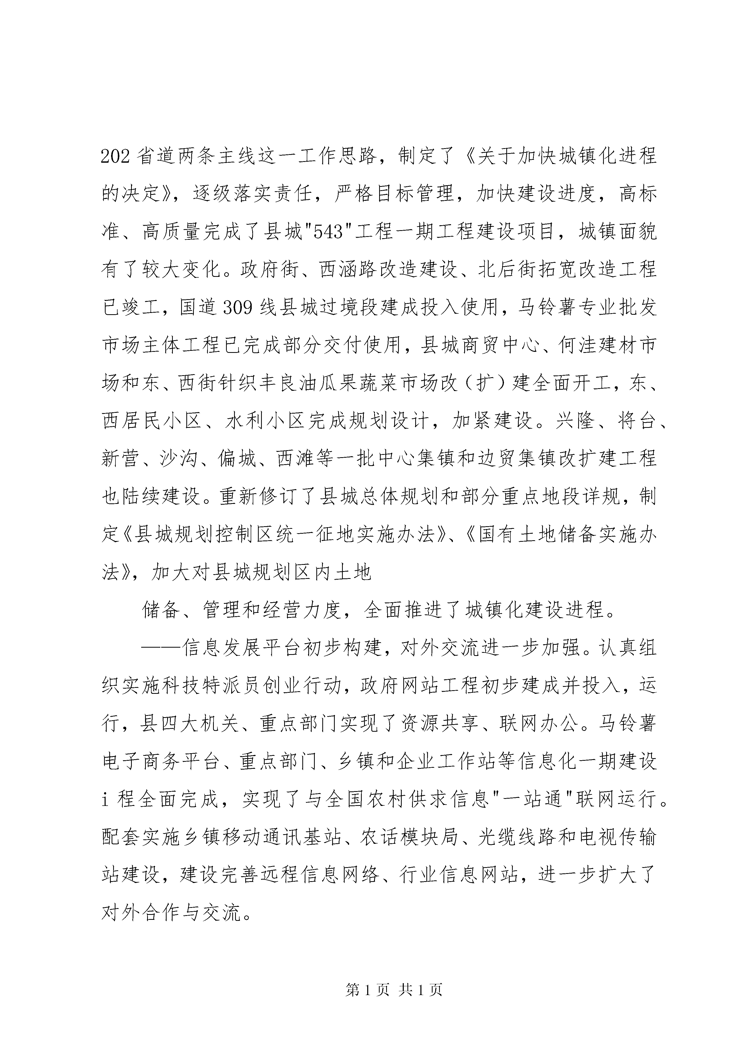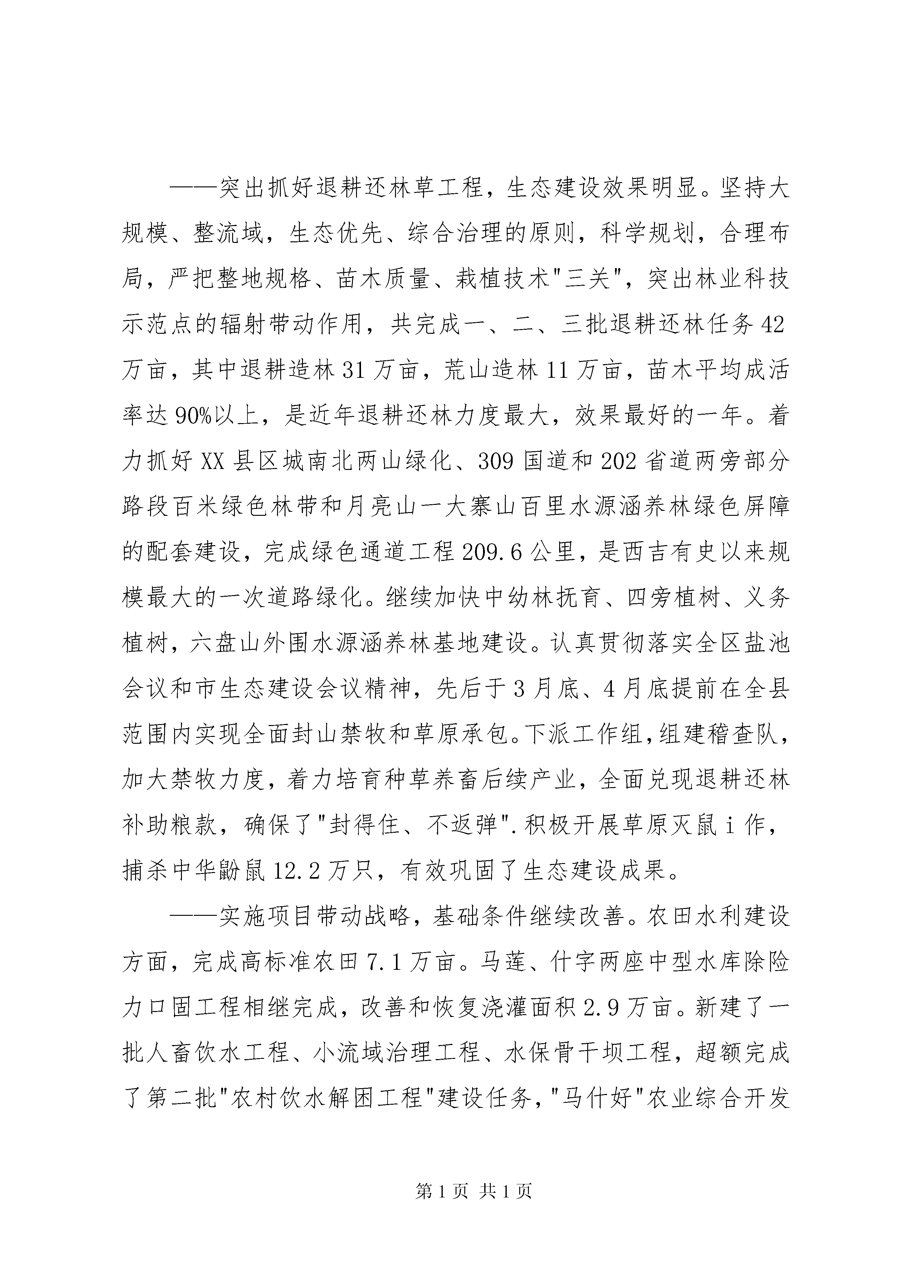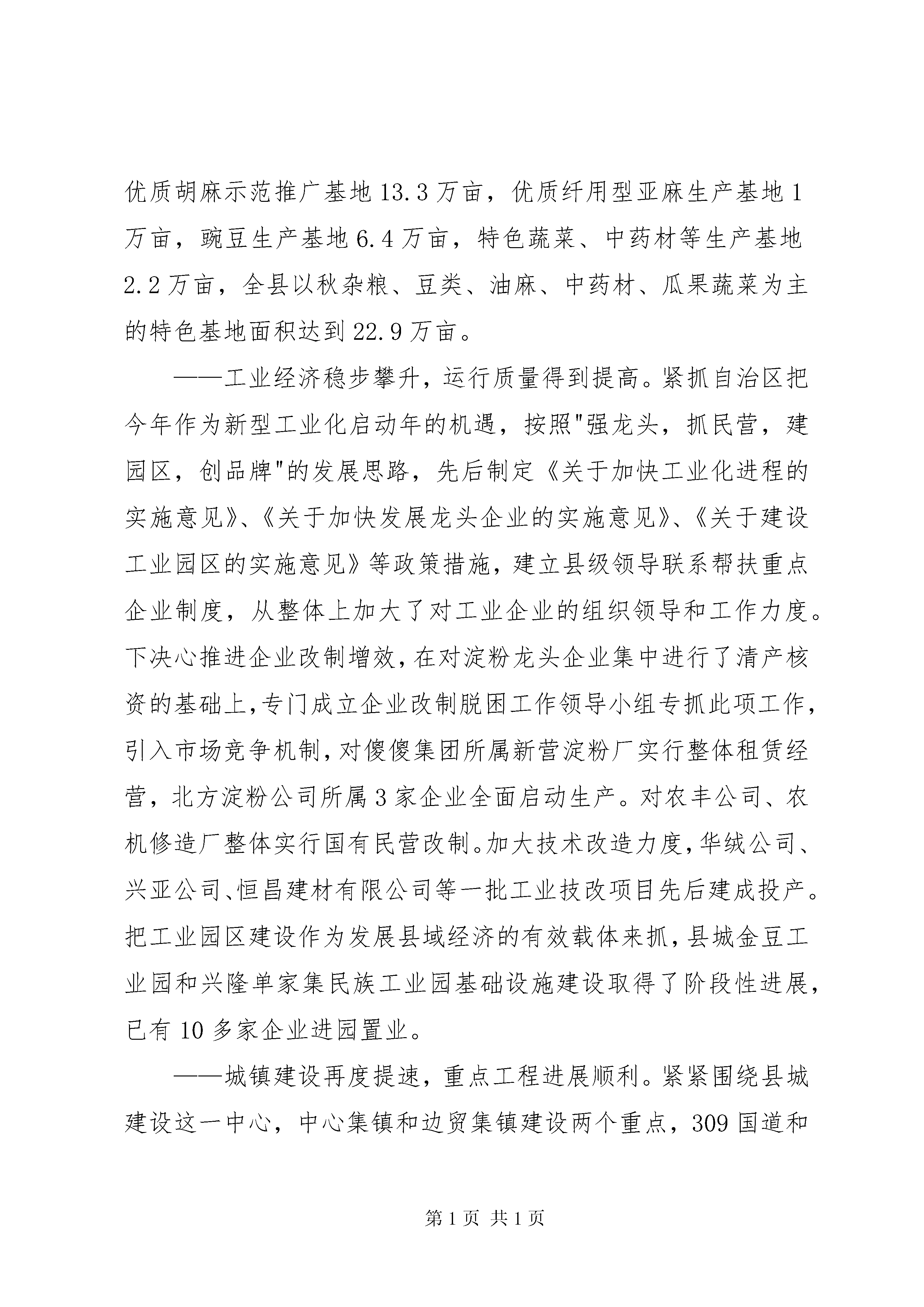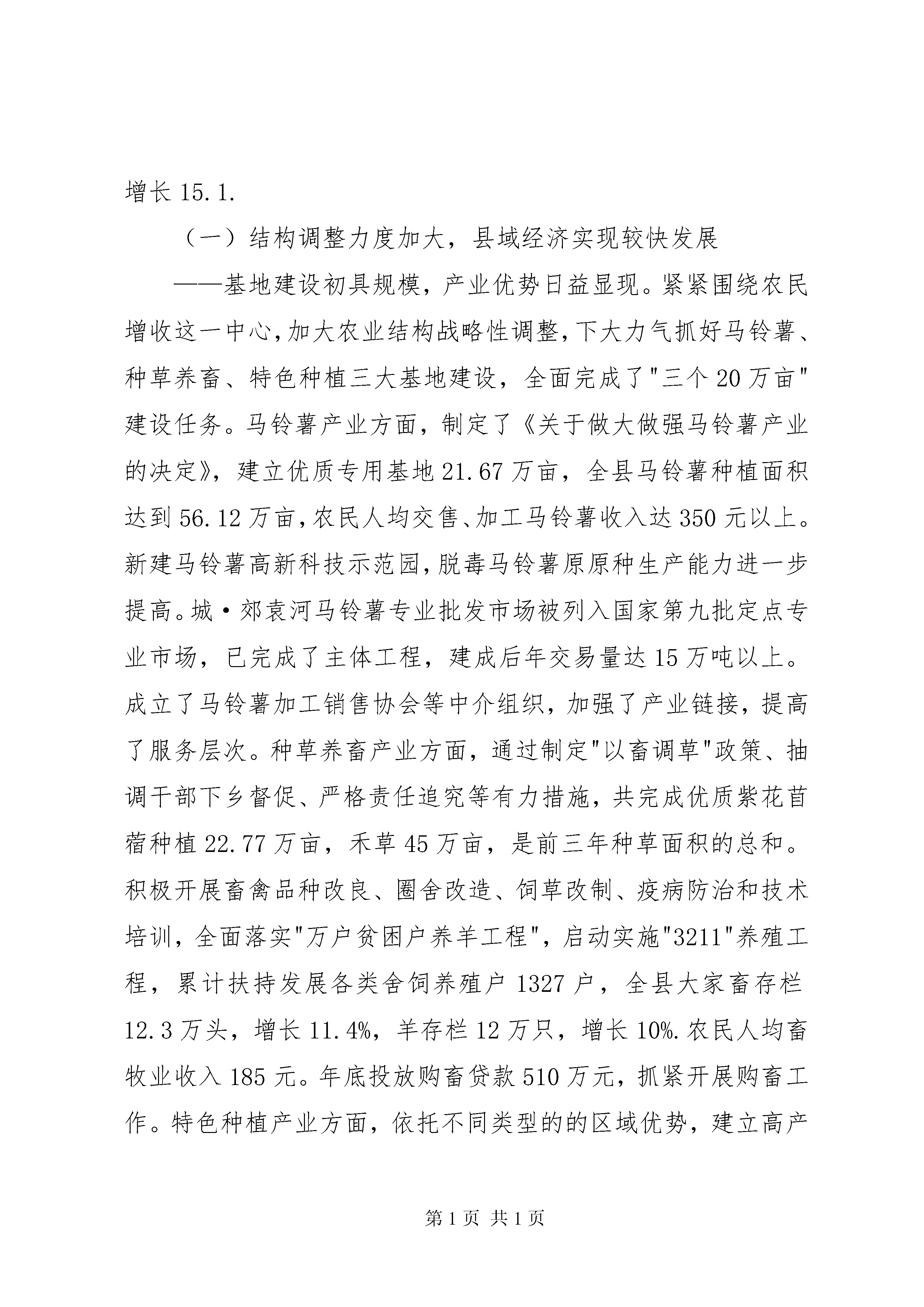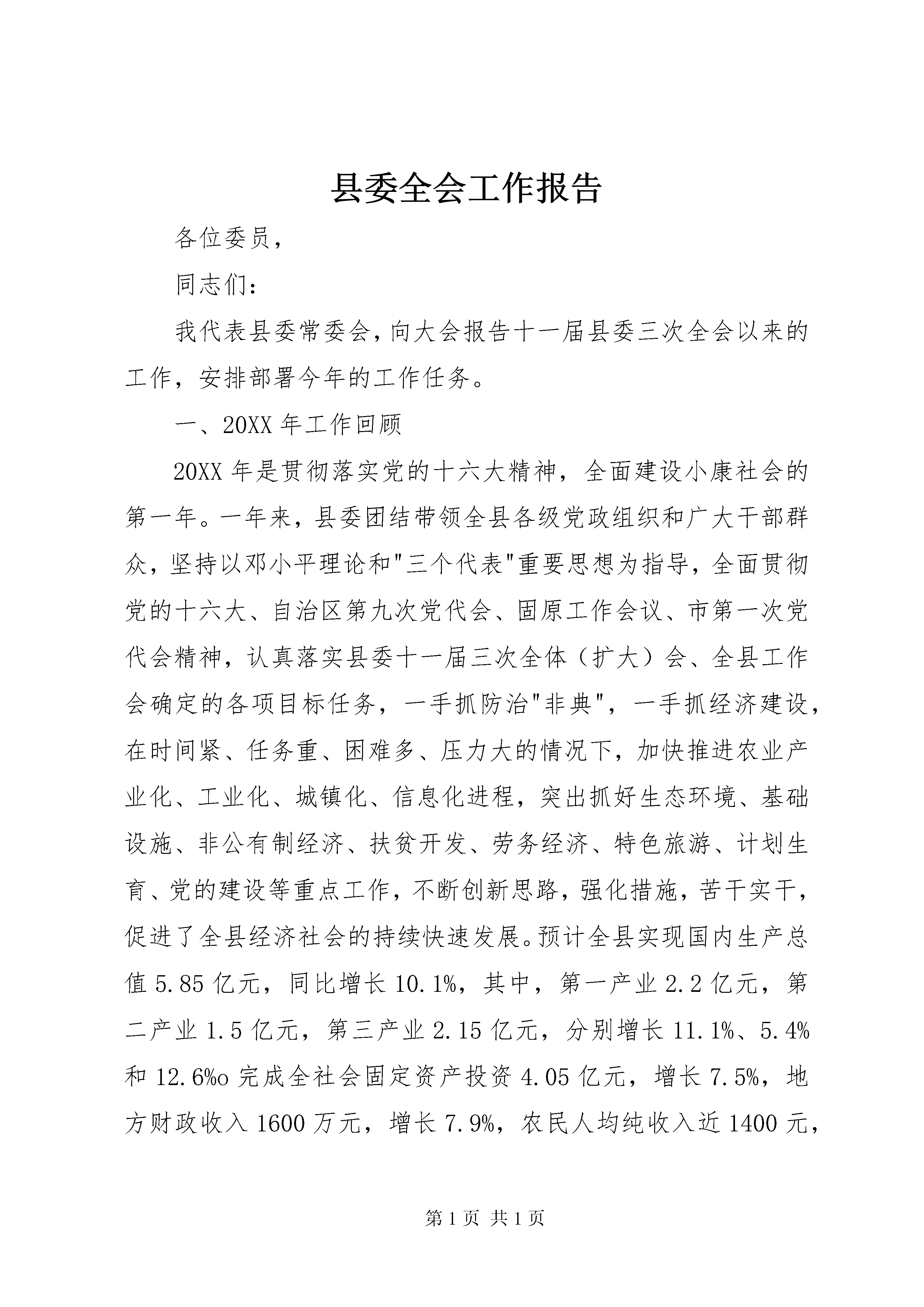 县委全会工作报告各位委员,同志们:我代表县委常委会,向大会报告十一届县委三次全会以来的工作,安排部署今年的工作任务。一、20XX年工作回顾20XX年是贯彻落实党的十六大精神,全面建设小康社会的第一年。一年来,县委团结带领全县各级党政组织和广大干部群众,坚持以邓小平理论和"三个代表"重要思想为指导,全面贯彻党的十六大、自治区第九次党代会、固原工作会议、市第一次党代会精神,认真落实县委十一届三次全体(扩大)会、全县工作会确定的各项目标任务,一手抓防治"非典",一手抓经济建设,在时间紧、任务重、困难多、压力大的情况下,加快推进农业产业化、工业化、城镇化、信息化进程,突出抓好生态环境、基础设施、非公有制经济、扶贫开发、劳务经济、特色旅游、计划生育、党的建设等重点工作,不断创新思路,强化措施,苦干实干,促进了全县经济社会的持续快速发展。预计全县实现国内生产总值5.85亿元,同比增长10.1%,其中,第一产业2.2亿元,第二产业1.5亿元,第三产业2.15亿元,分别增长11.1%、5.4%和12.6%o完成全社会固定资产投资4.05亿元,增长7.5%,地方财政收入1600万元,增长7.9%,农民人均纯收入近1400元,增长15.1.(一)结构调整力度加大,县域经济实现较快发展——基地建设初具规模,产业优势日益显现。紧紧围绕农民增收这一中心,加大农业结构战略性调整,下大力气抓好马铃薯、种草养畜、特色种植三大基地建设,全面完成了"三个20万亩"建设任务。马铃薯产业方面,制定了《关于做大做强马铃薯产业的决定》,建立优质专用基地21.67万亩,全县马铃薯种植面积达到56.12万亩,农民人均交售、加工马铃薯收入达350元以上。新建马铃薯高新科技示范园,脱毒马铃薯原原种生产能力进一步提高。城·郊袁河马铃薯专业批发市场被列入国家第九批定点专业市场,已完成了主体工程,建成后年交易量达15万吨以上。成立了马铃薯加工销售协会等中介组织,加强了产业链接,提高了服务层次。种草养畜产业方面,通过制定"以畜调草"政策、抽调干部下乡督促、严格责任追究等有力措施,共完成优质紫花苜蓿种植22.77万亩,禾草45万亩,是前三年种草面积的总和。积极开展畜禽品种改良、圈舍改造、饲草改制、疫病防治和技术培训,全面落实"万户贫困户养羊工程",启动实施"3211"养殖工程,累计扶持发展各类舍饲养殖户1327户,全县大家畜存栏12.3万头,增长11.4%,羊存栏12万只,增长10%.农民人均畜牧业收入185元。年底投放购畜贷款510万元,抓紧开展购畜工作。特色种植产业方面,依托不同类型的的区域优势,建立高产优质胡麻示范推广基地13.3万亩,优质纤用型亚麻生产基地1万亩,豌豆生产基地6.4万亩,特色蔬菜、中药材等生产基地2.2万亩,全县以秋杂粮、豆类、油麻、中药材、瓜果蔬菜为主的特色基地面积达到22.9万亩。——工业经济稳步攀升,运行质量得到提高。紧抓自治区把今年作为新型工业化启动年的机遇,按照"强龙头,抓民营,建园区,创品牌"的发展思路,先后制定《关于加快工业化进程的实施意见》、《关于加快发展龙头企业的实施意见》、《关于建设工业园区的实施意见》等政策措施,建立县级领导联系帮扶重点企业制度,从整体上加大了对工业企业的组织领导和工作力度。下决心推进企业改制增效,在对淀粉龙头企业集中进行了清产核资的基础上,专门成立企业改制脱困工作领导小组专抓此项工作,引入市场竞争机制,对傻傻集团所属新营淀粉厂实行整体租赁经营,北方淀粉公司所属3家企业全面启动生产。对农丰公司、农机修造厂整体实行国有民营改制。加大技术改造力度,华绒公司、兴亚公司、恒昌建材有限公司等一批工业技改项目先后建成投产。把工业园区建设作为发展县域经济的有效载体来抓,县城金豆工业园和兴隆单家集民族工业园基础设施建设取得了阶段性进展,已有10多家企业进园置业。——城镇建设再度提速,重点工程进展顺利。紧紧围绕县城建设这一中心,中心集镇和边贸集镇建设两个重点,309国道和202省道两条主线这一工作思路,制定了《关于加快城镇化进程的决定》,逐级落实责任,严格目标管理,加快建设进度,高标准、高质量完成了县城"543"工程一期工程建设项目,城镇面貌有了较大变化。政府街、西涵路改造建设、北后街拓宽改造工程已竣工,国道309线县城过境段建成投入使用,马铃薯专业批发市场主体工程已完成部分交付使用,县城商贸中心、何洼建材市场和东、西街针织丰良油瓜果蔬菜市场改(扩)建全面开工,东、西居民小区、水利小区完成规划设计,加紧建设。兴隆、将台、新营、沙沟、偏城、西滩等一批中心集镇和边贸集镇改扩建工程也陆续建设。重新修订了县城总体规划和部分重点地段详规,制定《县城规划控制区统一征地实施办法》、《国有土地储备实施办法》,加大对县城规划区内土地储备