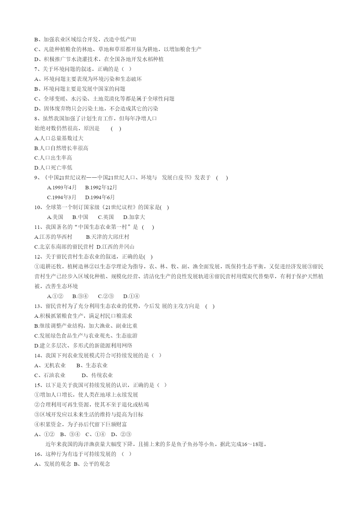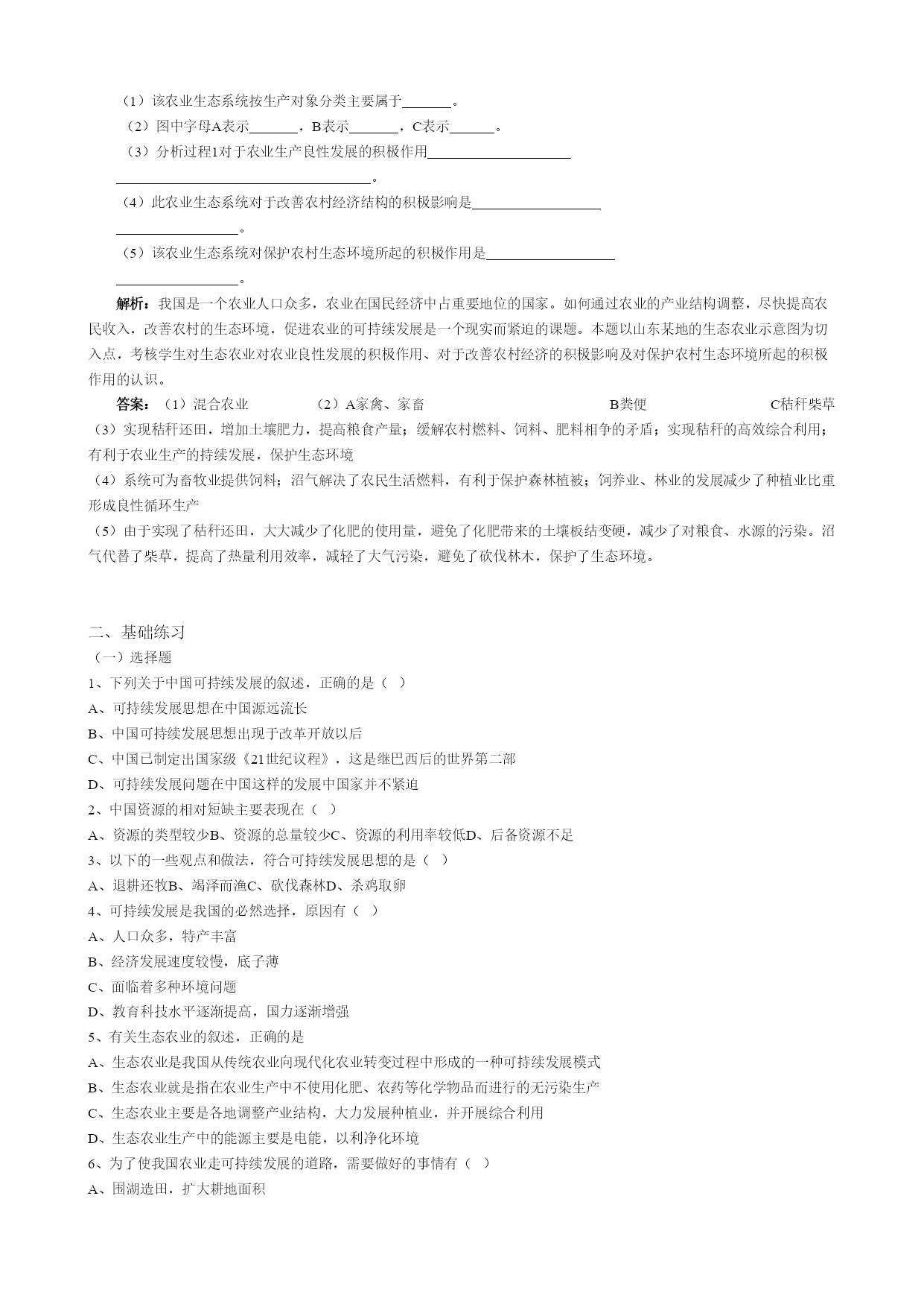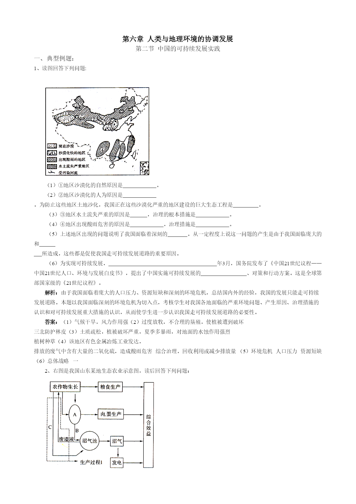 第六章人类与地理环境的协调发展 第二节中国的可持续发展实践 一、典型例题: 1、读图回答下列问题: (1)①地区沙漠化的自然原因是。 (2)②地区沙漠化的人为原因是。为防止这些地区土地沙化,我国正在这些沙漠化严重的地区建设的巨大生态工程是。 (3)③地区水土流失严重的原因是,治理的根本措施是。 (4)④地区出现酸雨危害的原因是,治理措施是。 (5)上述地区出现的问题说明了我国面临着深刻的。从一定程度上说这一问题的产生是由于我国面临庞大的和 所造成,这些都是促使我国走可持续发展道路的重要原因。 (6)为实现可持续发展,年3月,国务院发布了《中国21世纪议程——中国21世纪人口、环境与发展白皮书》,提出了中国实施可持续发展的、对策和行动方案。这是全球第部国家级的《21世纪议程》。 解析:由于我国面临着庞大的人口压力、资源短缺和深刻的环境危机,总结国内外的经验,我国的发展只能走可持续发展道路。本题以我国面临深刻的环境危机为切入点,考核学生对我国各地面临的严重环境问题、产生原因、治理措施的认识和对可持续发展重大措施的认识,从而使学生进一步认识我国走可持续发展道路的必要性。 答案:(1)气候干旱,风力作用强(2)过度放牧,不合理的垦殖,使植被遭到破坏三北防护林皮(3)土质疏松,植被破坏严重,夏季多暴雨,对地面的水蚀作用强烈植树种草(4)该地区有色金属冶炼工业发达, 排放的废气中含有大量的二氧化硫,造成酸雨危害综合治理,回收利用或减少排放量(5)环境危机人口压力资源短缺(6)总体战略一 2、右图是我国山东某地生态农业示意图,读后回答下列问题: (1)该农业生态系统按生产对象分类主要属于。 (2)图中字母A表示,B表示,C表示。 (3)分析过程1对于农业生产良性发展的积极作用 。 (4)此农业生态系统对于改善农村经济结构的积极影响是 。 (5)该农业生态系统对保护农村生态环境所起的积极作用是 。 解析:我国是一个农业人口众多,农业在国民经济中占重要地位的国家。如何通过农业的产业结构调整,尽快提高农民收入,改善农村的生态环境,促进农业的可持续发展是一个现实而紧迫的课题。本题以山东某地的生态农业示意图为切入点,考核学生对生态农业对农业良性发展的积极作用、对于改善农村经济的积极影响及对保护农村生态环境所起的积极作用的认识。 答案:(1)混合农业(2)A家禽、家畜B粪便C秸秆柴草(3)实现秸秆还田,增加土壤肥力,提高粮食产量;缓解农村燃料、饲料、肥料相争的矛盾;实现秸秆的高效综合利用;有利于农业生产的持续发展,保护生态环境(4)系统可为畜牧业提供饲料;沼气解决了农民生活燃料,有利于保护森林植被;饲养业、林业的发展减少了种植业比重形成良性循环生产(5)由于实现了秸秆还田,大大减少了化肥的使用量,避免了化肥带来的土壤板结变硬,减少了对粮食、水源的污染。沼气代替了柴草,提高了热量利用效率,减轻了大气污染,避免了砍伐林木,保护了生态环境。 二、基础练习 (一)选择题 1、下列关于中国可持续发展的叙述,正确的是() A、可持续发展思想在中国源远流长 B、中国可持续发展思想出现于改革开放以后 C、中国已制定出国家级《21世纪议程》,这是继巴西后的世界第二部 D、可持续发展问题在中国这样的发展中国家并不紧迫 2、中国资源的相对短缺主要表现在() A、资源的类型较少B、资源的总量较少C、资源的利用率较低D、后备资源不足 3、以下的一些观点和做法,符合可持续发展思想的是() A、退耕还牧B、竭泽而渔C、砍伐森林D、杀鸡取卵 4、可持续发展是我国的必然选择,原因有() A、人口众多,特产丰富 B、经济发展速度较慢,底子薄 C、面临着多种环境问题 D、教育科技水平逐渐提高,国力逐渐增强 5、有关生态农业的叙述,正确的是 A、生态农业是我国从传统农业向现代化农业转变过程中形成的一种可持续发展模式 B、生态农业就是指在农业生产中不使用化肥、农药等化学物品而进行的无污染生产 C、生态农业主要是各地调整产业结构,大力发展种植业,并开展综合利用 D、生态农业生产中的能源主要是电能,以利净化环境 6、为了使我国农业走可持续发展的道路,需要做好的事情有() A、围湖造田,扩大耕地面积 B、加强农业区域综合开发,改造中低产田 C、凡能种植粮食的林地、草地和草原都开垦为耕地,以增加粮食生产 D、积极推广节水浇灌技术,在全国各地开发水稻种植 7、关于环境问题的叙述,正确的是() A、环境问题主要表现为环境污染和生态破坏 B、环境问题主要是发展中国家的问题 C、全球变暖、水污染、土地荒漠化等都是属于全球性问题 D、固体废弃物只会污染土地,不会造成其它的污染 8、虽然我国加强了计划生育工作,但每年净增人口 始绝对数仍然很高,原因是 () A.人口总量基数过大 B.人口自然