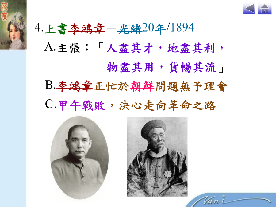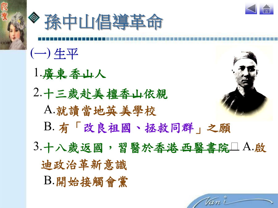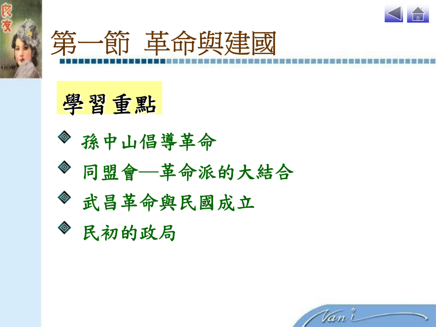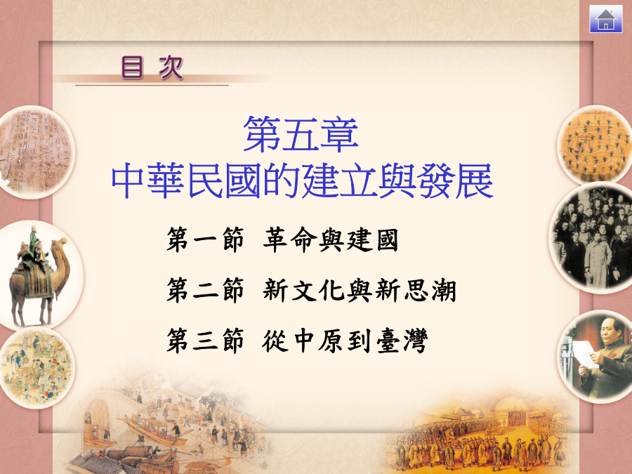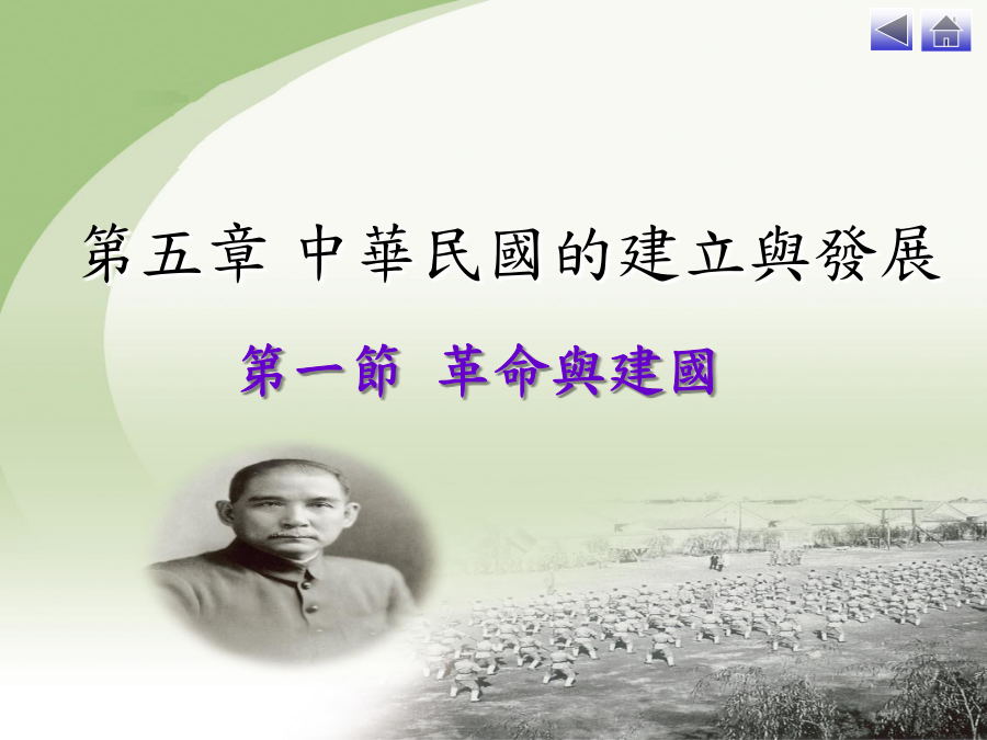 第五章中華民國的建立與發展孫中山倡導革命 同盟會─革命派的大結合 武昌革命與民國成立 民初的政局孫中山倡導革命4.上書李鴻章-光緒20年/1894A.主張:「人盡其才,地盡其利,物盡其用,貨暢其流」B.李鴻章正忙於朝鮮問題無予理會C.甲午戰敗,決心走向革命之路(二)創建「興中會」 1.時地:光緒20年/1894-檀香山 2.誓詞:「驅逐韃虜,恢復中華,創立合眾政府」-已有民族主義、民權主義理念 3.起義與事件A.廣州起義-光緒21B.倫敦蒙難-光緒22C.惠州之役-光緒26同盟會─革命派的大結合(三)成立「同盟會」 1.時地:光緒31年/1905-日本東京 2.誓詞:「驅除韃虜,恢復中華,創立民國,平均地權」-已涵蓋三民主義理念 3.入會者:多為留日學生 4.影響:奠定日後辛亥革命成功之基礎 5.機關報:〈二十世紀之支那〉→〈民報〉 6.論戰:A.立憲派-君主立憲B.革命派-民主共和武昌革命與民國成立3.武昌革命爆發A.新軍工程營首先發難B.一夜激戰,武昌為革命軍占領→推新軍將領黎元洪為鄂軍都督C.陸續又克復漢口、漢陽 4.革命順利成功之因A.各省紛紛響應B.立憲派轉而支持革命(二)民國成立 1.中華民國誕生A.孫中山先生返國→被選為臨時大總統B.以「中華民國」為國號,以西曆取代陰曆C.孫中山於民國元年(1912)元旦就職於南京 2.孫中山讓位給袁世凱A.清廷重新起用遭罷黜的袁世凱B.孫中山以臨時政府兵力薄弱、餉械缺乏而讓位給袁世凱→臨時政府北遷 3.辛亥革命之歷史意義─推翻滿清,建立共和民初的政局3.國民黨改組-民國元年8月A.由同盟會聯合其他小黨改組而成B.民國2年國會選舉大獲全勝 4.宋教仁被刺殺-民國2年3月A.國會選舉後,宋教仁將出任國務總理B.國民黨處理態度不一a.孫中山-力主「武力討袁」b.黃興-主張「法律討袁」 5.進步黨成立-A.由梁啟超主導B.與袁世凱合作6.國民黨發動「二次革命」A.背景:宋教仁遭暗殺B.導火線:袁氏下令罷免三省國民黨籍督都C.國民黨起兵討袁:民國2年7月D.國民黨敗因:a.袁世凱兵符在握b.討袁步伐不一c.國內人心渴望和平E.影響:a.北洋軍勢力達長江流域b.孫中山改組中華革命黨c.袁世凱稱帝野心(二)洪憲帝制 1.不斷擴大權力A.脅迫國會選他為正式大總統B.解散國民黨,取消國民黨籍國會議員資格C.解散國會D.另訂《新約法》-實行總統制 2.稱帝步驟-民國4年A.利用美籍顧問古德諾製造輿論B.唆使楊度籌組「籌安會」鼓吹帝制C.12月宣布接受→民國5年改為洪憲元年3.帝制失敗原因:A.中華革命黨發起討袁革命B.梁啟超公開撰文反對—「異哉所謂國體問題者」C.蔡鍔、唐繼堯在雲南發起「護國軍」討袁→南方各省響應D.列強強力反對E.北洋軍也表不支持 4.取消帝制→病逝(三)軍閥統治與反軍閥運動 1.軍閥統治A.始自:袁世凱死後,北洋軍分化B.北方軍閥三大派系:a.皖系-段祺瑞b.直系-馮國璋c.奉系-張作霖C.南方軍閥派系:a.滇系-唐繼堯b.桂系-陸榮廷直系馮國璋D.軍閥統治時期最大特色:戰爭頻繁a.北方三大派系相互混戰b.南方各省軍人也相互攻伐c.南北之間也爆發內戰E.「打倒軍閥」成為民族主義之呼聲a.長期壓榨民眾,掠取資源b.面對列強又多採取忍讓態度2.反軍閥運動A.民國6年-孫中山南下廣州「護法」a.起因:張勳復辟後,段祺瑞不恢復國會b.孫中山率部分國會議員南下組軍政府c.南方軍閥各為私利,非真心支持B.民國11年-陳炯明叛變:與孫理念不合a.孫中山-堅持北伐統一b.陳炯明-主張廣東自治C.民國12年-曹錕賄選事件D.民國13年-孫中山改組中國國民黨