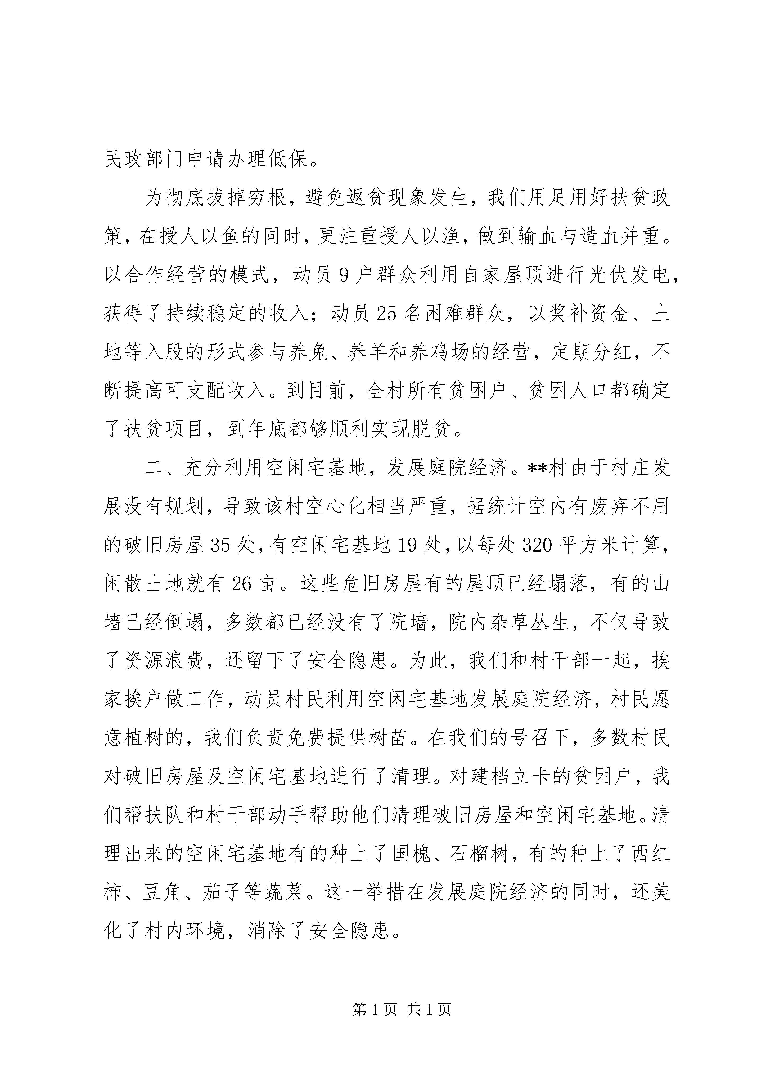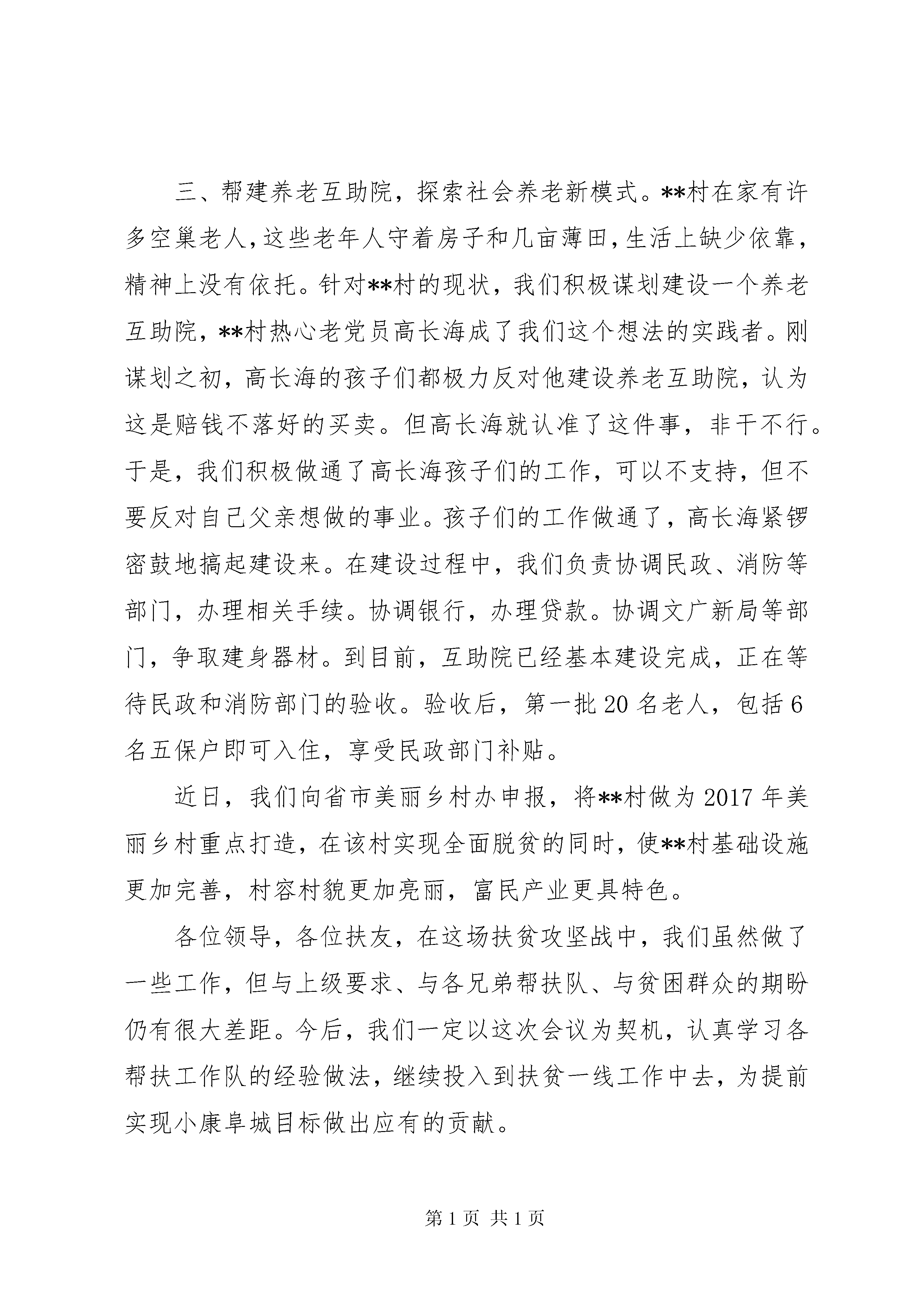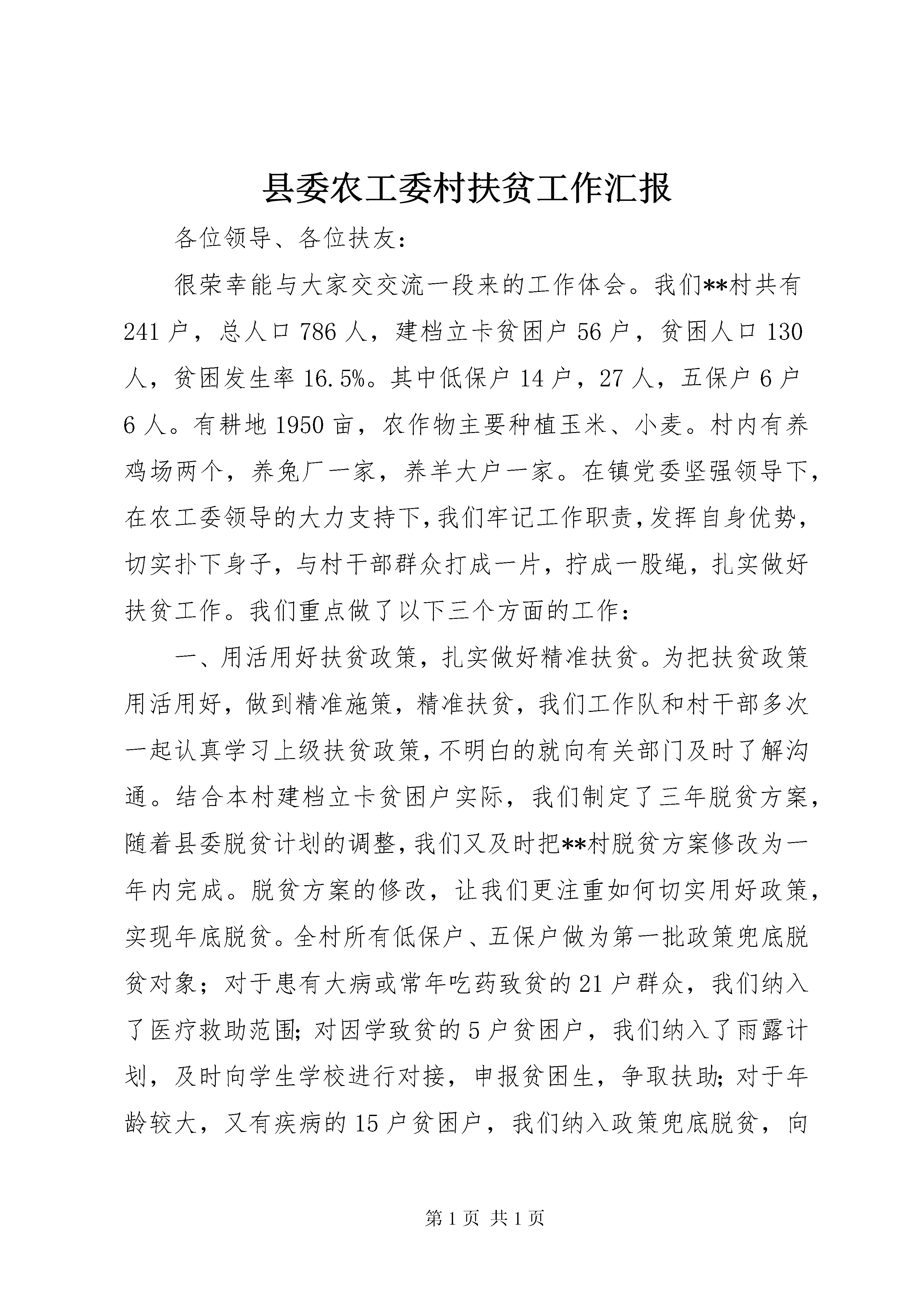 县委农工委村扶贫工作汇报各位领导、各位扶友:很荣幸能与大家交交流一段来的工作体会。我们**村共有241户,总人口786人,建档立卡贫困户56户,贫困人口130人,贫困发生率16.5%。其中低保户14户,27人,五保户6户6人。有耕地1950亩,农作物主要种植玉米、小麦。村内有养鸡场两个,养兔厂一家,养羊大户一家。在镇党委坚强领导下,在农工委领导的大力支持下,我们牢记工作职责,发挥自身优势,切实扑下身子,与村干部群众打成一片,拧成一股绳,扎实做好扶贫工作。我们重点做了以下三个方面的工作:一、用活用好扶贫政策,扎实做好精准扶贫。为把扶贫政策用活用好,做到精准施策,精准扶贫,我们工作队和村干部多次一起认真学习上级扶贫政策,不明白的就向有关部门及时了解沟通。结合本村建档立卡贫困户实际,我们制定了三年脱贫方案,随着县委脱贫计划的调整,我们又及时把**村脱贫方案修改为一年内完成。脱贫方案的修改,让我们更注重如何切实用好政策,实现年底脱贫。全村所有低保户、五保户做为第一批政策兜底脱贫对象;对于患有大病或常年吃药致贫的21户群众,我们纳入了医疗救助范围;对因学致贫的5户贫困户,我们纳入了雨露计划,及时向学生学校进行对接,申报贫困生,争取扶助;对于年龄较大,又有疾病的15户贫困户,我们纳入政策兜底脱贫,向民政部门申请办理低保。为彻底拔掉穷根,避免返贫现象发生,我们用足用好扶贫政策,在授人以鱼的同时,更注重授人以渔,做到输血与造血并重。以合作经营的模式,动员9户群众利用自家屋顶进行光伏发电,获得了持续稳定的收入;动员25名困难群众,以奖补资金、土地等入股的形式参与养兔、养羊和养鸡场的经营,定期分红,不断提高可支配收入。到目前,全村所有贫困户、贫困人口都确定了扶贫项目,到年底都够顺利实现脱贫。二、充分利用空闲宅基地,发展庭院经济。**村由于村庄发展没有规划,导致该村空心化相当严重,据统计空内有废弃不用的破旧房屋35处,有空闲宅基地19处,以每处320平方米计算,闲散土地就有26亩。这些危旧房屋有的屋顶已经塌落,有的山墙已经倒塌,多数都已经没有了院墙,院内杂草丛生,不仅导致了资源浪费,还留下了安全隐患。为此,我们和村干部一起,挨家挨户做工作,动员村民利用空闲宅基地发展庭院经济,村民愿意植树的,我们负责免费提供树苗。在我们的号召下,多数村民对破旧房屋及空闲宅基地进行了清理。对建档立卡的贫困户,我们帮扶队和村干部动手帮助他们清理破旧房屋和空闲宅基地。清理出来的空闲宅基地有的种上了国槐、石榴树,有的种上了西红柿、豆角、茄子等蔬菜。这一举措在发展庭院经济的同时,还美化了村内环境,消除了安全隐患。三、帮建养老互助院,探索社会养老新模式。**村在家有许多空巢老人,这些老年人守着房子和几亩薄田,生活上缺少依靠,精神上没有依托。针对**村的现状,我们积极谋划建设一个养老互助院,**村热心老党员高长海成了我们这个想法的实践者。刚谋划之初,高长海的孩子们都极力反对他建设养老互助院,认为这是赔钱不落好的买卖。但高长海就认准了这件事,非干不行。于是,我们积极做通了高长海孩子们的工作,可以不支持,但不要反对自己父亲想做的事业。孩子们的工作做通了,高长海紧锣密鼓地搞起建设来。在建设过程中,我们负责协调民政、消防等部门,办理相关手续。协调银行,办理贷款。协调文广新局等部门,争取建身器材。到目前,互助院已经基本建设完成,正在等待民政和消防部门的验收。验收后,第一批20名老人,包括6名五保户即可入住,享受民政部门补贴。近日,我们向省市美丽乡村办申报,将**村做为2017年美丽乡村重点打造,在该村实现全面脱贫的同时,使**村基础设施更加完善,村容村貌更加亮丽,富民产业更具特色。各位领导,各位扶友,在这场扶贫攻坚战中,我们虽然做了一些工作,但与上级要求、与各兄弟帮扶队、与贫困群众的期盼仍有很大差距。今后,我们一定以这次会议为契机,认真学习各帮扶工作队的经验做法,继续投入到扶贫一线工作中去,为提前实现小康阜城目标做出应有的贡献。我的发言完毕。谢谢大家。