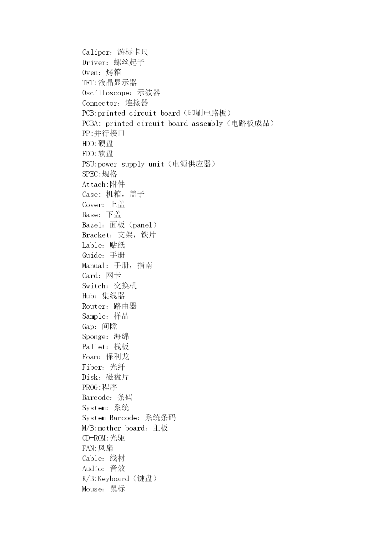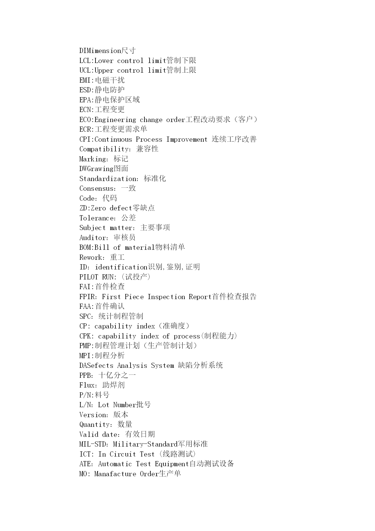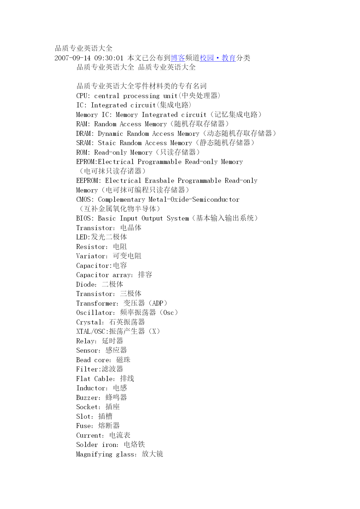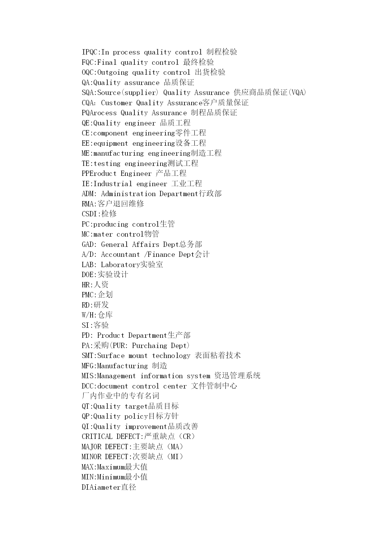 品质专业英语大全2007-09-1409:30:01本文已公布到HYPERLINK"http://blog.i.cn.yahoo.com"\t"_blank"博客频道HYPERLINK"http://blog.i.cn.yahoo.com/category_5/"\t"_blank"校园·教育分类 品质专业英语大全品质专业英语大全品质专业英语大全零件材料类的专有名词CPU:centralprocessingunit(中央处理器)IC:Integratedcircuit(集成电路)MemoryIC:MemoryIntegratedcircuit(记忆集成电路)RAM:RandomAccessMemory(随机存取存储器)DRAM:DynamicRandomAccessMemory(动态随机存取存储器)SRAM:StaicRandomAccessMemory(静态随机存储器)ROM:Read-onlyMemory(只读存储器)EPROM:ElectricalProgrammableRead-onlyMemory(电可抹只读存诸器)EEPROM:ElectricalErasbaleProgrammableRead-onlyMemory(电可抹可编程只读存储器)CMOS:ComplementaryMetal-Oxide-Semiconductor(互补金属氧化物半导体)BIOS:BasicInputOutputSystem(基本输入输出系统)Transistor:电晶体LED:发光二极体Resistor:电阻Variator:可变电阻Capacitor:电容Capacitorarray:排容Diode:二极体Transistor:三极体Transformer:变压器(ADP)Oscillator:频率振荡器(0sc)Crystal:石英振荡器XTAL/OSC:振荡产生器(X)Relay:延时器Sensor:感应器Beadcore:磁珠Filter:滤波器FlatCable:排线Inductor:电感Buzzer:蜂鸣器Socket:插座Slot:插槽Fuse:熔断器Current:电流表Solderiron:电烙铁Magnifyingglass:放大镜Caliper:游标卡尺Driver:螺丝起子Oven:烤箱TFT:液晶显示器Oscilloscope:示波器Connector:连接器PCB:printedcircuitboard(印刷电路板)PCBA:printedcircuitboardassembly(电路板成品)PP:并行接口HDD:硬盘FDD:软盘PSU:powersupplyunit(电源供应器)SPEC:规格Attach:附件Case:机箱,盖子Cover:上盖Base:下盖Bazel:面板(panel)Bracket:支架,铁片Lable:贴纸Guide:手册Manual:手册,指南Card:网卡Switch:交换机Hub:集线器Router:路由器Sample:样品Gap:间隙Sponge:海绵Pallet:栈板Foam:保利龙Fiber:光纤Disk:磁盘片PROG:程序Barcode:条码System:系统SystemBarcode:系统条码M/B:motherboard:主板CD-ROM:光驱FAN:风扇Cable:线材Audio:音效K/B:Keyboard(键盘)Mouse:鼠标Risercard:转接卡Cardreader:读卡器Screw:螺丝Thermalpad:散热垫Heatsink:散热片Rubber:橡胶垫Rubberfoot:脚垫Bag:袋子Washer:垫圈Sleeve:袖套Config:机构Labelhi-pot:高压标签Firmwarelabel:烧录标签Metalcover:金属盖子Plasticcover:塑胶盖子Tapeforpacking:包装带Barcode:条码Tray:托盘Collecto:集线夹Holder:固定器,L铁Connecter:连接器IDE:集成电路设备,智能磁盘设备SCSI:小型计算机系统接口Gasket:导电泡棉AGP:加速图形接口PCI:周边组件扩展接口LAN:局域网USB:通用串形总线架构Slim:小型化COM:串型通讯端口LPT:打印口,并行口Powercord:电源线I/O:输入,输出Speaker:扬声器EPE:泡棉Carton:纸箱Button:按键,按钮Footstand:脚架部门名称的专有名词QS:Qualitysystem品质系统CS:CoutomerSevice客户服务QC:Qualitycontrol品质管理IQC:Incomingqualitycontrol进料检验LQC:LineQualityControl生产线品质控