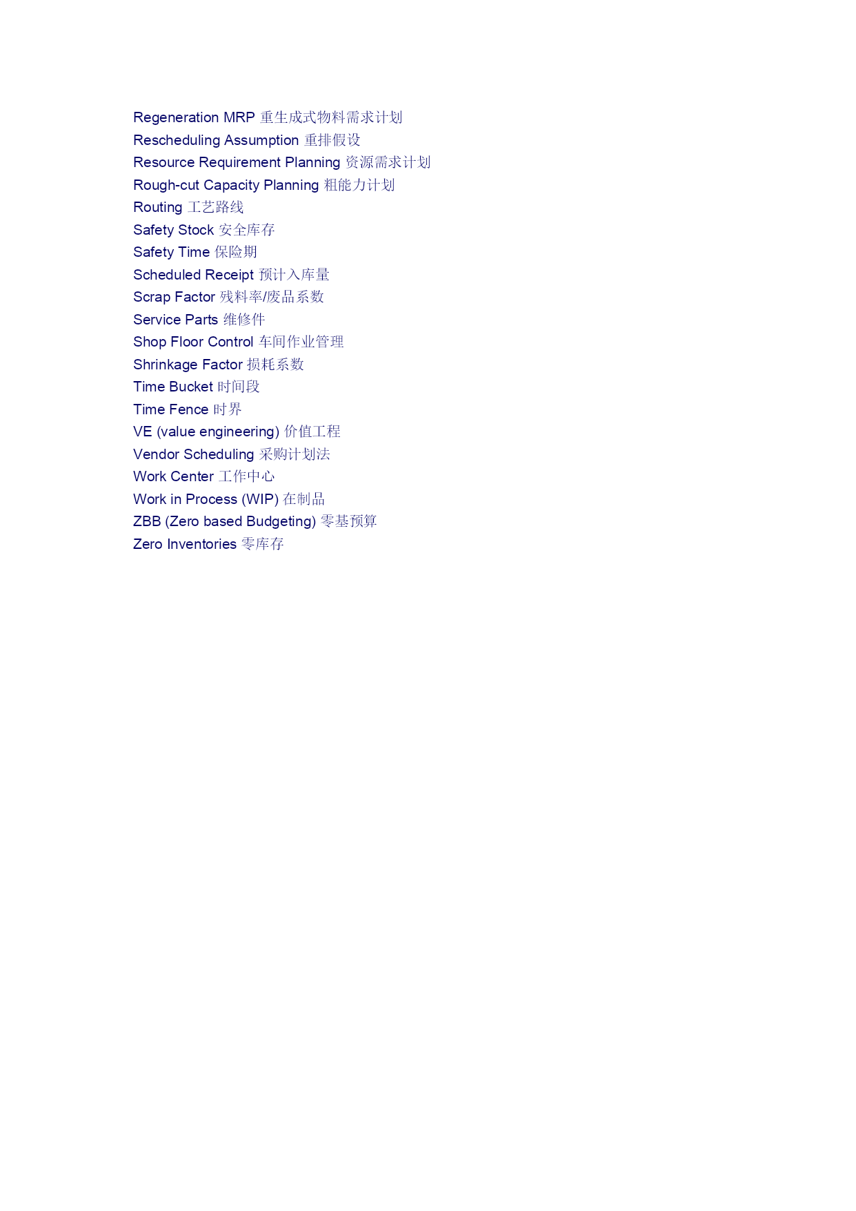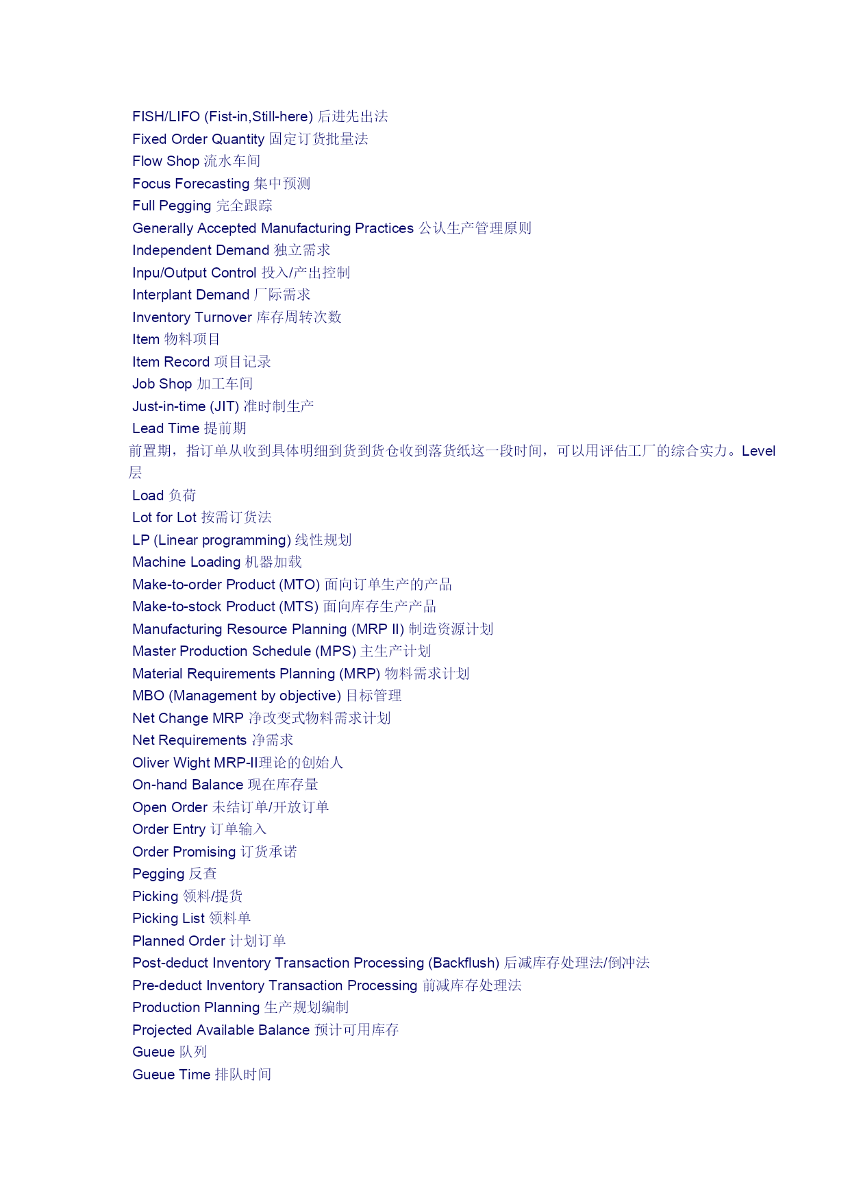 企业和经济管理专业英语名词2005-4-1415:10:35Activity-BasedCosting业务量成本法/作业成本法ACRS(Acceleratedcostrecoverysystem)快速成本回收制度ActionMessage行为/措施信息AIS(Accountinginformationsystem)会计信息低?nbsp;Allocation已分配量AnticipatedDelayReport拖期预报A/P(AccountsPayable)应付帐款APICS(AmericanProduction&InventoryControlSociety)美国生产及库存控制协会AQL(AcceptablequalityLevel)可接受质量水平A/R(AccountsReceivable)应收帐款AutomaticRescheduling自动重排产AvailableToPromise(APT)可签约量Backflush倒冲法Backlog未完成订单/未结订单BackScheduling倒序排产BEanalysis(Break-evenanalysis)盈亏临界点分析,保本分析BillofMaterial(BOM)物料清单BusinessPlan经营规划B/V(Bookvalue)帐面价值CapacityRequirementsPlanning(CRP)能力需求计划CBA(Cost-benefitanalysis)成本效益分析CEO首席执行官CFO(ChiefFinancialOfficer)财务总裁ClosedLoopMRP闭环物料需求计划CPM(Criticalpathmethod)关键路线法CPPaccounting(Constantpurchasingpoweraccounting)不变购买力会计CumulativeLeadTime累计提前期CycleCounting周期盘点Demand需求DemandManagement需求管理DemonstratedCapacity实际能力DependentDemand非独立需求DFL(Degreeoffinancialleverage)财务杠杆系数Direct-deductInventoryTransactionProcessing直接增减库存法DispatchList派工单DOL(Degreeofoperatingleverage)经营杠杆系数ELS(Economiclotsize)经济批量EOQ(Economicorderquantity)经济订货批量FIFO(Fist-in,Fist-out)先进先出法FirmPlannedOrder确认计划订单FISH/LIFO(Fist-in,Still-here)后进先出法FixedOrderQuantity固定订货批量法FlowShop流水车间FocusForecasting集中预测FullPegging完全跟踪GenerallyAcceptedManufacturingPractices公认生产管理原则IndependentDemand独立需求Inpu/OutputControl投入/产出控制InterplantDemand厂际需求InventoryTurnover库存周转次数Item物料项目ItemRecord项目记录JobShop加工车间Just-in-time(JIT)准时制生产LeadTime提前期前置期,指订单从收到具体明细到货到货仓收到落货纸这一段时间,可以用评估工厂的综合实力。Level层Load负荷LotforLot按需订货法LP(Linearprogramming)线性规划MachineLoading机器加载Make-to-orderProduct(MTO)面向订单生产的产品Make-to-stockProduct(MTS)面向库存生产产品ManufacturingResourcePlanning(MRPII)制造资源计划MasterProductionSchedule(MPS)主生产计划MaterialRequirementsPlanning(MRP)物料需求计划MBO(Managementbyobjective)目标管理NetChangeMRP净改变式物料需求计划NetRequirements净需求OliverWightMRP-II理论的创始人On-handBalance现在库存量OpenOrder未结订单/开放订单OrderEntry订单输入OrderPromising订货承诺Pegging反查Picking领料/提货PickingList领料单PlannedOrder计划订单Post-deductInventoryTransactionProcessing(Backflush)后减库存处理法/倒冲法Pre