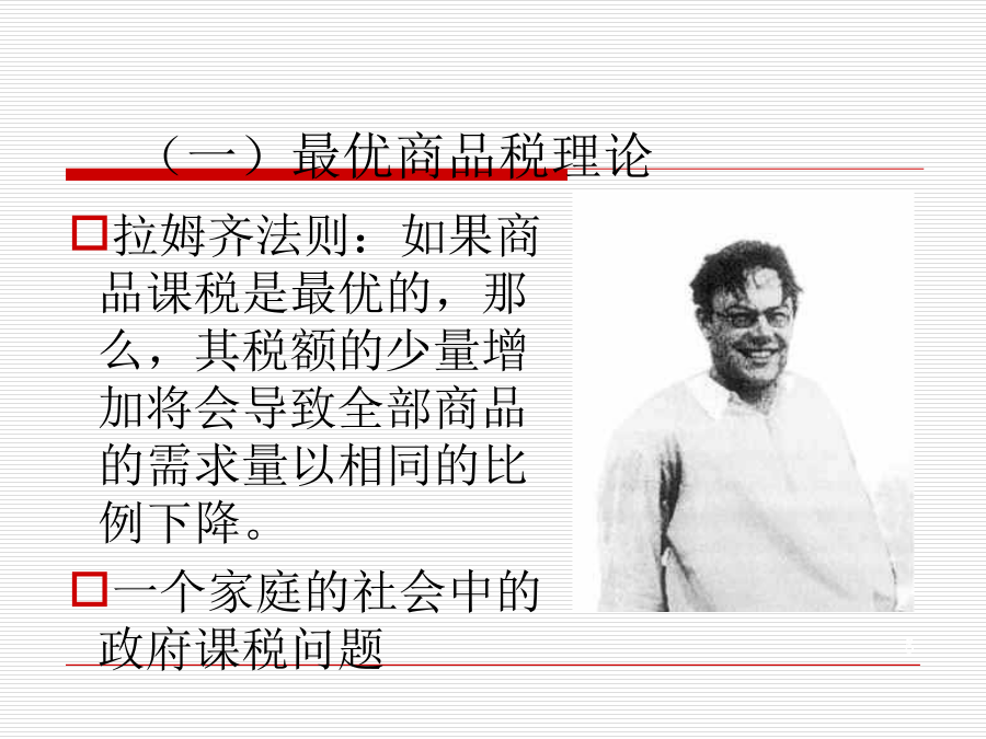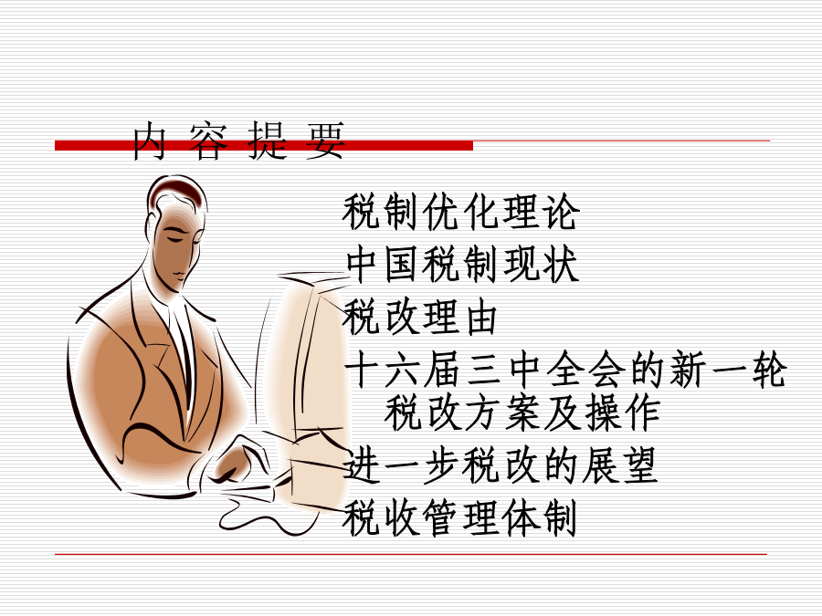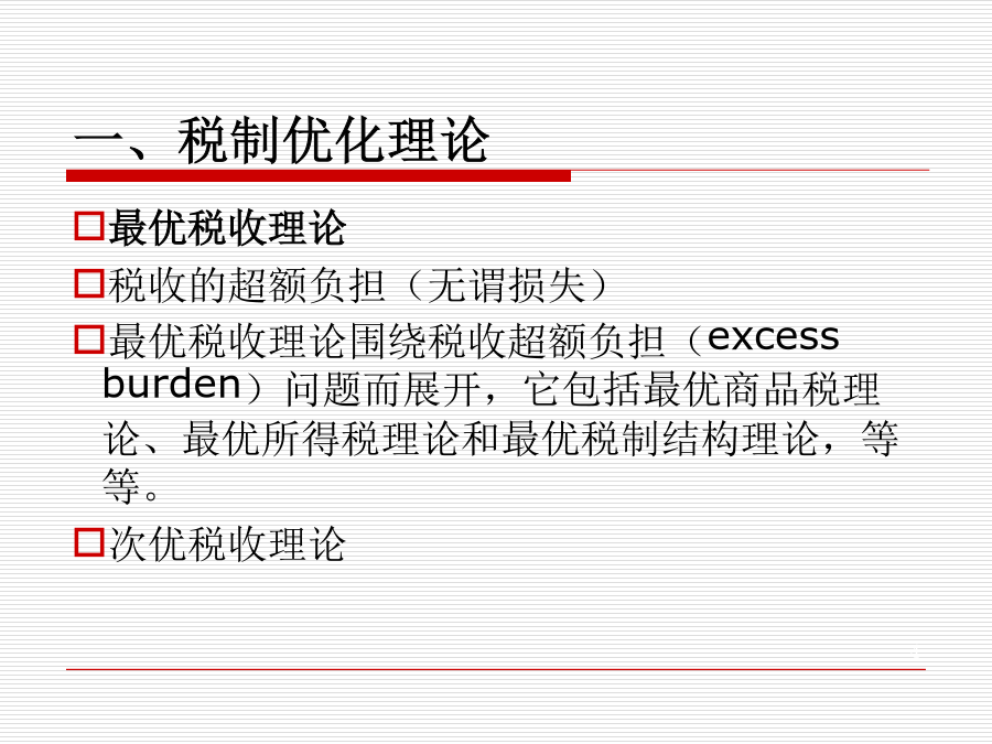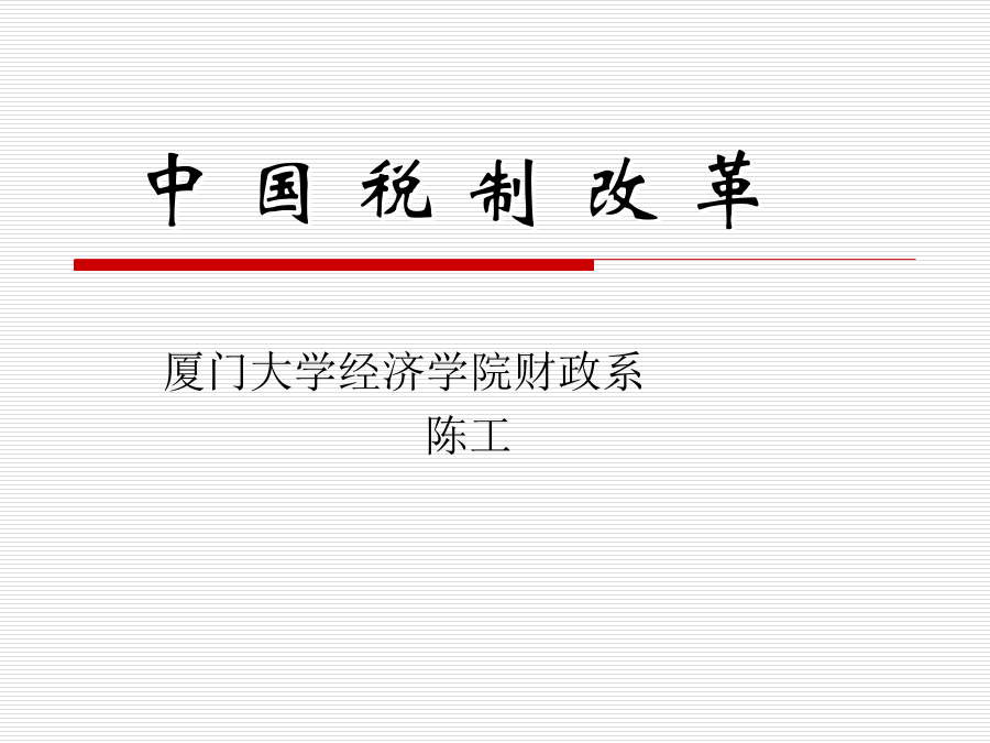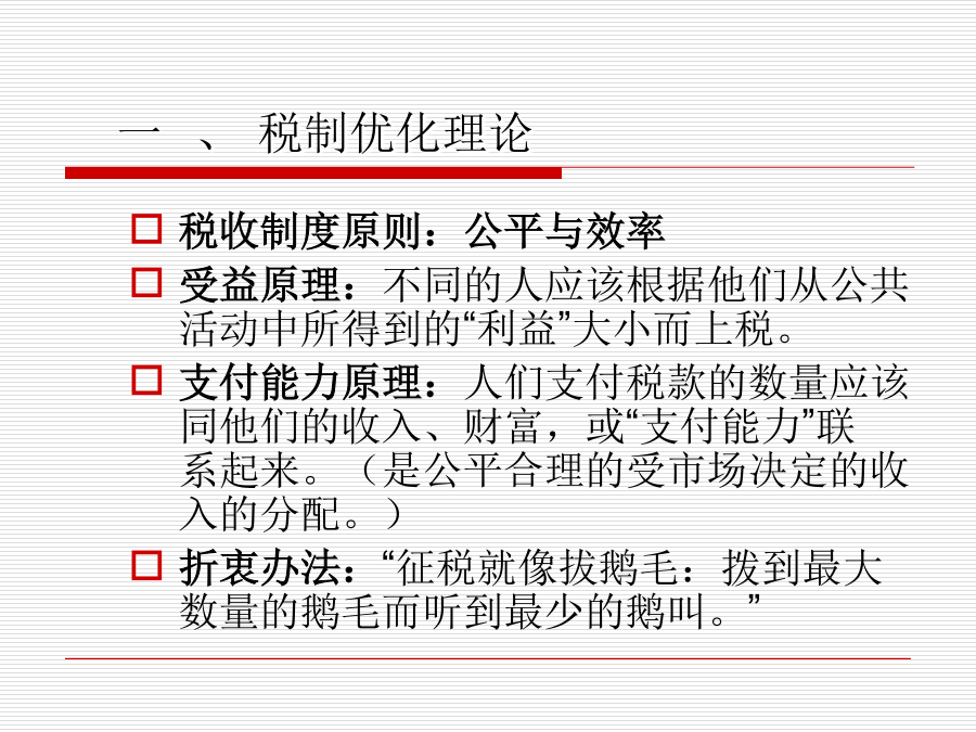 中国税制改革税制优化理论 中国税制现状 税改理由 十六届三中全会的新一轮税改方案及操作 进一步税改的展望 税收管理体制一、税制优化理论一、税制优化理论(一)最优商品税理论(一)最优商品税理论(二)最优所得税理论(二)最优所得税理论(三)最优税制结构理论(四)税制设计理论(四)税制设计理论(五)真实世界中的最优税收(五)真实世界中的最优税收(五)真实世界中的最优税收(六)税制改革与税制设计(六)税制改革与税制设计(六)税制改革与税制设计(六)税制改革与税制设计(七)拉菲尔的描述(八)减税的有关看法二、中国税制现状认识中国税收1:税收的地位认识中国税收2:现行税制认识中国税收3:收入结构(2008)认识中国税收4:税种分布(2008)认识中国税收6:区域分布(2008)认识中国税收7:所有制分布(2008)三、税改的理由改革开放以来我国税制改革主要取向税改的理由2:罕见而特殊的轨迹税改的理由3:2008新高台税改的理由4:两个增幅之比较税改的理由5:GDP分配格局的变化GDP分配格局的变化07年国家财政税收总体上是翻了5.7倍,城镇居民人均可支配收入在12年里面翻了1.6倍,农民的人均纯收入翻了1.2倍。国家群体分享经济增长所带来的好处时,占的份额是最多的 07年美国联邦政府的财政税收为2.5万亿美元,相当于8500万美国人一年的收入。07年我国财政税收是5万1千亿人民币,相当于3.7亿城镇居民一年的可支配收入,12.3亿农民的纯收入。(资产性收入除外,工资的上涨是我们最主要分享经济增长的渠道。有资料显示,中国家庭拥有的人均财富大约为人均GDP的1.7倍,远低于美国的4倍和澳大利亚的3.7倍,也不如印度的2.4倍。)税改的理由6:一般规律税改的理由7:增值税实征率税改的理由8:税种结构与设置四、十六届三中全会的新一轮税改税改方案1:十六届三中全会《决定》税改方案2:“十一五”规划税改进程盘点:已实施项目税改的操作1:增值税转型税改的操作2:“两税合一”税改的操作3:个人所得税任重道远税改的操作4:开征物业税税改的操作5:开征资源税税改的操作5:开征资源税五、我国税制改革的展望合理调整税负水平优化税制结构完善各个税种、特别是主体税种增值税的完善完善消费税完善营业税完善企业所得税完善个人所得税完善房地产税完善资源税值得探讨研究的税种设置问题反对目前开征遗产税的八大理由六、我国税收管理体制的完善(二)现行税收管理体制存在的主要问题(二)现行税收管理体制存在的主要问题(二)现行税收管理体制存在的主要问题(三)导致问题产生的原因(四)改革和完善现行税收管理体制1.以深化经济性分权为依托,调整税收归属权配置,逐步实现中央与地方税收分配关系由“税额分享型”向“税种分设型”转变2.以强化法律性分权为基础,完善税收立法权配置,逐步实现税政管理职能由“高度集中型”向“适度分散型”转变。3.以优化组织性分权为保障,改进税收征管权配置,逐步实现国地税机构分设由“职能交叉型”向“相对独立型”转变。