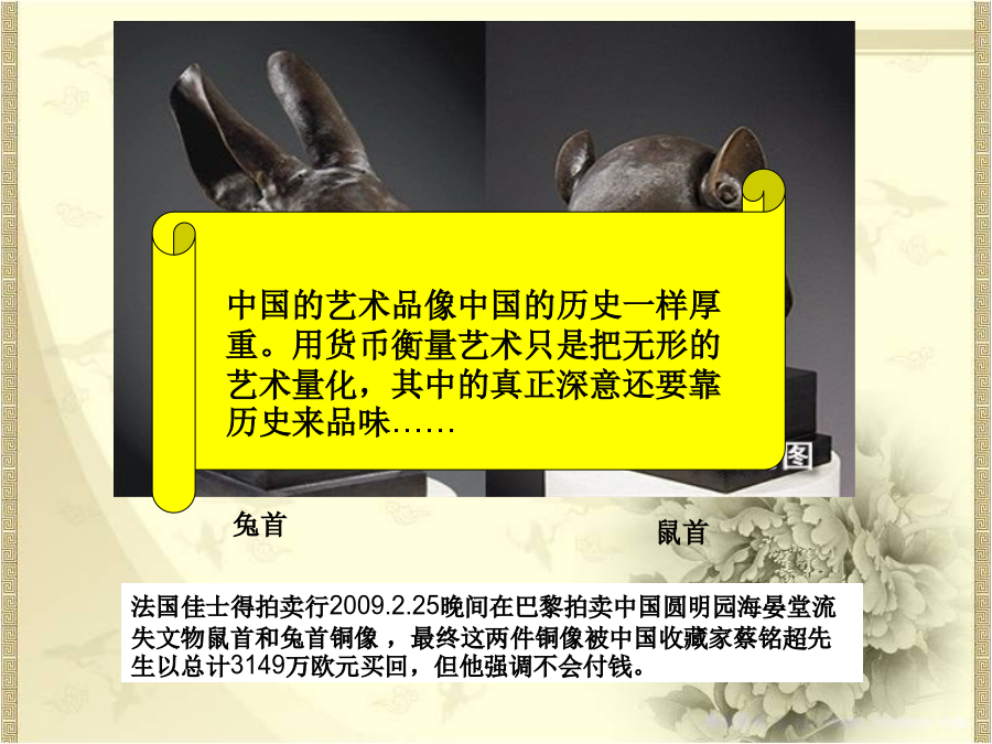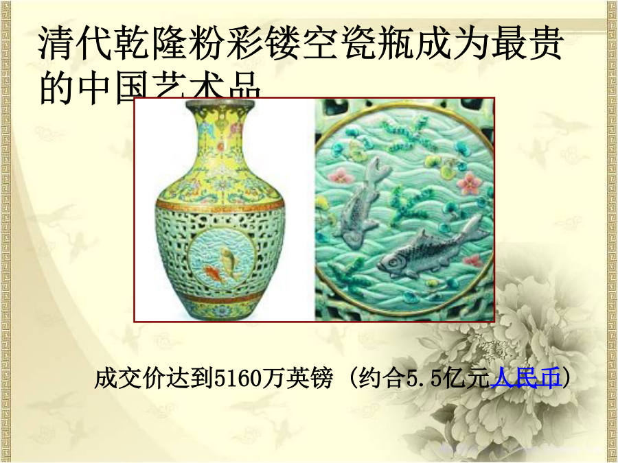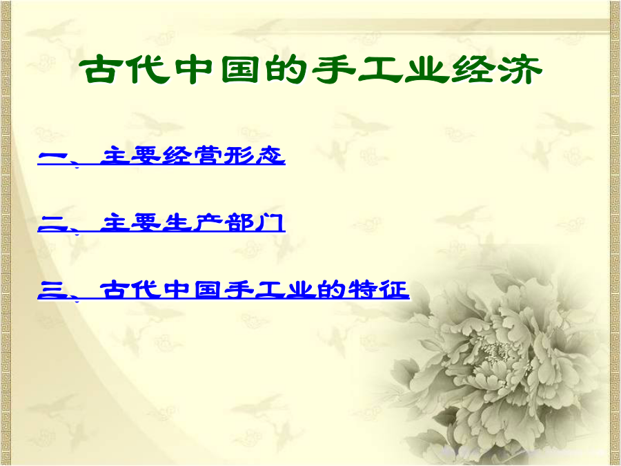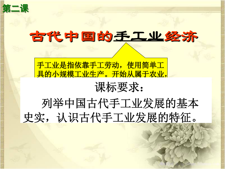 1568万英镑,折合2.3亿元人民币清代乾隆粉彩镂空瓷瓶成为最贵的中国艺术品兔首古代中国的手工业经济古代中国的手工业经济一、古代中国手工业的主要经营形态(自主阅读)3、官营手工业(“工官”和匠户)(1)、新石器时代:纺织业萌芽(①原料:麻、葛、丝 ②工具:骨梭、骨针③技术:人工育蚕和丝织技术等)◆古代中国纺织业发展主要特点安泰是个虚拟人物,他穿越时空隧道。来到新石器时代,他发现那时几乎家家户户都靠种桑养蚕为生。 接着他来到唐代,发现唐朝经济比较发展,纺织作坊也比较多,即有官营的,也有私营的。后来他参观了一家私营作坊,惊奇地发现那里纺织出了一件精美绝伦的禅衣,那禅衣晶莹剔透,华美轻巧,重仅49克,真是爱不释手。 之后他又来到了宋代,走在大街上,他发现那时市场上到处都销售棉衣,老百姓们也个个都穿起棉衣,棉衣成为最常见衣服。他自己也买了一件宋朝棉衣继续悠然地走着…… 2、攻金之术---冶炼业发展历程人力鼓风东汉杜诗发明水排(4)南北朝时期:灌钢法 (5)北宋时期:已经有了以煤作为燃料冶铁的明确记载。提高了冶铁业的生产效率。 3、陶瓷业发展历程想一想china=中国“目前中国瓷器在世界排名第六、七位上徘徊,世界各地大饭店根本不用中国瓷器,很多器物只能在国外地摊上卖:无论是工艺、原料都落后了。现在国外用动物骨头做原料,配上瓷土,既白又轻,图案新颖,细腻精美,好的一只盆子值我们一桌青花瓷的钱。丝新石器时代遗址中发现陶纺轮、骨梭、骨针、骨锥,是简单的纺织工具.解说语:1972年在中国湖南省长沙马王堆汉墓一号墓出土,国家一级文物,现藏于湖南省博物馆。面料为素纱,缘为几何纹绒圈锦。素纱丝缕极细,共用料约2.6平方米,重仅49克,还不到一两。可谓“薄如蝉翼”、“轻若烟雾”,且色彩鲜艳,纹饰绚丽。 它代表了西汉初养蚕、缫丝、织造工艺的最高水平。“赛里丝”我的眼里只有你—“赛里丝”司母戊鼎蕉叶形 纹理清晰酒 器陶器主要有黑陶、白陶和彩陶。解说语:唐三彩是一种盛行于唐代的陶器,以黄、白、绿为基本釉色,后来人们习惯地把这类陶器称为“唐三彩”。她以造型生动逼真、色泽艳丽和富有生活气息而著称,同时还吸取了中国国画、雕塑等工艺美术的特点。唐三彩的生产在中国已1300多年的历史。白瓷碗定窑:在河北曲阳,以烧造白釉瓷器为主,胎质薄而坚硬,瓷釉洁白莹润。装饰方法有划花、刻花、印花和捏塑等。 汝窑:在河南宝丰,以烧制青釉瓷器著称。釉面有细小的纹片,称为“蟹爪纹”。 哥窑:相传在浙江龙泉,开片较大,为冰裂纹或形成一种无规则的蜘蛛网线,叫百圾碎。 官窑:在河南开封,以烧制青釉瓷器著称于世,釉面多有开片。 钧窑:在河南禹州,产品有的青中带红,华而不俗,称为钧红; 玲珑瓷瓷器
