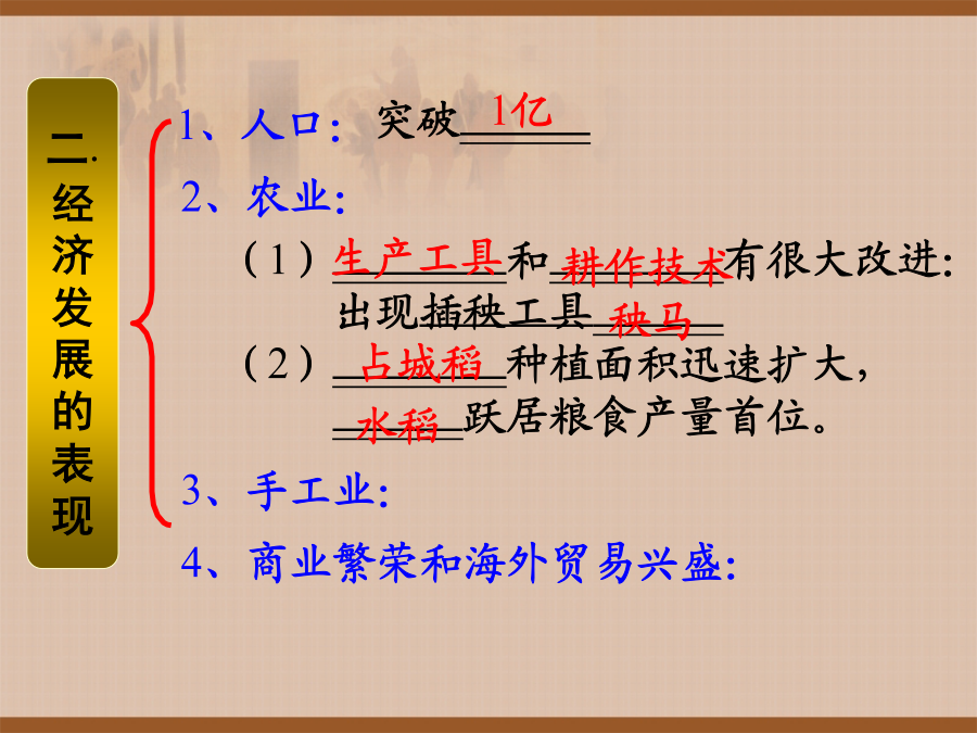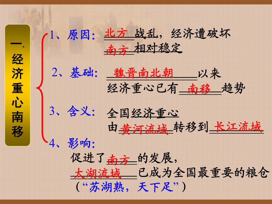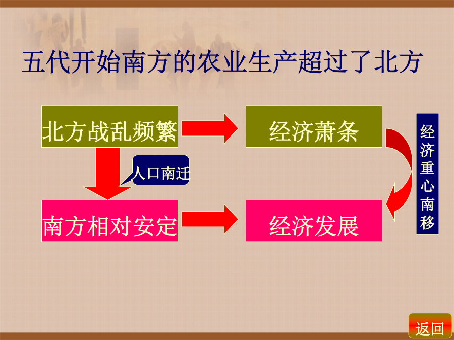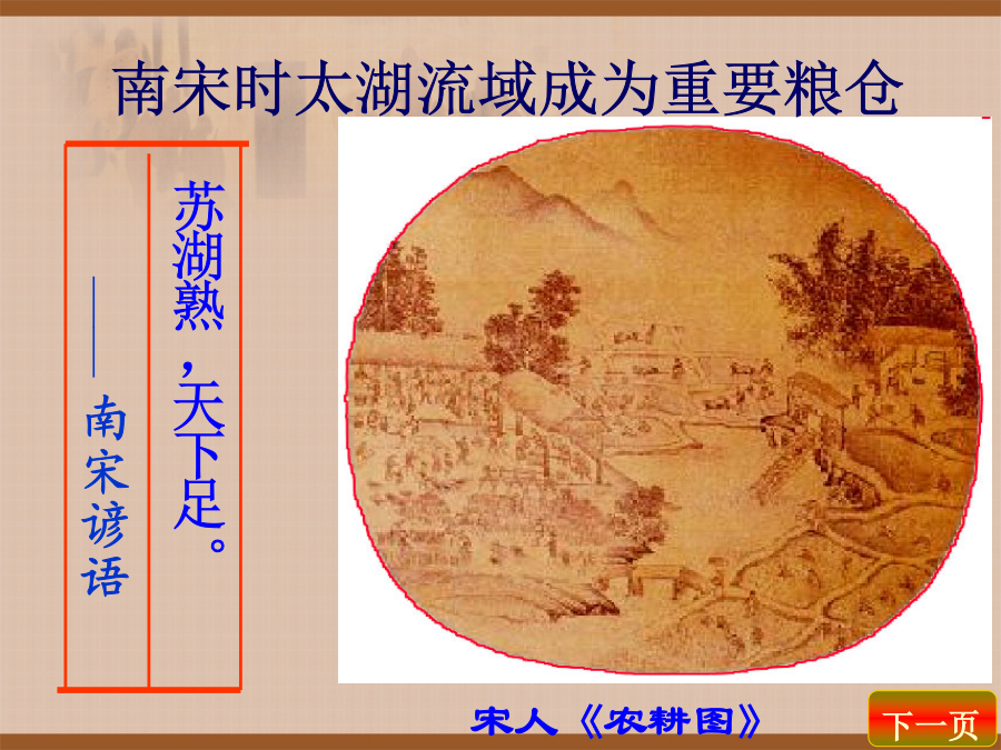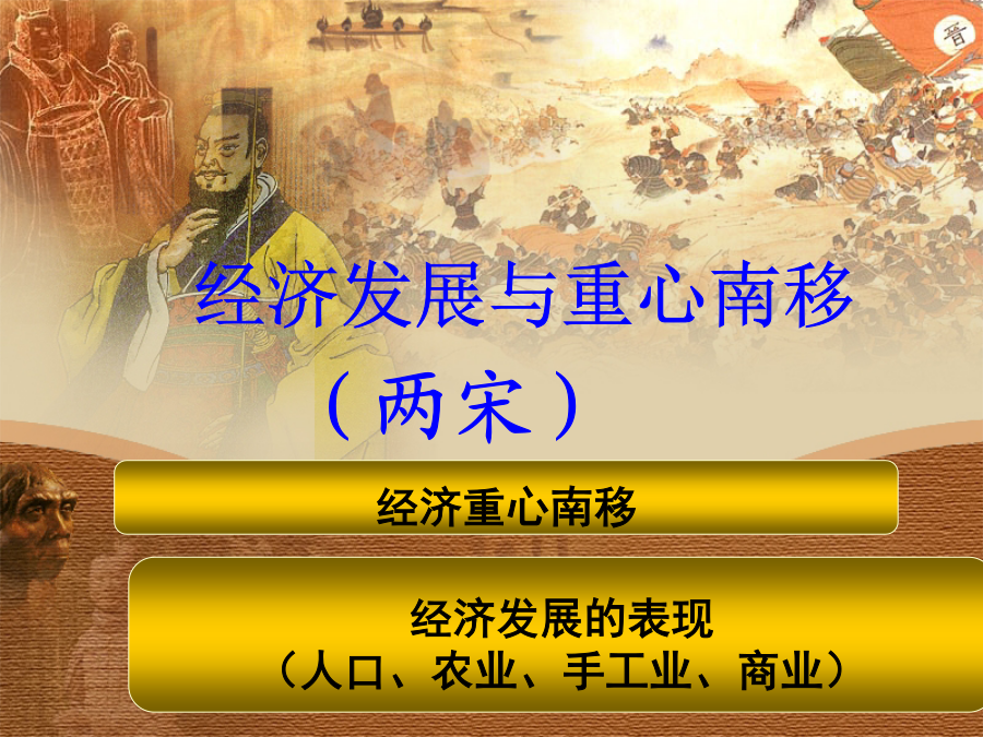 经济发展与重心南移一. 经 济 重 心 南 移五代开始南方的农业生产超过了北方苏湖熟,天下足。 ——南宋谚语二. 经 济 发 展 的 表 现两宋时水稻的推广棉花种植的推广二. 经 济 发 展 的 表 现宋人《纺车图》兴盛的采煤业哥窑瓷器定窑白瓷定窑孩儿枕景德镇青白瓷辽代鸡冠壶二. 经 济 发 展 的 表 现泉州出土的南宋海船北宋首都东京布局图纸币的出现临安(今浙江杭州)返回探究活动北宋张择端《清明上河图》提示课堂练习课堂练习中央电教馆资源中心制作