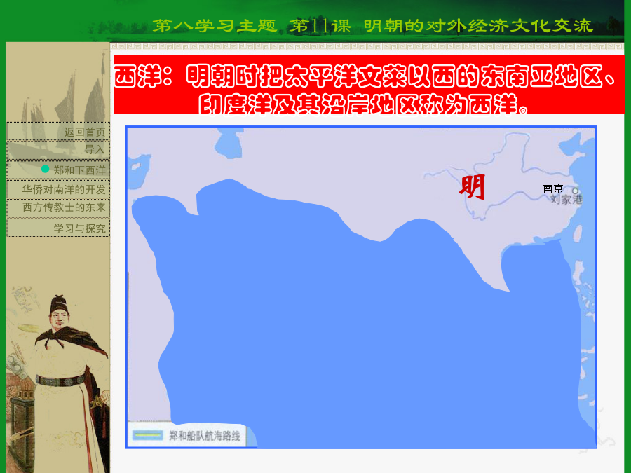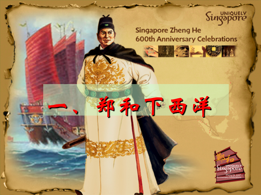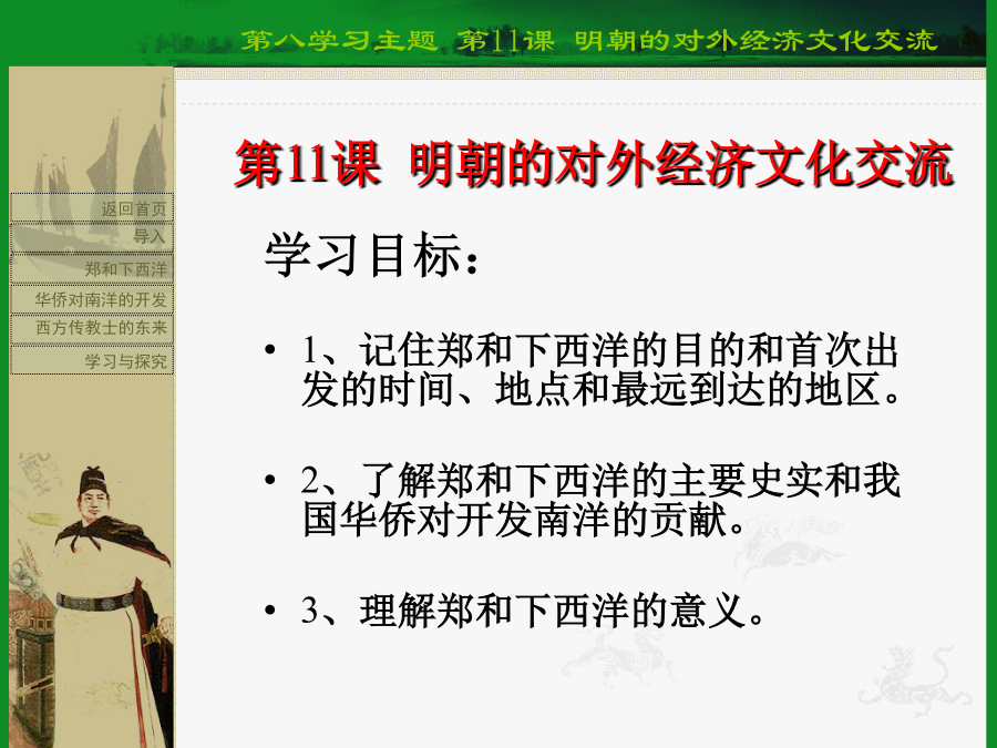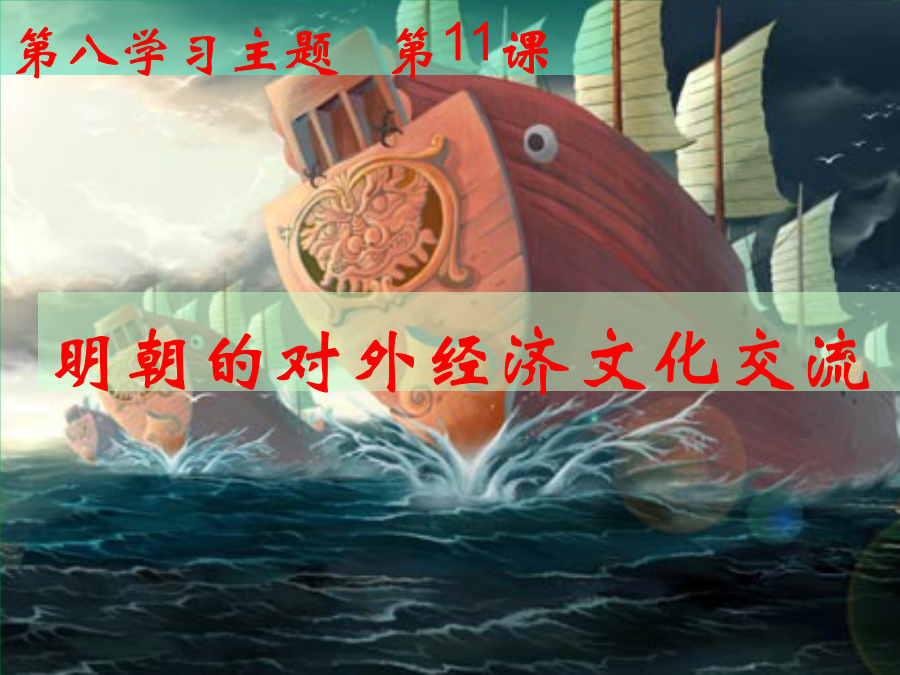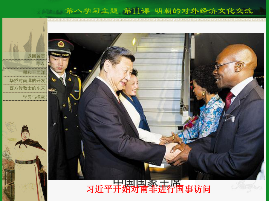 习近平开始对南非进行国事访问明朝的对外经济文化交流第11课明朝的对外经济文化交流一、郑和下西洋郑和下西洋的条件时间观夫海洋,洪涛接天,巨浪如山……而我之云帆高张,昼夜星驰,涉彼狂澜,若履通衢(qú)。 ——郑和要点回顾郑和下西洋给了我们怎样的启示?600年前郑和下西洋,600年后中国首艘航空母舰“辽宁”舰正式交接入列,结合这两件事谈谈你的中国梦。学习与探究练一练明成祖朱棣即位后,为加强与海外联系并宣扬国威,命郑和率领船队出使西洋。郑和下西洋是中国历史上空前的主动外交。其规模之大,历时之久、航程之远在世界航海史上也是空前的。他比欧洲航海家的远洋航行早半个多世纪。但是,郑和下西洋的目的不是发展海外贸易,它采取的不计经济效益的政策,给明朝造成巨大的经济负担。随着国力衰退,航海的壮举也悄然结束。阅读下列材料: 材料一:据《明史》记载:(郑和下西洋)“欲耀兵异域,示中国富强。”(即郑和下西洋是为了宣扬国威,显示中国的富强) 材料二:我国当代明史专家吴晗曾指出,郑和下西洋“其规模之大,人数之多,范围之广,那是历史上所未有的,就是明朝以后也没有。这样大规模的航海,在当时世界历史上也没有过。” 材料三:英国著名汉学家李约瑟这样评价郑和下西洋:东方的航海家……从不威胁他人的生存……他们全副武装,却从不征服异族…… 据上述材料,结合所学回答: (1)根据材料一回答郑和下西洋的目的是什么? (2)根据材料二、三概括指出郑和下西洋的特点? (3)结合所学知识指出郑和下西洋的历史意义。600多年前,郑和扬帆启航承载了中国的光荣和梦想; 600多年间,海洋铭刻着中华民族的遗憾和叹息; 600多年后,中国航母“辽宁舰”入列,世界将见证中国在东方和平的崛起。
