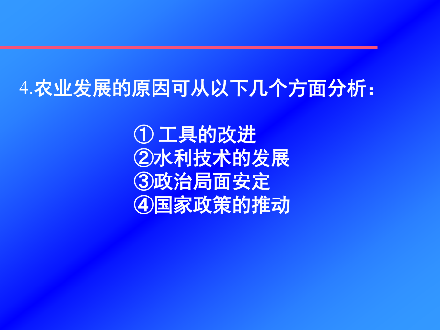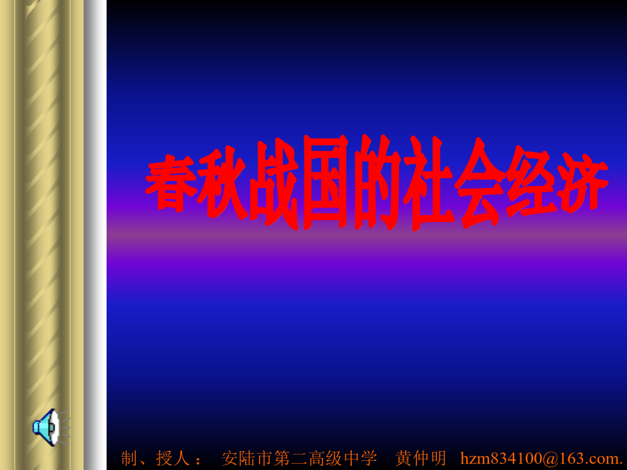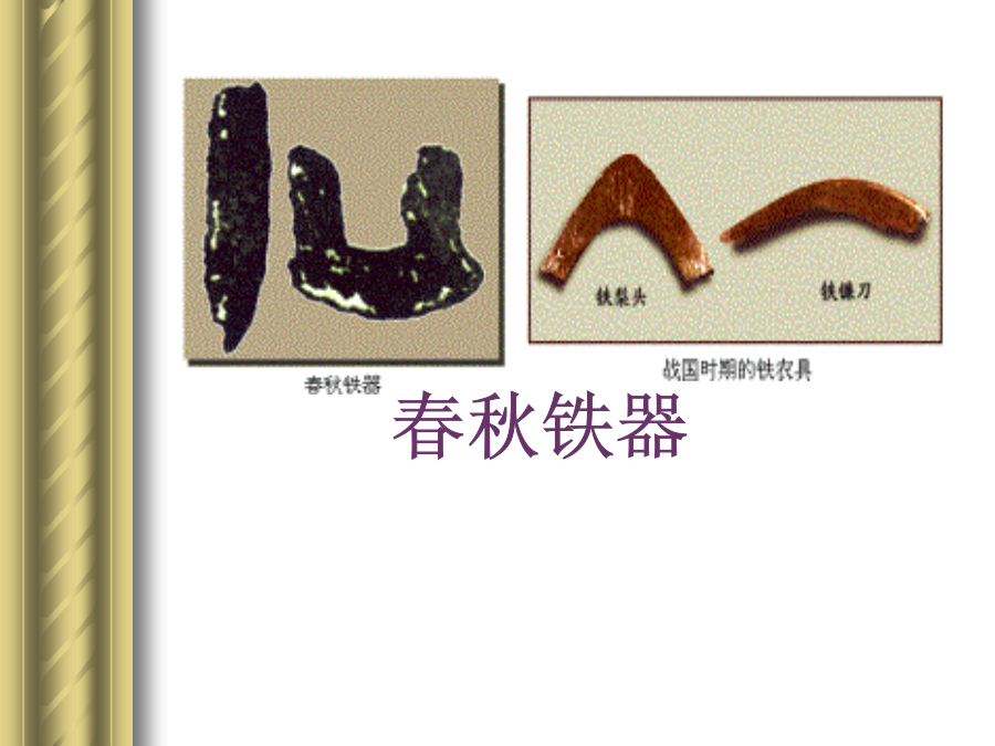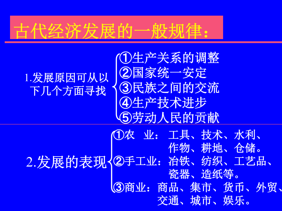 春秋战国的社会经济古代经济发展的一般规律:3.衰落的原因春秋铁器(一)铁农具使用的历史:(二)牛耕的普遍推广位于四川省成都市59公里处。这个工程采取在岷江中流作堰的方法,将岷江分为内、外二江,内江供农业灌溉,外江分洪。汹涌的岷江,经都江堰化险为夷,变害为利。两千多年来,都江堰滋润了大片土地,使川西平原成为“水旱从人,不知饥馑,沃野千里,世号陆海”的天府之国。 (二)牛耕的普遍推广郑国渠是战国时期由秦国水工郑国主持修建的又一大型水利工程。郑国渠沟通了泾水和北洛水,整个渠长三百多里,灌溉面积达四万多倾;关中地区因此而成为沃土。(二)牛耕的普遍推广作用二、手工业的发展冶铁业是战国时期最重要的手工业。那时候,不少炼铁炉用成排的橐进行鼓风、烧炭来提高炉温。同时,人们已经创造了铸铁柔化处理技术。这项发明要比欧洲早2000多年。该器1978年在湖北省随县出土,曾侯乙尊盘最令人称奇的,是用青铜铸成的层层叠叠的青铜透空附饰;这些附饰玲珑剔透、层次丰富、节奏鲜明;它是由非常先进的失蜡法铸造而成,说明当时的铸铜工艺已经达到了相当高的水平。曾侯乙尊盘被称为绝无仅有的稀世珍品。二、手工业的发展这是战国时期的彩漆木雕屏座,1965年在湖北江陵出土。整个屏座雕有凤、鹿、雀、蛙、蛇,并漆有黑、红、黄、绿等彩色。屏座上雕的动物形象生动逼真,漆器色泽华丽,是先秦时代木雕彩漆工艺的精品。二、手工业的发展这是1982年在湖北省江陵县出土的战国时期的丝织品。该绢图案鲜艳生动,蟠龙飞凤,绣工精细,反映出了战国时的丝织业已经具有较高的水平这件龙凤纹绣花绢现收藏在湖北省博物馆。二、手工业的发展三、商业和城市四、由公田到私田2.私田的增多带来的影响3.井田制与私田的对比:4.公田转化为私田的实质:课堂小结: