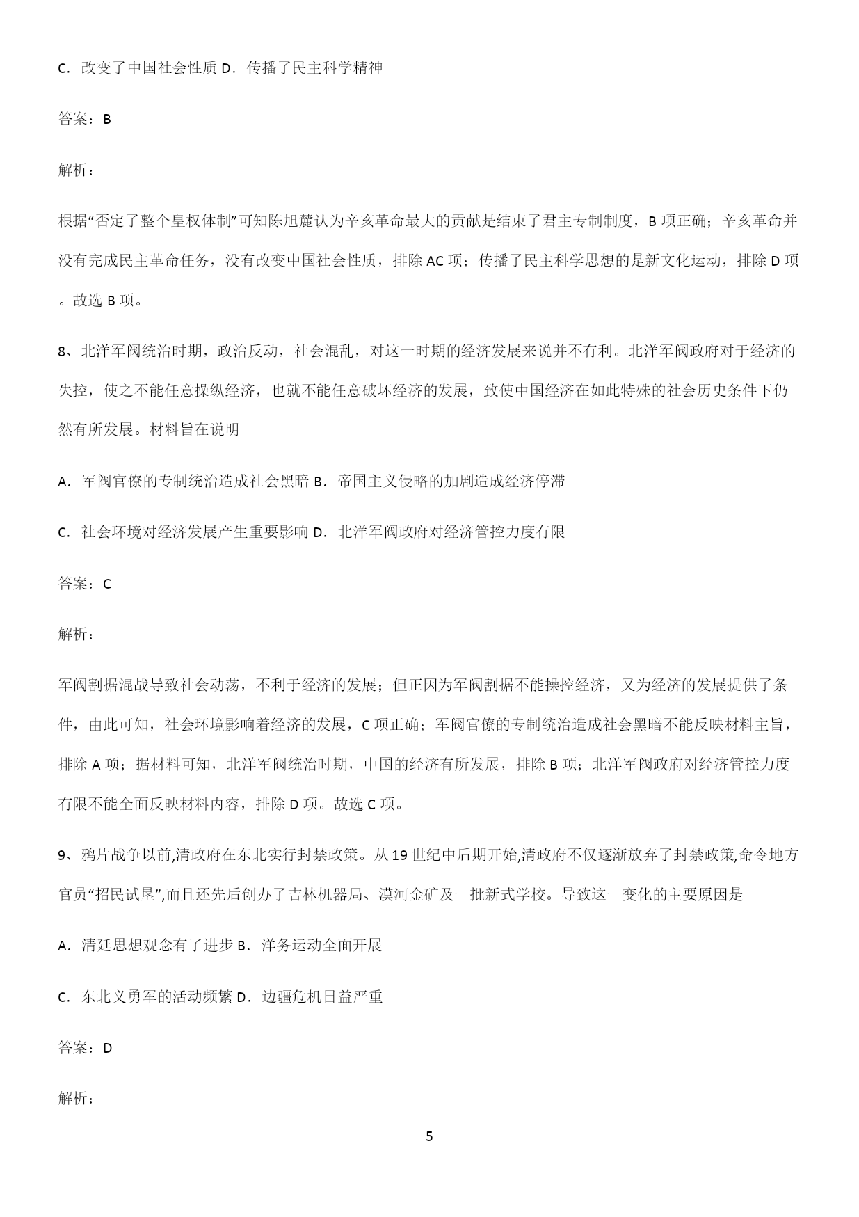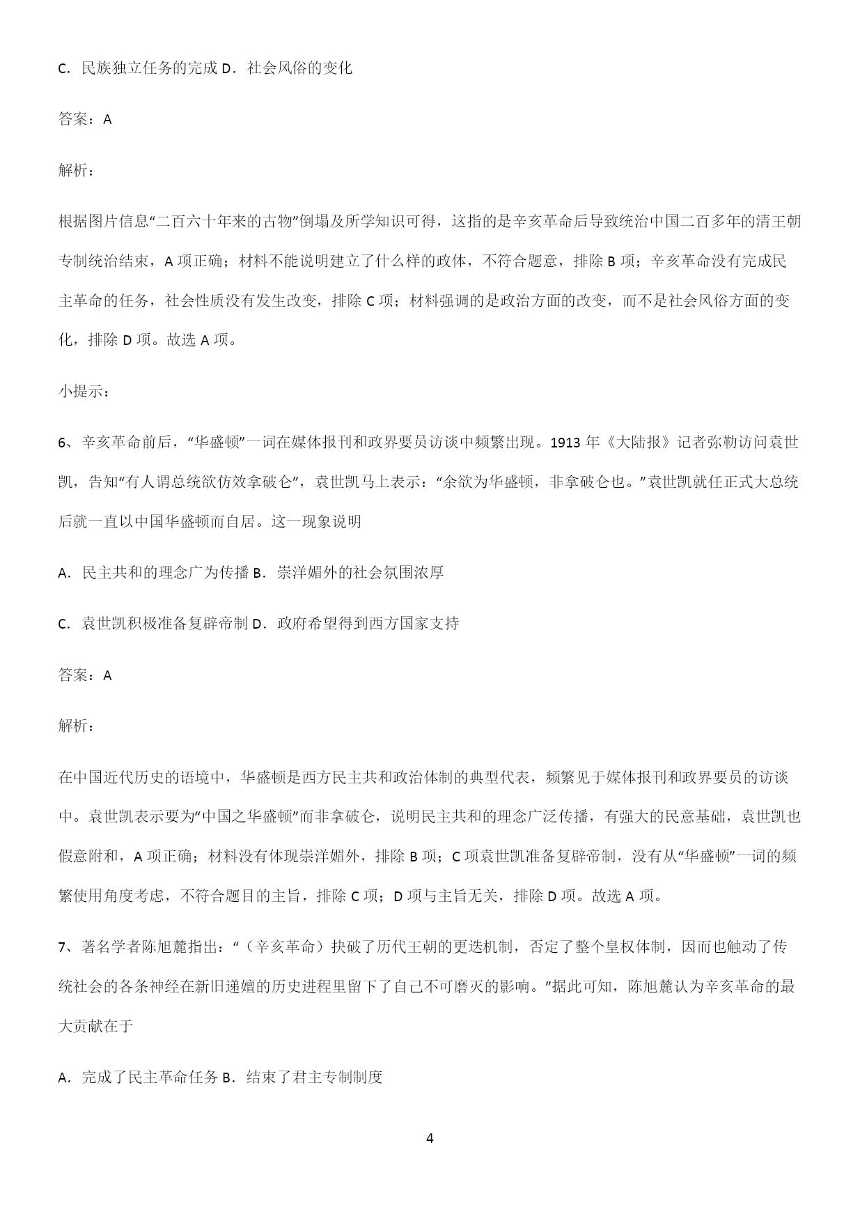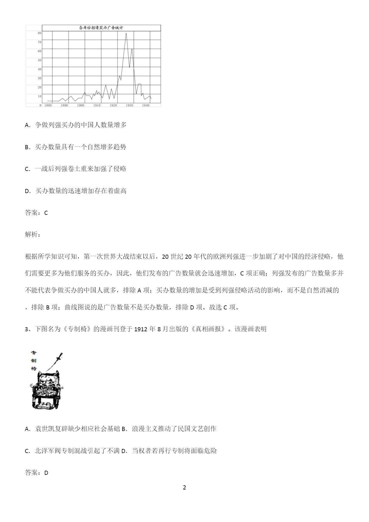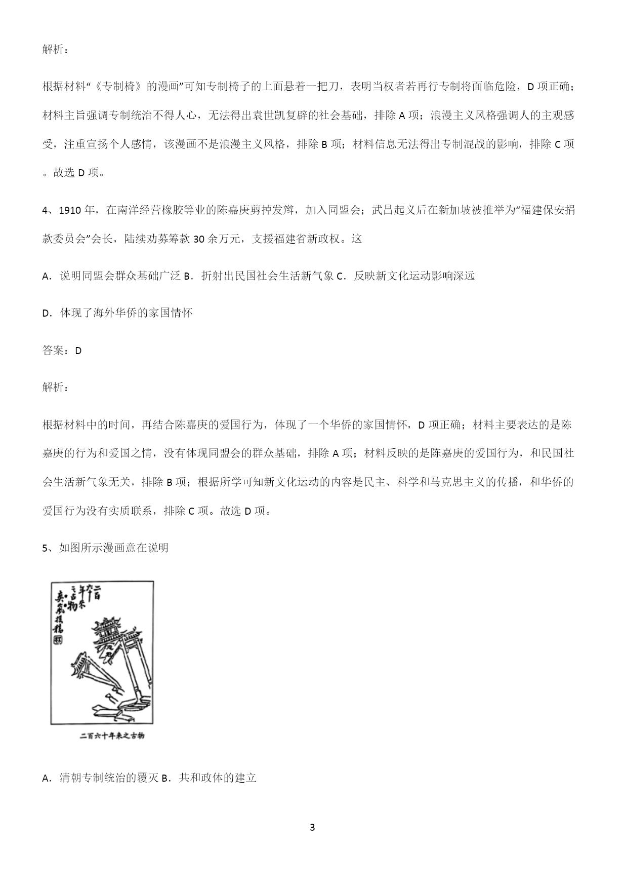 PAGE\*MERGEFORMAT1 通用版带答案高中历史上第六单元辛亥革命与中华民国的建立易混淆知识点 PAGE\*MERGEFORMAT22 单选题 1、下图是武昌起义后部分省份使用的旗帜图形 南京临时政府成立后,因为五色旗代表了清末民初最普遍的观念,参议院决定以五色旗为中华民国国旗,以十八星旗为陆军旗。这反映了 A.国家和民族至上的观念B.国家实现了形式上的统一 C.民主共和思想深入人心D.人民主权的原则得到确认 答案:A 解析: 依据图示信息可知,反映的是代表五族共和的五色旗和代表中国十八省的十八星旗,这反映了武昌起义后,国家和民族至上的观念,A项正确;当时国家没有实行形式上统一,国家实现了形式上的统一是在1927年,排除B项;材料只是部分省份使用的旗帜图形,不能说明民主共和思想深入人心,排除C项;材料不能体现人民主权原则,排除D项。故选A项。 2、如表是1878—1941年《申报》招请买办(是指中国近代史上,帮助西方与中国进行双边贸易的中国商人)广告数量曲线图。20世纪20年代广告数量迅速增加说明了 A.争做列强买办的中国人数量增多 B.买办数量具有一个自然增多趋势 C.一战后列强卷土重来加强了侵略 D.买办数量的迅速增加存在着虚高 答案:C 解析: 根据所学知识可知,第一次世界大战结束以后,20世纪20年代的欧洲列强进一步加剧了对中国的经济侵略,他们需要更多为他们服务的买办,因此,他们发布的广告数量就会迅速增加,C项正确;列强发布的广告数量多并不能代表争做买办的中国人就多,排除A项;买办数量的增加是受到列强侵略活动的影响,而不是自然消减的,排除B项;曲线图说的是广告数量不是买办数量,排除D项。故选C项。 3、下图名为《专制椅》的漫画刊登于1912年8月出版的《真相画报》。该漫画表明 A.袁世凯复辟缺少相应社会基础B.浪漫主义推动了民国文艺创作 C.北洋军阀专制混战引起了不满D.当权者若再行专制将面临危险 答案:D 解析: 根据材料“《专制椅》的漫画”可知专制椅子的上面悬着一把刀,表明当权者若再行专制将面临危险,D项正确;材料主旨强调专制统治不得人心,无法得出袁世凯复辟的社会基础,排除A项;浪漫主义风格强调人的主观感受,注重宣扬个人感情,该漫画不是浪漫主义风格,排除B项;材料信息无法得出专制混战的影响,排除C项。故选D项。 4、1910年,在南洋经营橡胶等业的陈嘉庚剪掉发辫,加入同盟会;武昌起义后在新加坡被推举为“福建保安捐款委员会”会长,陆续劝募筹款30余万元,支援福建省新政权。这 A.说明同盟会群众基础广泛B.折射出民国社会生活新气象C.反映新文化运动影响深远 D.体现了海外华侨的家国情怀 答案:D 解析: 根据材料中的时间,再结合陈嘉庚的爱国行为,体现了一个华侨的家国情怀,D项正确;材料主要表达的是陈嘉庚的行为和爱国之情,没有体现同盟会的群众基础,排除A项;材料反映的是陈嘉庚的爱国行为,和民国社会生活新气象无关,排除B项;根据所学可知新文化运动的内容是民主、科学和马克思主义的传播,和华侨的爱国行为没有实质联系,排除C项。故选D项。 5、如图所示漫画意在说明 A.清朝专制统治的覆灭B.共和政体的建立 C.民族独立任务的完成D.社会风俗的变化 答案:A 解析: 根据图片信息“二百六十年来的古物”倒塌及所学知识可得,这指的是辛亥革命后导致统治中国二百多年的清王朝专制统治结束,A项正确;材料不能说明建立了什么样的政体,不符合题意,排除B项;辛亥革命没有完成民主革命的任务,社会性质没有发生改变,排除C项;材料强调的是政治方面的改变,而不是社会风俗方面的变化,排除D项。故选A项。 小提示: 6、辛亥革命前后,“华盛顿”一词在媒体报刊和政界要员访谈中频繁出现。1913年《大陆报》记者弥勒访问袁世凯,告知“有人谓总统欲仿效拿破仑”,袁世凯马上表示:“余欲为华盛顿,非拿破仑也。”袁世凯就任正式大总统后就一直以中国华盛顿而自居。这一现象说明 A.民主共和的理念广为传播B.崇洋媚外的社会氛围浓厚 C.袁世凯积极准备复辟帝制D.政府希望得到西方国家支持 答案:A 解析: 在中国近代历史的语境中,华盛顿是西方民主共和政治体制的典型代表,频繁见于媒体报刊和政界要员的访谈中。袁世凯表示要为“中国之华盛顿”而非拿破仑,说明民主共和的理念广泛传播,有强大的民意基础,袁世凯也假意附和,A项正确;材料没有体现崇洋媚外,排除B项;C项袁世凯准备复辟帝制,没有从“华盛顿”一词的频繁使用角度考虑,不符合题目的主旨,排除C项;D项与主旨无关,排除D项。故选A项。 7、著名学者陈旭麓指出:“(辛亥革命)抉破了历代王朝的更迭机制,否定了整个皇权体制,因而也触动了传统社会的各条神经在新旧递嬗的历史进程里留下了自己不可磨灭的影响。”据此可知