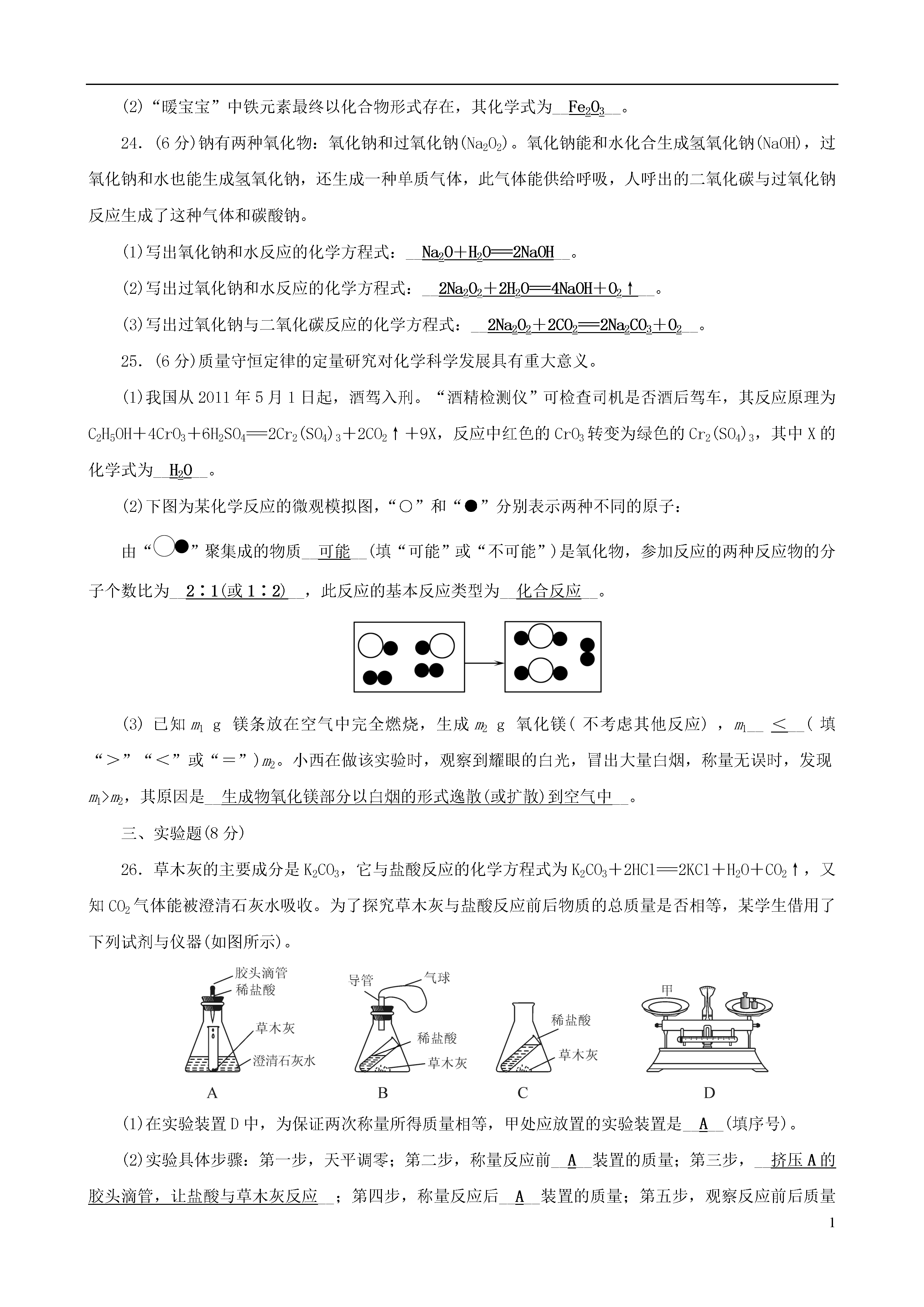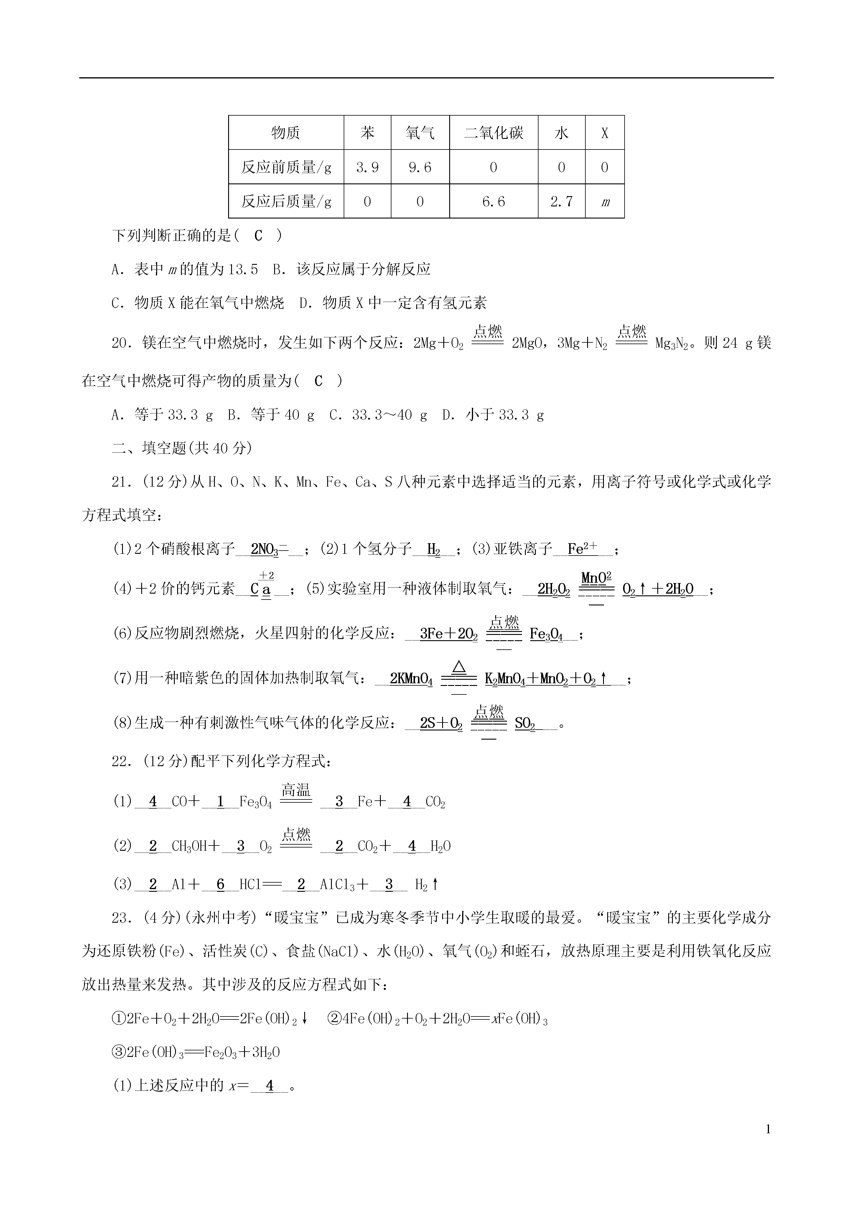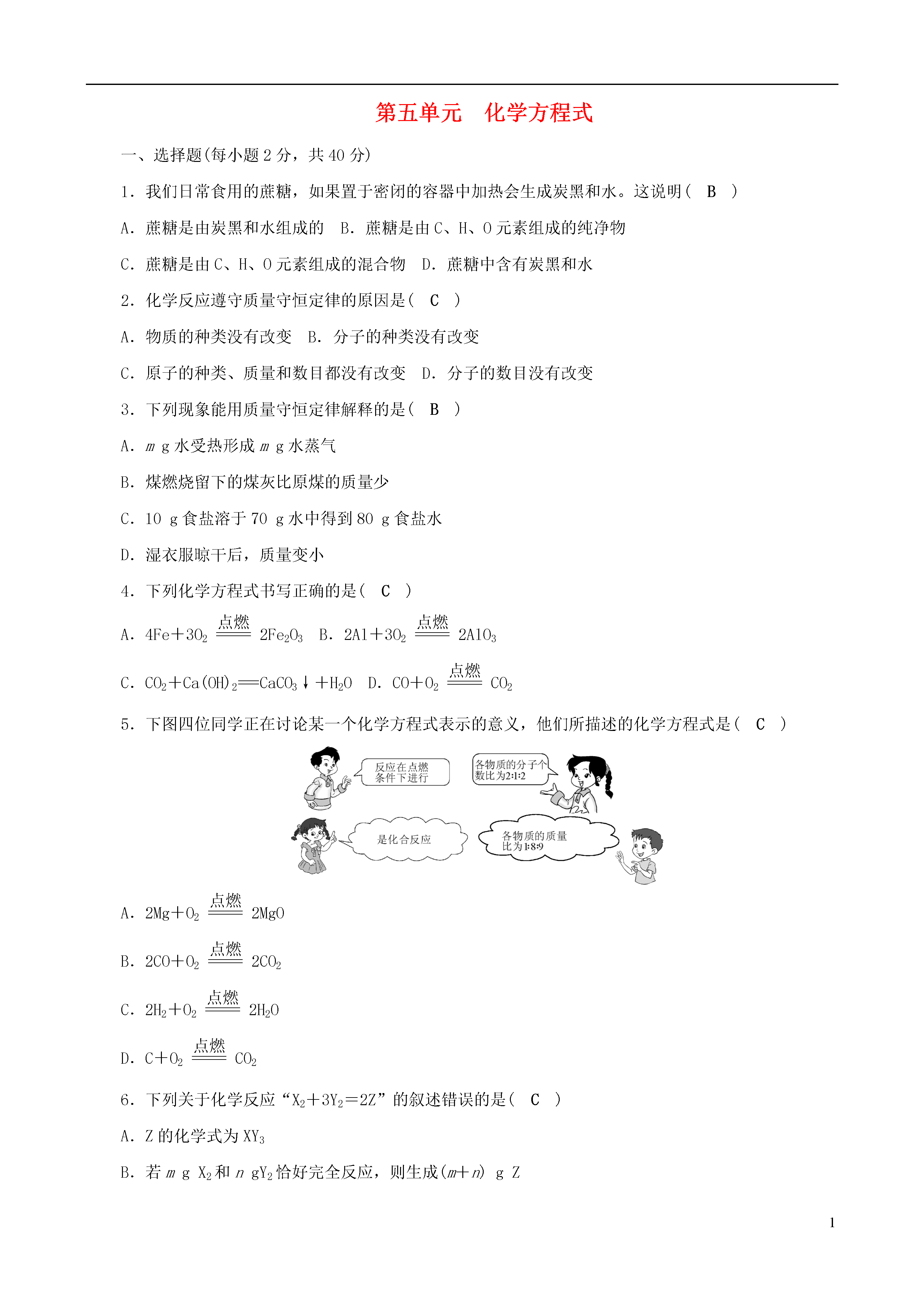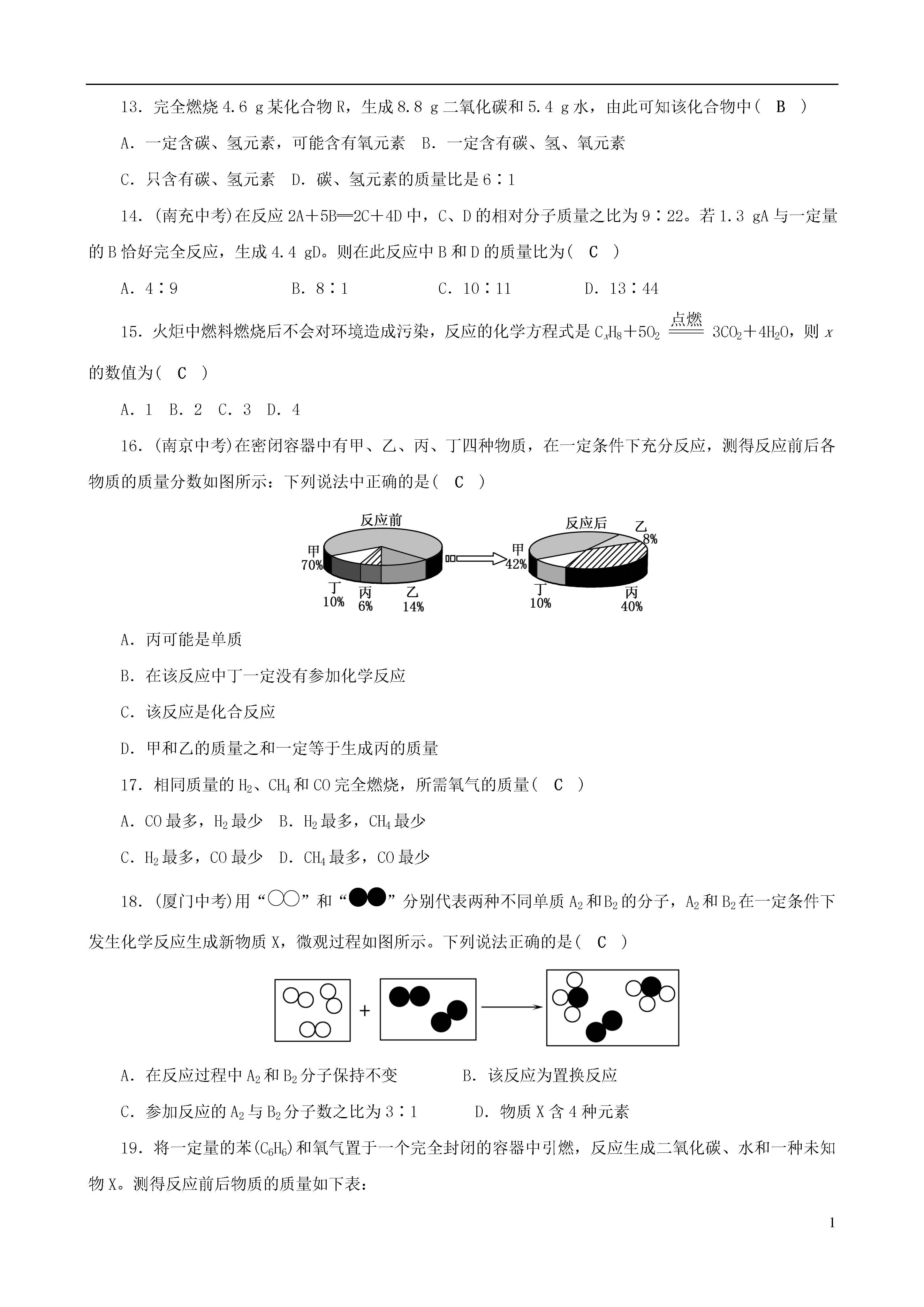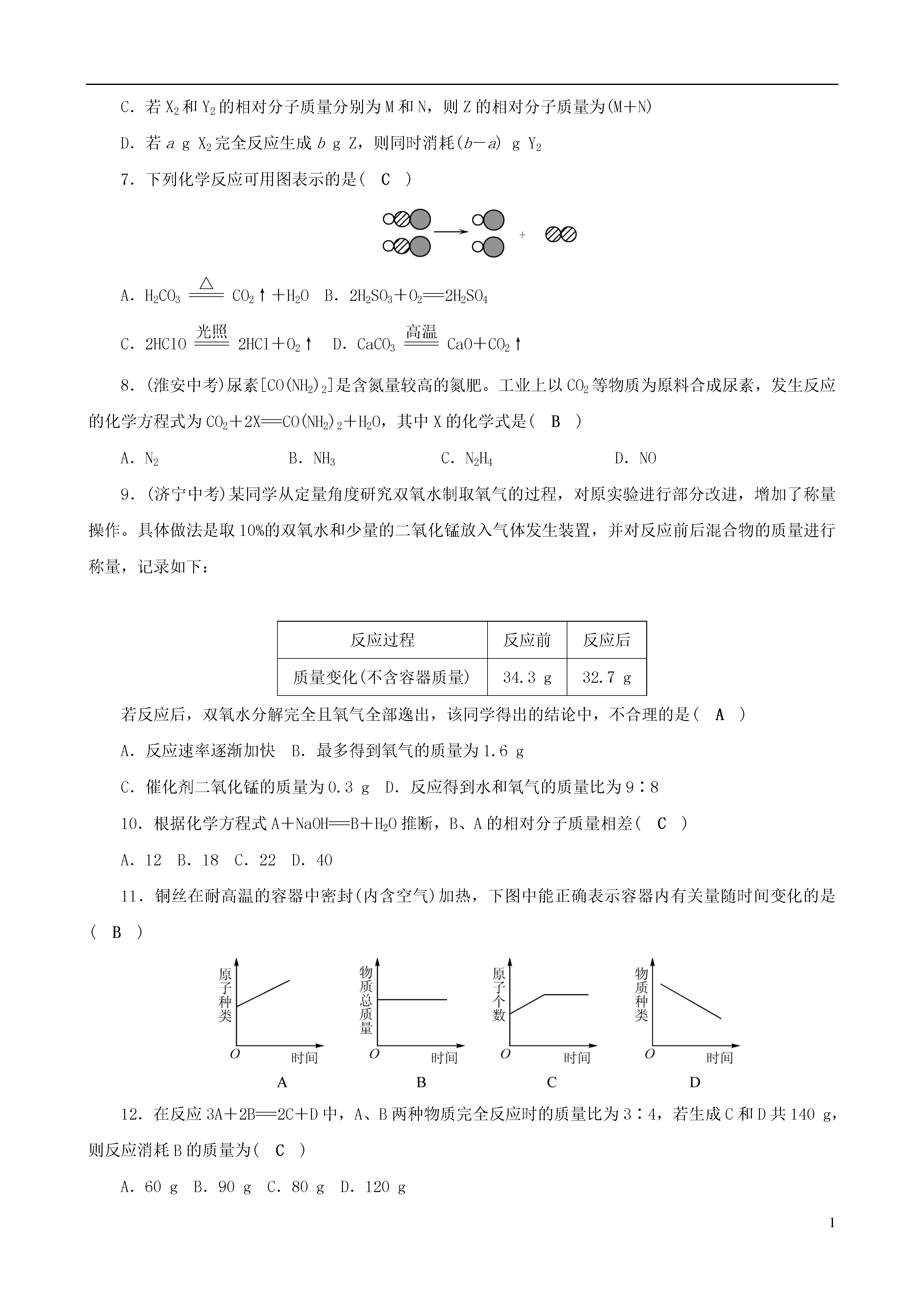 1第五单元化学方程式一、选择题(每小题2分,共40分)1.我们日常食用的蔗糖,如果置于密闭的容器中加热会生成炭黑和水。这说明(B)A.蔗糖是由炭黑和水组成的B.蔗糖是由C、H、O元素组成的纯净物C.蔗糖是由C、H、O元素组成的混合物D.蔗糖中含有炭黑和水2.化学反应遵守质量守恒定律的原因是(C)A.物质的种类没有改变B.分子的种类没有改变C.原子的种类、质量和数目都没有改变D.分子的数目没有改变3.下列现象能用质量守恒定律解释的是(B)A.mg水受热形成mg水蒸气B.煤燃烧留下的煤灰比原煤的质量少C.10g食盐溶于70g水中得到80g食盐水D.湿衣服晾干后,质量变小4.下列化学方程式书写正确的是(C)A.4Fe+3O2eq\o(=====,\s\up7(点燃))2Fe2O3B.2Al+3O2eq\o(=====,\s\up7(点燃))2AlO3C.CO2+Ca(OH)2===CaCO3↓+H2OD.CO+O2eq\o(=====,\s\up7(点燃))CO25.下图四位同学正在讨论某一个化学方程式表示的意义,他们所描述的化学方程式是(C)A.2Mg+O2eq\o(=====,\s\up7(点燃))2MgOB.2CO+O2eq\o(=====,\s\up7(点燃))2CO2C.2H2+O2eq\o(=====,\s\up7(点燃))2H2OD.C+O2eq\o(=====,\s\up7(点燃))CO26.下列关于化学反应“X2+3Y2=2Z”的叙述错误的是(C)A.Z的化学式为XY3B.若mgX2和ngY2恰好完全反应,则生成(m+n)gZC.若X2和Y2的相对分子质量分别为M和N,则Z的相对分子质量为(M+N)D.若agX2完全反应生成bgZ,则同时消耗(b-a)gY27.下列化学反应可用图表示的是(C)A.H2CO3eq\o(=====,\s\up7(△))CO2↑+H2OB.2H2SO3+O2===2H2SO4C.2HClOeq\o(=====,\s\up7(光照))2HCl+O2↑D.CaCO3eq\o(=====,\s\up7(高温))CaO+CO2↑8.(淮安中考)尿素[CO(NH2)2]是含氮量较高的氮肥。工业上以CO2等物质为原料合成尿素,发生反应的化学方程式为CO2+2X===CO(NH2)2+H2O,其中X的化学式是(B)A.N2B.NH3C.N2H4D.NO9.(济宁中考)某同学从定量角度研究双氧水制取氧气的过程,对原实验进行部分改进,增加了称量操作。具体做法是取10%的双氧水和少量的二氧化锰放入气体发生装置,并对反应前后混合物的质量进行称量,记录如下:反应过程反应前反应后质量变化(不含容器质量)34.3g32.7g若反应后,双氧水分解完全且氧气全部逸出,该同学得出的结论中,不合理的是(A)A.反应速率逐渐加快B.最多得到氧气的质量为1.6gC.催化剂二氧化锰的质量为0.3gD.反应得到水和氧气的质量比为9∶810.根据化学方程式A+NaOH===B+H2O推断,B、A的相对分子质量相差(C)A.12B.18C.22D.4011.铜丝在耐高温的容器中密封(内含空气)加热,下图中能正确表示容器内有关量随时间变化的是(B)12.在反应3A+2B===2C+D中,A、B两种物质完全反应时的质量比为3∶4,若生成C和D共140g,则反应消耗B的质量为(C)A.60gB.90gC.80gD.120g13.完全燃烧4.6g某化合物R,生成8.8g二氧化碳和5.4g水,由此可知该化合物中(B)A.一定含碳、氢元素,可能含有氧元素B.一定含有碳、氢、氧元素C.只含有碳、氢元素D.碳、氢元素的质量比是6∶114.(南充中考)在反应2A+5B═2C+4D中,C、D的相对分子质量之比为9∶22。若1.3gA与一定量的B恰好完全反应,生成4.4gD。则在此反应中B和D的质量比为(C)A.4∶9B.8∶1C.10∶11D.13∶4415.火炬中燃料燃烧后不会对环境造成污染,反应的化学方程式是CxH8+5O2eq\o(=====,\s\up7(点燃))3CO2+4H2O,则x的数值为(C)A.1B.2C.3D.416.(南京中考)在密闭容器中有甲、乙、丙、丁四种物质,在一定条件下充分反应,测得反应前后各物质的质量分数如图所示:下列说法中正确的是(C)A.丙可能是单质B.在该反应中丁一定没有参加化学反应C.该反应是化合反应D.甲和乙的质量之和一定等于生成丙的质量17.相同质量的H2、CH4和CO完全燃烧,所需氧气的质量(C)A.CO最多,H2