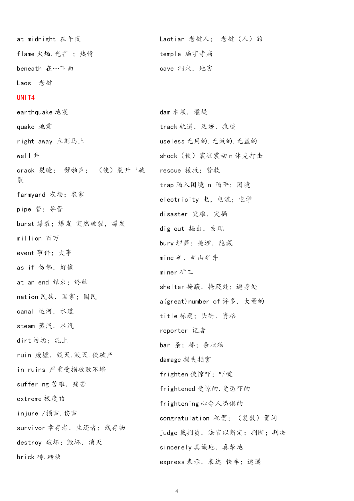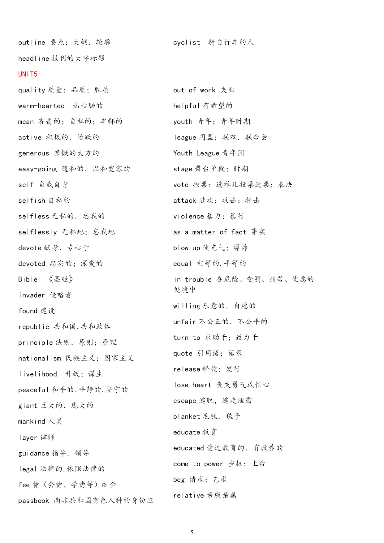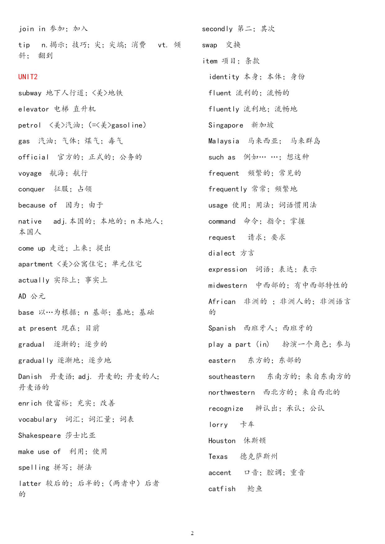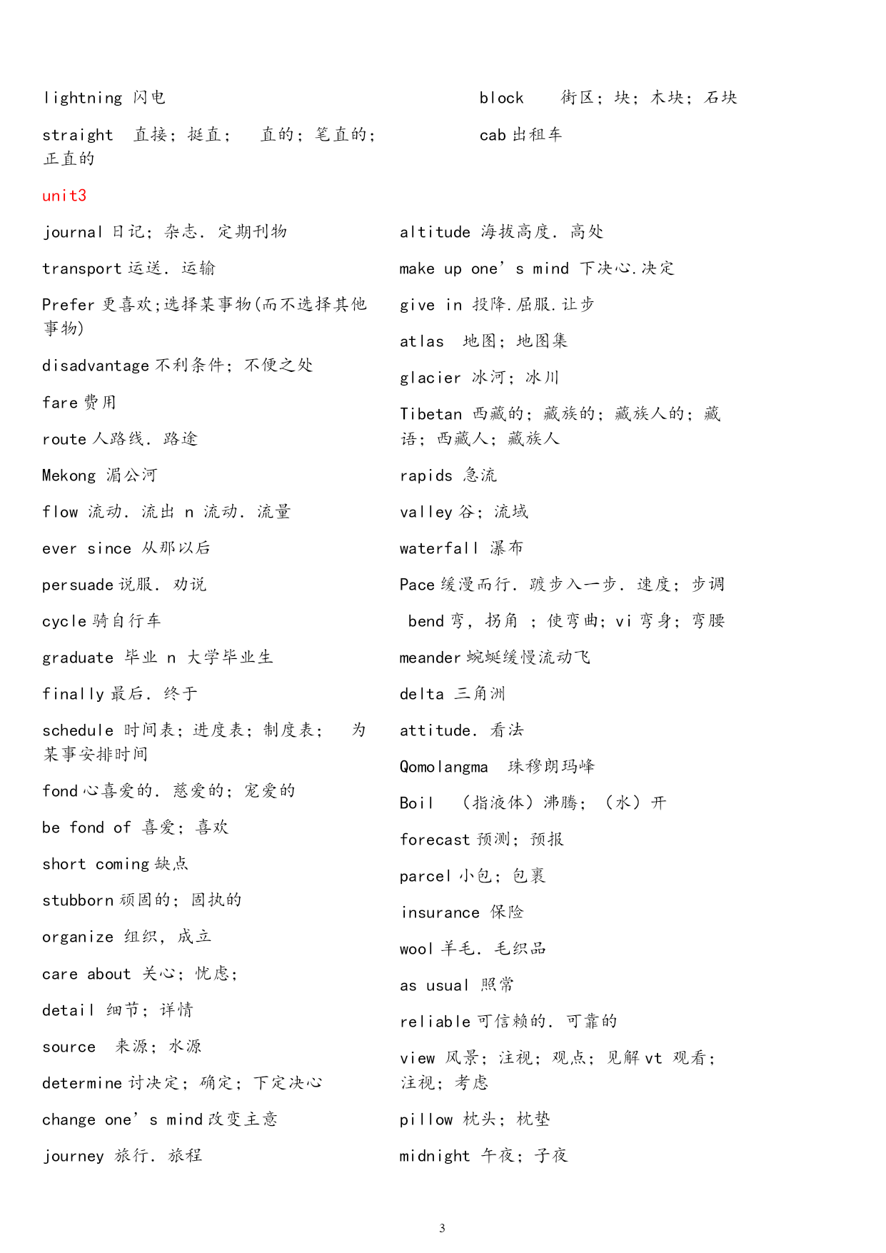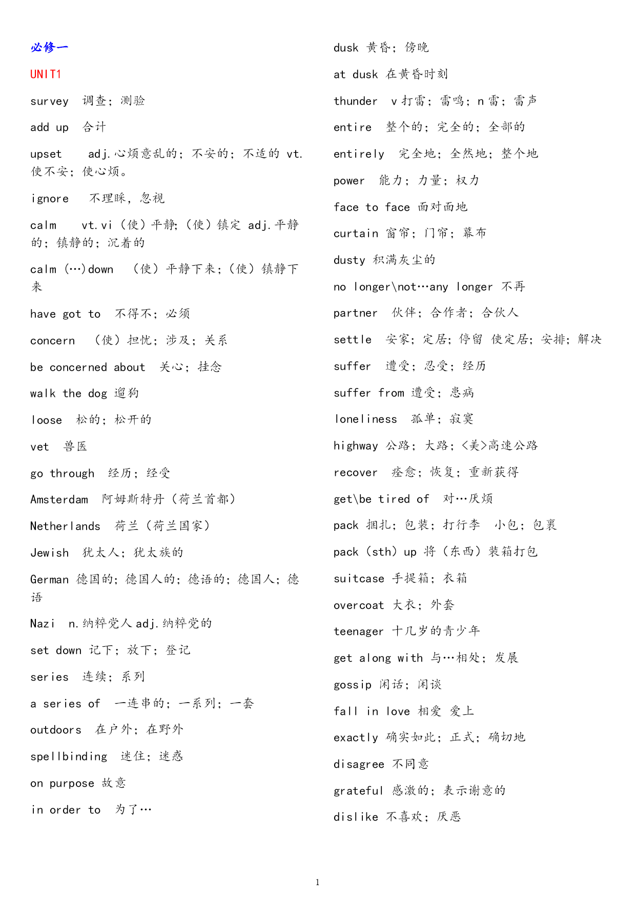 必修一 UNIT1 survey调查;测验 addup合计 upsetadj.心烦意乱的;不安的;不适的vt.使不安;使心烦。 ignore不理睬,忽视 calmvt.vi(使)平静;(使)镇定adj.平静的;镇静的;沉着的 calm(…)down(使)平静下来;(使)镇静下来 havegotto不得不;必须 concern(使)担忧;涉及;关系 beconcernedabout关心;挂念 walkthedog遛狗 loose松的;松开的 vet兽医 gothrough经历;经受 Amsterdam阿姆斯特丹(荷兰首都) Netherlands荷兰(荷兰国家) Jewish犹太人;犹太族的 German德国的;德国人的;德语的;德国人;德语 Nazin.纳粹党人adj.纳粹党的 setdown记下;放下;登记 series连续;系列 aseriesof一连串的;一系列;一套 outdoors在户外;在野外 spellbinding迷住;迷惑 onpurpose故意 inorderto为了… dusk黄昏;傍晚 atdusk在黄昏时刻 thunderv打雷;雷鸣;n雷;雷声 entire整个的;完全的;全部的 entirely完全地;全然地;整个地 power能力;力量;权力 facetoface面对面地 curtain窗帘;门帘;幕布 dusty积满灰尘的 nolonger\not…anylonger不再 partner伙伴;合作者;合伙人 settle安家;定居;停留使定居;安排;解决 suffer遭受;忍受;经历 sufferfrom遭受;患病 loneliness孤单;寂寞 highway公路;大路;<美>高速公路 recover痊愈;恢复;重新获得 get\betiredof对…厌烦 pack捆扎;包装;打行李小包;包裹 pack(sth)up将(东西)装箱打包 suitcase手提箱;衣箱 overcoat大衣;外套 teenager十几岁的青少年 getalongwith与…相处;发展 gossip闲话;闲谈 fallinlove相爱爱上 exactly确实如此;正式;确切地 disagree不同意 grateful感激的;表示谢意的 dislike不喜欢;厌恶 joinin参加;加入 tipn.揭示;技巧;尖;尖端;消费vt.倾斜;翻到 secondly第二;其次 swap交换 item项目;条款 UNIT2 subway地下人行道;<美>地铁 elevator电梯直升机 petrol<美>汽油;(=<美>gasoline) gas汽油;气体;煤气;毒气 official官方的;正式的;公务的 voyage航海;航行 conquer征服;占领 becauseof因为;由于 nativeadj.本国的;本地的;n本地人;本国人 comeup走近;上来;提出 apartment<美>公寓住宅;单元住宅 actually实际上;事实上 AD公元 base以…为根据;n基部;基地;基础 atpresent现在;目前 gradual逐渐的;逐步的 gradually逐渐地;逐步地 Danish丹麦语;adj.丹麦的;丹麦的人;丹麦语的 enrich使富裕;充实;改善 vocabulary词汇;词汇量;词表 Shakespeare莎士比亚 makeuseof利用;使用 spelling拼写;拼法 latter较后的;后半的;(两者中)后者的 identity本身;本体;身份 fluent流利的;流畅的 fluently流利地;流畅地 Singapore新加坡 Malaysia马来西亚;马来群岛 suchas例如……;想这种 frequent频繁的;常见的 frequently常常;频繁地 usage使用;用法;词语惯用法 command命令;指令;掌握 request请求;要求 dialect方言 expression词语;表达;表示 midwestern中西部的;有中西部特性的 African非洲的;非洲人的;非洲语言的 Spanish西班牙人;西班牙的 playapart(in)扮演一个角色;参与 eastern东方的;东部的 southeastern东南方的;来自东南方的 northwestern西北方的;来自西北的 recognize辨认出;承认;公认 lorry卡车 Houston休斯顿 Texas德克萨斯州 accent口音;腔调;重音 catfish鲶鱼 lightning闪电 straight直接;挺直;直的;笔直的;正直的 block街区;块;木块;石块 cab出租车 unit3 journal日记;杂志.定期刊物 transport运送.运输 Prefer更喜欢;选择某事物(而不选择其他事物) di