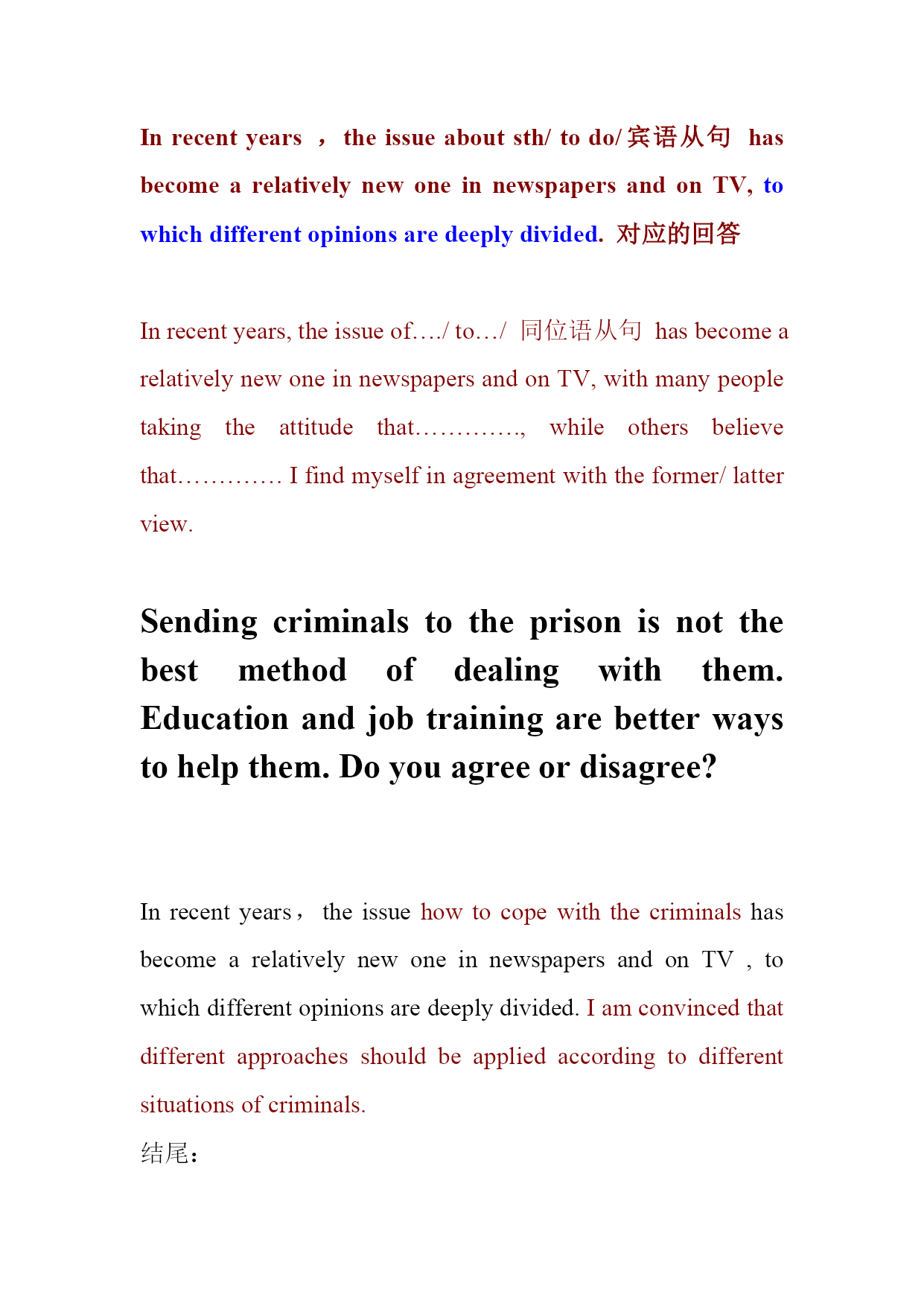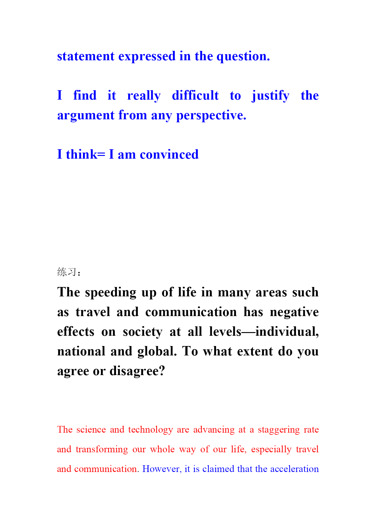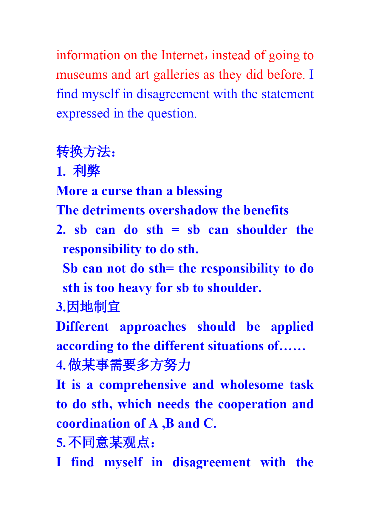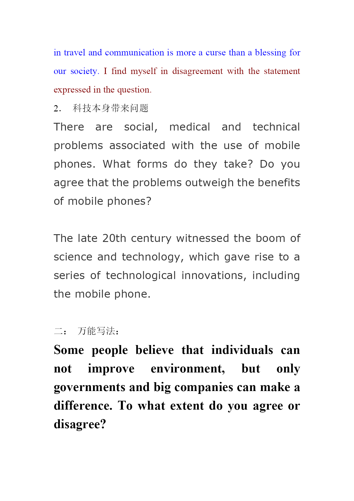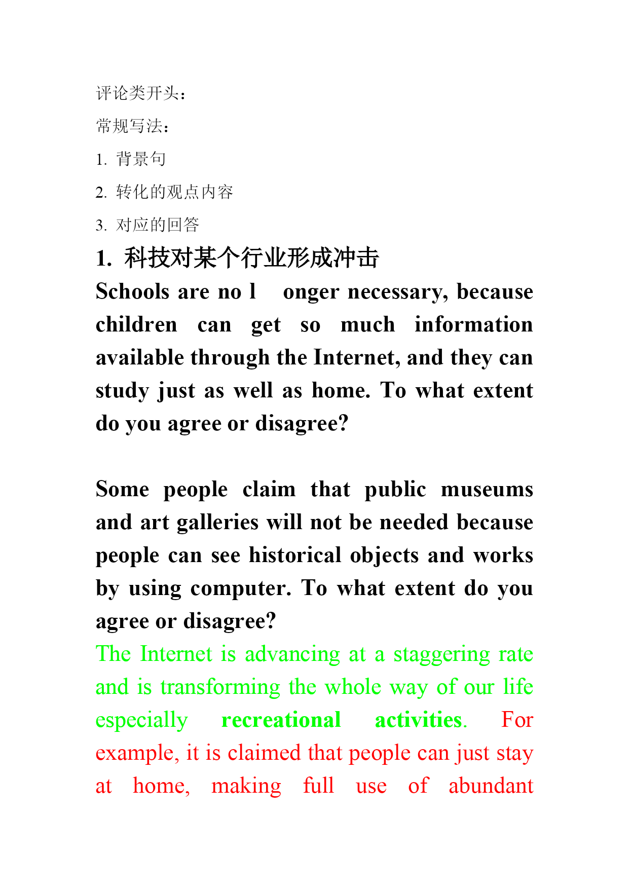 评论类开头: 常规写法: 背景句 转化的观点内容 对应的回答 1.科技对某个行业形成冲击 Schoolsarenolongernecessary,becausechildrencangetsomuchinformationavailablethroughtheInternet,andtheycanstudyjustaswellashome.Towhatextentdoyouagreeordisagree? Somepeopleclaimthatpublicmuseumsandartgallerieswillnotbeneededbecausepeoplecanseehistoricalobjectsandworksbyusingcomputer.Towhatextentdoyouagreeordisagree? TheInternetisadvancingatastaggeringrateandistransformingthewholewayofourlifeespeciallyrecreationalactivities.Forexample,itisclaimedthatpeoplecanjuststayathome,makingfulluseofabundantinformationontheInternet,insteadofgoingtomuseumsandartgalleriesastheydidbefore.Ifindmyselfindisagreementwiththestatementexpressedinthequestion. 转换方法: 1.利弊 Moreacursethanablessing Thedetrimentsovershadowthebenefits 2.sbcandosth=sbcanshouldertheresponsibilitytodosth. Sbcannotdosth=theresponsibilitytodosthistooheavyforsbtoshoulder. 3.因地制宜 Differentapproachesshouldbeappliedaccordingtothedifferentsituationsof…… 做某事需要多方努力 Itisacomprehensiveandwholesometasktodosth,whichneedsthecooperationandcoordinationofA,BandC. 不同意某观点: Ifindmyselfindisagreementwiththestatementexpressedinthequestion. Ifinditreallydifficulttojustifytheargumentfromanyperspective. Ithink=Iamconvinced 练习: Thespeedingupoflifeinmanyareassuchastravelandcommunicationhasnegativeeffectsonsocietyatalllevels—individual,nationalandglobal.Towhatextentdoyouagreeordisagree? Thescienceandtechnologyareadvancingatastaggeringrateandtransformingourwholewayofourlife,especiallytravelandcommunication.However,itisclaimedthattheaccelerationintravelandcommunicationismoreacursethanablessingforoursociety.Ifindmyselfindisagreementwiththestatementexpressedinthequestion. 2.科技本身带来问题 Therearesocial,medicalandtechnicalproblemsassociatedwiththeuseofmobilephones.Whatformsdotheytake?Doyouagreethattheproblemsoutweighthebenefitsofmobilephones? Thelate20thcenturywitnessedtheboomofscienceandtechnology,whichgaverisetoaseriesoftechnologicalinnovations,includingthemobilephone. 二:万能写法: Somepeoplebeli