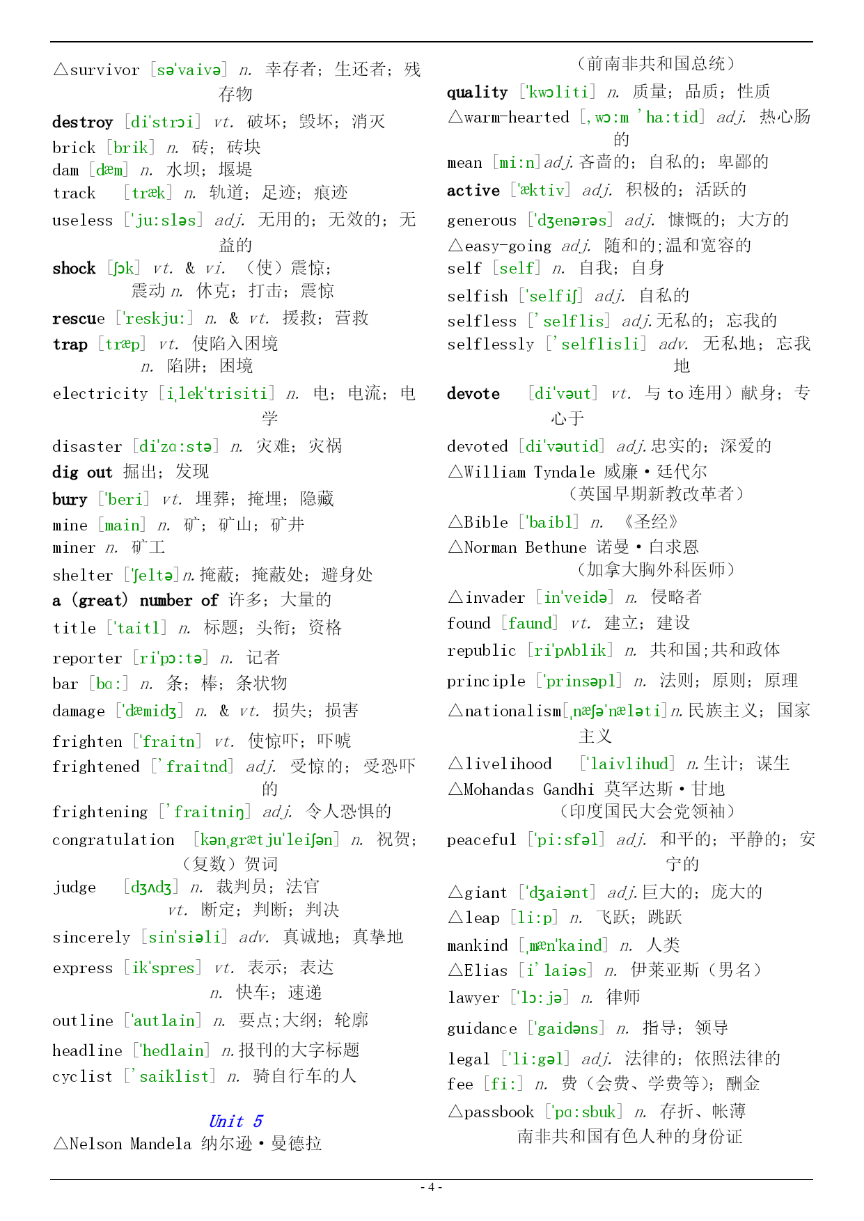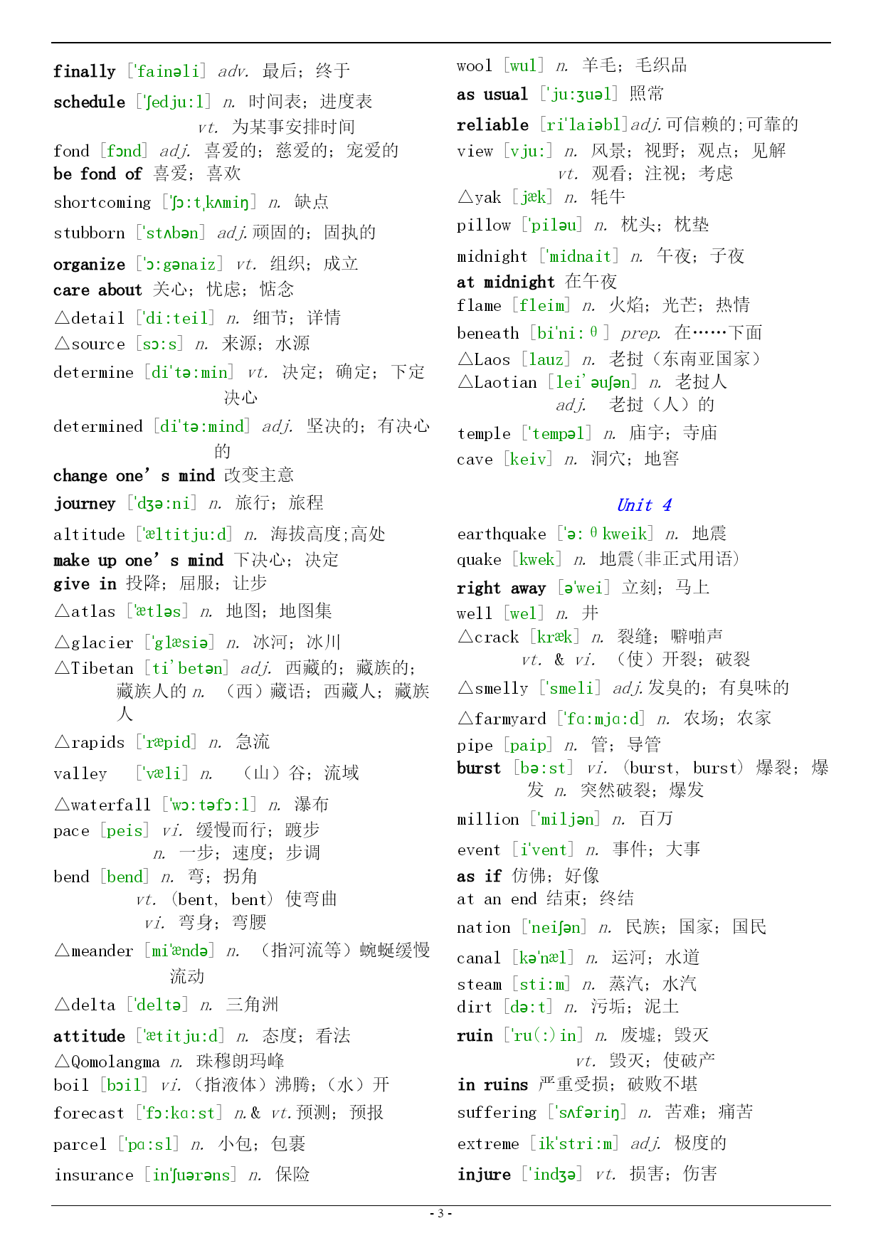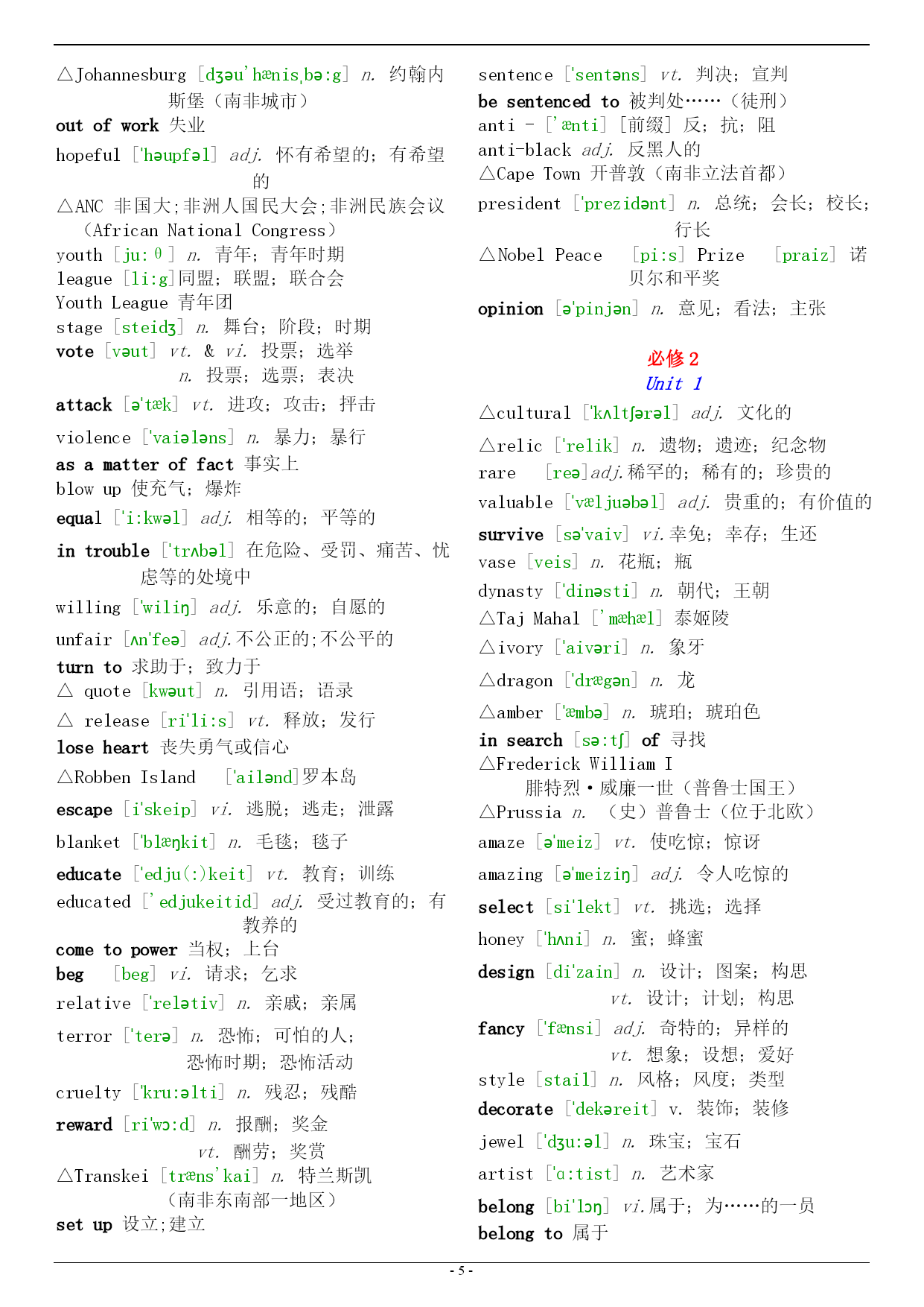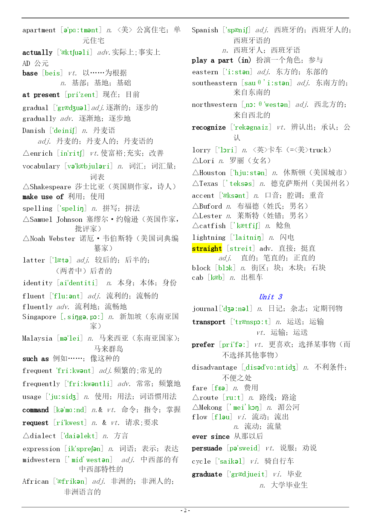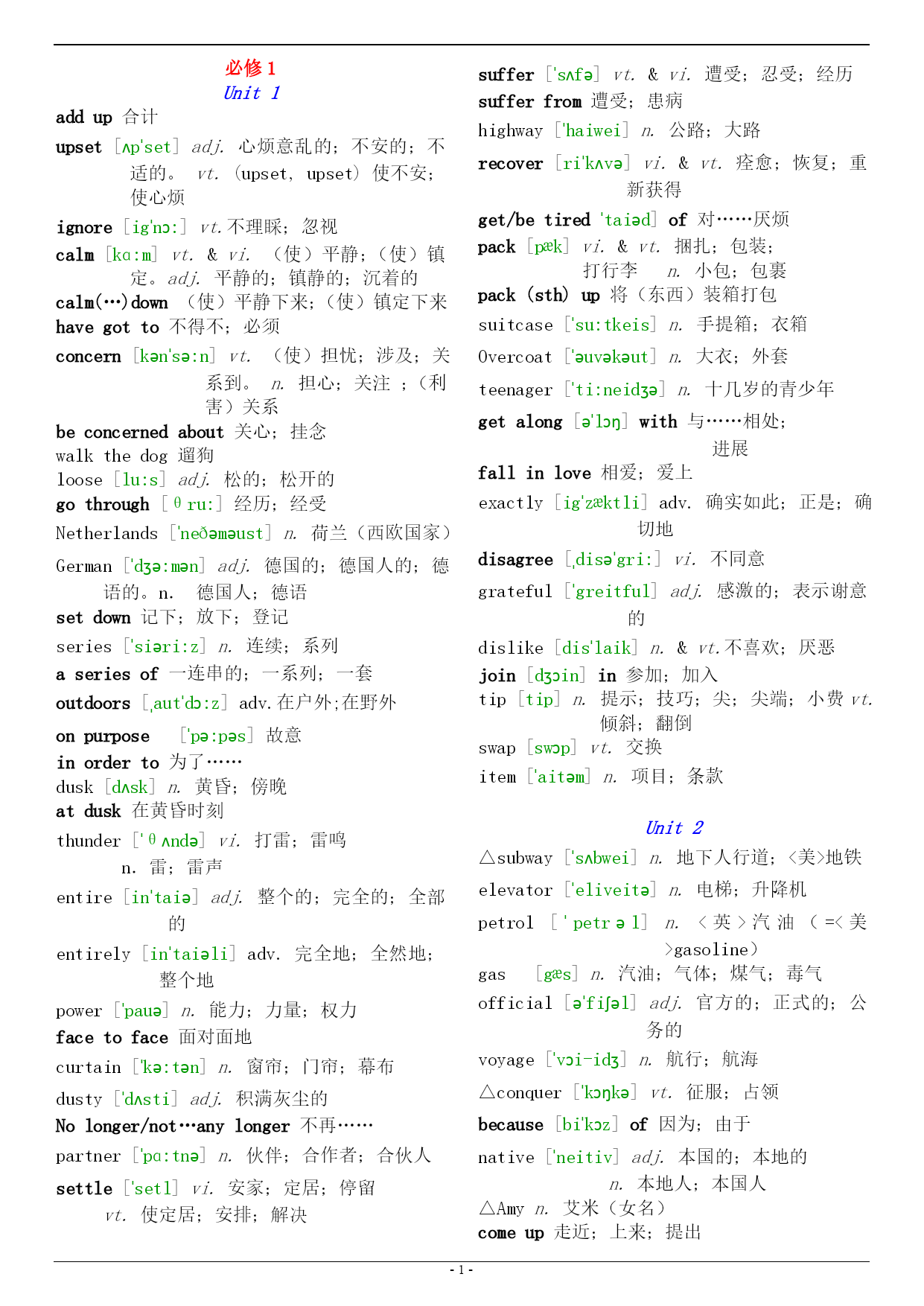 PAGE-46- 必修1 Unit1 addup合计 upset[ʌpˈset]adj.心烦意乱的;不安的;不适的。vt.(upset,upset)使不安;使心烦 ignore[igˈnɔ:]vt.不理睬;忽视 calm[kɑ:m]vt.&vi.(使)平静;(使)镇定。adj.平静的;镇静的;沉着的 calm(…)down(使)平静下来;(使)镇定下来 havegotto不得不;必须 concern[kənˈsə:n]vt.(使)担忧;涉及;关系到。n.担心;关注;(利害)关系 beconcernedabout关心;挂念 walkthedog遛狗 loose[lu:s]adj.松的;松开的 gothrough[θru:]经历;经受 Netherlands[ˈneðəməust]n.荷兰(西欧国家) German[ˈdʒə:mən]adj.德国的;德国人的;德语的。n.德国人;德语 setdown记下;放下;登记 series[ˈsiəri:z]n.连续;系列 aseriesof一连串的;一系列;一套 outdoors[ˌautˈdɔ:z]adv.在户外;在野外 onpurpose[ˈpə:pəs]故意 inorderto为了…… dusk[dʌsk]n.黄昏;傍晚 atdusk在黄昏时刻 thunder[ˈθʌndə]vi.打雷;雷鸣 n.雷;雷声 entire[inˈtaiə]adj.整个的;完全的;全部的 entirely[inˈtaiəli]adv.完全地;全然地;整个地 power[ˈpauə]n.能力;力量;权力 facetoface面对面地 curtain[ˈkə:tən]n.窗帘;门帘;幕布 dusty[ˈdʌsti]adj.积满灰尘的 Nolonger/not…anylonger不再…… partner[ˈpɑ:tnə]n.伙伴;合作者;合伙人 settle[ˈsetl]vi.安家;定居;停留 vt.使定居;安排;解决 suffer[ˈsʌfə]vt.&vi.遭受;忍受;经历 sufferfrom遭受;患病 highway[ˈhaiwei]n.公路;大路 recover[riˈkʌvə]vi.&vt.痊愈;恢复;重新获得 get/betiredˈtaiəd]of对……厌烦 pack[pæk]vi.&vt.捆扎;包装; 打行李n.小包;包裹 pack(sth)up将(东西)装箱打包 suitcase[ˈsu:tkeis]n.手提箱;衣箱 Overcoat[ˈəuvəkəut]n.大衣;外套 teenager[ˈti:neidʒə]n.十几岁的青少年 getalong[əˈlɔŋ]with与……相处; 进展 fallinlove相爱;爱上 exactly[igˈzæktli]adv.确实如此;正是;确切地 disagree[ˌdisəˈgri:]vi.不同意 grateful[ˈgreitful]adj.感激的;表示谢意的 dislike[disˈlaik]n.&vt.不喜欢;厌恶 join[dʒɔin]in参加;加入 tip[tip]n.提示;技巧;尖;尖端;小费vt.倾斜;翻倒 swap[swɔp]vt.交换 item[ˈaitəm]n.项目;条款 Unit2 △subway[ˈsʌbwei]n.地下人行道;<美>地铁 elevator[ˈeliveitə]n.电梯;升降机 petrol[ˈpetrəl]n.<英>汽油(=<美>gasoline) gas[gæs]n.汽油;气体;煤气;毒气 official[əˈfiʃəl]adj.官方的;正式的;公务的 voyage[ˈvɔi-idʒ]n.航行;航海 △conquer[ˈkɔŋkə]vt.征服;占领 because[biˈkɔz]of因为;由于 native[ˈneitiv]adj.本国的;本地的 n.本地人;本国人 △Amyn.艾米(女名) comeup走近;上来;提出 apartment[əˈpɑ:tmənt]n.<美>公寓住宅;单元住宅 actually[ˈæktʃuəli]adv.实际上;事实上 AD公元 base[beis]vt.以……为根据 n.基部;基地;基础 atpresent[priˈzent]现在;目前 gradual[ˈgrædʒuəl]adj.逐渐的;逐步的 graduallyadv.逐渐地;逐步地 Danish[ˈdeiniʃ]n.丹麦语 adj.丹麦的;丹麦人的;丹麦语的 △enrich[inˈritʃ]vt.使富裕;充实;改善 vocabulary[vəˈkæbjuləri]n.词汇;词汇量;词表 △Shakespeare莎士比亚(英国剧作家,诗人) makeuseof利用;使用 spelling[ˈspel