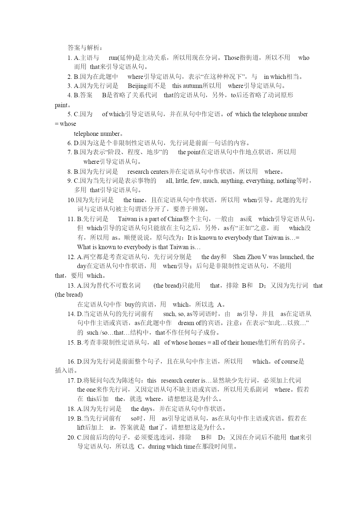 1.Nearlyallthestreetsareinstraightlines,________fromeasttowest.Those runfromnorthtosoutharecalledavenues. ________ A.running;that 2.Thisisthecase________he’shadallhismoneystolen. A.whenB.whereC.thatD.onwhich 3.Mr.SmithwillpayavisittoBeijingthisautumn,________wewillenjoytheOlympic Gamesin2008.A.whereB.whenC.whichD.how 4.Theartistwillnotpaintpeopleoranimalsbuthewillpaintanything________. B.run;whoC.running;who D.run;that A.thatthelittlegirlaskshim C.forthelittlegirltoaskhim B.thelittlegirlaskshimto D.whatthelittlegirlaskshim 5.—Howdidyougetintouchwiththetravelagent,Robin? —Oh,that’seasy.IsurfedtheInternetandthencalledone________thetelephone numberisprovided. A.which 6.October15thismybirthday,________Iwillneverforget. A.whenB.thatC.whatD.which B.inwhich C.ofwhich D.whose 7.Thetreatmentwillcontinueuntilthepatientreachesthepoint________hecanwalk correctlyandsafely. A.when B.where C.which D.whose 8.ThereareseveralresearchcentersinChina________acertaindiseasecalledBirdFluis beingstudied. A.which 9.Ihopethatthelittle________Ihavebeenabletododoesgoodtothemall. A.whichB.whatC.thatD.when B.where C.when D.what 10.Thetimeisnotfaraway________moderncommunicationswillbecome widespreadinChina’svastcountryside. A.as 11.________isknowntoeverybody,TaiwanisapartofChina.Wemustunifyit. A.ItB.AsC.WhichD.What B.when C.until D.before 12.Ishallneverforgettheday________ShenZhouVwaslaunched,________hasagreat effectonmylife. A.when,which 13.Thebreadmywifemakesismuchbetterthan________youcanbuyatastore. A.thatwhichB.onethatC.thatofwhichD.thisofwhich 14.Thereisnosuchplace________youdreamofinallthisworld. A.thatB.whatC.whichD.as 15.Thepeople,________hadbeendamagedbytheflood,weregivenhelpbytheRedCross. B.that,which C.which,that D.when,that A.allwhosehomes C.alltheirhomes B.allofwhosehomes D.alloftheirhomes 16.Thehumansaredestroyingnaturedaybyday,________ofcourse,willcausesevere punishmentfromitsoonerorlater. A.who 17.Isthisresearchcenter________youvisitedthemodernequipmentlastyear? A.whereB.thatC.th