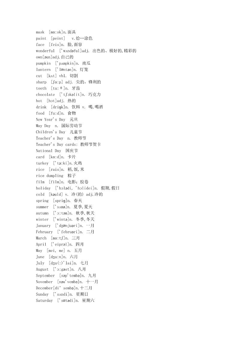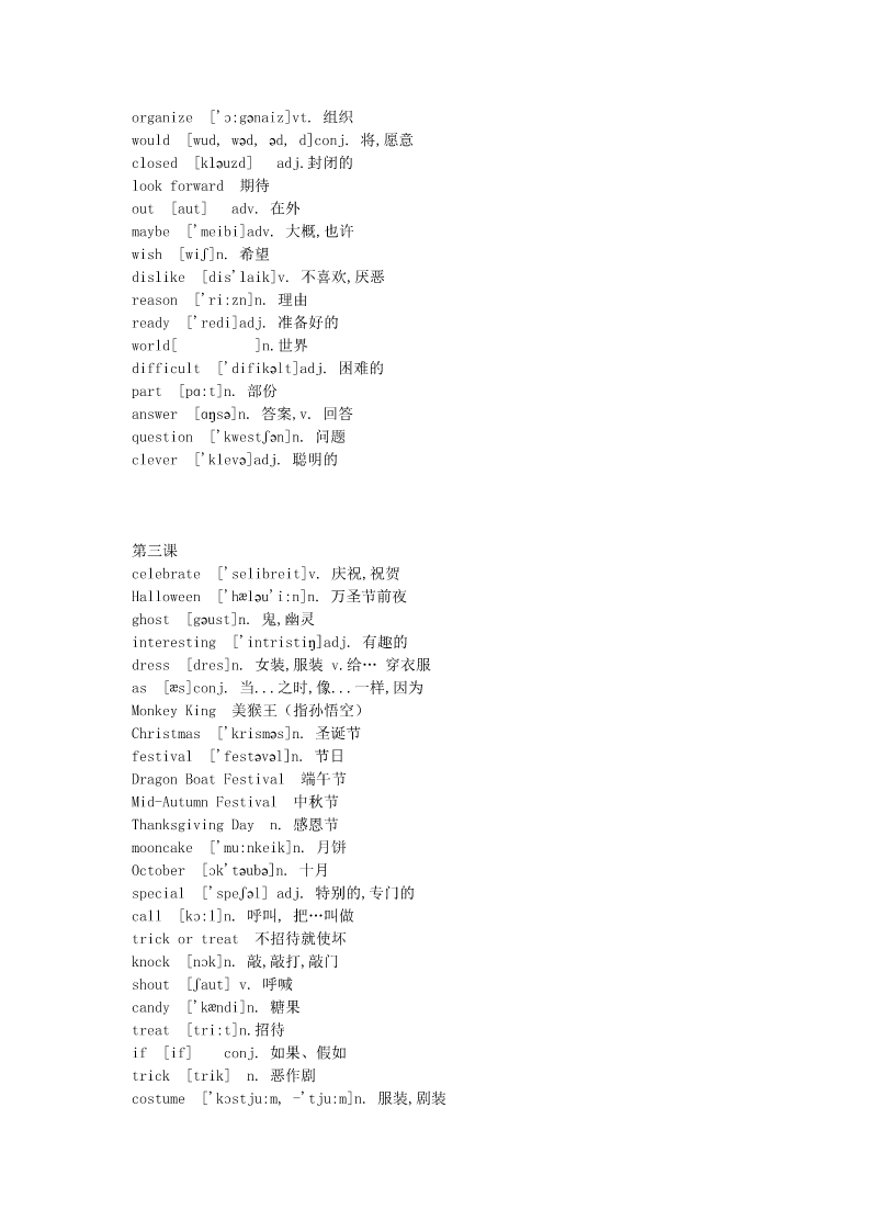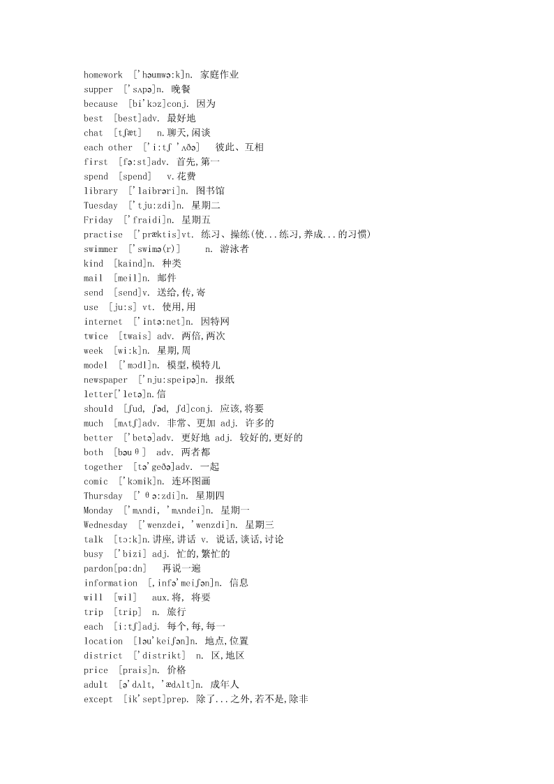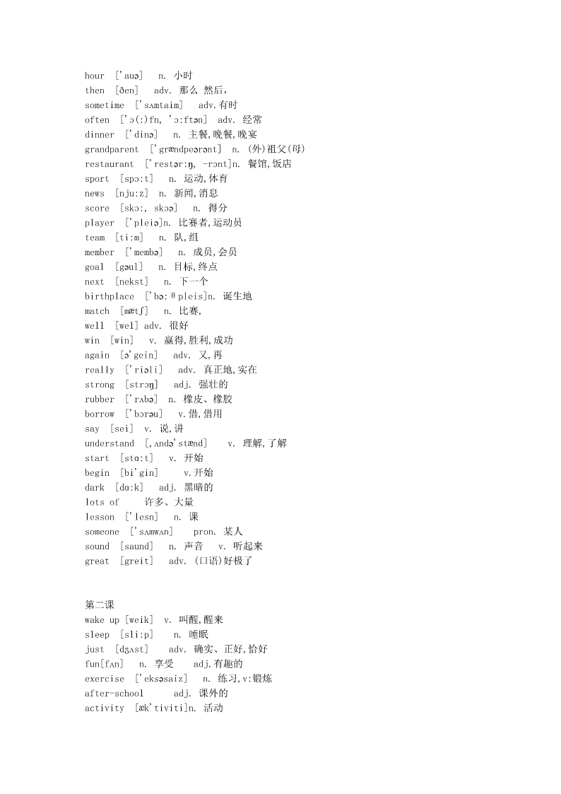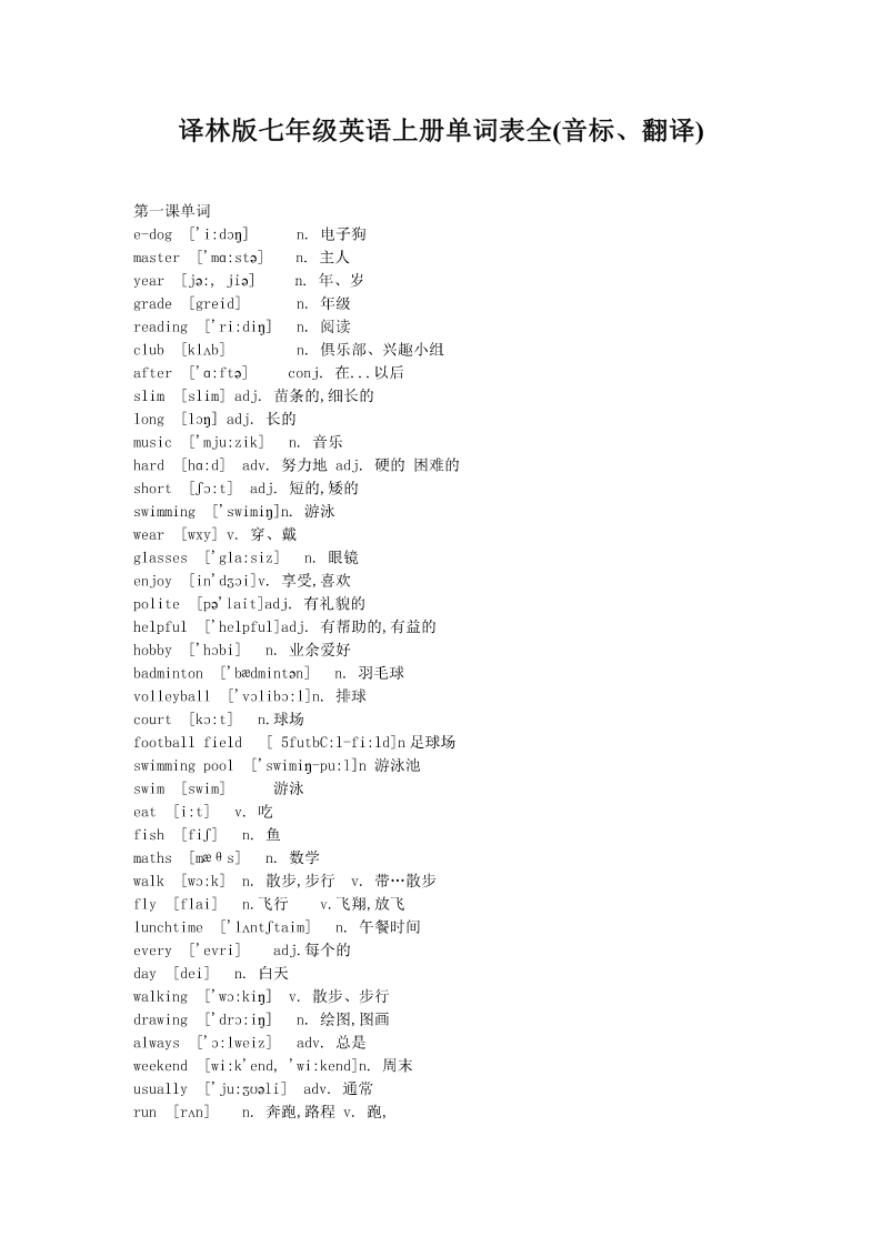 译林版七年级英语上册单词表全(音标、翻译) 第一课单词 e-dog['i:dɔŋ]n.电子狗 master['mɑ:stə]n.主人 year[jə:,jiə]n.年、岁 grade[greid]n.年级 reading['ri:diŋ]n.阅读 club[klʌb]n.俱乐部、兴趣小组 after['ɑ:ftə]conj.在...以后 slim[slim]adj.苗条的,细长的 long[lɔŋ]adj.长的 music['mju:zik]n.音乐 hard[hɑ:d]adv.努力地adj.硬的困难的 short[ʃɔ:t]adj.短的,矮的 swimming['swimiŋ]n.游泳 wear[wxy]v.穿、戴 glasses['gla:siz]n.眼镜 enjoy[in'dʒɔi]v.享受,喜欢 polite[pə'lait]adj.有礼貌的 helpful['helpful]adj.有帮助的,有益的 hobby['hɔbi]n.业余爱好 badminton['bædmintən]n.羽毛球 volleyball['vɔlibɔ:l]n.排球 court[kɔ:t]n.球场 footballfield[5futbC:l-fi:ld]n足球场 swimmingpool['swimiŋ-pu:l]n游泳池 swim[swim]游泳 eat[i:t]v.吃 fish[fiʃ]n.鱼 maths[mæθs]n.数学 walk[wɔ:k]n.散步,步行v.带…散步 fly[flai]n.飞行v.飞翔,放飞 lunchtime['lʌntʃtaim]n.午餐时间 every['evri]adj.每个的 day[dei]n.白天 walking['wɔ:kiŋ]v.散步、步行 drawing['drɔ:iŋ]n.绘图,图画 always['ɔ:lweiz]adv.总是 weekend[wi:k'end,'wi:kend]n.周末 usually['ju:ʒʊəli]adv.通常 run[rʌn]n.奔跑,路程v.跑, hour['auə]n.小时 then[ðen]adv.那么然后, sometime['sʌmtaim]adv.有时 often['ɔ(:)fn,'ɔ:ftən]adv.经常 dinner['dinə]n.主餐,晚餐,晚宴 grandparent['grændpeərənt]n.(外)祖父(母) restaurant['restər:ŋ,-rɔnt]n.餐馆,饭店 sport[spɔ:t]n.运动,体育 news[nju:z]n.新闻,消息 score[skɔ:,skɔə]n.得分 player['pleiə]n.比赛者,运动员 team[ti:m]n.队,组 member['membə]n.成员,会员 goal[gəul]n.目标,终点 next[nekst]n.下一个 birthplace['bə:θpleis]n.诞生地 match[mætʃ]n.比赛, well[wel]adv.很好 win[win]v.赢得,胜利,成功 again[ə'gein]adv.又,再 really['riəli]adv.真正地,实在 strong[strɔŋ]adj.强壮的 rubber['rʌbə]n.橡皮、橡胶 borrow['bɔrəu]v.借,借用 say[sei]v.说,讲 understand[,ʌndə'stænd]v.理解,了解 start[stɑ:t]v.开始 begin[bi'gin]v.开始 dark[dɑ:k]adj.黑暗的 lotsof许多、大量 lesson['lesn]n.课 someone['sʌmwʌn]pron.某人 sound[saund]n.声音v.听起来 great[greit]adv.(口语)好极了 第二课 wakeup[weik]v.叫醒,醒来 sleep[sli:p]n.睡眠 just[dʒʌst]adv.确实、正好,恰好 fun[fʌn]n.享受adj.有趣的 exercise['eksəsaiz]n.练习,v:锻炼 after-schooladj.课外的 activity[æk'tiviti]n.活动 homework['həumwə:k]n.家庭作业 supper['sʌpə]n.晚餐 because[bi'kɔz]conj.因为 best[best]adv.最好地 chat[tʃæt]n.聊天,闲谈 eachother['i:tʃ'ʌðə]彼此、互相 first[fə:st]adv.首先,第一 spend[spend]v.花费 library['laibrəri]n.图书馆 Tuesday['tju:zdi]n.星期二 Friday['fraidi]n.星期五