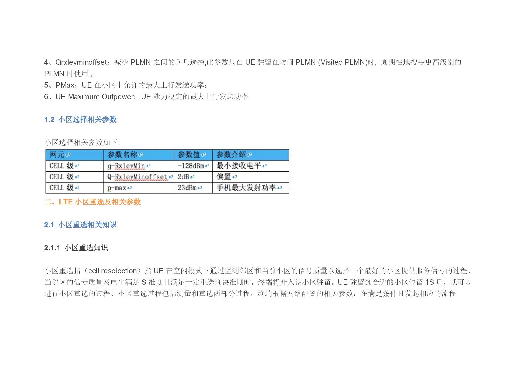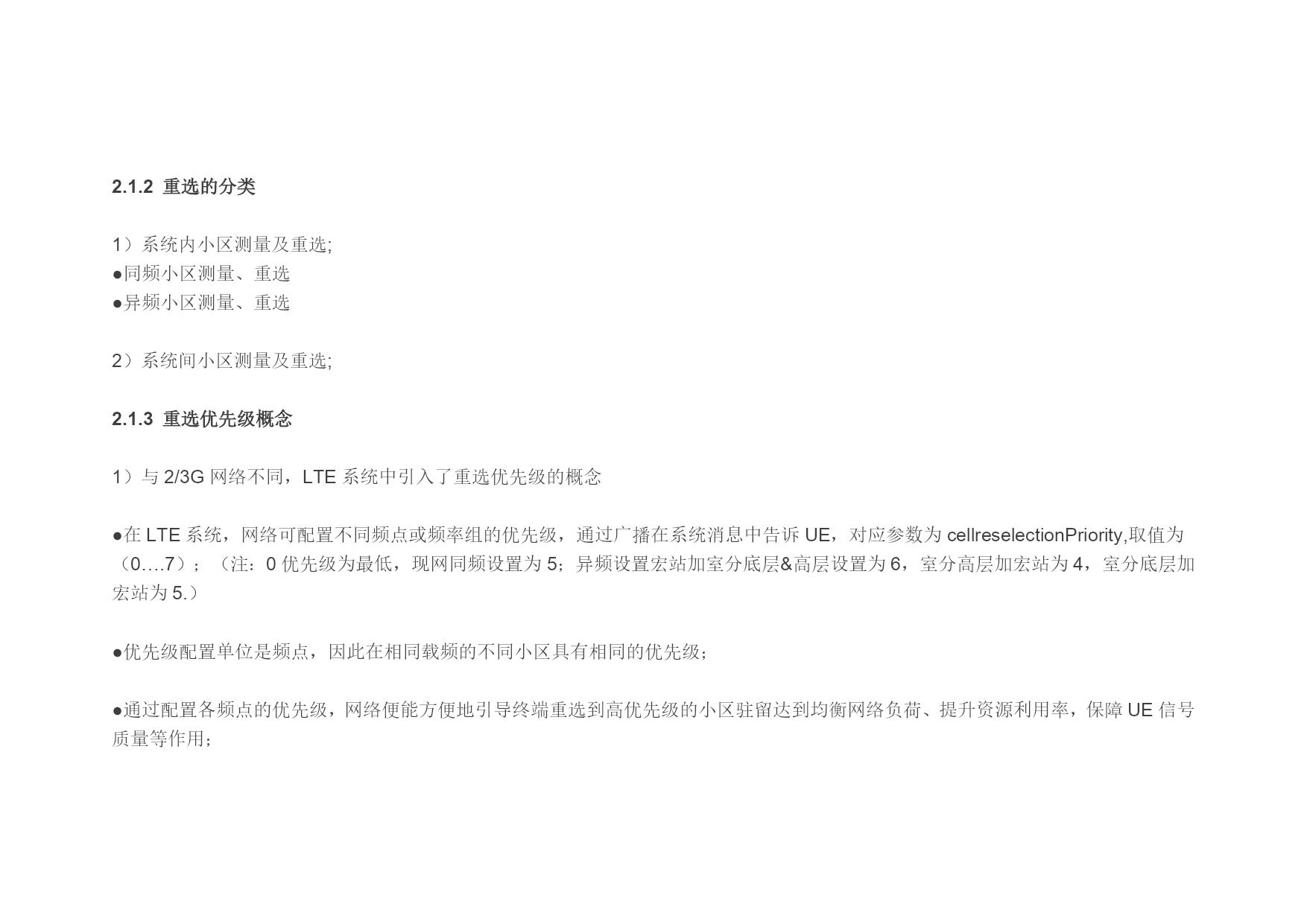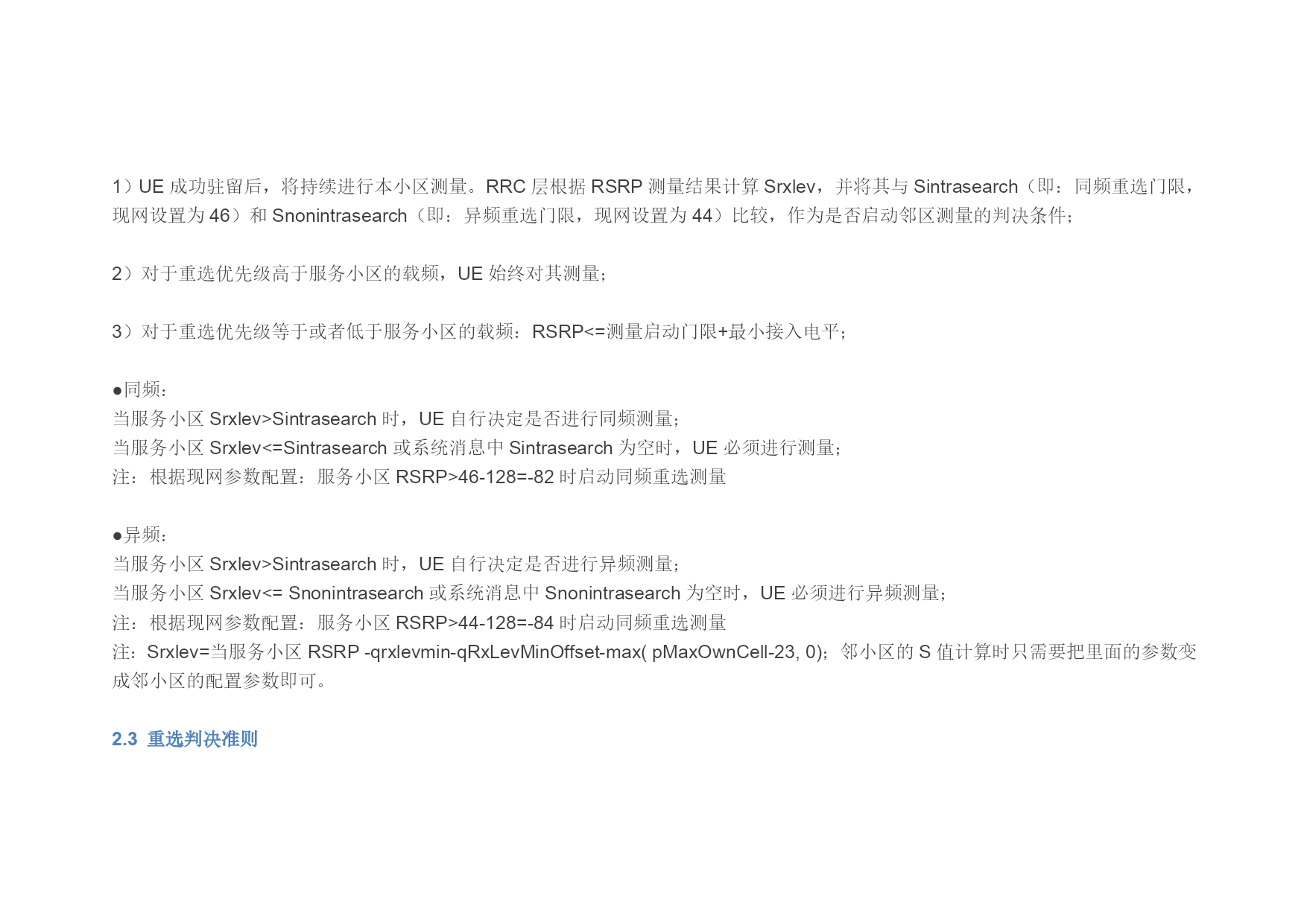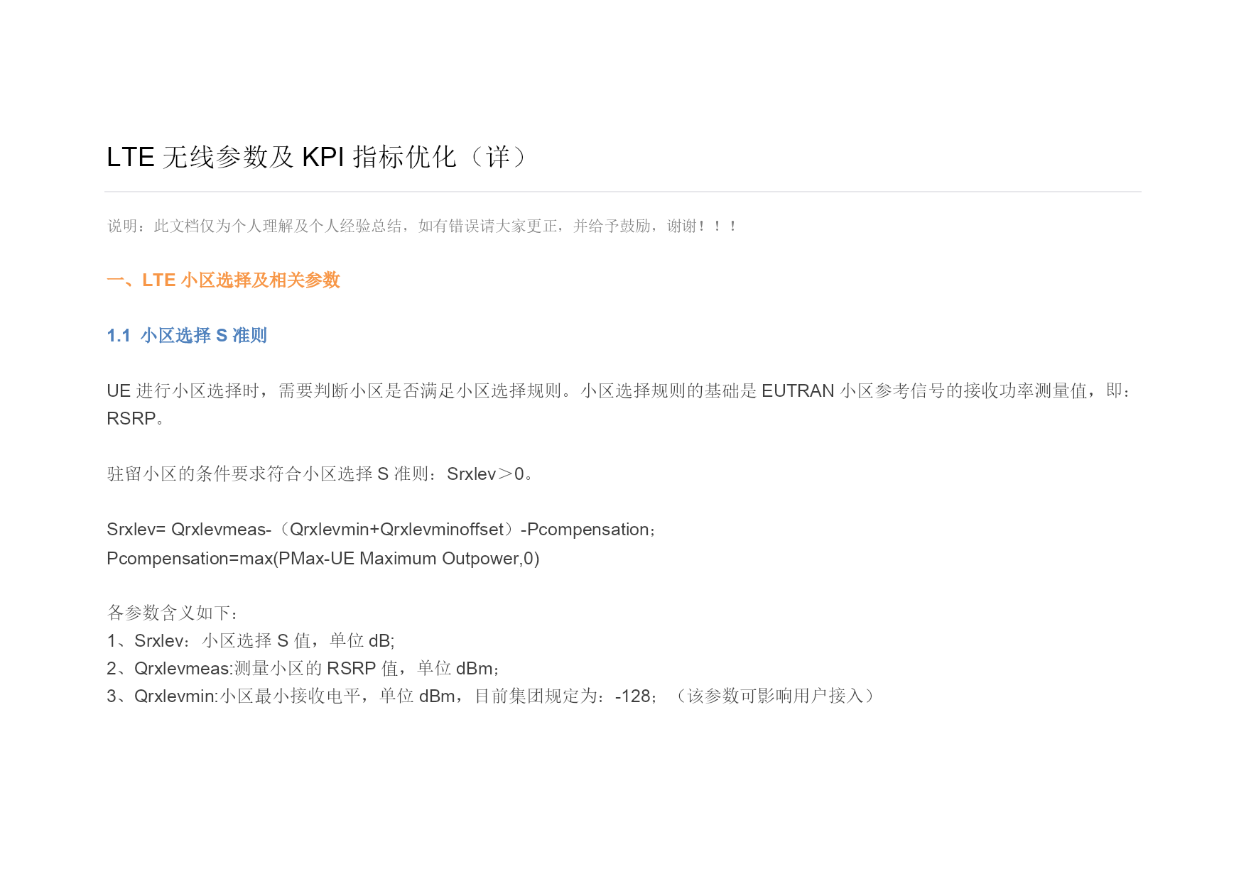LTE无线参数及KPI指标优化(详) 说明:此文档仅为个人理解及个人经验总结,如有错误请大家更正,并给予鼓励,谢谢!!! 一、LTE小区选择及相关参数 1.1小区选择S准则 UE进行小区选择时,需要判断小区是否满足小区选择规则。小区选择规则的基础是EUTRAN小区参考信号的接收功率测量值,即:RSRP。 驻留小区的条件要求符合小区选择S准则:Srxlev>0。 Srxlev=Qrxlevmeas-(Qrxlevmin+Qrxlevminoffset)-Pcompensation; Pcompensation=max(PMax-UEMaximumOutpower,0) 各参数含义如下: 1、Srxlev:小区选择S值,单位dB; 2、Qrxlevmeas:测量小区的RSRP值,单位dBm; 3、Qrxlevmin:小区最小接收电平,单位dBm,目前集团规定为:-128;(该参数可影响用户接入) 4、Qrxlevminoffset:减少PLMN之间的乒乓选择,此参数只在UE驻留在访问PLMN(VisitedPLMN)时,周期性地搜寻更高级别的PLMN时使用.; 5、PMax:UE在小区中允许的最大上行发送功率; 6、UEMaximumOutpower:UE能力决定的最大上行发送功率 1.2小区选择相关参数 小区选择相关参数如下: 二、LTE小区重选及相关参数 2.1小区重选相关知识 2.1.1小区重选知识 小区重选指(cellreselection)指UE在空闲模式下通过监测邻区和当前小区的信号质量以选择一个最好的小区提供服务信号的过程。当邻区的信号质量及电平满足S准则且满足一定重选判决准则时,终端将介入该小区驻留。UE驻留到合适的小区停留1S后,就可以进行小区重选的过程。小区重选过程包括测量和重选两部分过程,终端根据网络配置的相关参数,在满足条件时发起相应的流程。 2.1.2重选的分类 1)系统内小区测量及重选; ●同频小区测量、重选 ●异频小区测量、重选 2)系统间小区测量及重选; 2.1.3重选优先级概念 1)与2/3G网络不同,LTE系统中引入了重选优先级的概念 ●在LTE系统,网络可配置不同频点或频率组的优先级,通过广播在系统消息中告诉UE,对应参数为cellreselectionPriority,取值为(0….7);(注:0优先级为最低,现网同频设置为5;异频设置宏站加室分底层&高层设置为6,室分高层加宏站为4,室分底层加宏站为5.) ●优先级配置单位是频点,因此在相同载频的不同小区具有相同的优先级; ●通过配置各频点的优先级,网络便能方便地引导终端重选到高优先级的小区驻留达到均衡网络负荷、提升资源利用率,保障UE信号质量等作用; 2)重选优先级也可以通过RRCConnectionRelease消息告诉UE,此时UE忽略广播消息中的优先级信息,以该信息为准; 网络主动引导UE进行系统间小区重选,完成CS域语音呼叫等; 2.1.4重选系统消息 LTE中,SIB3-SIB8全部为重选相关信息,具体如下: 2.2重选测量启动条件 1)UE成功驻留后,将持续进行本小区测量。RRC层根据RSRP测量结果计算Srxlev,并将其与Sintrasearch(即:同频重选门限,现网设置为46)和Snonintrasearch(即:异频重选门限,现网设置为44)比较,作为是否启动邻区测量的判决条件; 2)对于重选优先级高于服务小区的载频,UE始终对其测量; 3)对于重选优先级等于或者低于服务小区的载频:RSRP<=测量启动门限+最小接入电平; ●同频: 当服务小区Srxlev>Sintrasearch时,UE自行决定是否进行同频测量; 当服务小区Srxlev<=Sintrasearch或系统消息中Sintrasearch为空时,UE必须进行测量; 注:根据现网参数配置:服务小区RSRP>46-128=-82时启动同频重选测量 ●异频: 当服务小区Srxlev>Sintrasearch时,UE自行决定是否进行异频测量; 当服务小区Srxlev<=Snonintrasearch或系统消息中Snonintrasearch为空时,UE必须进行异频测量; 注:根据现网参数配置:服务小区RSRP>44-128=-84时启动同频重选测量 注:Srxlev=当服务小区RSRP-qrxlevmin-qRxLevMinOffset-max(pMaxOwnCell-23,0);邻小区的S值计算时只需要把里面的参数变成邻小区的配置参数即可。 2.3重选判决准则 1)同频小区及同优先级异频小区重选判决: R准则: 服务小区CellRank(R值)Rs=Qmeas,s+Qhyst 候选小区CellR