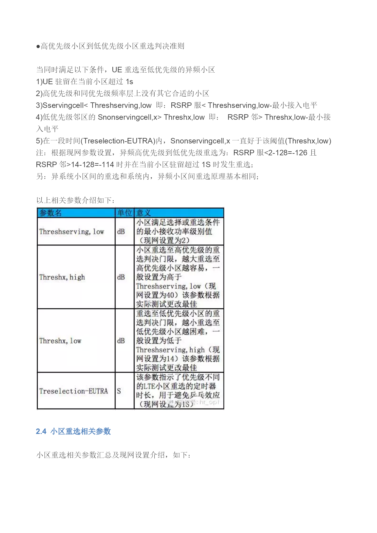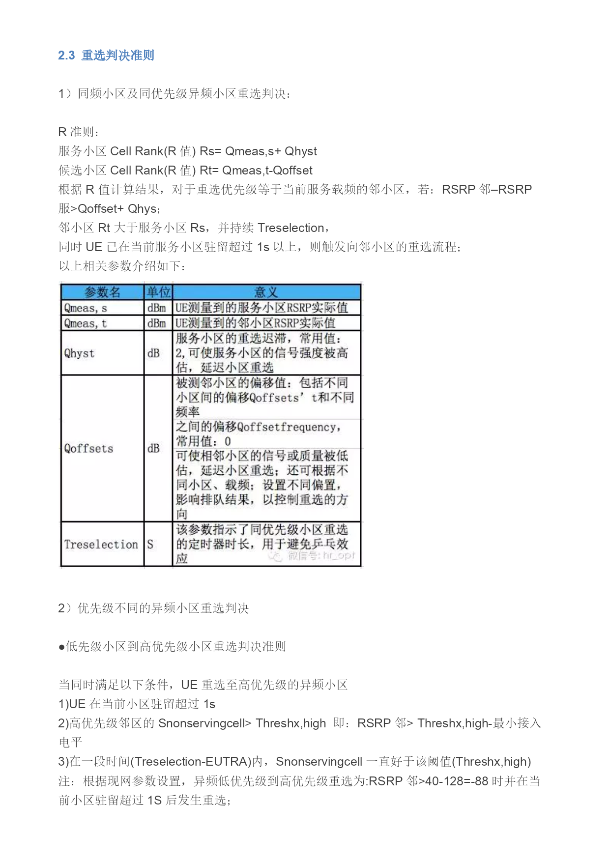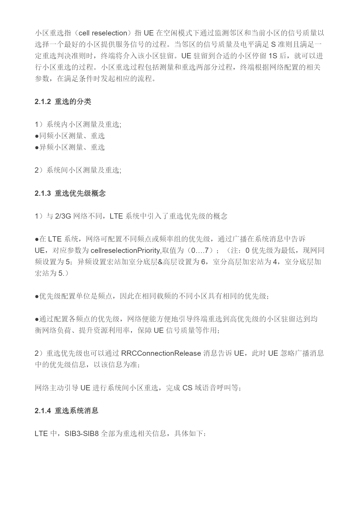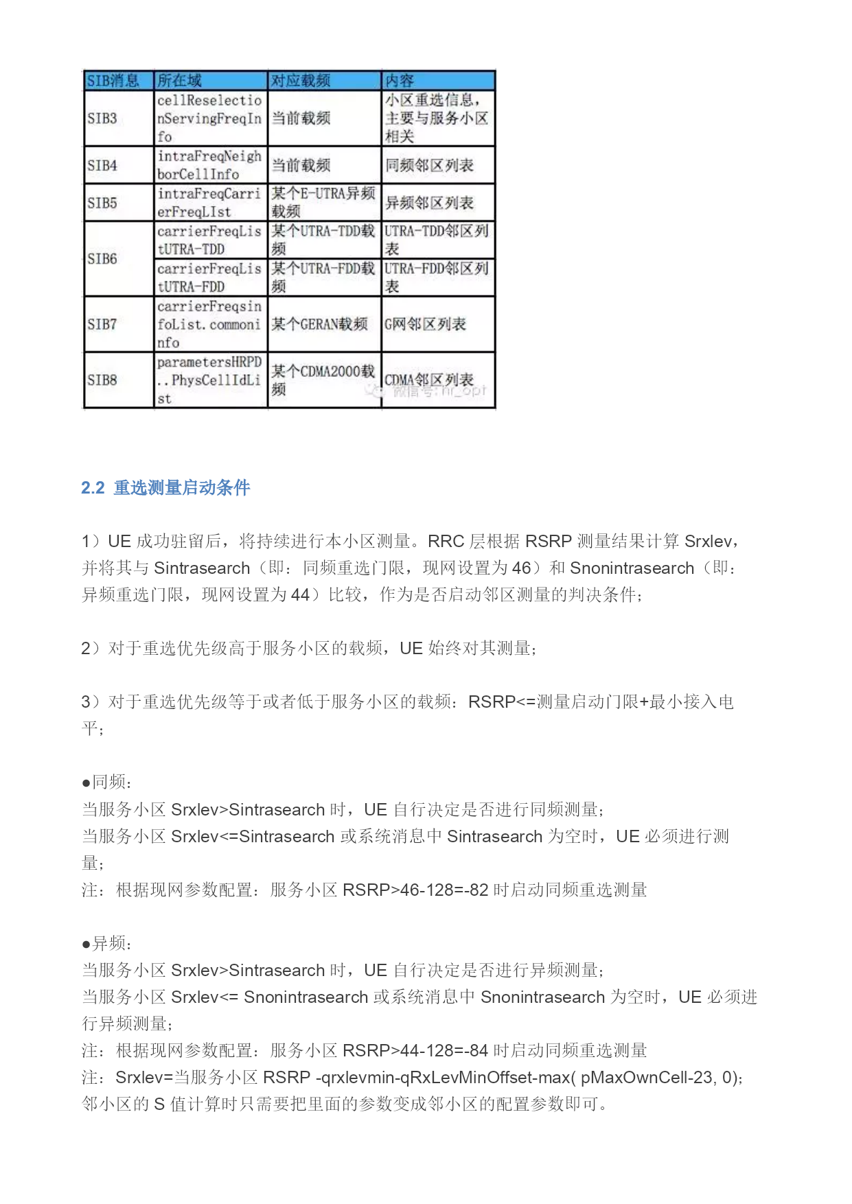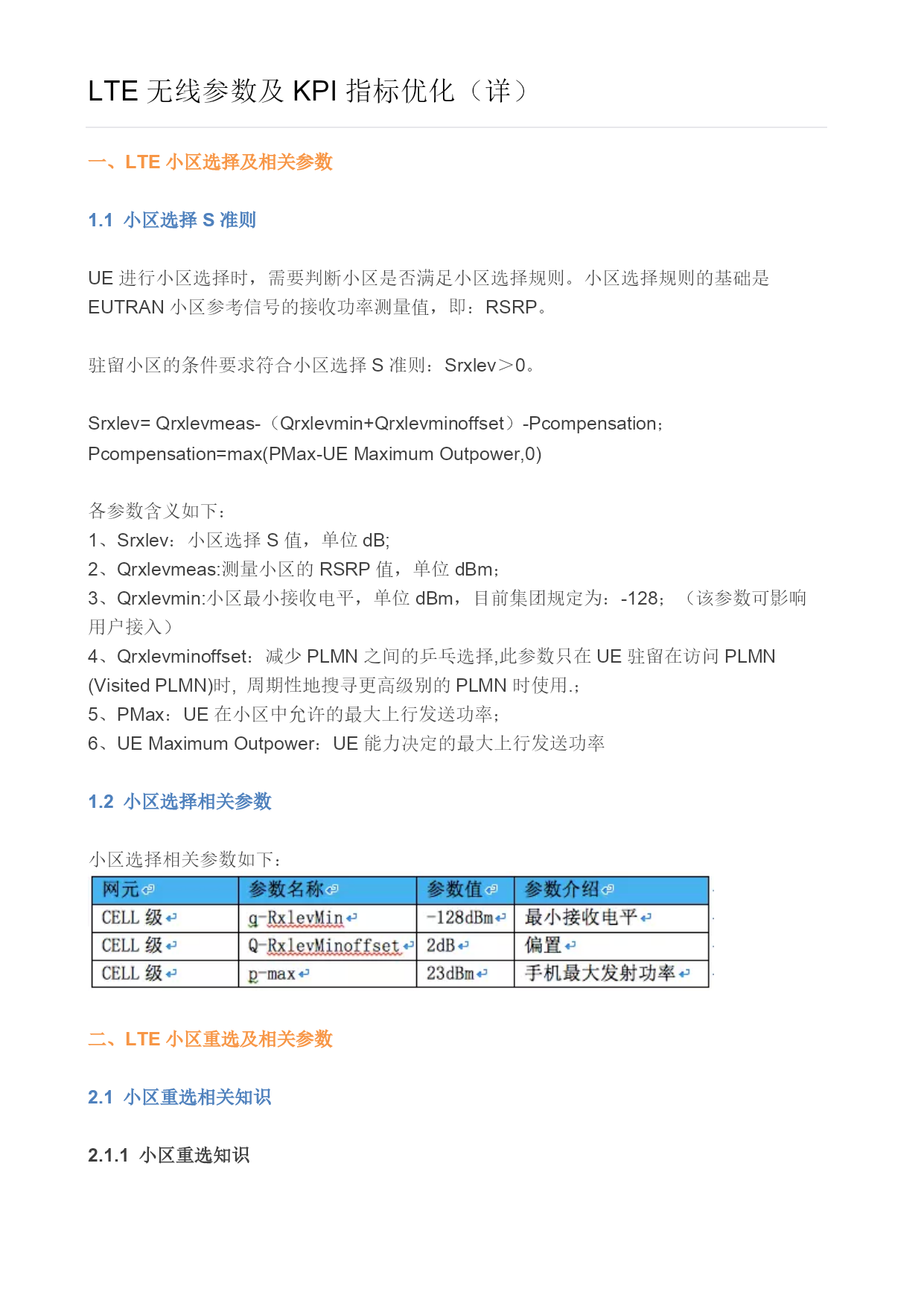 LTE无线参数及KPI指标优化(详) 一、LTE小区选择及相关参数 1.1小区选择S准则 UE进行小区选择时,需要判断小区是否满足小区选择规则。小区选择规则的基础是EUTRAN小区参考信号的接收功率测量值,即:RSRP。 驻留小区的条件要求符合小区选择S准则:Srxlev>0。 Srxlev=Qrxlevmeas-(Qrxlevmin+Qrxlevminoffset)-Pcompensation; Pcompensation=max(PMax-UEMaximumOutpower,0) 各参数含义如下: 1、Srxlev:小区选择S值,单位dB; 2、Qrxlevmeas:测量小区的RSRP值,单位dBm; 3、Qrxlevmin:小区最小接收电平,单位dBm,目前集团规定为:-128;(该参数可影响用户接入) 4、Qrxlevminoffset:减少PLMN之间的乒乓选择,此参数只在UE驻留在访问PLMN(VisitedPLMN)时,周期性地搜寻更高级别的PLMN时使用.; 5、PMax:UE在小区中允许的最大上行发送功率; 6、UEMaximumOutpower:UE能力决定的最大上行发送功率 1.2小区选择相关参数 小区选择相关参数如下: 二、LTE小区重选及相关参数 2.1小区重选相关知识 2.1.1小区重选知识 小区重选指(cellreselection)指UE在空闲模式下通过监测邻区和当前小区的信号质量以选择一个最好的小区提供服务信号的过程。当邻区的信号质量及电平满足S准则且满足一定重选判决准则时,终端将介入该小区驻留。UE驻留到合适的小区停留1S后,就可以进行小区重选的过程。小区重选过程包括测量和重选两部分过程,终端根据网络配置的相关参数,在满足条件时发起相应的流程。 2.1.2重选的分类 1)系统内小区测量及重选; ●同频小区测量、重选 ●异频小区测量、重选 2)系统间小区测量及重选; 2.1.3重选优先级概念 1)与2/3G网络不同,LTE系统中引入了重选优先级的概念 ●在LTE系统,网络可配置不同频点或频率组的优先级,通过广播在系统消息中告诉UE,对应参数为cellreselectionPriority,取值为(0….7);(注:0优先级为最低,现网同频设置为5;异频设置宏站加室分底层&高层设置为6,室分高层加宏站为4,室分底层加宏站为5.) ●优先级配置单位是频点,因此在相同载频的不同小区具有相同的优先级; ●通过配置各频点的优先级,网络便能方便地引导终端重选到高优先级的小区驻留达到均衡网络负荷、提升资源利用率,保障UE信号质量等作用; 2)重选优先级也可以通过RRCConnectionRelease消息告诉UE,此时UE忽略广播消息中的优先级信息,以该信息为准; 网络主动引导UE进行系统间小区重选,完成CS域语音呼叫等; 2.1.4重选系统消息 LTE中,SIB3-SIB8全部为重选相关信息,具体如下: 2.2重选测量启动条件 1)UE成功驻留后,将持续进行本小区测量。RRC层根据RSRP测量结果计算Srxlev,并将其与Sintrasearch(即:同频重选门限,现网设置为46)和Snonintrasearch(即:异频重选门限,现网设置为44)比较,作为是否启动邻区测量的判决条件; 2)对于重选优先级高于服务小区的载频,UE始终对其测量; 3)对于重选优先级等于或者低于服务小区的载频:RSRP<=测量启动门限+最小接入电平; ●同频: 当服务小区Srxlev>Sintrasearch时,UE自行决定是否进行同频测量; 当服务小区Srxlev<=Sintrasearch或系统消息中Sintrasearch为空时,UE必须进行测量; 注:根据现网参数配置:服务小区RSRP>46-128=-82时启动同频重选测量 ●异频: 当服务小区Srxlev>Sintrasearch时,UE自行决定是否进行异频测量; 当服务小区Srxlev<=Snonintrasearch或系统消息中Snonintrasearch为空时,UE必须进行异频测量; 注:根据现网参数配置:服务小区RSRP>44-128=-84时启动同频重选测量 注:Srxlev=当服务小区RSRP-qrxlevmin-qRxLevMinOffset-max(pMaxOwnCell-23,0);邻小区的S值计算时只需要把里面的参数变成邻小区的配置参数即可。 2.3重选判决准则 1)同频小区及同优先级异频小区重选判决: R准则: 服务小区CellRank(R值)Rs=Qmeas,s+Qhyst 候选小区CellRank(R值)Rt=Qmeas,t-Qoffset 根据R值计算结果,对于重选优