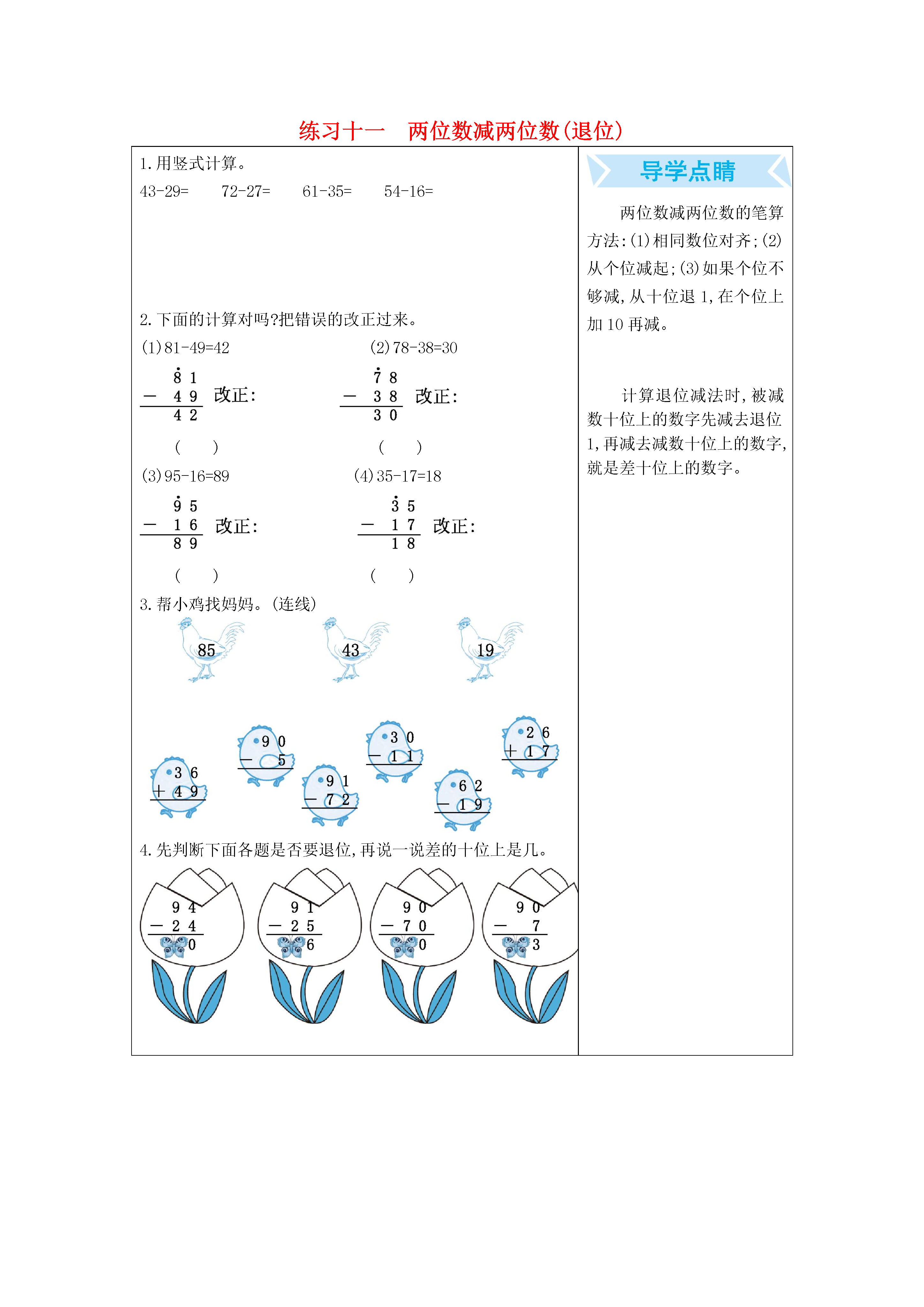 练习十一两位数减两位数(退位)1.用竖式计算。43-29=72-27=61-35=54-16=2.下面的计算对吗?把错误的改正过来。(1)81-49=42(2)78-38=30()()(3)95-16=89(4)35-17=18()()3.帮小鸡找妈妈。(连线)4.先判断下面各题是否要退位,再说一说差的十位上是几。两位数减两位数的笔算方法:(1)相同数位对齐;(2)从个位减起;(3)如果个位不够减,从十位退1,在个位上加10再减。计算退位减法时,被减数十位上的数字先减去退位1,再减去减数十位上的数字,就是差十位上的数字。答案:1.144526382.(1)✕81-49=32(2)✕78-38=40(3)✕95-16=79(4)3.4.7628
