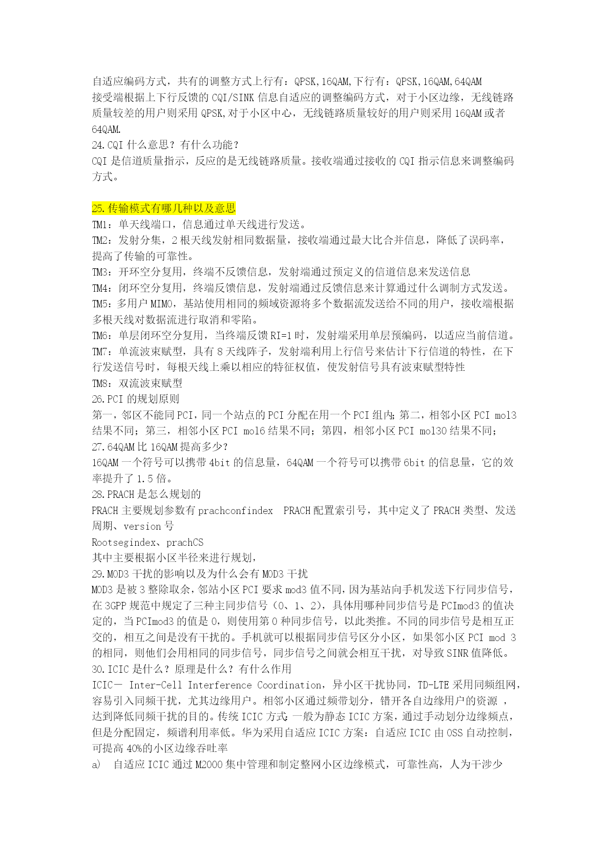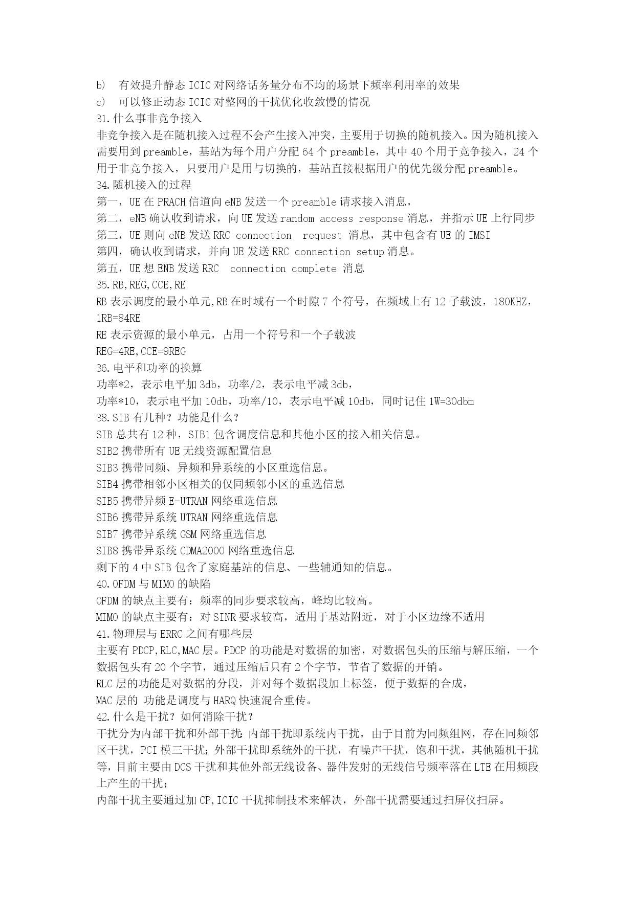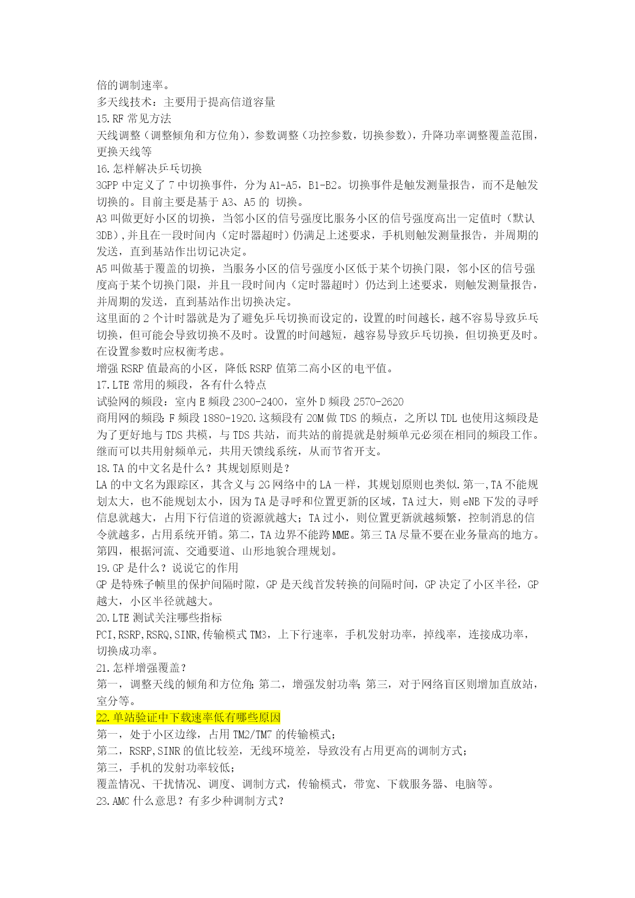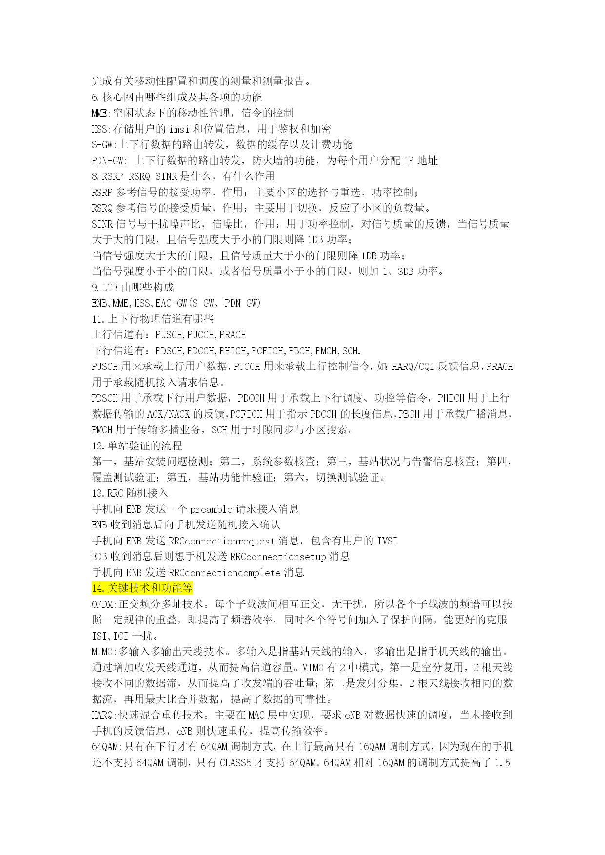 LTE帧结构,上下行配比和特殊子帧配比 无线帧长为10ms,分为2个半帧(5ms)一个半帧有5个子帧(1ms)子帧又分为一般子帧和特殊子帧,一般子帧有2个时隙(0.5ms),特殊子帧有3个特殊时隙(上行导频时隙,保护间隔。下行导频时隙) 3GPP中共规范了7种上下行配比,目前为止只支持配置1(2:2)和配置2(1:3),默认值为配置1。 3GPP中共规范了9种特殊子帧配比,前为止只支持配置5(3:9:2)和配置7(10:2:2),默认值为配置7.配置5的特点是保护间隔时间长,决定了小区半径大,配置7的特点是下行导频时隙上,并且即可在该时隙上传同步消息,又可传数据信息,即增加了下行数据业务传输的信道,提高了下行的吞吐量。 MIMO技术及功能 MIMO技术是多输入多输出天线技术,多输入是指基站天线的输入,多输出是指手机天线的输出。 MIMO有2种模式:空分复用,,2根天线收发不同的数据,提高吞吐量,理论上翻倍。发射分集,2根天线收发相同的数据,并通过最大比合并,提高传输的可靠性。 TD中RRC建立失败原因 1.UE通过RACH信道发送RRCConnectionRequest消息》 2.RNC通过FACH信道发送RRCConnectionSetup消息(RNC向NodeB发RadioLinkSetupRequest消息,请求NodeB分配RRC连接所需的特定无线链路资源;NodeB资源准备成功后,向SRNC应答RadioLinkSetupResponse消息)》 3.UE在建立下行专用信道并同步后通过上行专用信道发送RRCConnectionSetupCMP消息。 上行RACH的问题 下行FACH功率配比问题 小区重选参数问题 下行专用初始发射功率偏低 上行初始功控问题 拥塞问题 设备异常问题等 4.一个RB等于多少子载波,频域上,时域上怎样 一个RB有12个子载波,一个子载波15KHZ,所以在频域上共180KHZ的带宽,时域上是一个时隙,0.5ms,共7个符号。 5.网元架构和接口 ENB,MME,HSS,EAC-GW(S-GW、PDN-GW) UE与ENB之间的接口UU口,ENB与ENB之间的接口是X2,ENB与MME之间的接口是S1-C,ENB与MME之间的接口是S1-U,HSS与MME之间的接口是S6,S-GW与PDN-GW之间的接口是S5/S8,S-GW与MME之间的接口是S11. 5.e-NodeB的主要功能: 无线资源管理功能,即实现无线承载控制、无线许可控制和连接移动性控制,在上下行链路上完成UE上的动态资源分配(调度); 用户数据流的IP报头压缩和加密; UE附着状态时MME的选择; 实现S-GW用户面数据的路由选择; 执行由MME发起的寻呼信息和广播信息的调度和传输; 完成有关移动性配置和调度的测量和测量报告。 6.核心网由哪些组成及其各项的功能 MME:空闲状态下的移动性管理,信令的控制 HSS:存储用户的imsi和位置信息,用于鉴权和加密 S-GW:上下行数据的路由转发,数据的缓存以及计费功能 PDN-GW:上下行数据的路由转发,防火墙的功能,为每个用户分配IP地址 8.RSRPRSRQSINR是什么,有什么作用 RSRP参考信号的接受功率,作用:主要小区的选择与重选,功率控制; RSRQ参考信号的接受质量,作用:主要用于切换,反应了小区的负载量。 SINR信号与干扰噪声比,信噪比,作用:用于功率控制,对信号质量的反馈,当信号质量大于大的门限,且信号强度大于小的门限则降1DB功率; 当信号强度大于大的门限,且信号质量大于小的门限则降1DB功率; 当信号强度小于小的门限,或者信号质量小于小的门限,则加1、3DB功率。 9.LTE由哪些构成 ENB,MME,HSS,EAC-GW(S-GW、PDN-GW) 11.上下行物理信道有哪些 上行信道有:PUSCH,PUCCH,PRACH 下行信道有:PDSCH,PDCCH,PHICH,PCFICH,PBCH,PMCH,SCH. PUSCH用来承载上行用户数据,PUCCH用来承载上行控制信令,如:HARQ/CQI反馈信息,PRACH用于承载随机接入请求信息。 PDSCH用于承载下行用户数据,PDCCH用于承载上下行调度、功控等信令,PHICH用于上行数据传输的ACK/NACK的反馈,PCFICH用于指示PDCCH的长度信息,PBCH用于承载广播消息,PMCH用于传输多播业务,SCH用于时隙同步与小区搜索。 12.单站验证的流程 第一,基站安装问题检测;第二,系统参数核查;第三,基站状况与告警信息核查;第四,覆盖测试验证;第五,基站功能性验证;第六,切换测试验证。 13.RRC随机接入 手机向ENB发送一个preamble请求接入消息 ENB收到消息后向手机发送随机接入确认