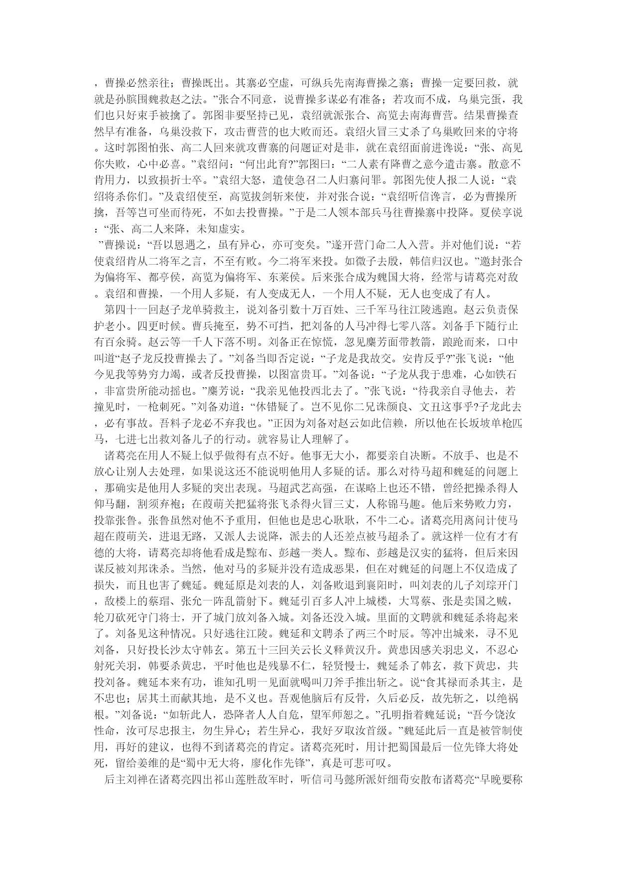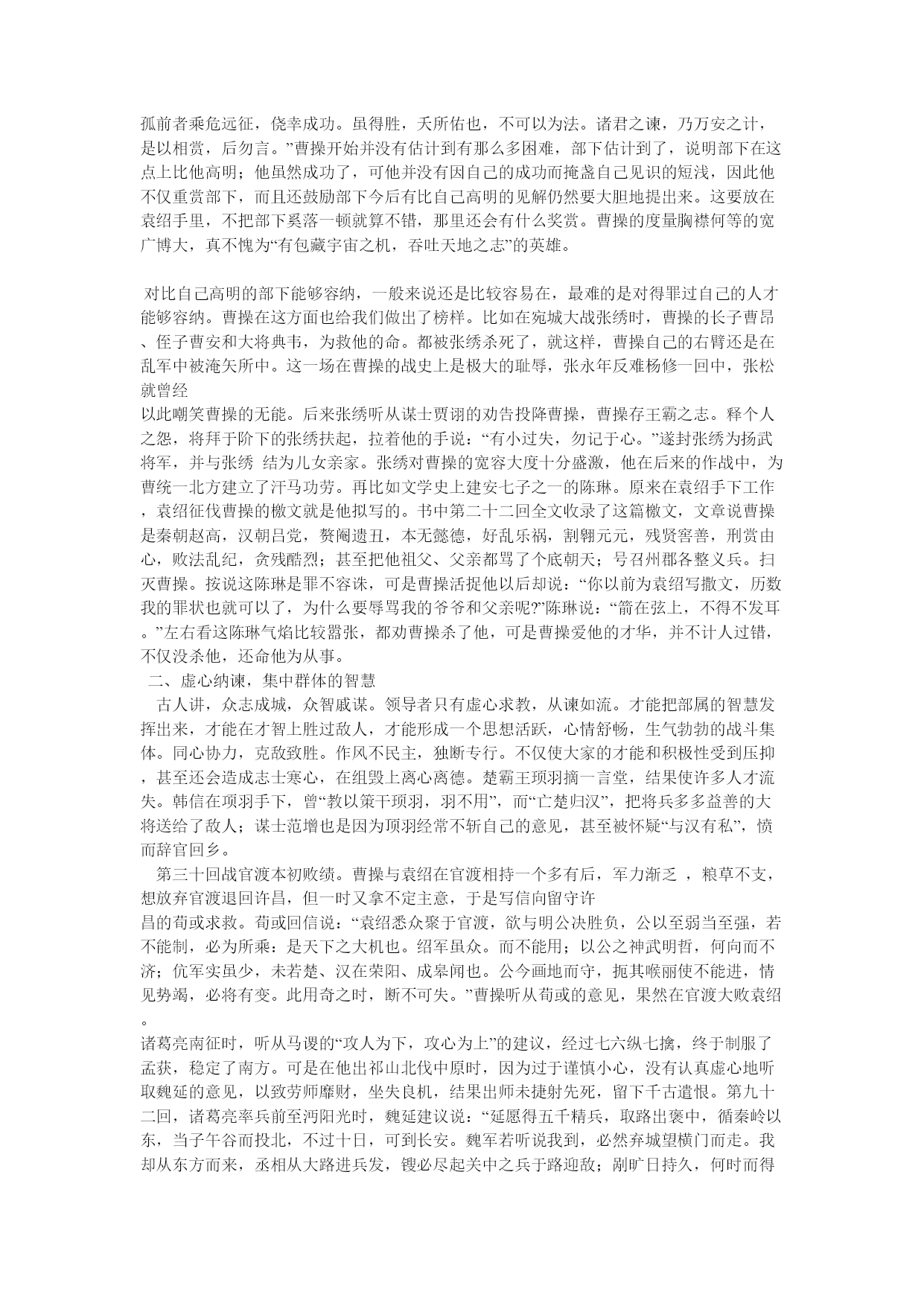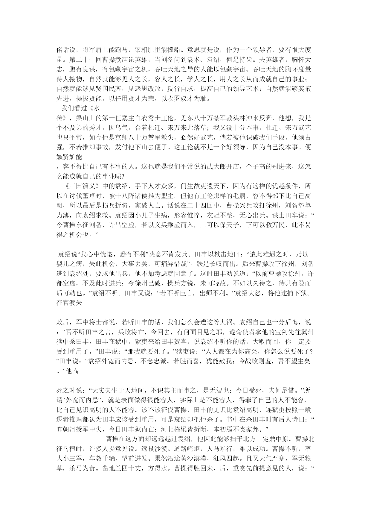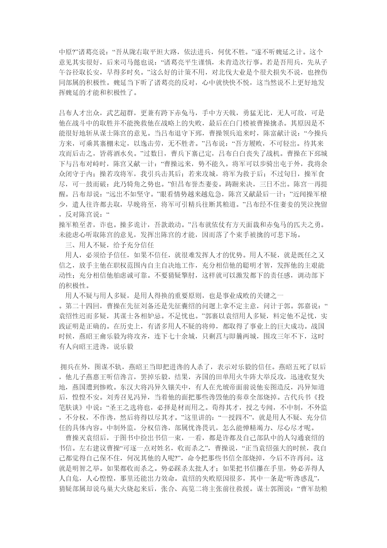 用人之道—《三国演义》 世界上最宝贵的人,更确切一点说,是人才。奇迹要靠人才去创造,光辉的业绩要靠人才去建立,灿烂的未来要靠人才去书写。先秦时期,孔子明确提出“举贤才”的主张;墨子在《尚贤》一书中说:“贤者为政则国治,愚者为政则国乱”,“国有贤良之士众,则国家之治厚,贤良之士寡,则国家之治薄”,人才是“国家之珍”、“社稷之佐”,并主张“贤者举而上之,富而贵之,以为官长;不肖者抑而废之,贫而贱之,以为徒役”,“农与工肆之人,有能则举之,高予之爵,重予之禄,任之以事”。历史上的曹操是一个善于用人的政治家,他在赤壁战败之后,多次下求贤令,注重用人唯才,实行“唯才是举”,不管是“负污辱之名,见笑之行”,甚至是“不仁不孝”,只要有“治国用兵”本领的人,都一律加以任用。朱元璋认为,“贤才,国之宝也”,“天下之治,天下之贤共理也”,“人君之能政治者,为其有贤人而为之辅也”,“贤才不备,不足为治”。总之,凡是昌盛时代,必然是人才涌现的时代;凡是兴旺发达的国家或民族,必然是能够吸引人才的国家或民族;凡是卓越的领导者,必然是善于用人领导者。汉高祖刘邦,他起于一个亭长,论本事也没有什么文凭或杰出的地方,他之所以能在秦末的混战中终于夺得天下,关键就在于善于用人。他大不定期天下之后,在积阳南宫置酒大宴群臣。他说:“列侯诸将无敢隐联,皆言其情。吾所以有天下者何?项氏之所以失天下者何?”高起、王陵对曰:“陛下慢而侮人,项羽仁而爱人。然陛下使人攻城略地,所降下者因以予之,与天下同利也。项羽妒贤嫉能,有功者达之,贤者疑之,战胜而不予人功,得地而不与人利,此所以失天下也。”高祖曰:“公知其一,未知其二。夫运筹策帷帐之中,决胜于千里之外,吾不如子房;镇国[家,抚百姓,给馈饷,不绝粮道,吾不如肖何;库百万之军,战必胜,攻必取,吾不如韩信。此三人者,皆人杰也,吾能用之,此吾所以取天下也。”诸葛亮在《隆中对策》中说:“曹操势不及袁绍,而竟能克绍者,非惟天时,抑亦人谋也。”这就告诉我们,得人才就能得天下,善于用人,就能惟弱胜强,转败为胜。作为一个领导者来说,他的最主要的工作就是科不这决策和善于用人,英国陆军无帅蒙哥马利说:“我的工作时间也许在三分之一用于人员的考虑上。”明朝游击将军何良臣说:“任力者劳,任人者逸。善任人者,总其纲则万日张,握其纪则万目起,虽治千百万众,何以劳为。故曰:任人者多而不劳。”他说的“任力”就是只用一已的力量,“任人”就是善于使用人才。他认为善于使用人才,就象抓纲举目那样抓住了关键。虽然统领千百万大军,但举重若轻,治众如寡,收“多而不劳”之效,这的确是非常高明的领导艺术。在《三国演义》这部形象的兵书中,我们不仅可以了解那个时代军阀争战的史实和壮观场面,而且能够在如何使用人才上得到深刻的启增添。刘备前半生东奔西走,一无所成,搞到最后甚至连立足之地都没有,原因何在,没有人才,手下只有关、张二人,成不了气侯。后来,得“伏龙凤雏”相佐,又有“五虎上将”效力,才迅速取得了西川为根据地,才有能力和孙权、曹操抗衡。袁绍号称谋士如云,战将如雨,文有田丰、沮授、许攸、审配,武有颜良、文丑、张合、高览,文臣武将,齐聚帐下,人才济济,但是袁绍却失败了,原因何在,不会用人。那么从《三国演义》我们能够悟出哪些用人之道呢?大而言之,有如下六个方面。一、宽容大度,不嫉贤妒能俗话说,将军肩上能跑马,宰相肚里能撑船。意思就是说,作为一个领导者,要有很大度量。第二十一回曹操煮酒论英雄,当刘备问到袁术、袁绍,何足持齿。夫英雄者,胸怀大志,腹有良谋,有包藏宇宙之机,吞吐天地之导的人能以包藏宇宙、吞吐天地的胸怀度量待人接物,自然就能够见人之长,容人之长,学人之长,用人之长从而成就自己的事业;自然就能够见贤国民齐,见恶思改败,反省自求,提高自己的领导艺术;自然就能够奖掖先进,提拔贤能,以任用贤才为荣,以收罗奴才为耻。我们看过《水传》,梁山上的第一任寨主白衣秀士王伦,见东八十万禁军教头林冲来反奔,他想,我是个不及弟的秀才,因鸟气,合着杜迁、宋万来此落草;我又没十分本事,杜迁、宋万武艺也只平常,如今他是京师八十万禁军教头,必然好武艺,倘若被他识破我们手段,他须占强,不若推却事故,发付他下山去便了。这王伦就不是一个好领导,因为自己没本事。便嫉贤妒能,容不得比自己有本事的人。这也就是我们平常说的武大郎开店,个子高的别进来,这怎么能成就自己的事业呢?《三国演义》中的袁绍,手下人才众多,门生故吏遗天下,因为有这样的优越条件,所以在讨伐董卓时,被十八阵诸侯推为盟主。但他有王伦那样的毛病,容不得部下比自己高明,所以最后是损兵折将,家破人亡。话说在二十四回中,曹操兴兵攻打徐州,刘备势单力薄,向袁绍求救。袁绍因小儿子生病,形容惟悴,衣冠不整,无心出兵。谋士田车说:“今曹操东征刘备,许昌空虚,若以义兵乘虚而入,上