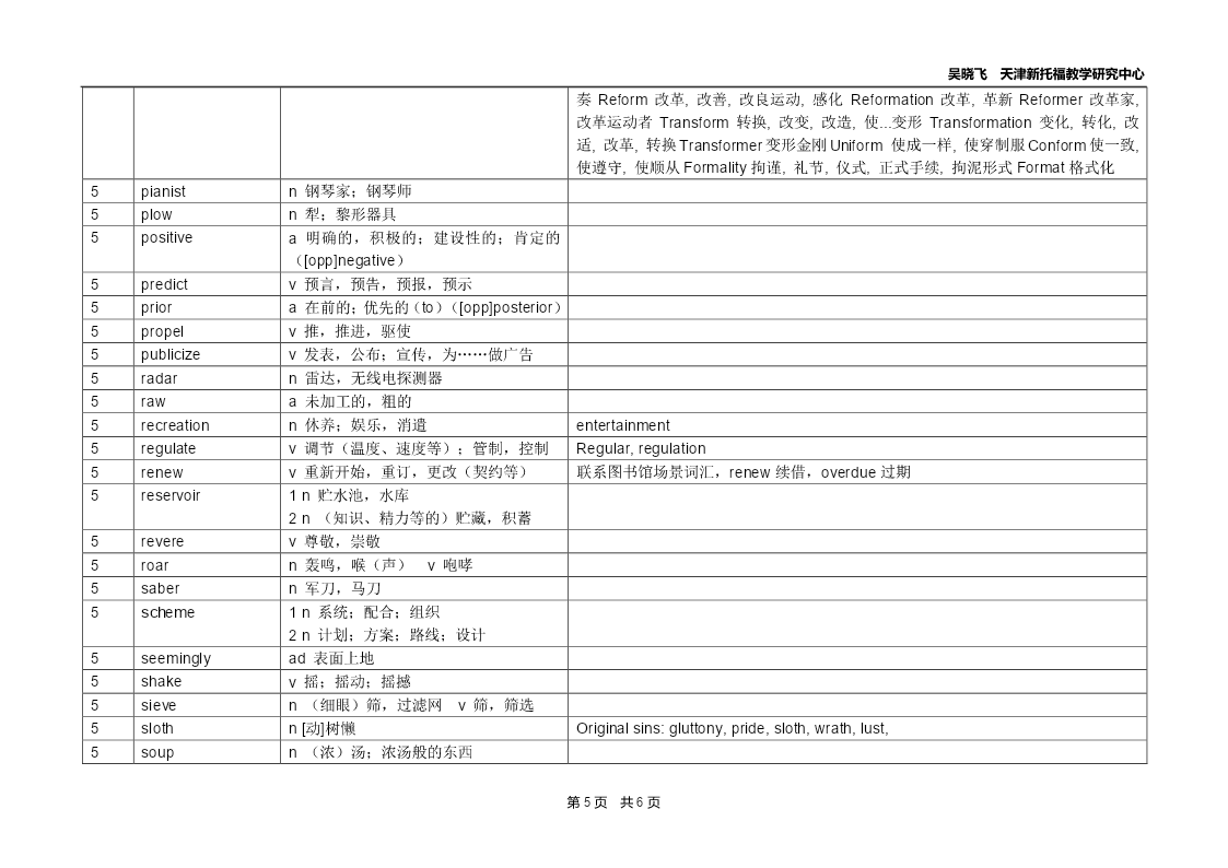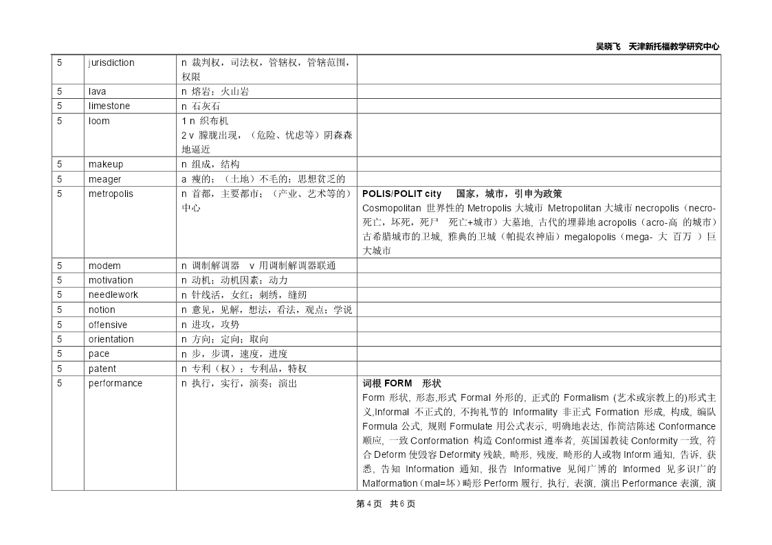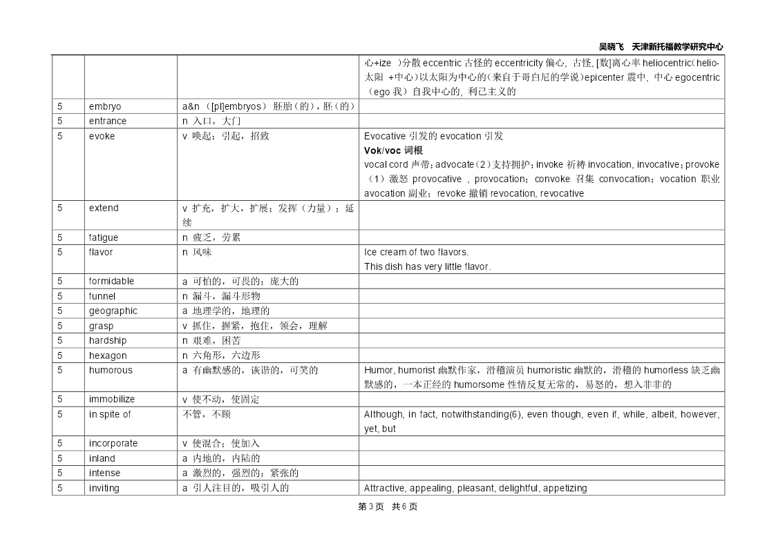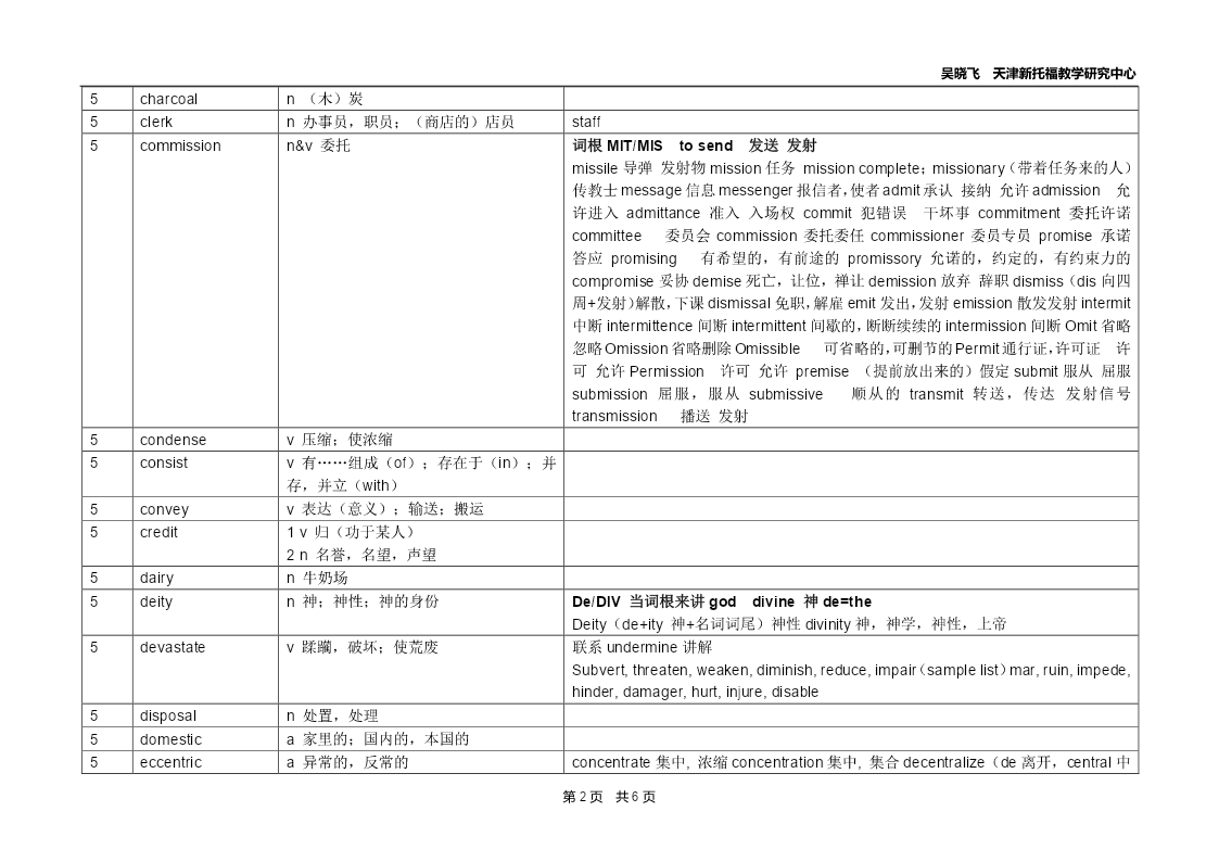 吴晓飞天津新托福教学研究中心 模块十一:新托福2140核心词汇讲解 Unit单词释义 5abrupta突然的,生硬的Rupt词根意思为断裂 5acquaintv使熟悉,了解[多用被动语态]Acquaintance认识相识了解 5agentn作用物;成分 5amplea丰富的,充足的,富裕的联系sample,sample是ample的 构词转换法:-ify使动:amplify放大;clear清楚clarify弄清楚弄明白;mode模式 modify(8)修饰modifier修饰语modification修饰;-ize使动:author作者authorize 授权;mini小minimize最小化;-ate使动:timid胆小的intimidate恐吓;vigor精力 充沛的invigorate使某人精力充沛vigorous(14)精力充沛的;toxic(6)毒药的 intoxicate上瘾;assassin刺杀assassinate刺杀;vibrant(12)震动颤动vibrate(13) 震动颤动vibration震动颤动;fury愤怒的,怒火中烧的infuriate使愤怒,激怒;labor 工作劳动elaborate(12)精心计划的,详尽的;long长elongate延长拉长value价 值evaluate评估;vapor水蒸气evaporate(3)蒸发 5archn拱门;弓形门v把……做成拱形;使 弯做弓形 5assume1v假定,想象,设想;以……为先决条 件 2v承担,担任 5axisn轴,轴线 5batteryn[电]电池(组) 5bitev咬,叮,蛰;紧咬n一小口(食物), 少量(食物) 5boycottn联合抵制;联合拒绝购买(使用、销售Aboycottisarefusaltobeinvolvedwithsomethingthatyoustronglydisapproveof, 等)forexamplearefusaltogotoaparticularmeetingorbuyfoodfromaparticular country. 5burdenn担子,负担,包袱 5canopyn(树)冠;冠层 5cathedraln大教堂 吴晓飞天津新托福教学研究中心 5charcoaln(木)炭 5clerkn办事员,职员;(商店的)店员staff 5commissionn&v委托词根MIT/MIStosend发送发射 missile导弹发射物mission任务missioncomplete;missionary(带着任务来的人) 传教士message信息messenger报信者,使者admit承认接纳允许admission允 许进入admittance准入入场权commit犯错误干坏事commitment委托许诺 committee委员会commission委托委任commissioner委员专员promise承诺 答应promising有希望的,有前途的promissory允诺的,约定的,有约束力的 compromise妥协demise死亡,让位,禅让demission放弃辞职dismiss(dis向四 周+发射)解散,下课dismissal免职,解雇emit发出,发射emission散发发射intermit 中断intermittence间断intermittent间歇的,断断续续的intermission间断Omit省略 忽略Omission省略删除Omissible可省略的,可删节的Permit通行证,许可证许 可允许Permission许可允许premise(提前放出来的)假定submit服从屈服 submission屈服,服从submissive顺从的transmit转送,传达发射信号 transmission播送发射 5condensev压缩;使浓缩 5consistv有……组成(of);存在于(in);并 存,并立(with) 5conveyv表达(意义);输送;搬运 5credit1v归(功于某人) 2n名誉,名望,声望 5dairyn牛奶场 5deityn神;神性;神的身份De/DIV当词根来讲goddivine神de=the Deity(de+ity神+名词词尾)神性divinity神,神学,神性,上帝 5devastatev蹂躏,破坏;使荒废联系undermine讲解 Subvert,threaten,weaken,diminish,reduce,impair(samplelist)mar,ruin,impede, hinder,damager,hurt,injure,disable 5disposaln处置,处理 5domestica家里的;国内的,本国的 5eccentrica异常的,