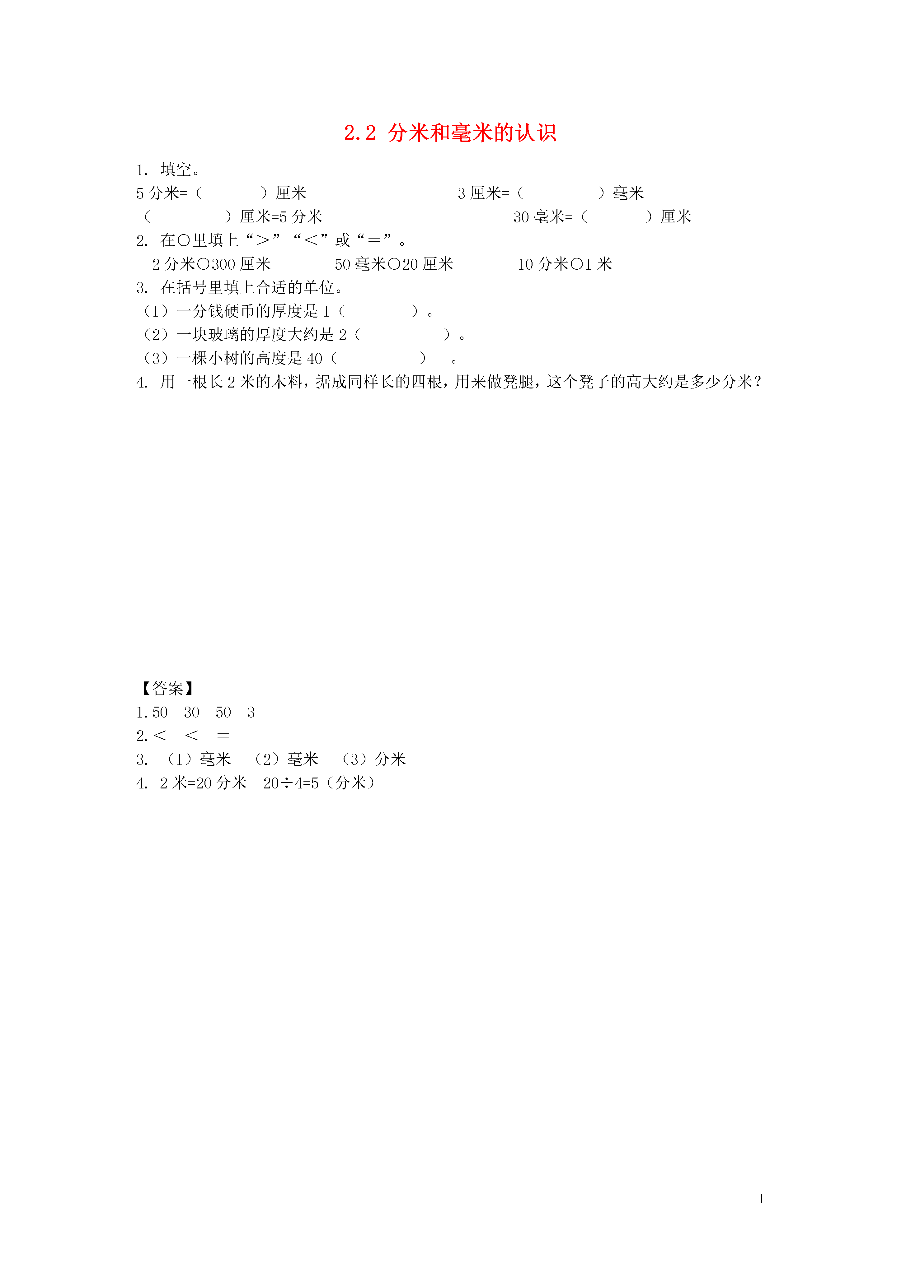 12.2分米和毫米的认识1.填空。5分米=()厘米3厘米=()毫米()厘米=5分米30毫米=()厘米2.在○里填上“>”“<”或“=”。2分米○300厘米50毫米○20厘米10分米○1米3.在括号里填上合适的单位。(1)一分钱硬币的厚度是1()。(2)一块玻璃的厚度大约是2()。(3)一棵小树的高度是40()。4.用一根长2米的木料,据成同样长的四根,用来做凳腿,这个凳子的高大约是多少分米?【答案】1.50305032.<<=3.(1)毫米(2)毫米(3)分米4.2米=20分米20÷4=5(分米)