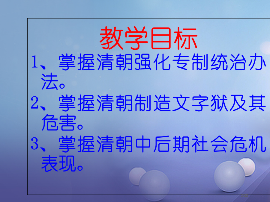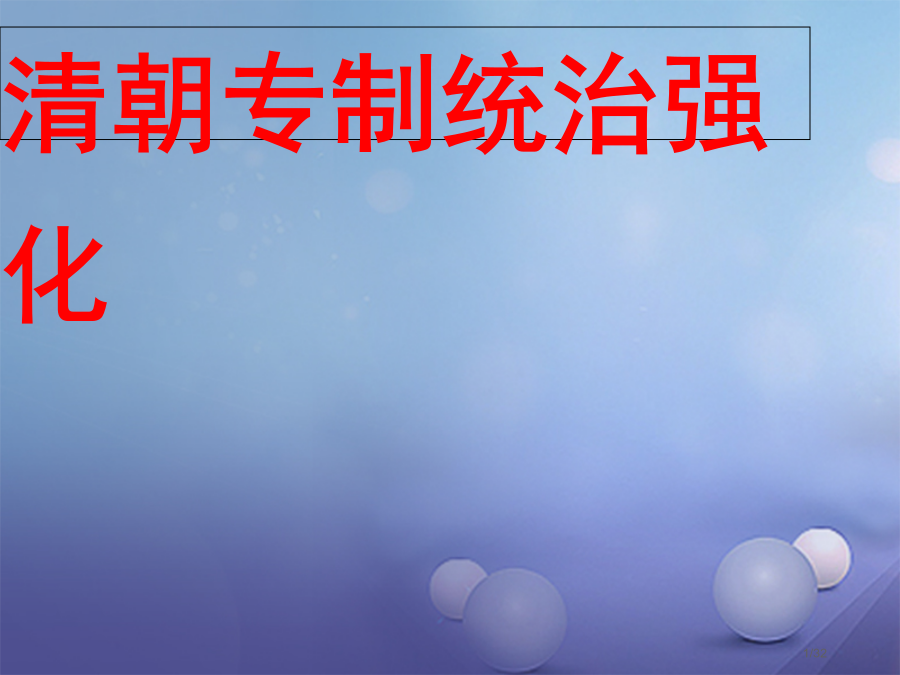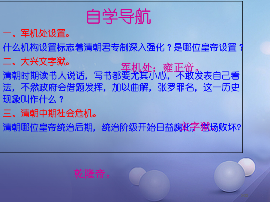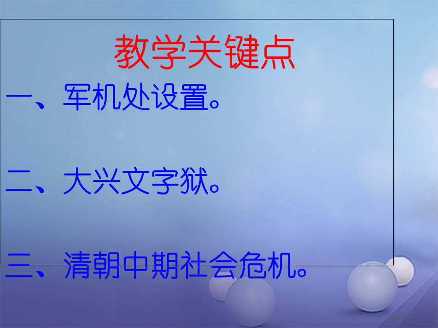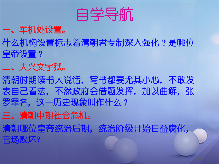 第18课清朝专制统治强化教学目标 1、掌握清朝强化专制统治办法。 2、掌握清朝制造文字狱及其危害。 3、掌握清朝中后期社会危机表现。 教学关键点 一、军机处设置。 二、大兴文字狱。 三、清朝中期社会危机。自学导航 一、军机处设置。 什么机构设置标志着清朝君专制深入强化?是哪位皇帝设置? 二、大兴文字狱。 清朝时期读书人说话,写书都要尤其小心,不敢发表自己看法,不然政府会借题发挥,加以曲解,张罗罪名,这一历史现象叫作什么? 三、清朝中期社会危机。 清朝哪位皇帝统治后期,统治阶级开始日益腐化,官场败坏?自学导航 一、军机处设置。 什么机构设置标志着清朝君专制深入强化?是哪位皇帝设置? 二、大兴文字狱。 清朝时期读书人说话,写书都要尤其小心,不敢发表自己看法,不然政府会借题发挥,加以曲解,张罗罪名,这一历史现象叫作什么? 三、清朝中期社会危机。 清朝哪位皇帝统治后期,统治阶级开始日益腐化,官场败坏? 一、军机处设置。 军机处1.议政王大臣会议2.军机处设置军机处外景军机处值房内景3.军机处作用 二、大兴文字狱。 1.文字狱含义清政府为何要兴起文字狱? 统治者为加强对人民思想控制,压制反清意识。3.文字狱危害查嗣庭担任江西乡试主考官时,出题“维民所止”,这原来是《诗经》上,可硬是被告密说“维止”二字是“雍正”去了头,雍正于是钦定了“大逆不道”罪名,株连范围也极为广泛。 三、清朝中期社会危机。1.官场腐败相关史事2.军队腐败想一想,吏治腐败会对社会造成什么影响?3.财政危机相关史事4.社会危机相关史事清朝流民图28/32课堂小结 一、军机处设置。 二、大兴文字狱。 三、清朝中期社会危机。1、清朝大兴“文字狱”与秦朝“焚书坑儒”根本目标是() A.预防人民反抗 B.加强思想控制,巩固君主专制 C.压制知识分子2、标志着我国封建君主专制主义中央集权制度发展到顶峰是A.废丞相制度,设置内阁 B.设置议政王大臣会议 C.设置军机处 D.设置理藩院再见!