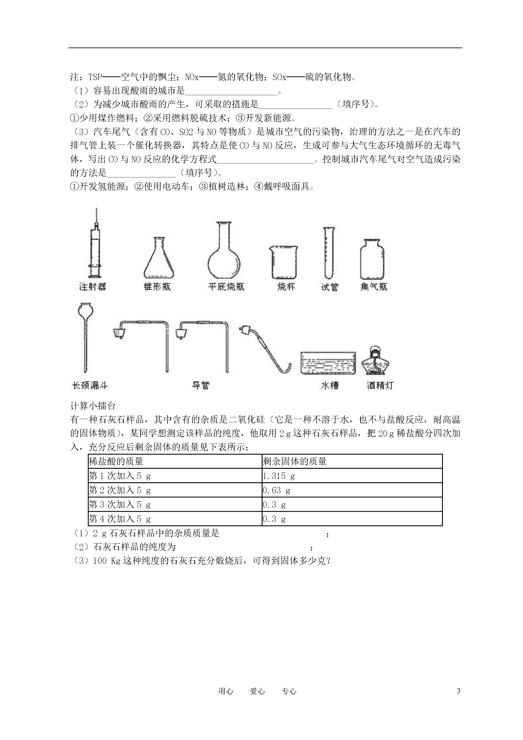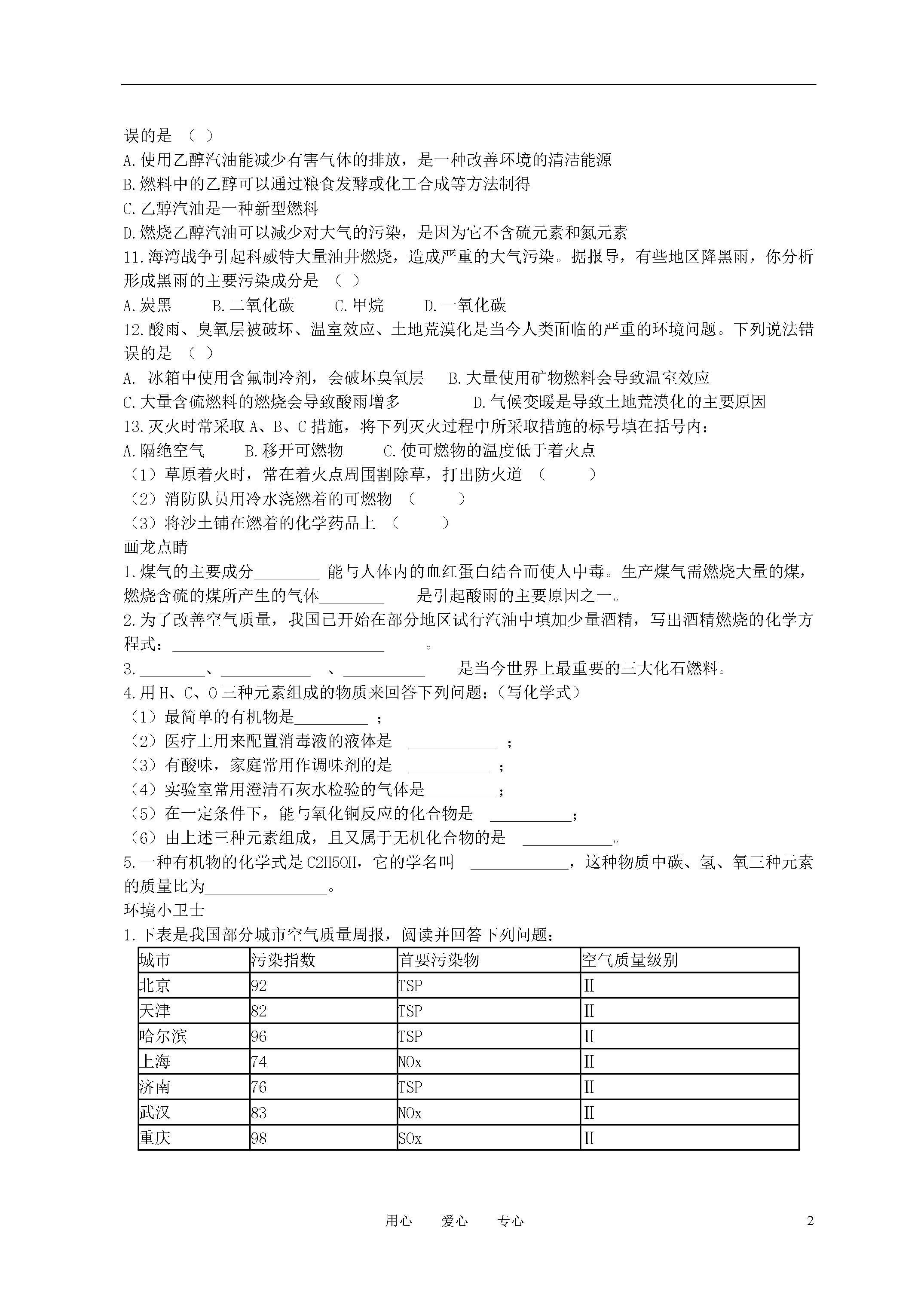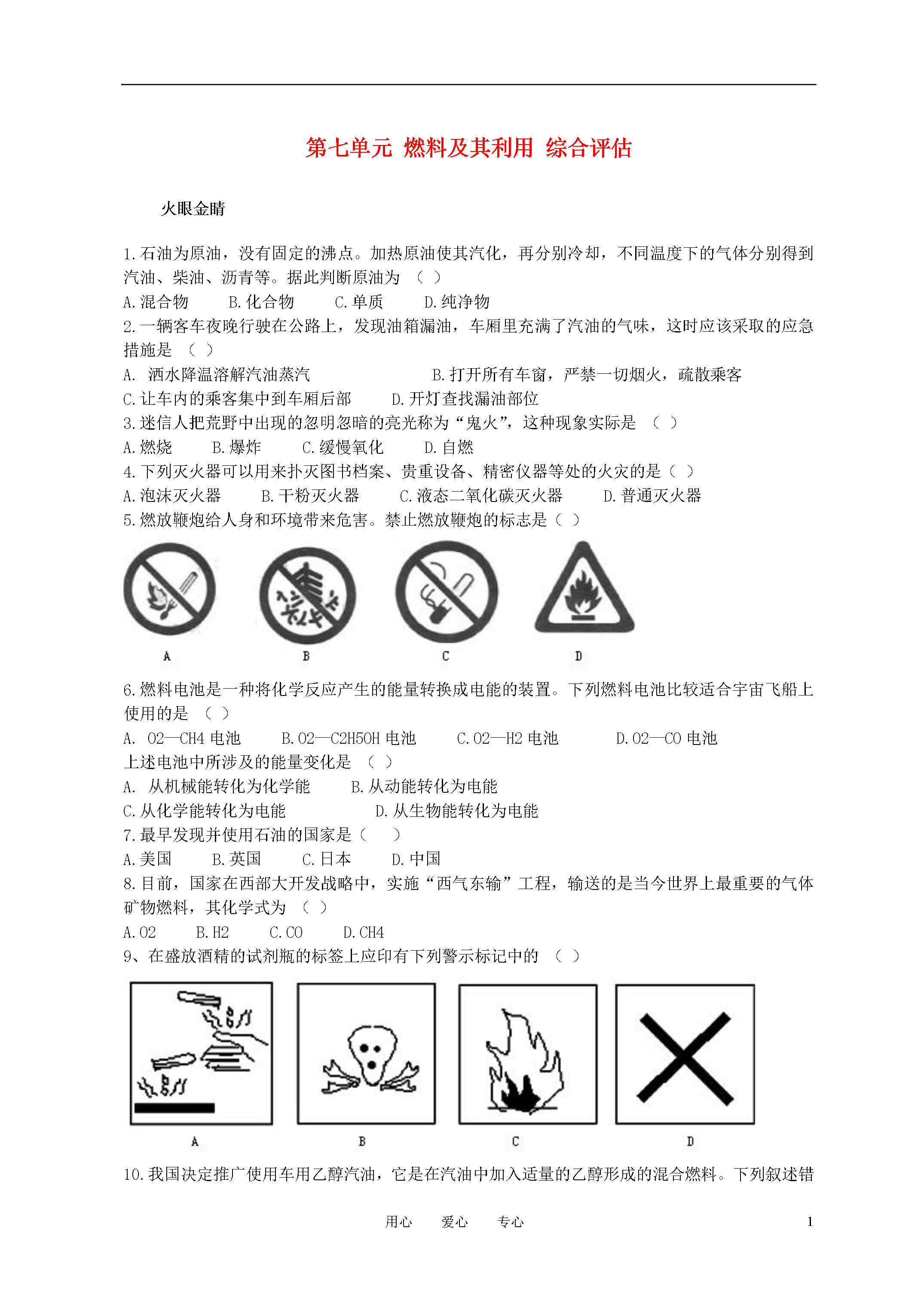 3用心爱心专心第七单元燃料及其利用综合评估火眼金睛1.石油为原油,没有固定的沸点。加热原油使其汽化,再分别冷却,不同温度下的气体分别得到汽油、柴油、沥青等。据此判断原油为()A.混合物B.化合物C.单质D.纯净物2.一辆客车夜晚行驶在公路上,发现油箱漏油,车厢里充满了汽油的气味,这时应该采取的应急措施是()A.洒水降温溶解汽油蒸汽B.打开所有车窗,严禁一切烟火,疏散乘客C.让车内的乘客集中到车厢后部D.开灯查找漏油部位3.迷信人把荒野中出现的忽明忽暗的亮光称为“鬼火”,这种现象实际是()A.燃烧B.爆炸C.缓慢氧化D.自燃4.下列灭火器可以用来扑灭图书档案、贵重设备、精密仪器等处的火灾的是()A.泡沫灭火器B.干粉灭火器C.液态二氧化碳灭火器D.普通灭火器5.燃放鞭炮给人身和环境带来危害。禁止燃放鞭炮的标志是()6.燃料电池是一种将化学反应产生的能量转换成电能的装置。下列燃料电池比较适合宇宙飞船上使用的是()A.O2—CH4电池B.O2—C2H5OH电池C.O2—H2电池D.O2—CO电池上述电池中所涉及的能量变化是()A.从机械能转化为化学能B.从动能转化为电能C.从化学能转化为电能D.从生物能转化为电能7.最早发现并使用石油的国家是()A.美国B.英国C.日本D.中国8.目前,国家在西部大开发战略中,实施“西气东输”工程,输送的是当今世界上最重要的气体矿物燃料,其化学式为()A.O2B.H2C.COD.CH49、在盛放酒精的试剂瓶的标签上应印有下列警示标记中的()10.我国决定推广使用车用乙醇汽油,它是在汽油中加入适量的乙醇形成的混合燃料。下列叙述错误的是()A.使用乙醇汽油能减少有害气体的排放,是一种改善环境的清洁能源B.燃料中的乙醇可以通过粮食发酵或化工合成等方法制得C.乙醇汽油是一种新型燃料D.燃烧乙醇汽油可以减少对大气的污染,是因为它不含硫元素和氮元素11.海湾战争引起科威特大量油井燃烧,造成严重的大气污染。据报导,有些地区降黑雨,你分析形成黑雨的主要污染成分是()A.炭黑B.二氧化碳C.甲烷D.一氧化碳12.酸雨、臭氧层被破坏、温室效应、土地荒漠化是当今人类面临的严重的环境问题。下列说法错误的是()A.冰箱中使用含氟制冷剂,会破坏臭氧层B.大量使用矿物燃料会导致温室效应C.大量含硫燃料的燃烧会导致酸雨增多D.气候变暖是导致土地荒漠化的主要原因13.灭火时常采取A、B、C措施,将下列灭火过程中所采取措施的标号填在括号内:A.隔绝空气B.移开可燃物C.使可燃物的温度低于着火点(1)草原着火时,常在着火点周围割除草,打出防火道()(2)消防队员用冷水浇燃着的可燃物()(3)将沙土铺在燃着的化学药品上()画龙点睛1.煤气的主要成分____能与人体内的血红蛋白结合而使人中毒。生产煤气需燃烧大量的煤,燃烧含硫的煤所产生的气体____是引起酸雨的主要原因之一。2.为了改善空气质量,我国已开始在部分地区试行汽油中填加少量酒精,写出酒精燃烧的化学方程式:_____________。3.________、___________、__________是当今世界上最重要的三大化石燃料。4.用H、C、O三种元素组成的物质来回答下列问题:(写化学式)(1)最简单的有机物是_________;(2)医疗上用来配置消毒液的液体是___________;(3)有酸味,家庭常用作调味剂的是__________;(4)实验室常用澄清石灰水检验的气体是_________;(5)在一定条件下,能与氧化铜反应的化合物是__________;(6)由上述三种元素组成,且又属于无机化合物的是___________。5.一种有机物的化学式是C2H5OH,它的学名叫____________,这种物质中碳、氢、氧三种元素的质量比为_______________。环境小卫士1.下表是我国部分城市空气质量周报,阅读并回答下列问题:城市污染指数首要污染物空气质量级别北京92TSPⅡ天津82TSPⅡ哈尔滨96TSPⅡ上海74NOxⅡ济南76TSPⅡ武汉83NOxⅡ重庆98SOxⅡ注:TSP──空气中的飘尘;NOx──氮的氧化物;SOx──硫的氧化物。(1)容易出现酸雨的城市是____________________。(2)为减少城市酸雨的产生,可采取的措施是________________(填序号)。①少用煤作燃料;②采用燃料脱硫技术;③开发新能源。(3)汽车尾气(含有CO、SO2与NO等物质)是城市空气的污染物,治理的方法之一是在汽车的排气管上装一个催化转换器,其特点是使CO与NO反应,生成可参与大气生态环境循环的无毒气体,写出CO与NO反应的化学方程式_____________________。控制城市汽车尾气对空气造成污染的方法是_______________(填序号