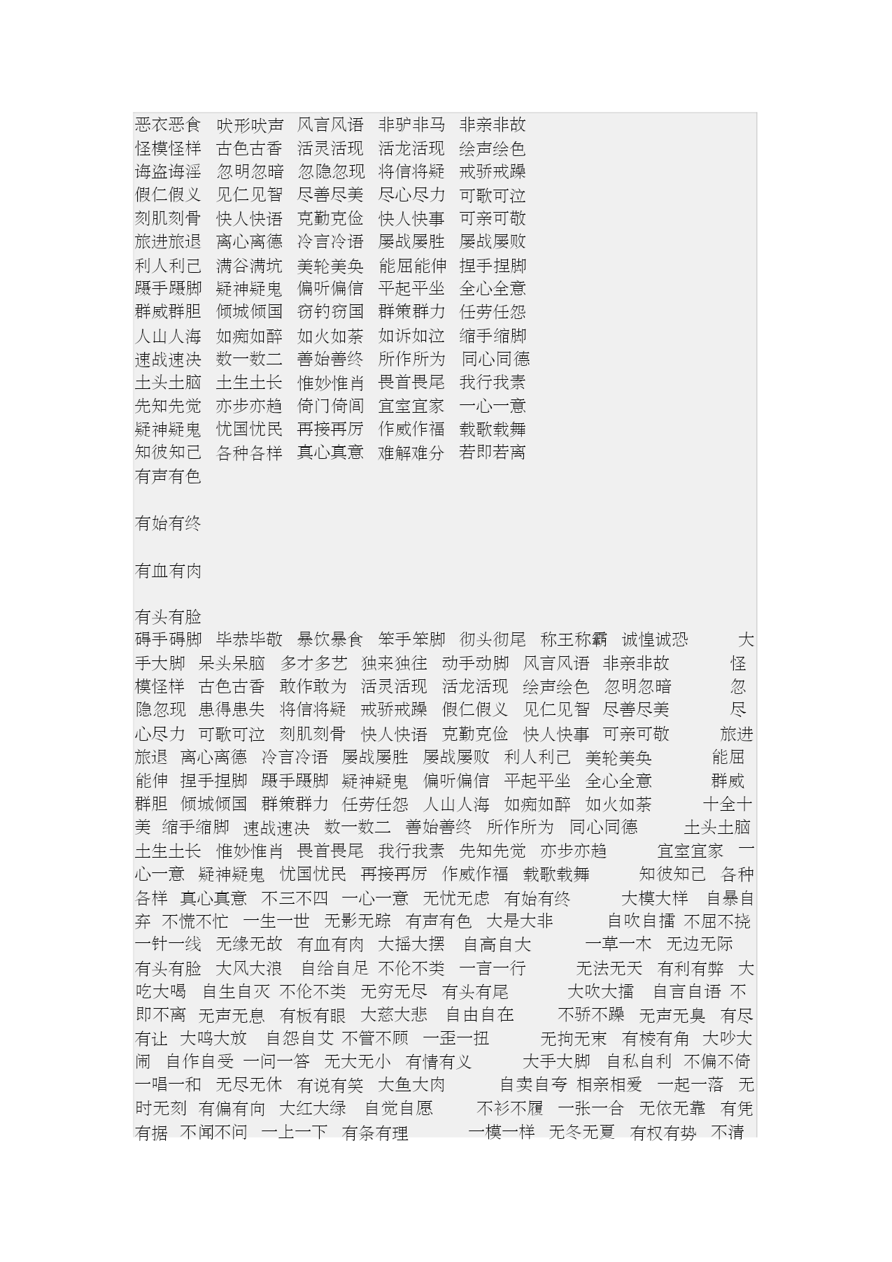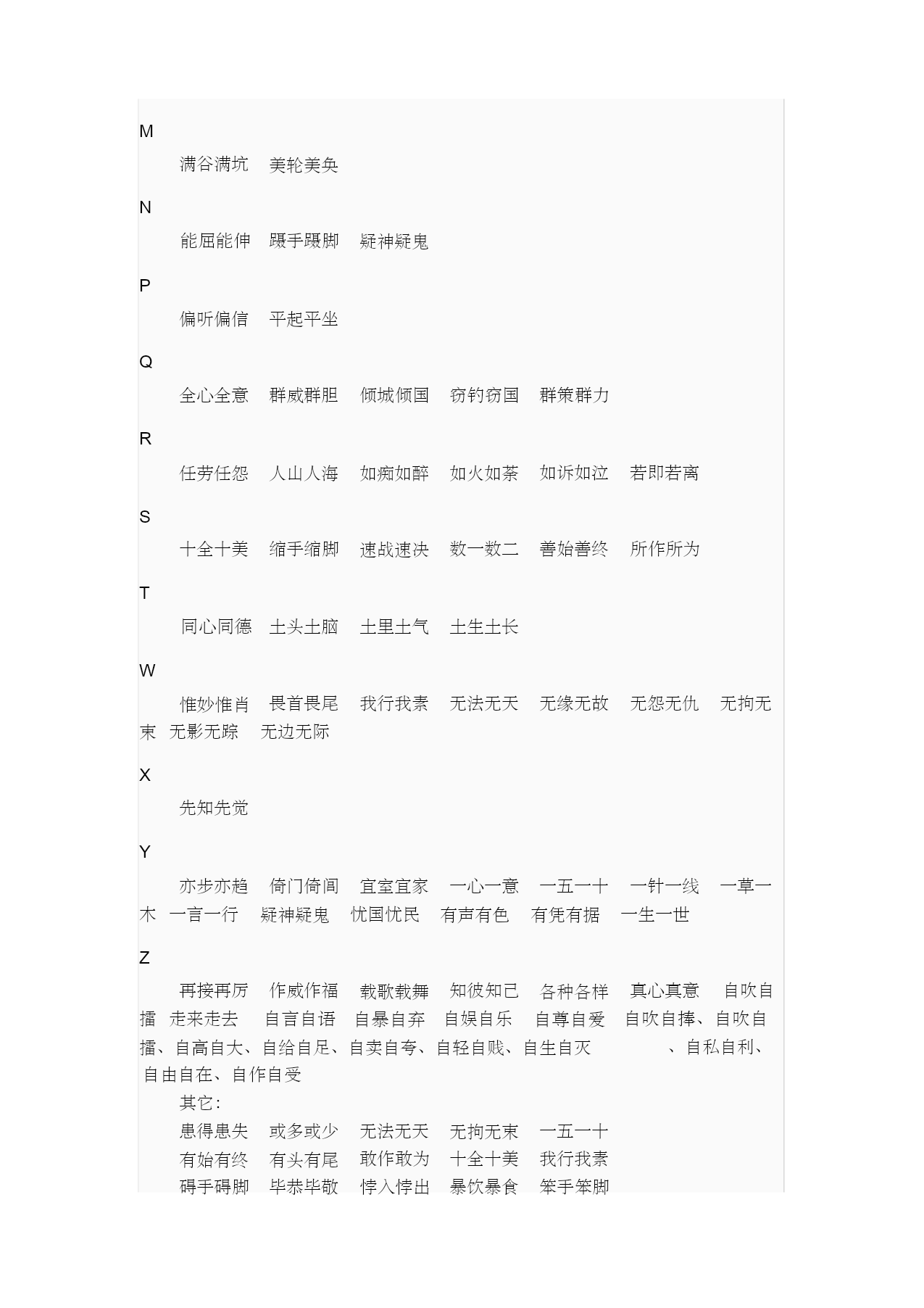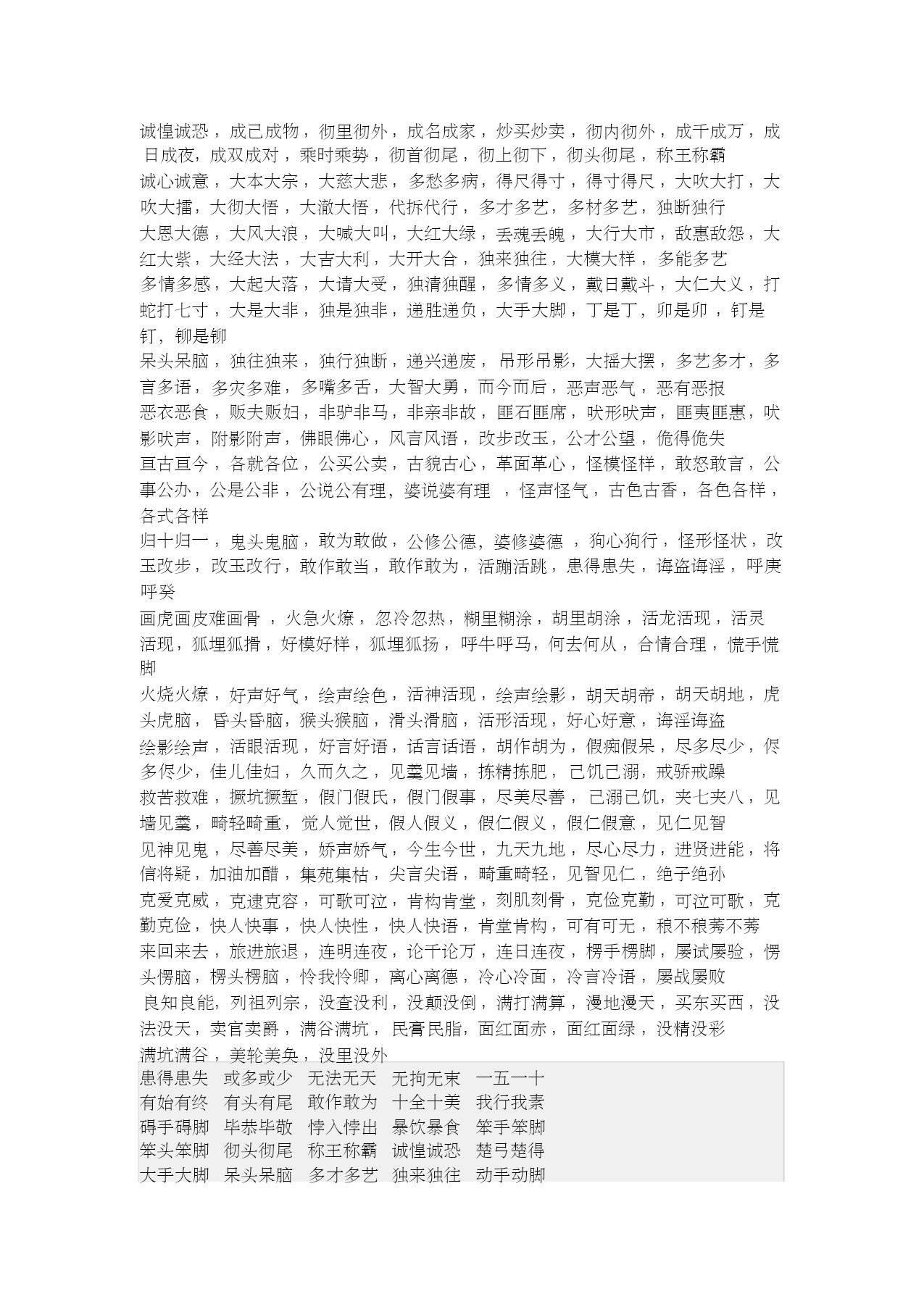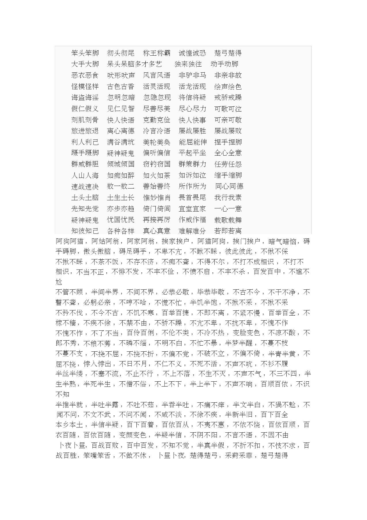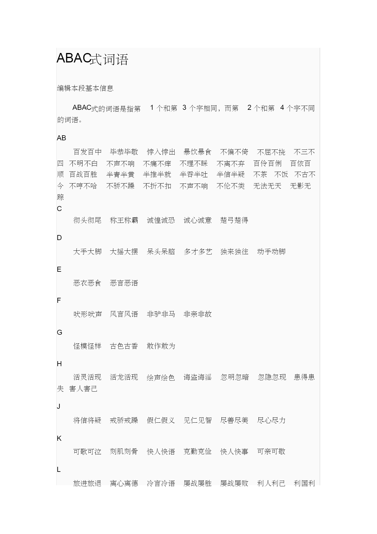 ABAC式词语 编辑本段基本信息 ABAC式的词语是指第1个和第3个字相同,而第2个和第4个字不同 的词语。 AB 百发百中毕恭毕敬悖入悖出暴饮暴食不偏不倚不屈不挠不三不 四不明不白不声不响不痛不痒不理不睬不离不弃百伶百俐百依百 顺百战百胜半青半黄半推半就半吞半吐半信半疑不茶不饭不古不 今不哼不哈不骄不躁不折不扣不声不响不伦不类无法无天无影无 踪 C 彻头彻尾称王称霸诚惶诚恐诚心诚意楚弓楚得 D 大手大脚大摇大摆呆头呆脑多才多艺独来独往动手动脚 E 恶衣恶食恶言恶语 F 吠形吠声风言风语非驴非马非亲非故 G 怪模怪样古色古香敢作敢为 H 活灵活现活龙活现绘声绘色诲盗诲淫忽明忽暗忽隐忽现患得患 失害人害己 J 将信将疑戒骄戒躁假仁假义见仁见智尽善尽美尽心尽力 K 可歌可泣刻肌刻骨快人快语克勤克俭快人快事可亲可敬 L 旅进旅退离心离德冷言冷语屡战屡胜屡战屡败利人利己利国利 M 满谷满坑美轮美奂 N 能屈能伸蹑手蹑脚疑神疑鬼 P 偏听偏信平起平坐 Q 全心全意群威群胆倾城倾国窃钓窃国群策群力 R 任劳任怨人山人海如痴如醉如火如荼如诉如泣若即若离 S 十全十美缩手缩脚速战速决数一数二善始善终所作所为 T 同心同德土头土脑土里土气土生土长 W 惟妙惟肖畏首畏尾我行我素无法无天无缘无故无怨无仇无拘无 束无影无踪无边无际 X 先知先觉 Y 亦步亦趋倚门倚闾宜室宜家一心一意一五一十一针一线一草一 木一言一行疑神疑鬼忧国忧民有声有色有凭有据一生一世 Z 再接再厉作威作福载歌载舞知彼知己各种各样真心真意自吹自 擂走来走去自言自语自暴自弃自娱自乐自尊自爱自吹自捧、自吹自 擂、自高自大、自给自足、自卖自夸、自轻自贱、自生自灭、自私自利、 自由自在、自作自受 其它: 患得患失或多或少无法无天无拘无束一五一十 有始有终有头有尾敢作敢为十全十美我行我素 碍手碍脚毕恭毕敬悖入悖出暴饮暴食笨手笨脚 笨头笨脚彻头彻尾称王称霸诚惶诚恐楚弓楚得 大手大脚呆头呆脑多才多艺独来独往动手动脚 恶衣恶食吠形吠声风言风语非驴非马非亲非故 怪模怪样古色古香活灵活现活龙活现绘声绘色 诲盗诲淫忽明忽暗忽隐忽现将信将疑戒骄戒躁 假仁假义见仁见智尽善尽美尽心尽力可歌可泣 刻肌刻骨快人快语克勤克俭快人快事可亲可敬 旅进旅退离心离德冷言冷语屡战屡胜屡战屡败 利人利己满谷满坑美轮美奂能屈能伸捏手捏脚 蹑手蹑脚疑神疑鬼偏听偏信平起平坐全心全意 群威群胆倾城倾国窃钓窃国群策群力任劳任怨 人山人海如痴如醉如火如荼如诉如泣缩手缩脚 速战速决数一数二善始善终所作所为同心同德 土头土脑土生土长惟妙惟肖畏首畏尾我行我素 先知先觉亦步亦趋倚门倚闾宜室宜家一心一意 疑神疑鬼忧国忧民再接再厉作威作福载歌载舞 知彼知己各种各样真心真意难解难分若即若离 阿狗阿猫,阿姑阿翁,阿家阿翁,挨家挨户,阿猫阿狗,挨门挨户,暗气暗恼,碍 手碍脚,傲头傲脑,碍足碍手,不卑不亢,不瞅不睬,彼此彼此,不偢不倸 不揪不睬,不茶不饭,不存不济,不痴不聋,不得不尔,不打不成相识,不打不 相识,不当不正,不悱不发,不丰不俭,不愤不启,不丰不杀,百发百中,不尴不 尬 不管不顾,半间半界,不间不界,必恭必敬,毕恭毕敬,不古不今,不干不净,不 瞽不聋,必躬必亲,不哼不哈,不慌不忙,半饥半饱,不揪不采,不揪不采 不矜不伐,不今不古,不饥不寒,百举百捷,不即不离,不紧不慢,百举百全,不 稼不穑,不疾不徐,不禁不由,不骄不躁,不亢不卑,不抗不卑,不愧不作 不愧不怍,不了不当,百伶百俐,不伦不类,不冷不热,变脸变色,不凉不酸,不 郎不秀,不稂不莠,不磷不缁,不明不白,不忙不暴,半梦半醒,不蔓不枝 不蔓不支,不挠不屈,不挠不折,不偏不党,不破不立,不偏不倚,半青半黄,不 屈不挠,悖入悖出,不日不月,不仁不义,不死不活,不声不吭,不衫不履 半丝半缕,不塞不流,不止不行,不上不落,不生不灭,不声不气,不三不四,半 生半熟,半死半生,不僧不俗,不上不下,半上半下,不声不响,百顺百依,不识 不知 半推半就,半吐半露,不吐不茹,半吞半吐,不痛不痒,半文半白,不猧不魀,不 闻不问,不文不武,不问不闻,不咸不淡,不徐不疾,半新半旧,百下百全 本乡本土,半信半疑,百下百着,百依百从,不夷不惠,不依不饶,百依百顺,百 衣百随,百依百随,变颜变色,半疑半信,不阴不阳,不言不语,不因不由 卜夜卜昼,百战百败,百中百发,不知不觉,半真半假,不折不扣,不忮不求,百 战百胜,笨嘴笨舌,不做不休,卜昼卜夜,楚得楚弓,采葑采菲,楚弓楚得 诚惶诚恐,成己成物,彻里彻外,成名成家,炒买炒卖,彻内彻外,成千成万,成 日成夜,成双成对,乘时乘势,彻首彻尾,彻上彻下,彻头彻尾,称王称霸 诚心诚意,大本大宗,大慈大悲,多愁多病,得尺得寸,得寸得尺,大吹