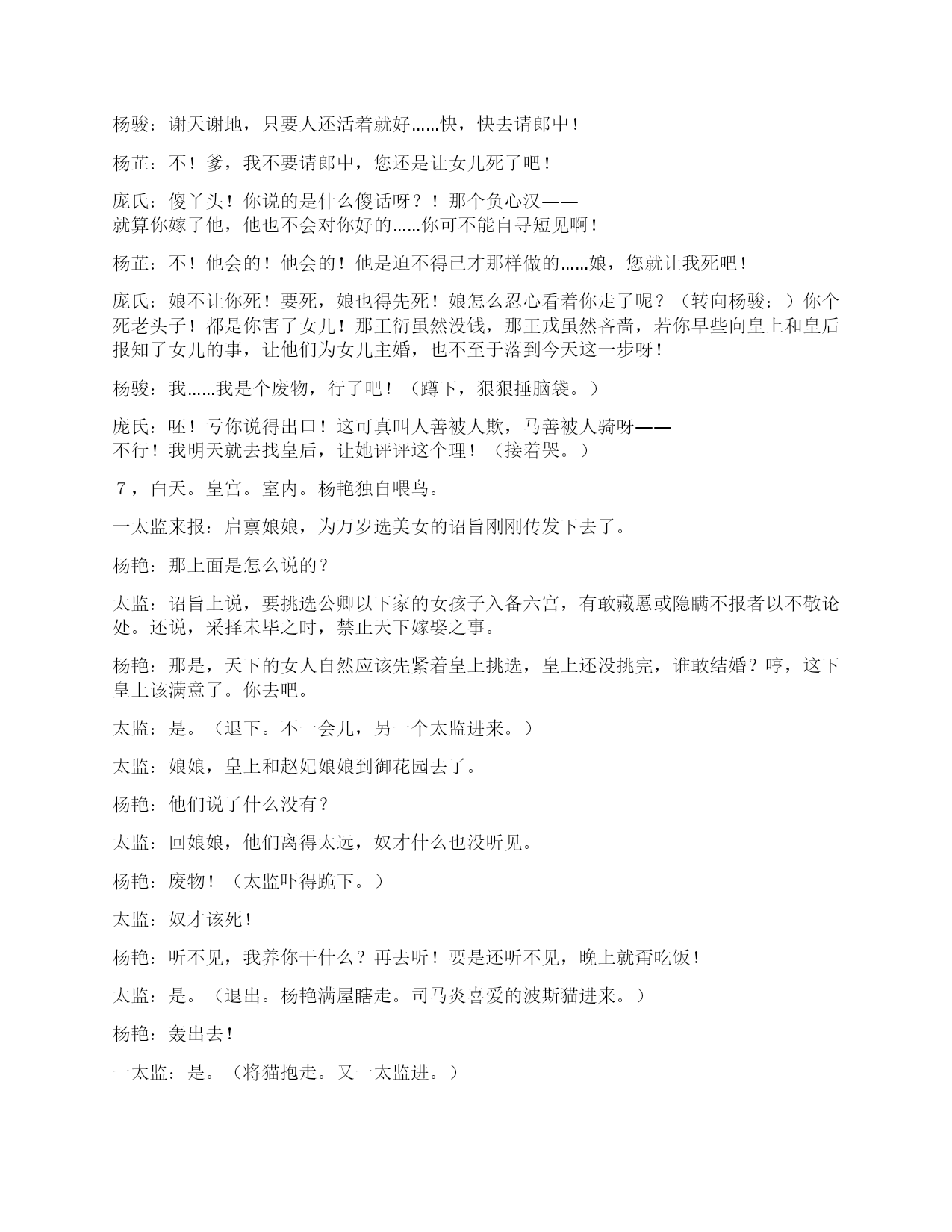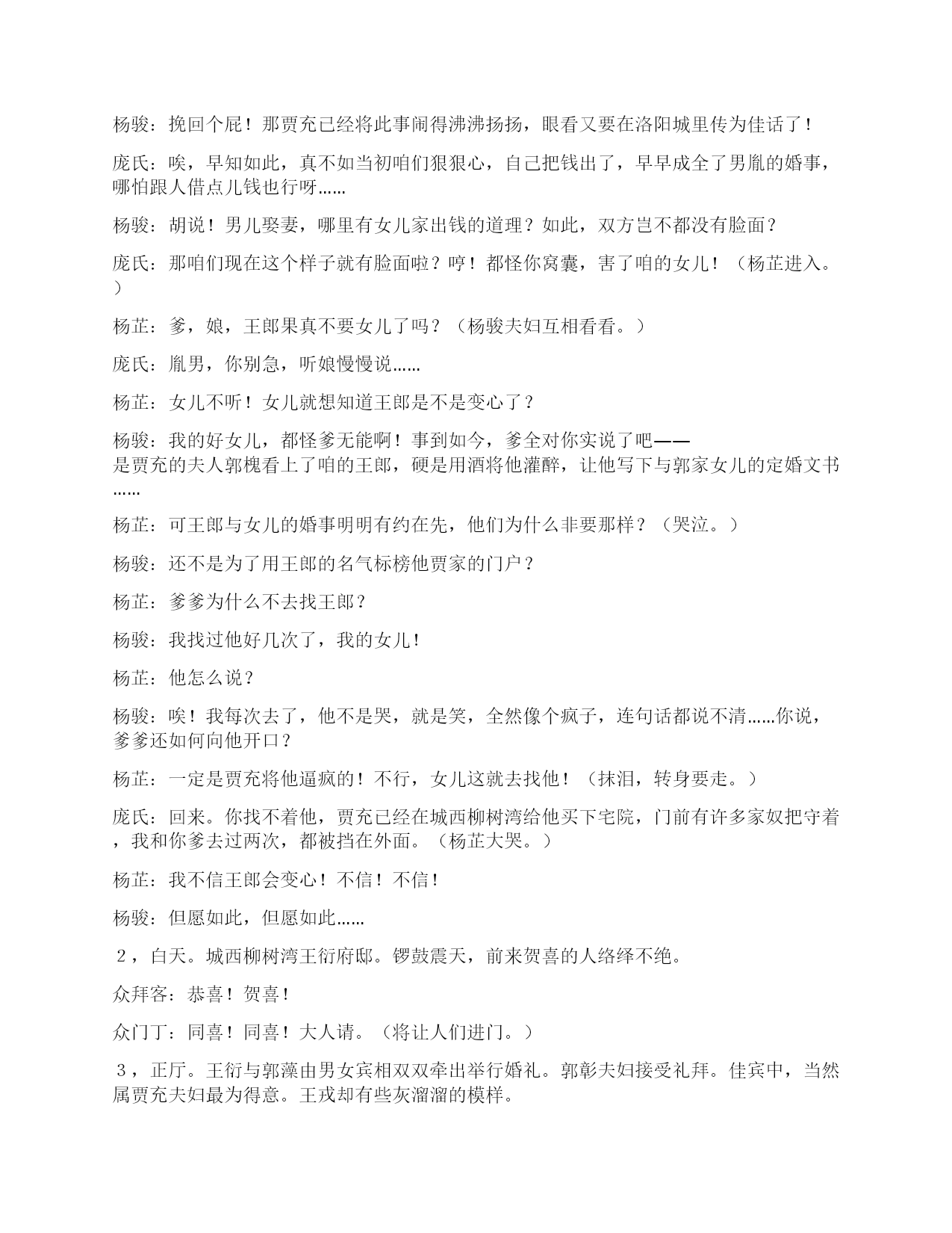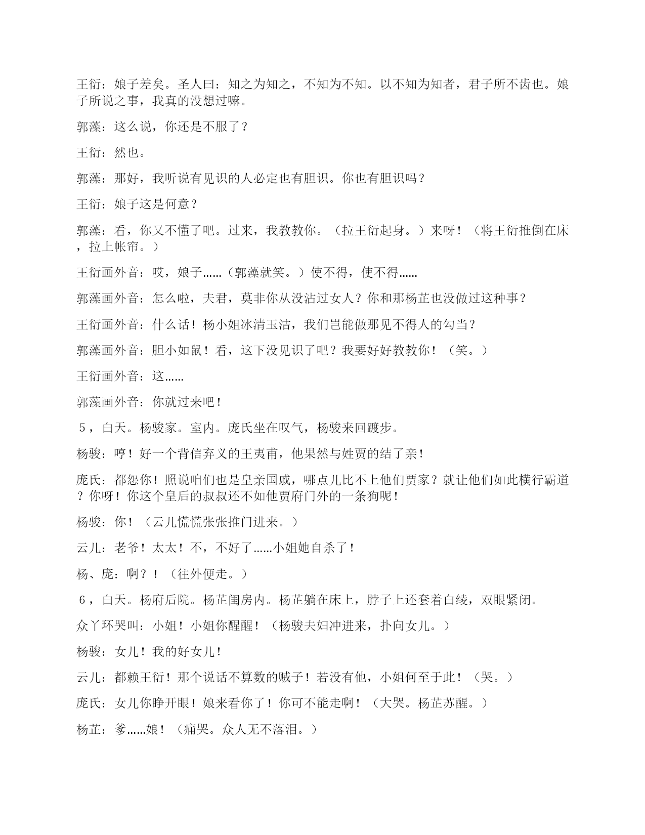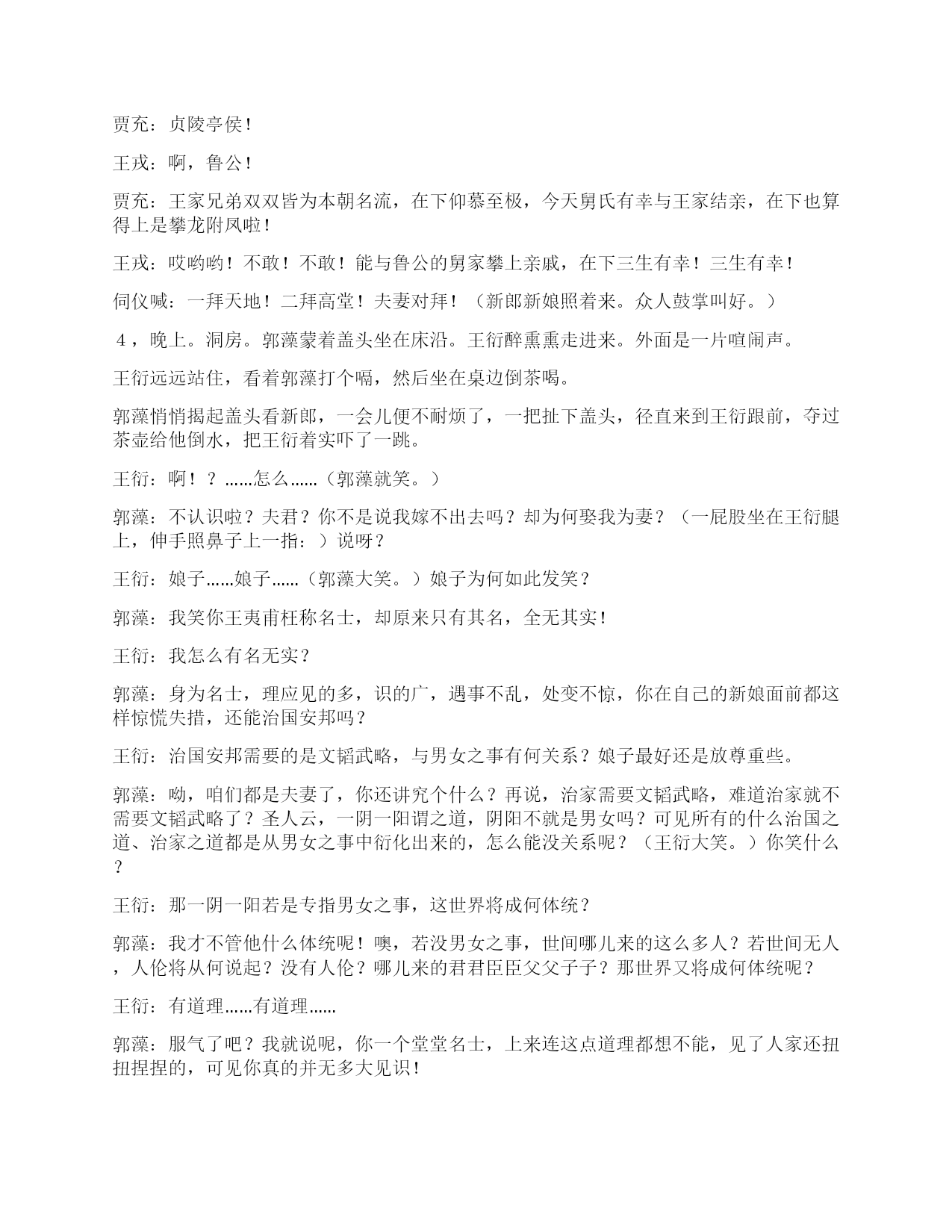 自古皇帝老儿最威风 称至尊,居九重 江山万里,一轮太阳红 一思一念春秋改 一言一语天地动 现真身,万民齐仰望 都说金銮殿里是真龙 自古皇后娘娘最雍容 睡牙床,住玉宫 佳丽三千,明月照群星 一喜一怒百官怕 一哭一笑君王惊 论尊贵,女儿数第一 都说御花园里栖彩凤 自古公侯将相最精明 急争利,巧贪功 朱门酒肉,谈笑论苍生 一谋一划翻手雨 一计一策覆手风 千百年,人人骂国贼 都说乱世才能出英雄 第十集 1,白天。杨骏家。杨骏夫妇正在生闷气。 杨骏:这个混帐王衍!什么名士?分明是个势利小人!气杀我也! 庞氏:哎呀,事怀弄到这个份儿上,光生气也没用啊,你还不赶紧叫三弟打听打听,看还有没有挽回的余地? 杨骏:挽回个屁!那贾充已经将此事闹得沸沸扬扬,眼看又要在洛阳城里传为佳话了! 庞氏:唉,早知如此,真不如当初咱们狠狠心,自己把钱出了,早早成全了男胤的婚事,哪怕跟人借点儿钱也行呀…… 杨骏:胡说!男儿娶妻,哪里有女儿家出钱的道理?如此,双方岂不都没有脸面? 庞氏:那咱们现在这个样子就有脸面啦?哼!都怪你窝囊,害了咱的女儿!(杨芷进入。) 杨芷:爹,娘,王郎果真不要女儿了吗?(杨骏夫妇互相看看。) 庞氏:胤男,你别急,听娘慢慢说…… 杨芷:女儿不听!女儿就想知道王郎是不是变心了? 杨骏:我的好女儿,都怪爹无能啊!事到如今,爹全对你实说了吧——是贾充的夫人郭槐看上了咱的王郎,硬是用酒将他灌醉,让他写下与郭家女儿的定婚文书…… 杨芷:可王郎与女儿的婚事明明有约在先,他们为什么非要那样?(哭泣。) 杨骏:还不是为了用王郎的名气标榜他贾家的门户? 杨芷:爹爹为什么不去找王郎? 杨骏:我找过他好几次了,我的女儿! 杨芷:他怎么说? 杨骏:唉!我每次去了,他不是哭,就是笑,全然像个疯子,连句话都说不清……你说,爹爹还如何向他开口? 杨芷:一定是贾充将他逼疯的!不行,女儿这就去找他!(抹泪,转身要走。) 庞氏:回来。你找不着他,贾充已经在城西柳树湾给他买下宅院,门前有许多家奴把守着,我和你爹去过两次,都被挡在外面。(杨芷大哭。) 杨芷:我不信王郎会变心!不信!不信! 杨骏:但愿如此,但愿如此…… 2,白天。城西柳树湾王衍府邸。锣鼓震天,前来贺喜的人络绎不绝。 众拜客:恭喜!贺喜! 众门丁:同喜!同喜!大人请。(将让人们进门。) 3,正厅。王衍与郭藻由男女宾相双双牵出举行婚礼。郭彰夫妇接受礼拜。佳宾中,当然属贾充夫妇最为得意。王戎却有些灰溜溜的模样。 贾充:贞陵亭侯! 王戎:啊,鲁公! 贾充:王家兄弟双双皆为本朝名流,在下仰慕至极,今天舅氏有幸与王家结亲,在下也算得上是攀龙附凤啦! 王戎:哎哟哟!不敢!不敢!能与鲁公的舅家攀上亲戚,在下三生有幸!三生有幸! 伺仪喊:一拜天地!二拜高堂!夫妻对拜!(新郎新娘照着来。众人鼓掌叫好。) 4,晚上。洞房。郭藻蒙着盖头坐在床沿。王衍醉熏熏走进来。外面是一片喧闹声。 王衍远远站住,看着郭藻打个嗝,然后坐在桌边倒茶喝。 郭藻悄悄揭起盖头看新郎,一会儿便不耐烦了,一把扯下盖头,径直来到王衍跟前,夺过茶壶给他倒水,把王衍着实吓了一跳。 王衍:啊!?……怎么……(郭藻就笑。) 郭藻:不认识啦?夫君?你不是说我嫁不出去吗?却为何娶我为妻?(一屁股坐在王衍腿上,伸手照鼻子上一指:)说呀? 王衍:娘子……娘子……(郭藻大笑。)娘子为何如此发笑? 郭藻:我笑你王夷甫枉称名士,却原来只有其名,全无其实! 王衍:我怎么有名无实? 郭藻:身为名士,理应见的多,识的广,遇事不乱,处变不惊,你在自己的新娘面前都这样惊慌失措,还能治国安邦吗? 王衍:治国安邦需要的是文韬武略,与男女之事有何关系?娘子最好还是放尊重些。 郭藻:呦,咱们都是夫妻了,你还讲究个什么?再说,治家需要文韬武略,难道治家就不需要文韬武略了?圣人云,一阴一阳谓之道,阴阳不就是男女吗?可见所有的什么治国之道、治家之道都是从男女之事中衍化出来的,怎么能没关系呢?(王衍大笑。)你笑什么? 王衍:那一阴一阳若是专指男女之事,这世界将成何体统? 郭藻:我才不管他什么体统呢!噢,若没男女之事,世间哪儿来的这么多人?若世间无人,人伦将从何说起?没有人伦?哪儿来的君君臣臣父父子子?那世界又将成何体统呢? 王衍:有道理……有道理…… 郭藻:服气了吧?我就说呢,你一个堂堂名士,上来连这点道理都想不能,见了人家还扭扭捏捏的,可见你真的并无多大见识! 王衍:娘子差矣。圣人曰:知之为知之,不知为不知。以不知为知者,君子所不齿也。娘子所说之事,我真的没想过嘛。 郭藻:这么说,你还是不服了? 王衍:然也。 郭藻:那好,我听说有见识的人必定也有胆识。你也有胆识吗? 王衍:娘子这是何意? 郭藻:看,你又不懂了吧。过来,我教教你。(拉王衍起身。)来呀!(将王衍推倒在床,拉上帐帘。) 王衍画外音:哎,娘子……(郭藻就笑