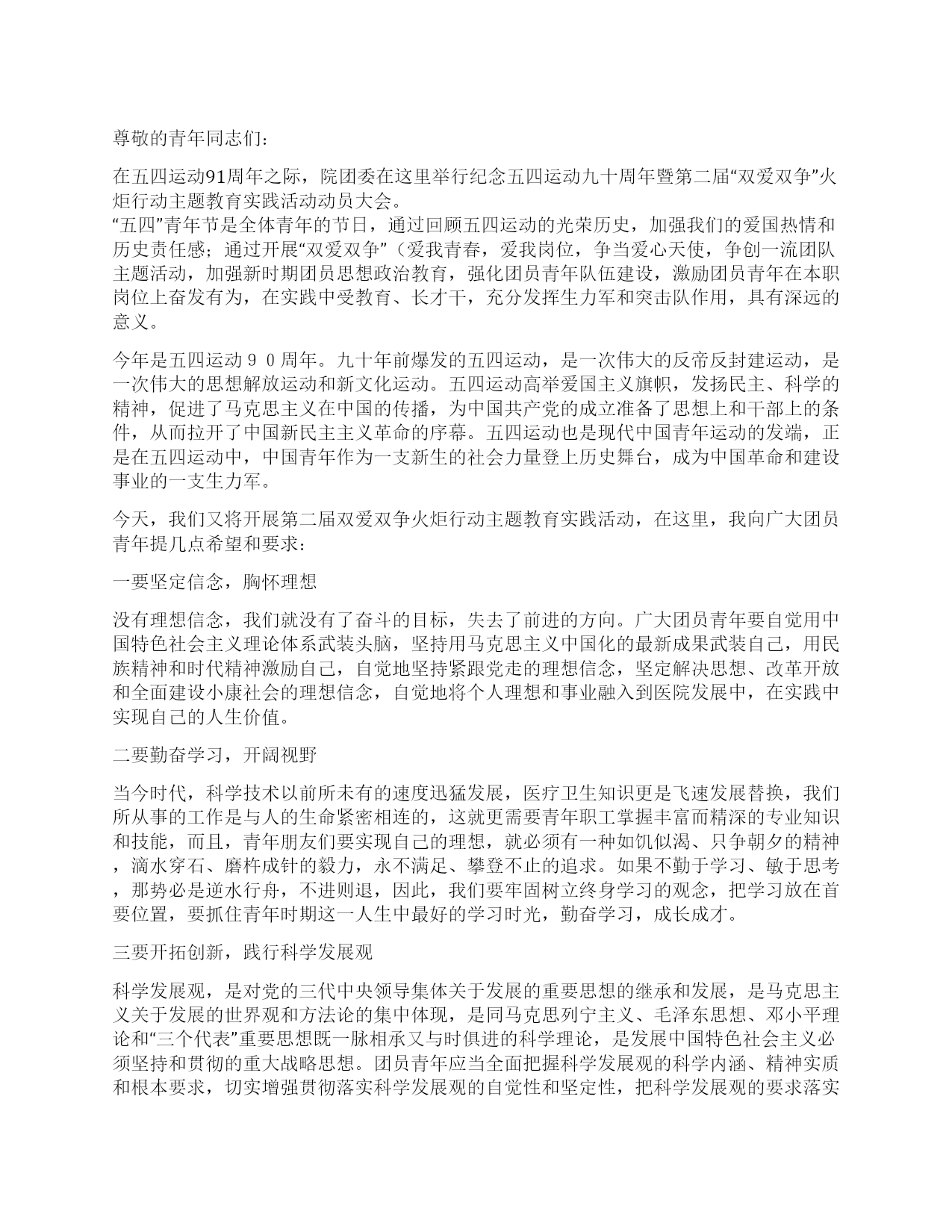 尊敬的青年同志们: 在五四运动91周年之际,院团委在这里举行纪念五四运动九十周年暨第二届“双爱双争”火炬行动主题教育实践活动动员大会。“五四”青年节是全体青年的节日,通过回顾五四运动的光荣历史,加强我们的爱国热情和历史责任感;通过开展“双爱双争”(爱我青春,爱我岗位,争当爱心天使,争创一流团队主题活动,加强新时期团员思想政治教育,强化团员青年队伍建设,激励团员青年在本职岗位上奋发有为,在实践中受教育、长才干,充分发挥生力军和突击队作用,具有深远的意义。 今年是五四运动90周年。九十年前爆发的五四运动,是一次伟大的反帝反封建运动,是一次伟大的思想解放运动和新文化运动。五四运动高举爱国主义旗帜,发扬民主、科学的精神,促进了马克思主义在中国的传播,为中国共产党的成立准备了思想上和干部上的条件,从而拉开了中国新民主主义革命的序幕。五四运动也是现代中国青年运动的发端,正是在五四运动中,中国青年作为一支新生的社会力量登上历史舞台,成为中国革命和建设事业的一支生力军。 今天,我们又将开展第二届双爱双争火炬行动主题教育实践活动,在这里,我向广大团员青年提几点希望和要求: 一要坚定信念,胸怀理想 没有理想信念,我们就没有了奋斗的目标,失去了前进的方向。广大团员青年要自觉用中国特色社会主义理论体系武装头脑,坚持用马克思主义中国化的最新成果武装自己,用民族精神和时代精神激励自己,自觉地坚持紧跟党走的理想信念,坚定解决思想、改革开放和全面建设小康社会的理想信念,自觉地将个人理想和事业融入到医院发展中,在实践中实现自己的人生价值。 二要勤奋学习,开阔视野 当今时代,科学技术以前所未有的速度迅猛发展,医疗卫生知识更是飞速发展替换,我们所从事的工作是与人的生命紧密相连的,这就更需要青年职工掌握丰富而精深的专业知识和技能,而且,青年朋友们要实现自己的理想,就必须有一种如饥似渴、只争朝夕的精神,滴水穿石、磨杵成针的毅力,永不满足、攀登不止的追求。如果不勤于学习、敏于思考,那势必是逆水行舟,不进则退,因此,我们要牢固树立终身学习的观念,把学习放在首要位置,要抓住青年时期这一人生中最好的学习时光,勤奋学习,成长成才。 三要开拓创新,践行科学发展观 科学发展观,是对党的三代中央领导集体关于发展的重要思想的继承和发展,是马克思主义关于发展的世界观和方法论的集中体现,是同马克思列宁主义、毛泽东思想、邓小平理论和“三个代表”重要思想既一脉相承又与时俱进的科学理论,是发展中国特色社会主义必须坚持和贯彻的重大战略思想。团员青年应当全面把握科学发展观的科学内涵、精神实质和根本要求,切实增强贯彻落实科学发展观的自觉性和坚定性,把科学发展观的要求落实到医院工作实践中,要坚持与时俱进,增强创新意识,在继续解放思想、坚持改革开放、推动科学发展、促进医院发展中充分发挥积极性、主动性和创造性,为保持医院又好又快发展作出应有贡献。 四要勇于奉献,共创和谐 同志们,伟大的五四精神历久弥新,让我们牢记“爱国、进步、民主、科学”的五四精神,在工作中勤于学习思考、勇于开拓创新、大力团结协作、不断攀登高峰,在服务中甘于无私奉献,为医院的发展奉献青春的热血和智慧。