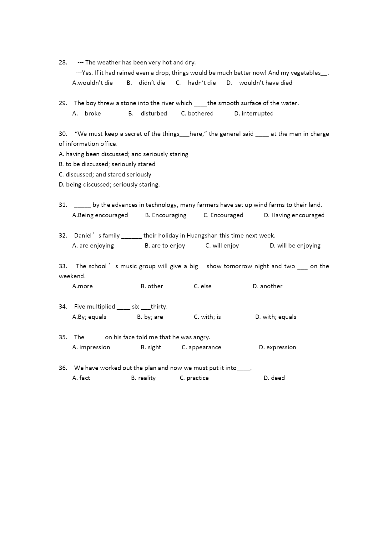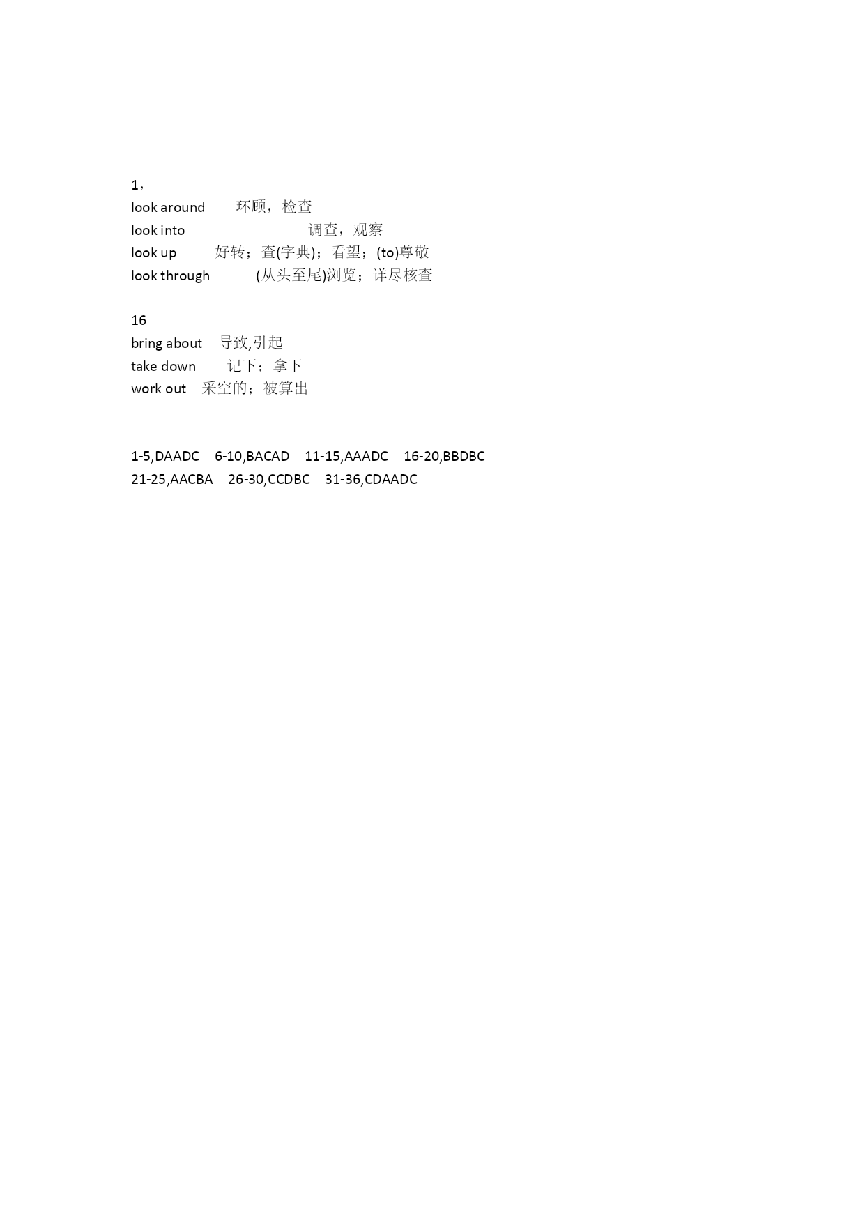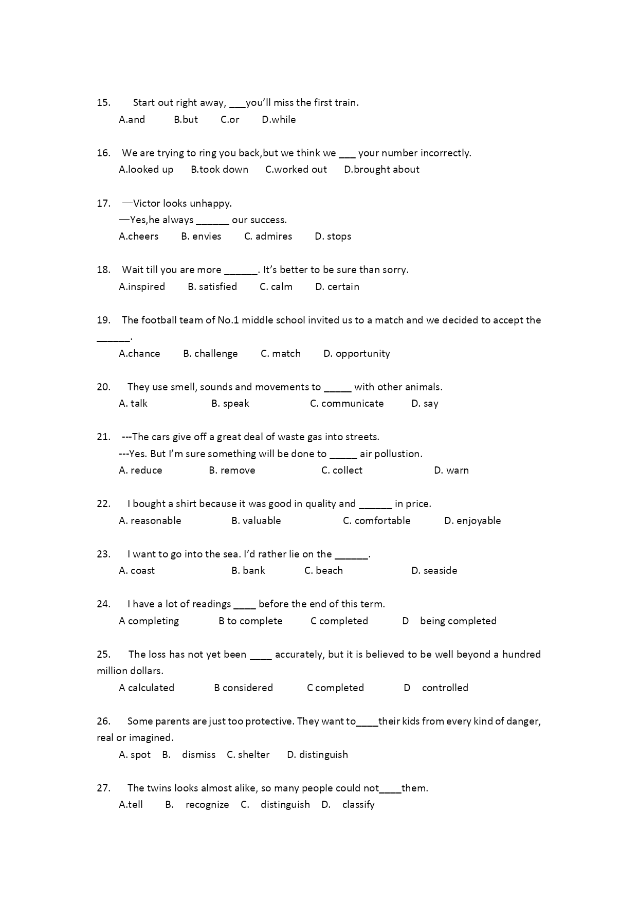 TJ语法训练 1.Wouldyou____thepaperformeandseeifthereareanyobviousmistakes? A.lookaroundB.lookintoC.lookupD.lookthrough 2.Thefactthatsheneverapologized____alotaboutwhatkindofpersonsheis. A.saysB.talksC.appearsD.declares 3.Jimsoldmostofhisthings.Hehashardly____leftinthehouse. A.anythingB.everythingC.nothingDsomething 4.Hetelephonedthetravelagencyto___threeairticketstoLondon. A.orderB.arrangeC.takeD.book 5.Thousandsofforeignerswere___totheShanghaiworldExpothedayitopened. A.attendedB.attained.C.attractedD.attached 6.Iboughtadressforonly10dollarsinasale;itwasareal___. A.exchangeB.bargainC.tradeD.business 7.Thetopleadersofthetwocountriesareholdingtalksinafriendly___. A.atmosphereB.stateC.situationD.phenomenon 8.TheoldmanaskedLucytomovetoanotherchair___hewantedtositnexttohiswife. A.beforeB.untilC.asD.since 9.Hekeepstellinghisstudentsthatthefuture___tothewell-educated. A.belongsB.isbelongedC.isbelongingD.willbebelonged 10.–Hasshehadmuch___inteachingEnglish? --No.Sheisjustanewhand. A.baseB.futureC.energyD.experience 11.Themedicinetastes___,butworks___. A.bitter;wellB.bitter;goodC.bitterly;wellD.bitterly;good 12.Theartistwaspoor,____poorheremainedallhislife. A.andB.orC.butD.so 13.Ismellsomething___inthekitchen.CanIcallyoubackinaminute? A.burningB.burntC.beingburntD.tobeburnt 14.ItwassodarkinthecinemathatIcouldhardly___myfriend. A.turnoutB.bringoutC.calloutD.pickout 15.Startoutrightaway,___you’llmissthefirsttrain. A.andB.butC.orD.while 16.Wearetryingtoringyouback,butwethinkwe___yournumberincorrectly. A.lookedupB.tookdownC.workedoutD.broughtabout 17.—Victorlooksunhappy. —Yes,healways______oursuccess. A.cheersB.enviesC.admiresD.stops 18.Waittillyouaremore______.It’sbettertobesurethansorry. A.inspiredB.satisfiedC.calmD.certain 19.ThefootballteamofNo.1middleschoolinvitedustoamatchandwedecidedtoacceptthe______. A.chanceB.challengeC.matchD.opportunity 20.Theyusesmell,soundsandmovementsto_____withotheranimals. A.talk B.speak C.communicate D.say 21.---Thecarsgiveo